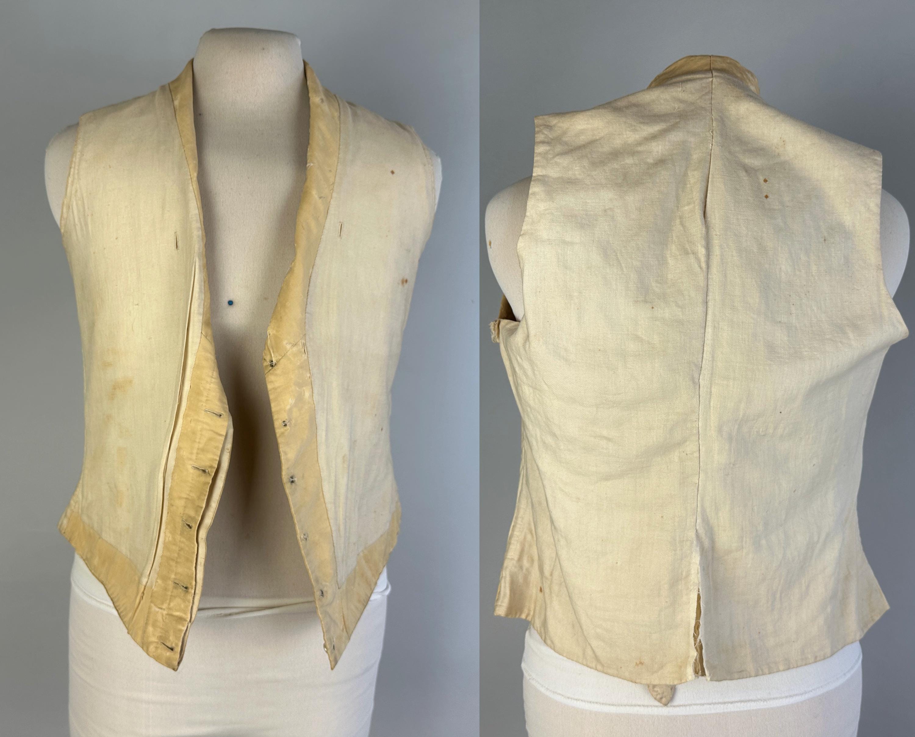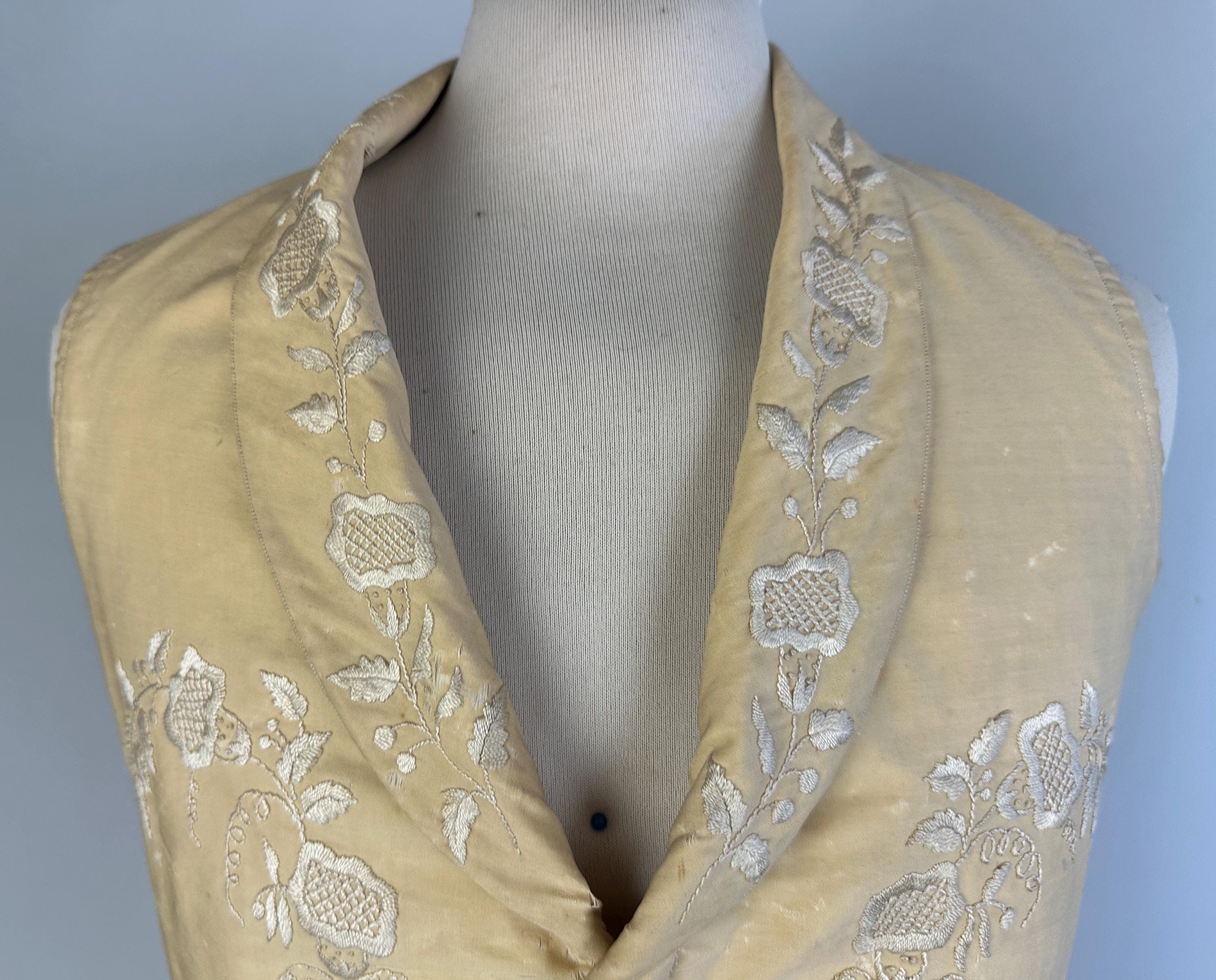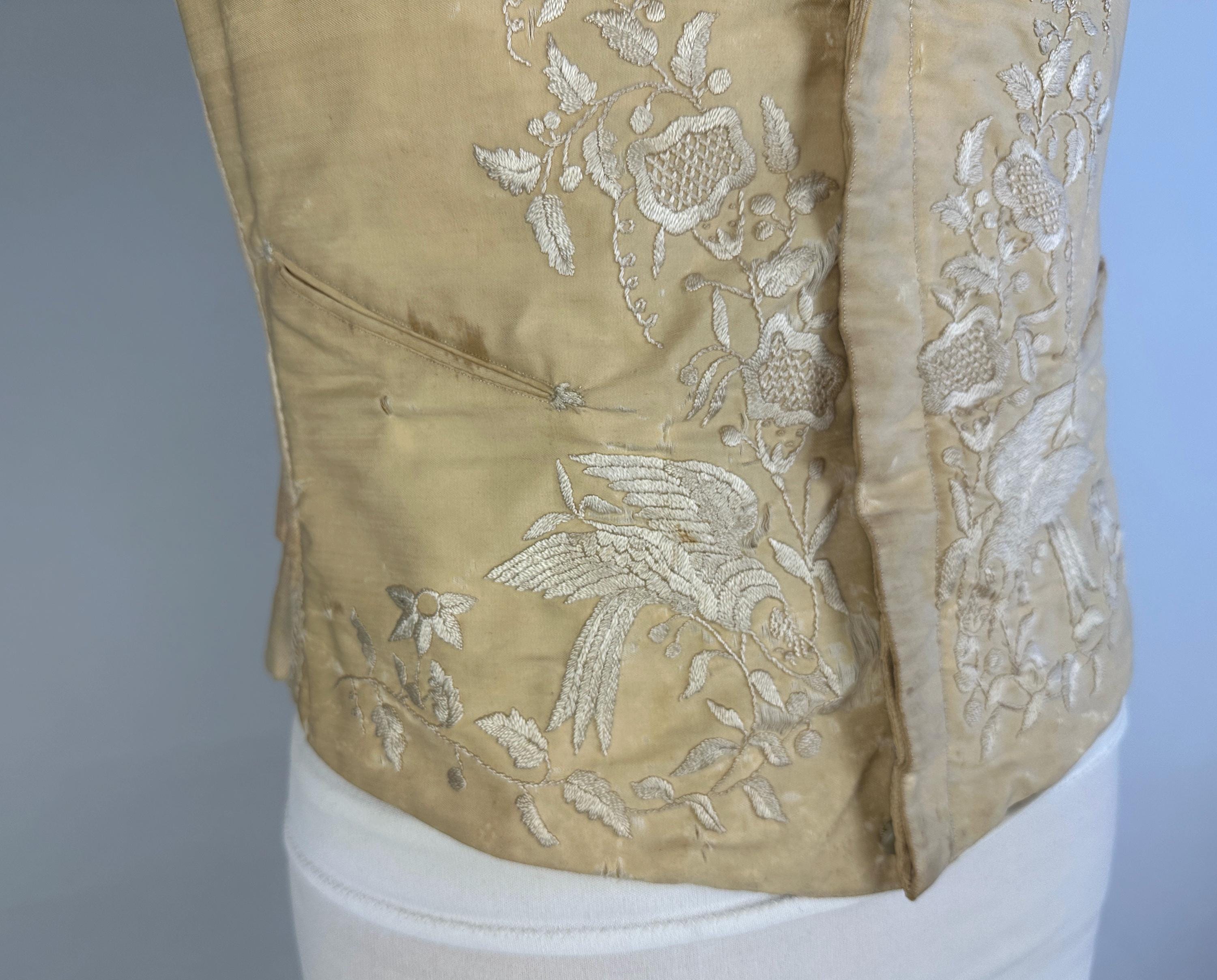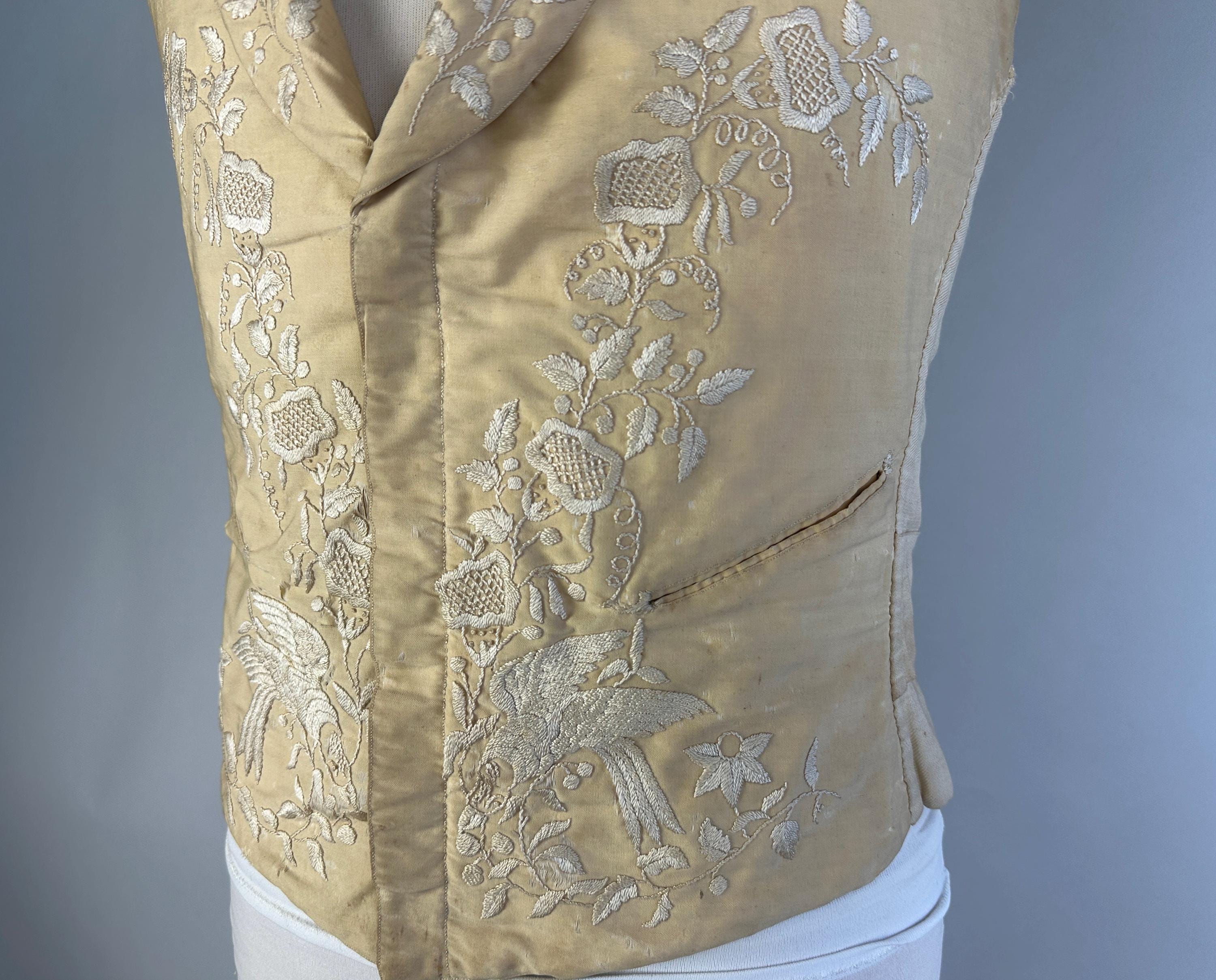 Be a beguiling guy embodying enchantment in this waistcoat from the 1800's! Ecru silk displays beautiful embroidery of flowering vines running parallel to the opening and topping the shawl lapel. Mirrored birds pluck berries from the vines and the white silk floss shimmers with each movement. Ivory cotton makes a full lining and is used for the back where adjuster straps cinch and fasten with a detailed brass buckle. Hidden by a placket are six shell buttons fastening the front and two curved welted pockets make a lovely enhancement. This vest is in good, very wearable antique condition and still presents beautifully though there is some small shattered spots that are structurally backed by cotton.