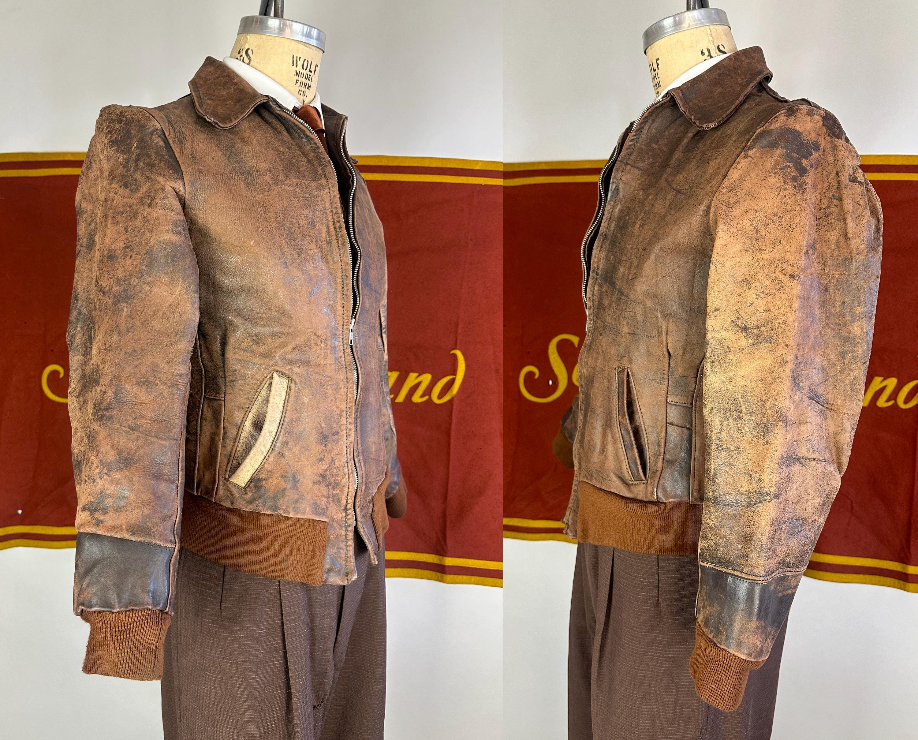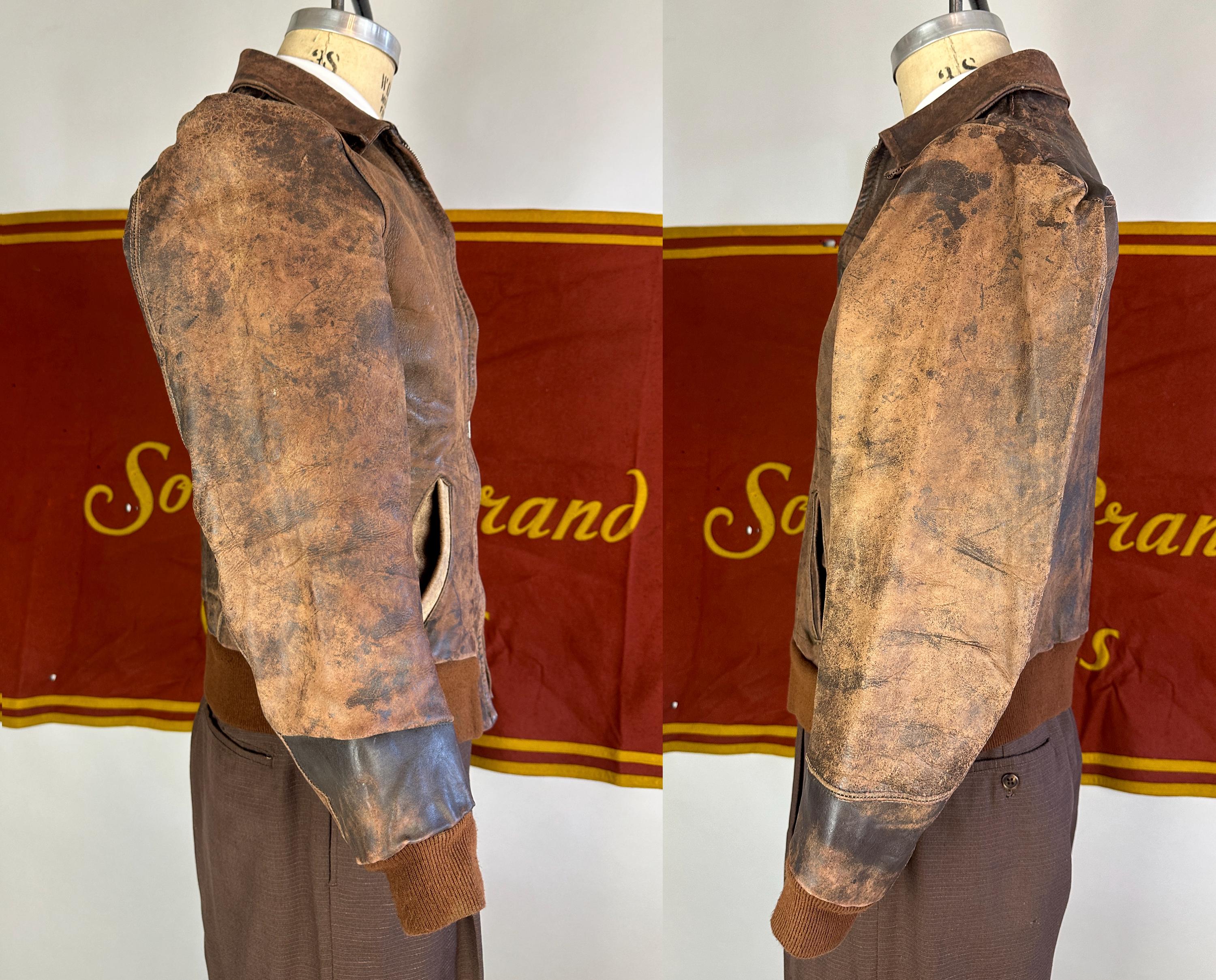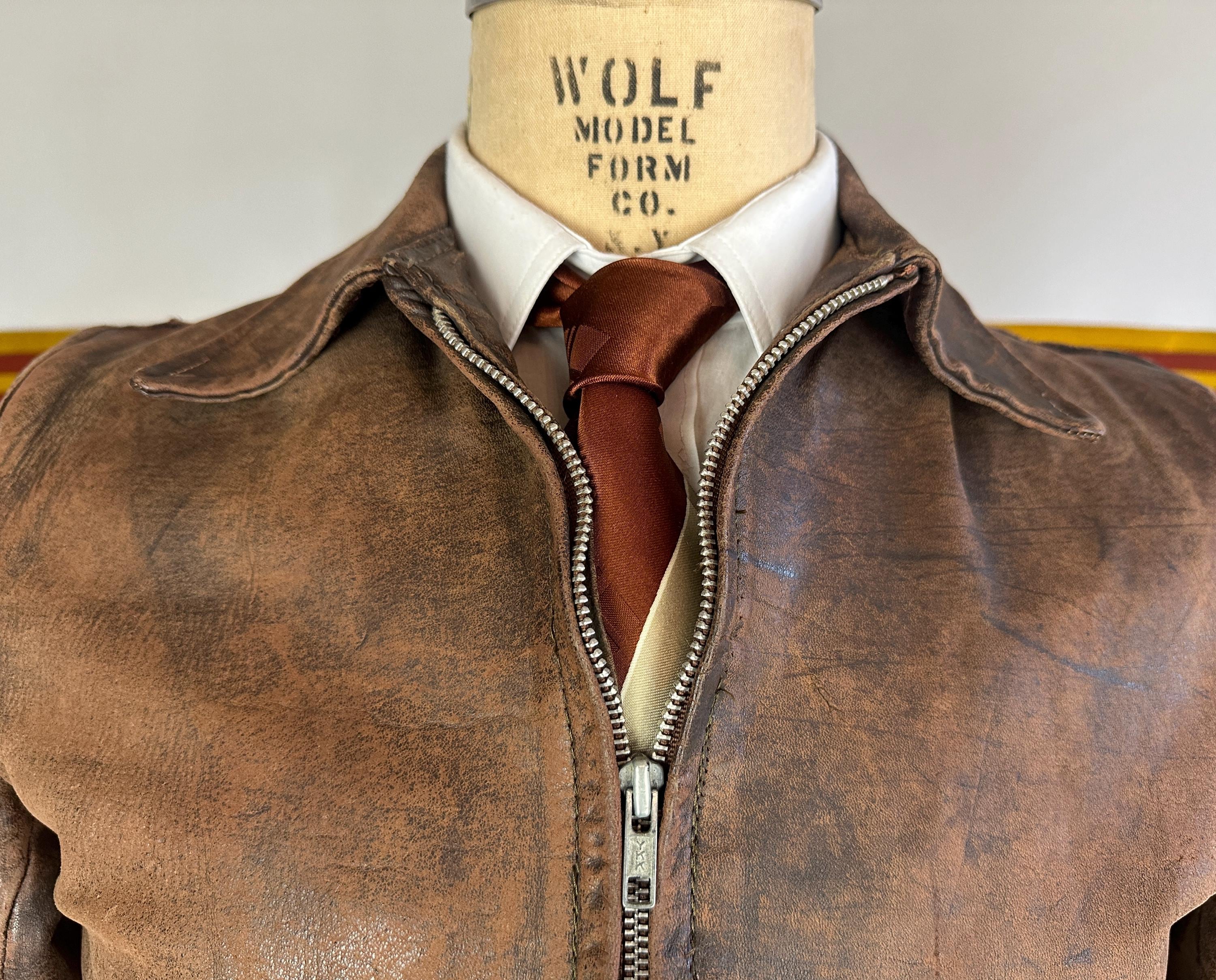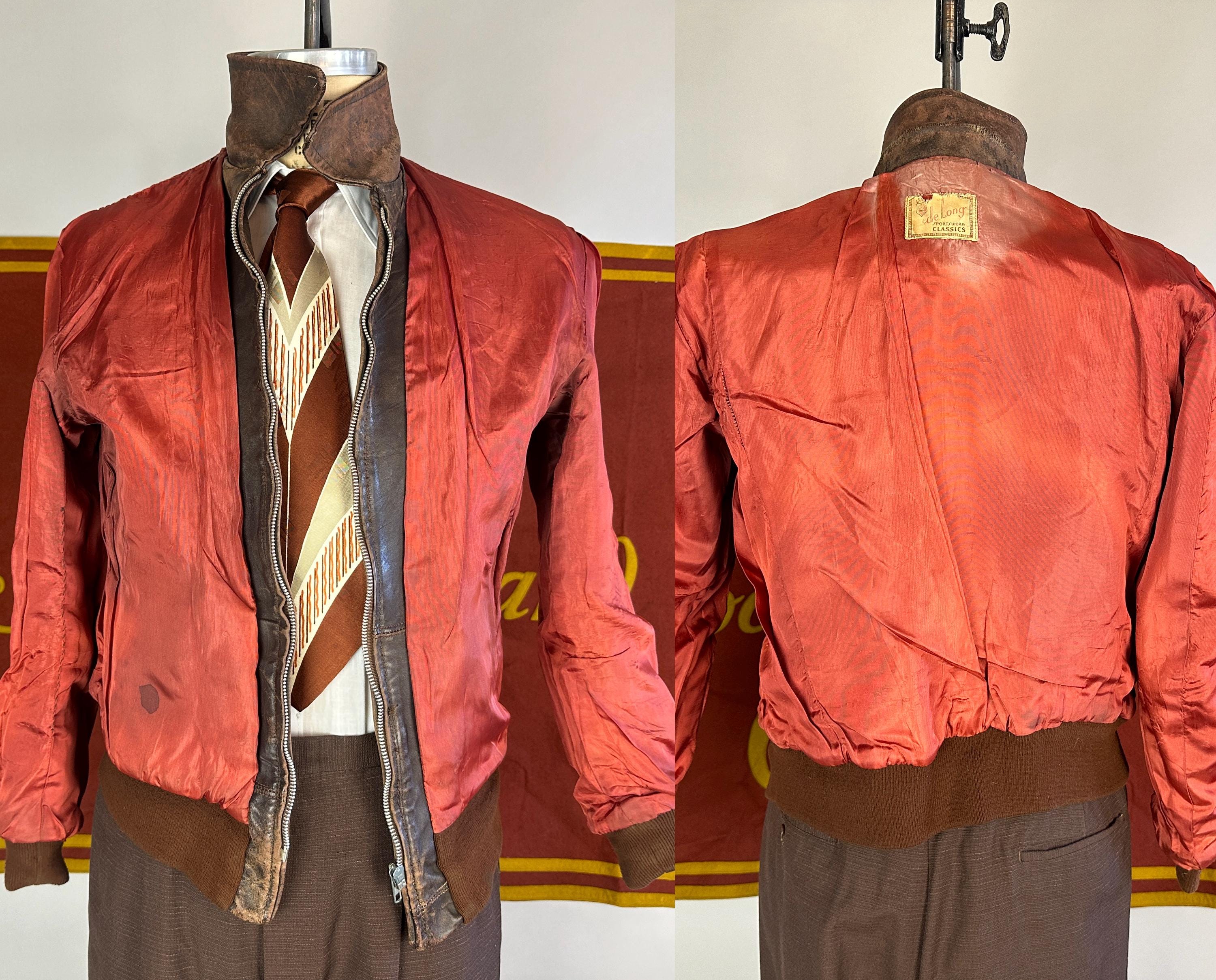 Step back in time with this classic 1940s A-2 jacket and live the high flying life! The leather has a great worn-in look creating a range of brown tones from deep walnut to fawn. Cuffs and waistband are a wool ribbed knit in burnt sienna and a full rayon lining in rose adds a secret touch colour. Heavy duty metal zip up the front and labeled "DeLong Sportswear". This jacket is in good vintage condition, with wear from a high-flying life but no holes, stains, nor odors to note.