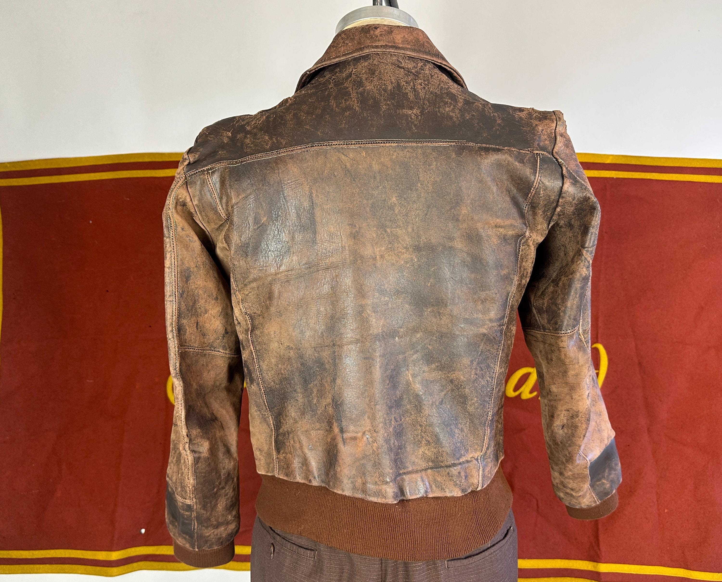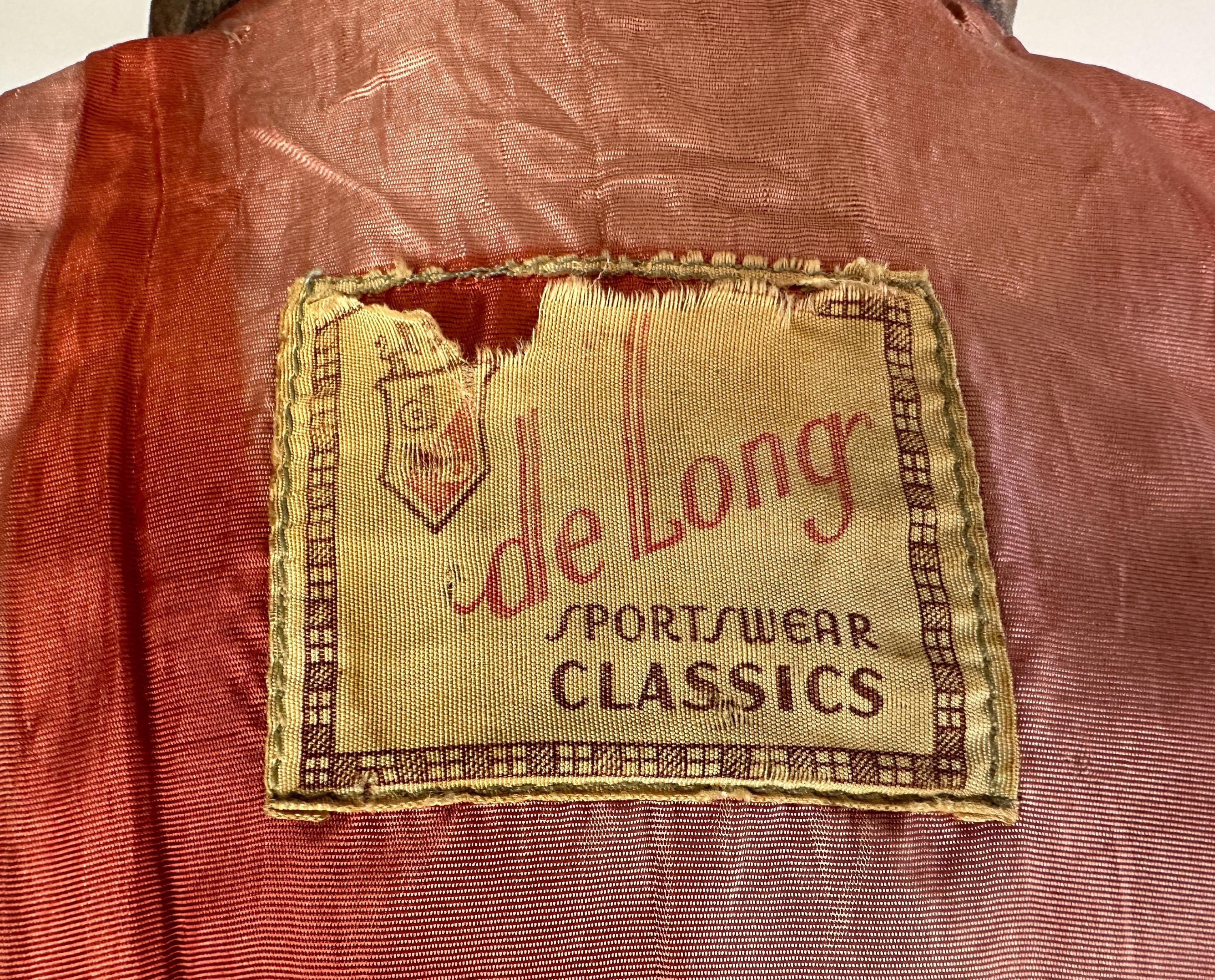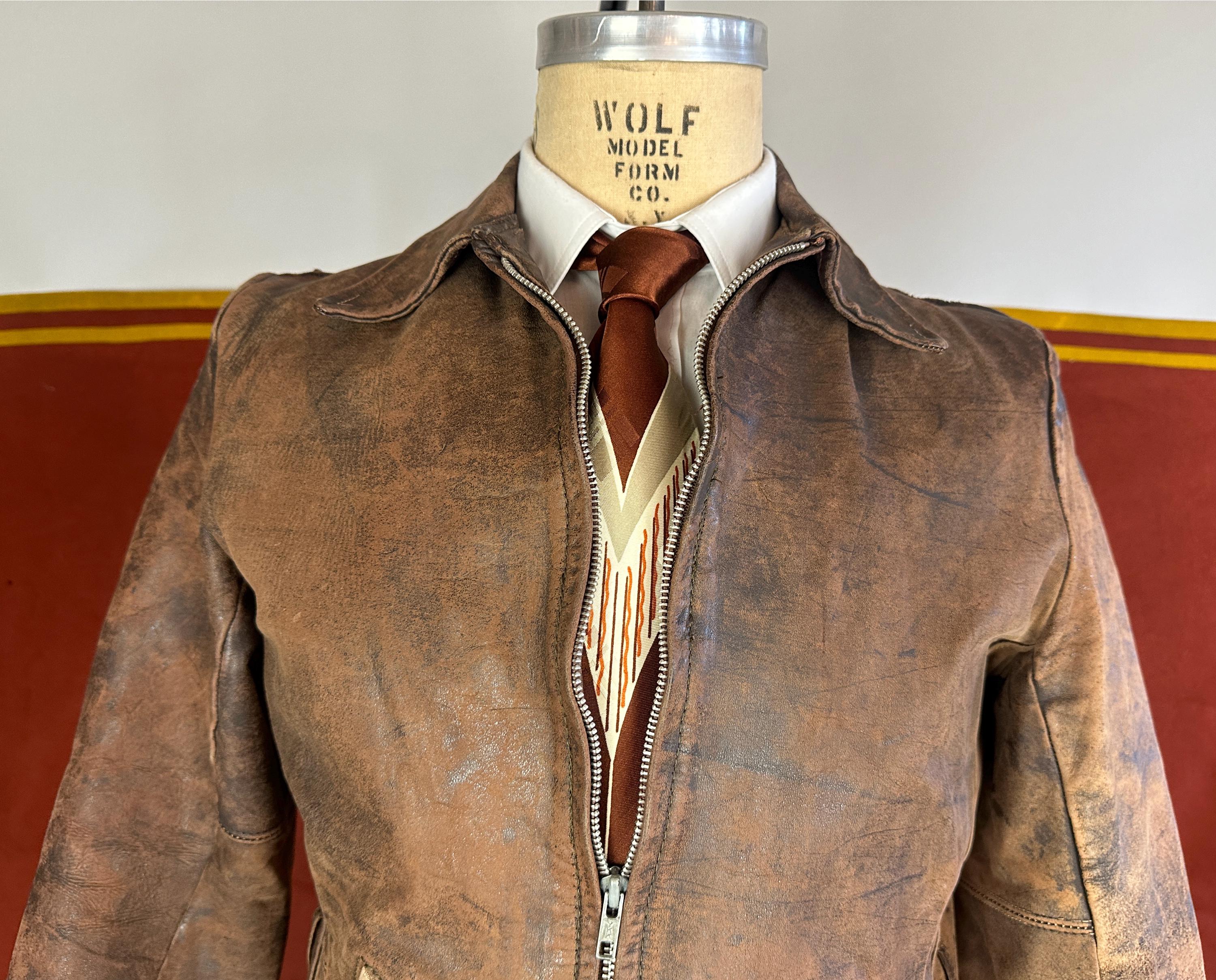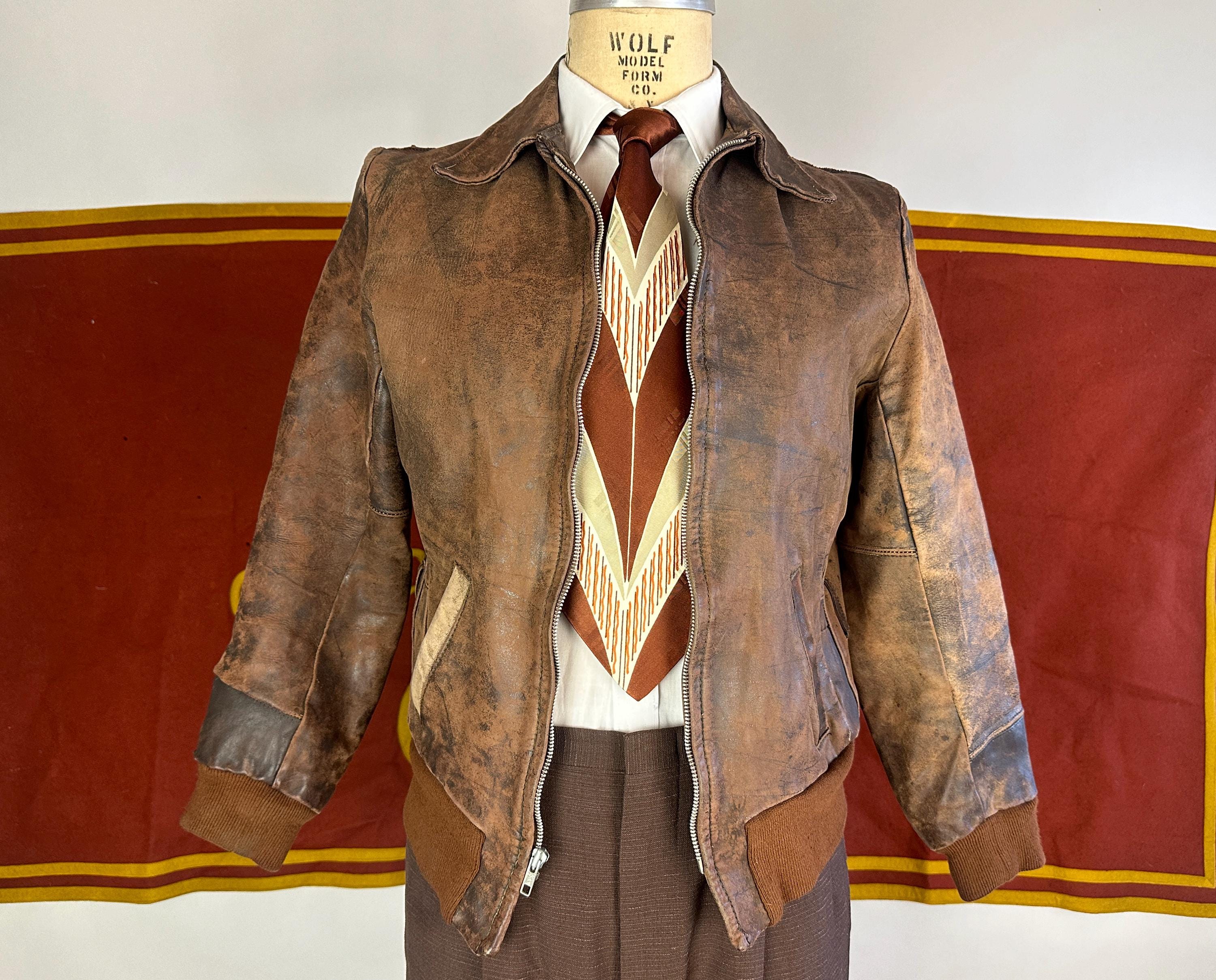Step back in time with this classic 1940s A-2 jacket and live the high flying life! The leather has a great worn-in look creating a range of brown tones from deep walnut to fawn. Cuffs and waistband are a wool ribbed knit in burnt sienna and a full rayon lining in rose adds a secret touch colour. Heavy duty metal zip up the front and labeled "DeLong Sportswear". This jacket is in good vintage condition, with wear from a high-flying life but no holes, stains, nor odors to note.