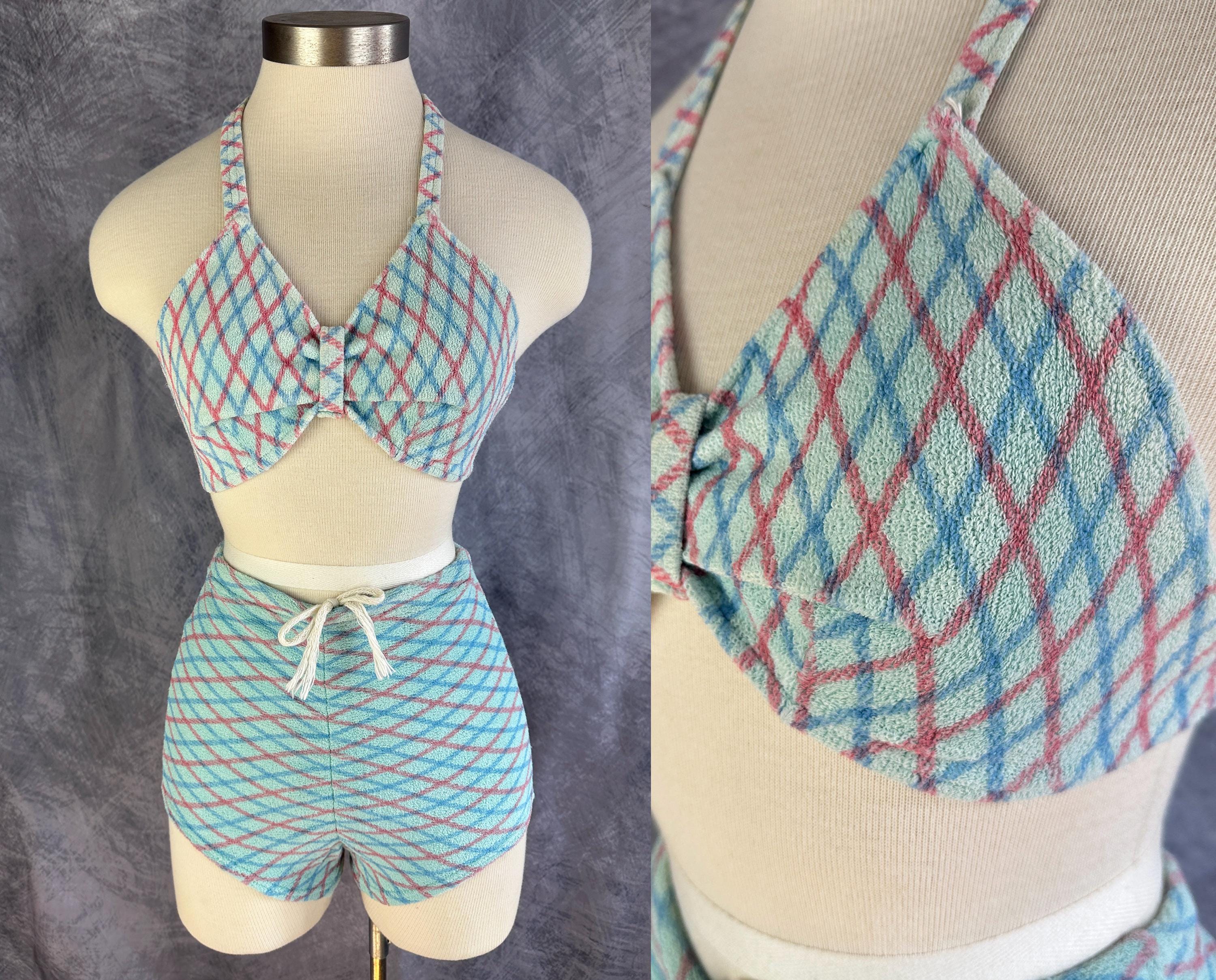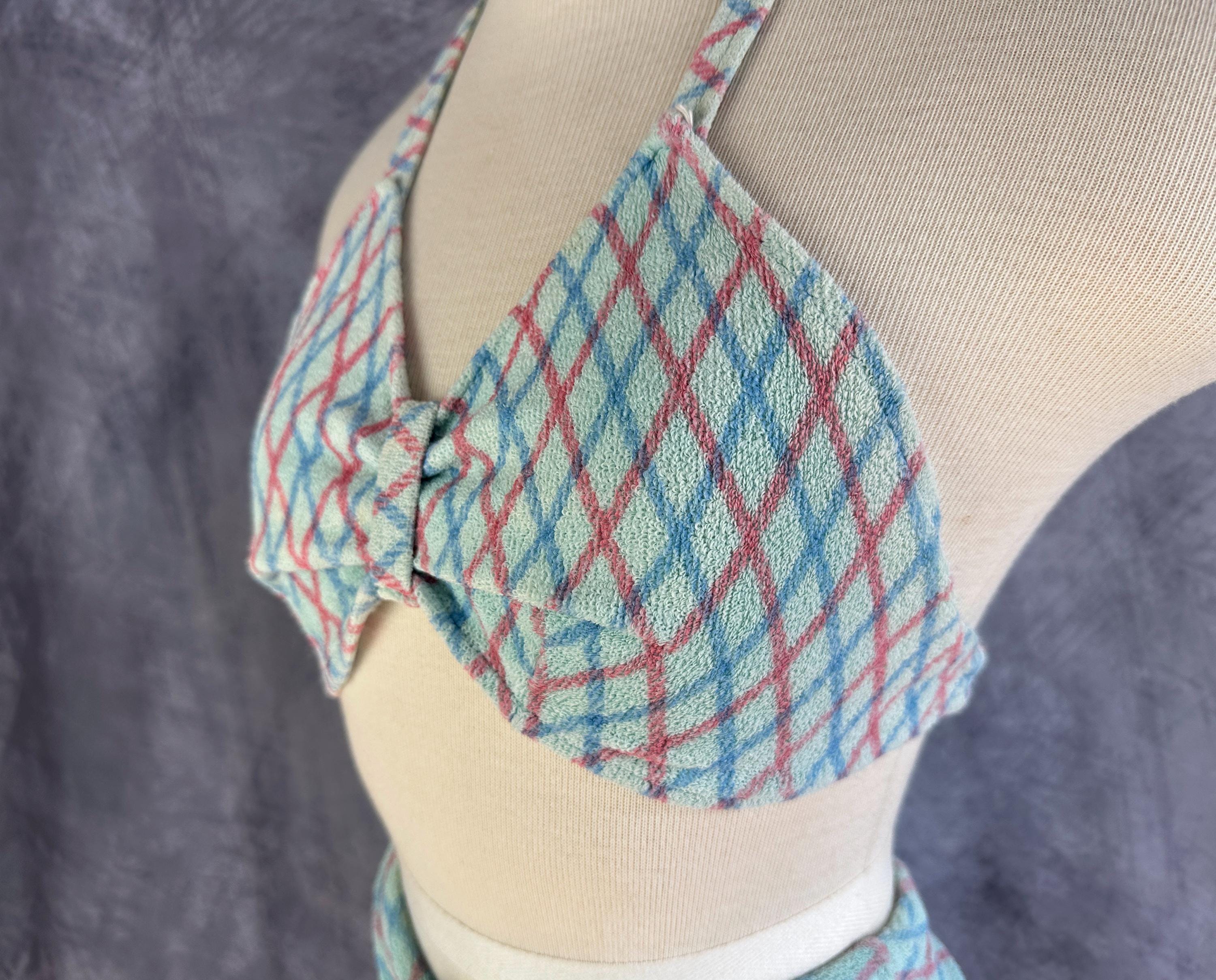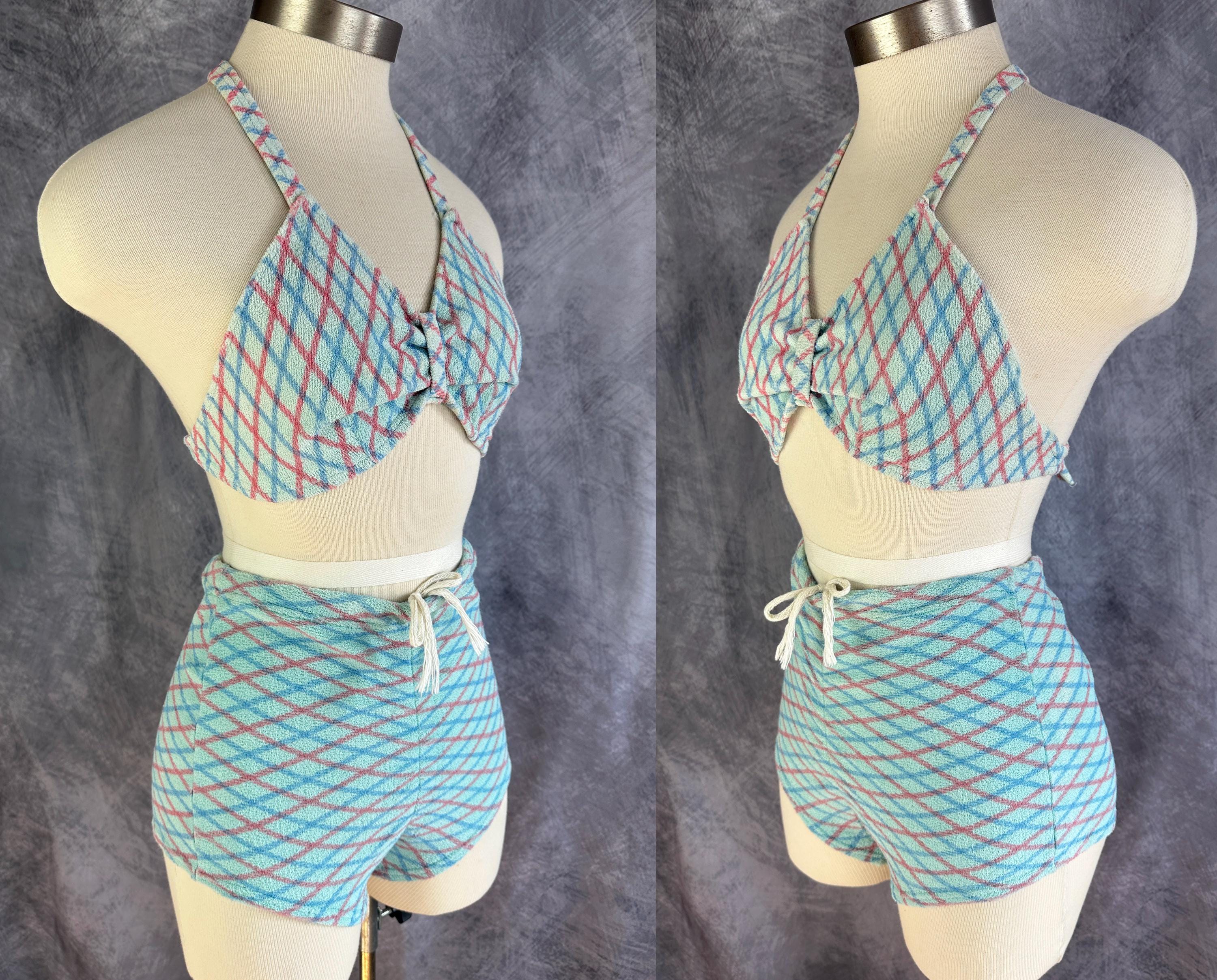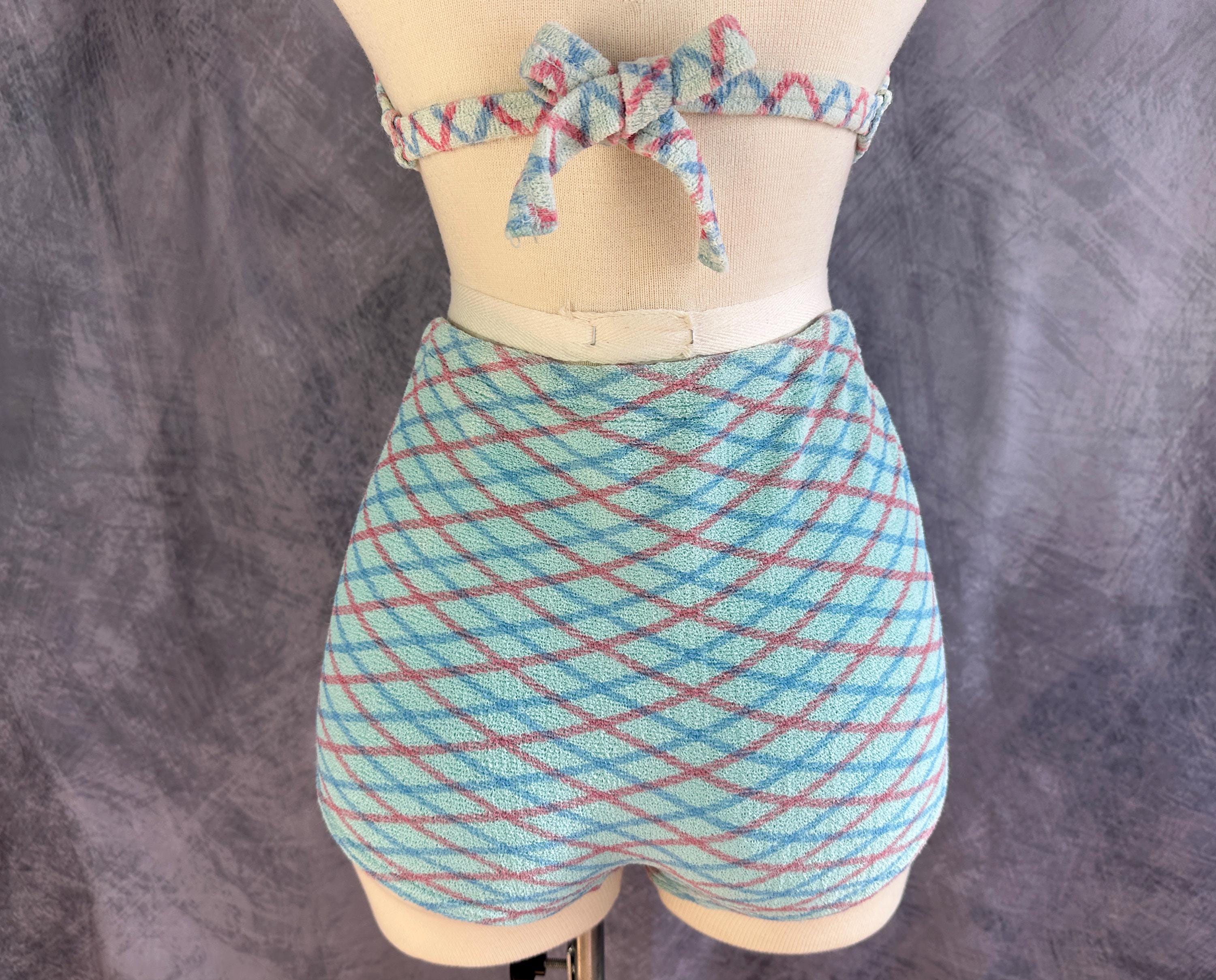 A bonnie lass you'll be on sand and sea in this 1930s bikini! These "Bonnie Togs" in robin's egg blue terry cloth features an Argyle plaid of sky blue and salmon pink. The top is perfect for sunning with halter tie straps and ties around the back and the triangular cups are gathered in the center with a band. The bottoms have a boy short cut with subtle center ruching and a drawstring waist. This swimsuit is in great vintage condition, with no holes, stains, or odors to note.