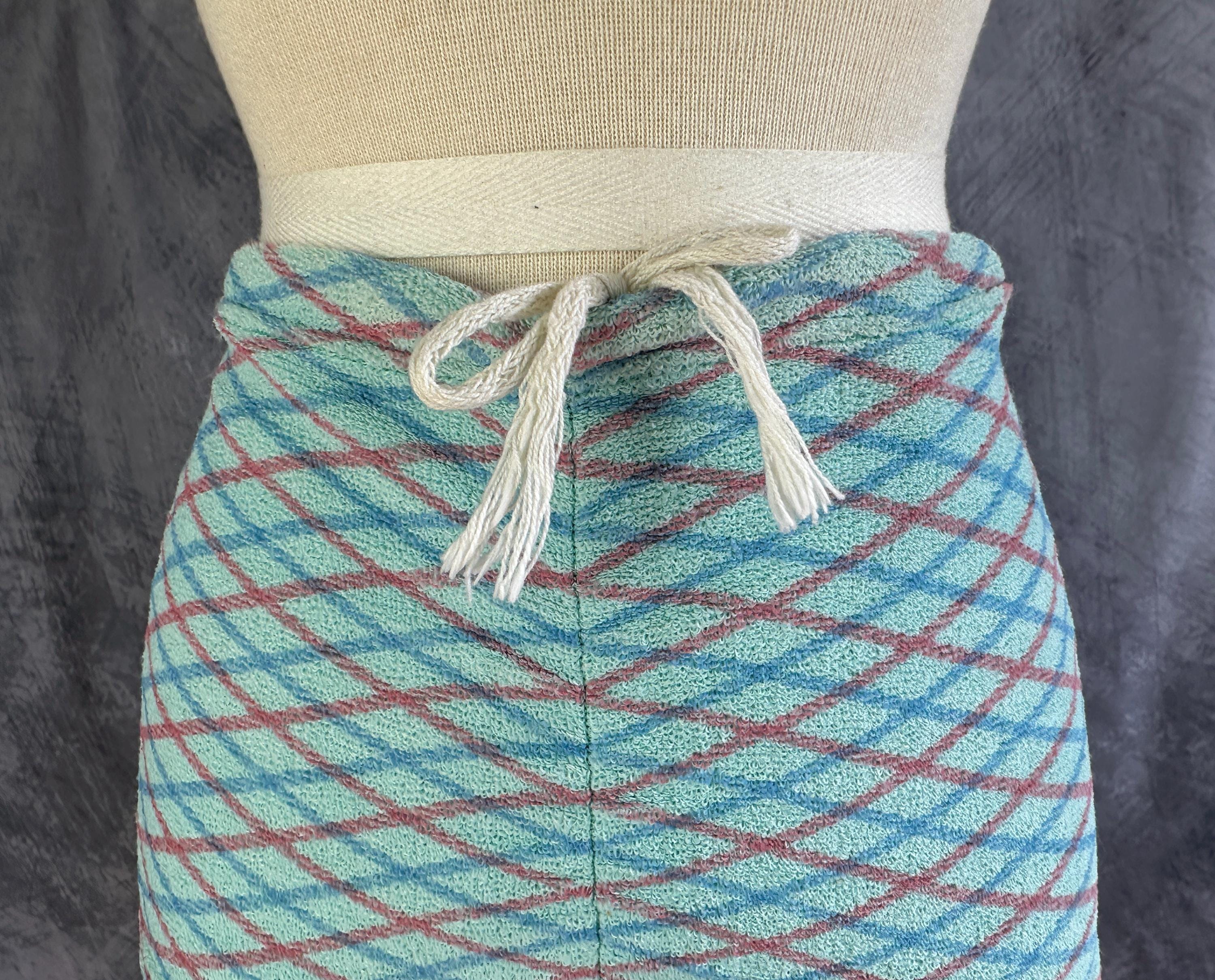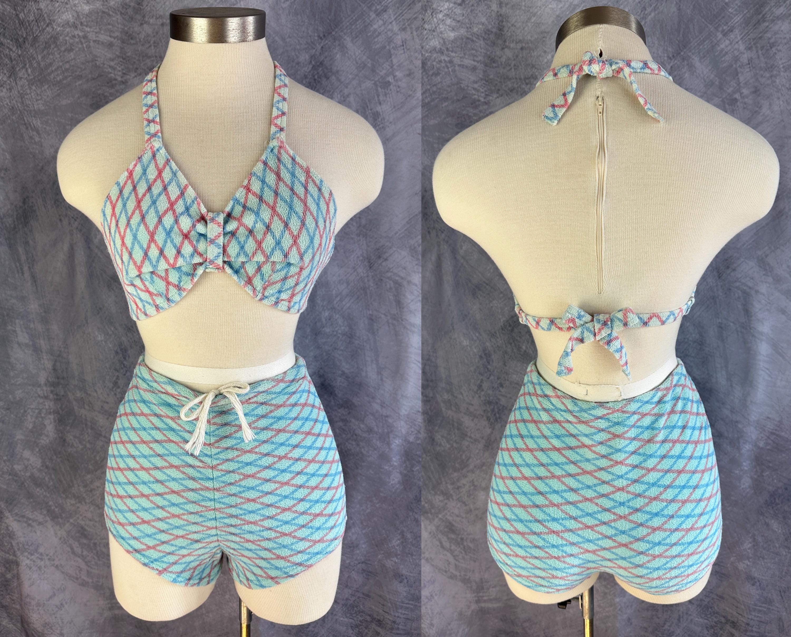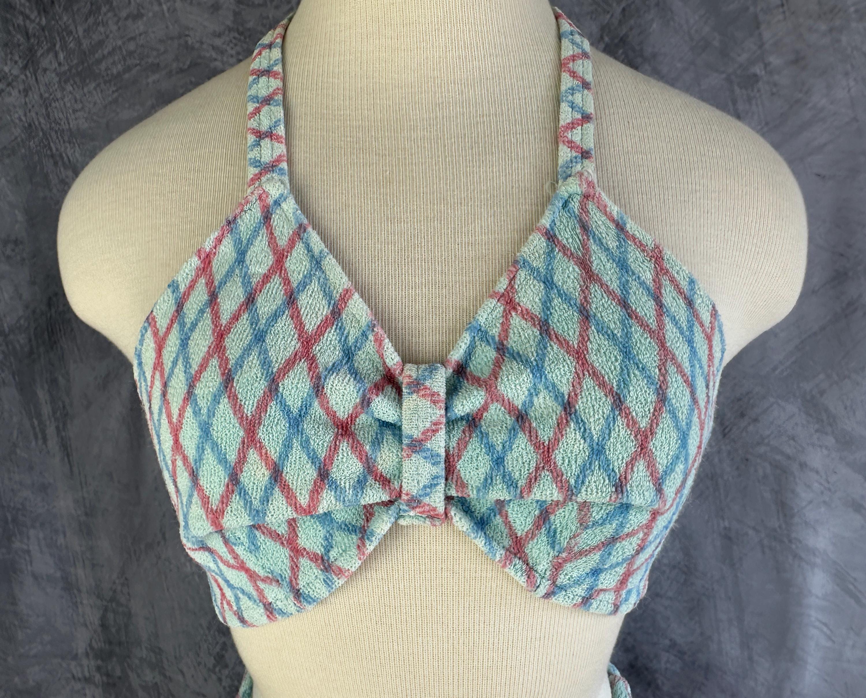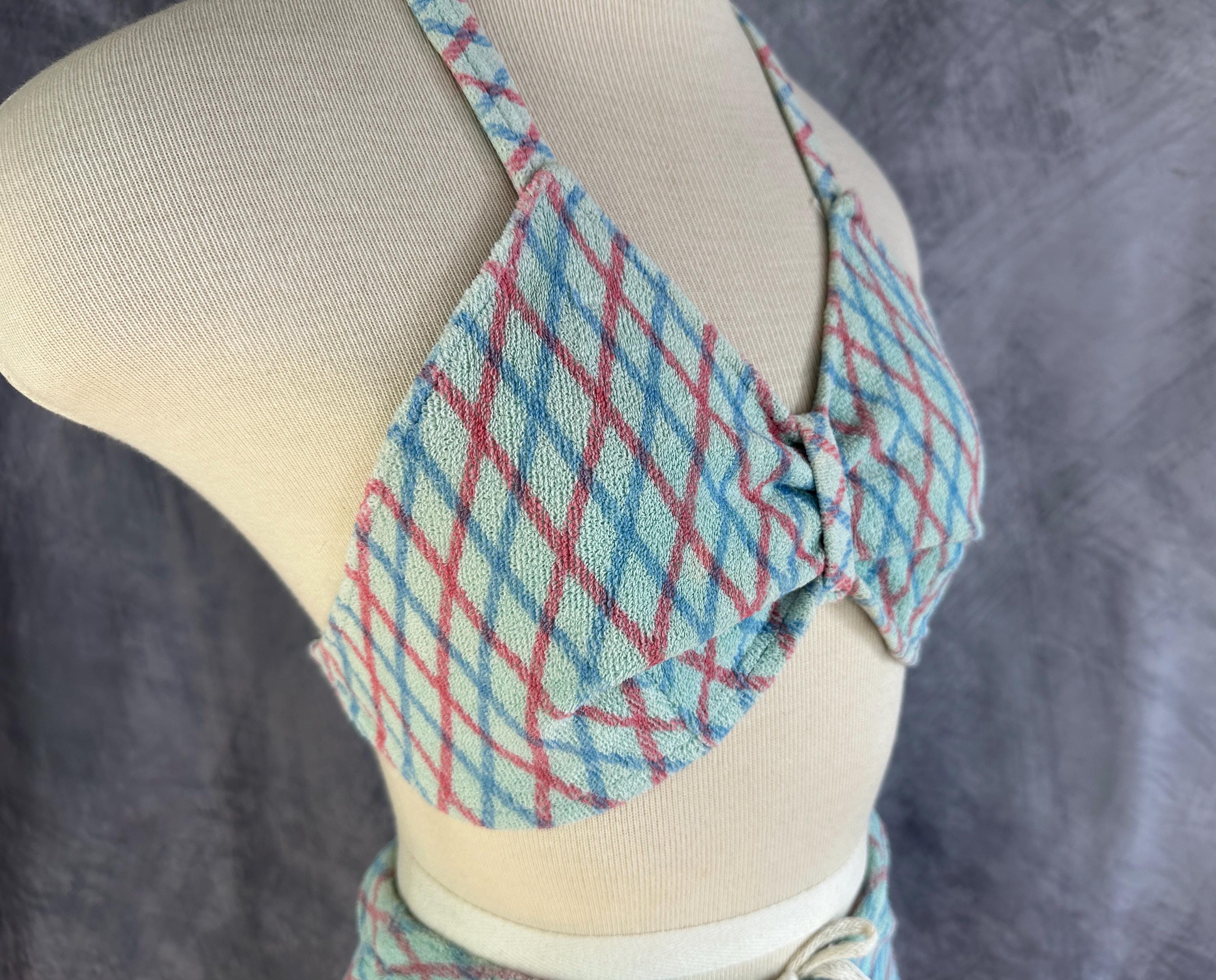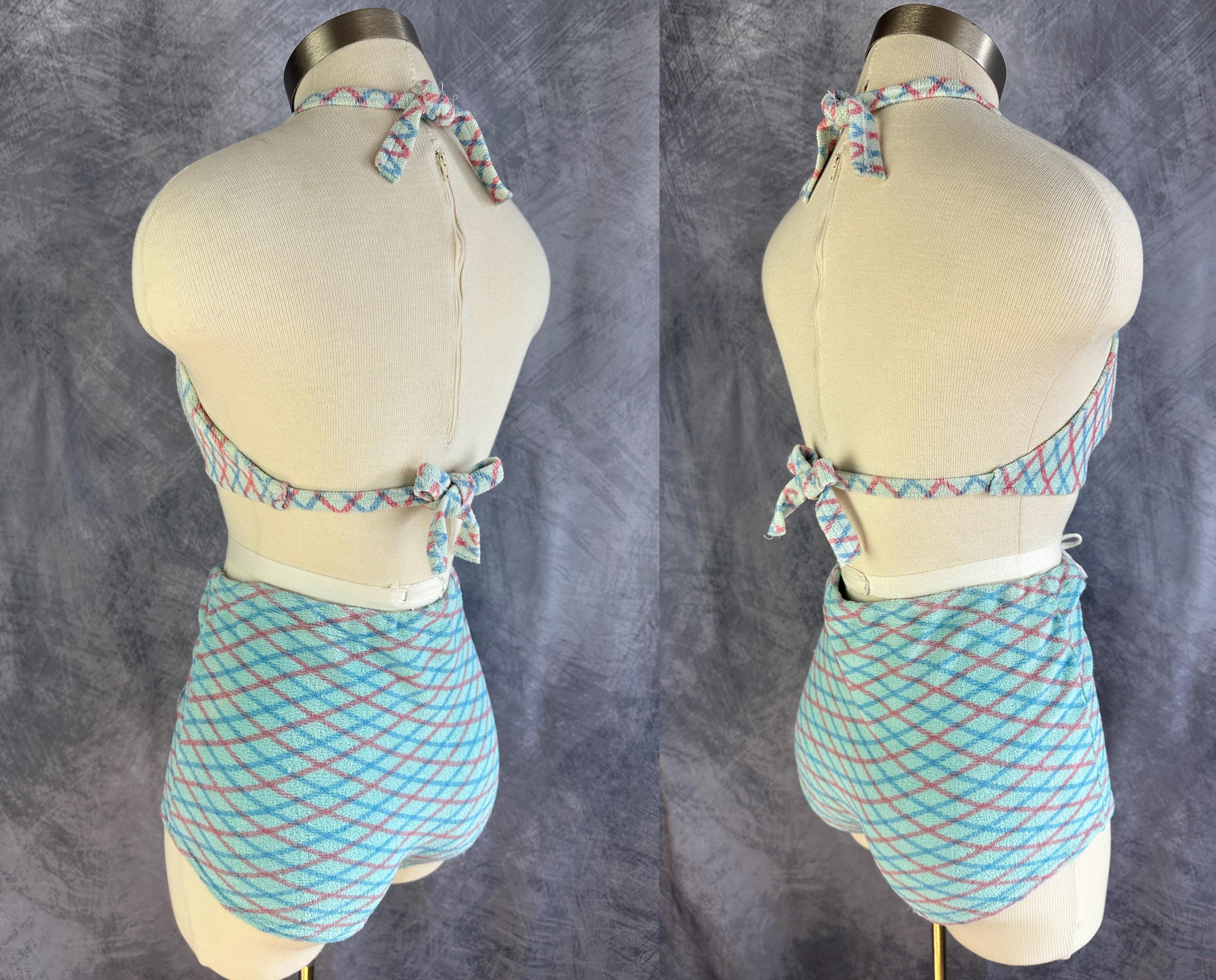 A bonnie lass you'll be on sand and sea in this 1930s bikini! These "Bonnie Togs" in robin's egg blue terry cloth features an Argyle plaid of sky blue and salmon pink. The top is perfect for sunning with halter tie straps and ties around the back and the triangular cups are gathered in the center with a band. The bottoms have a boy short cut with subtle center ruching and a drawstring waist. This swimsuit is in great vintage condition, with no holes, stains, or odors to note.