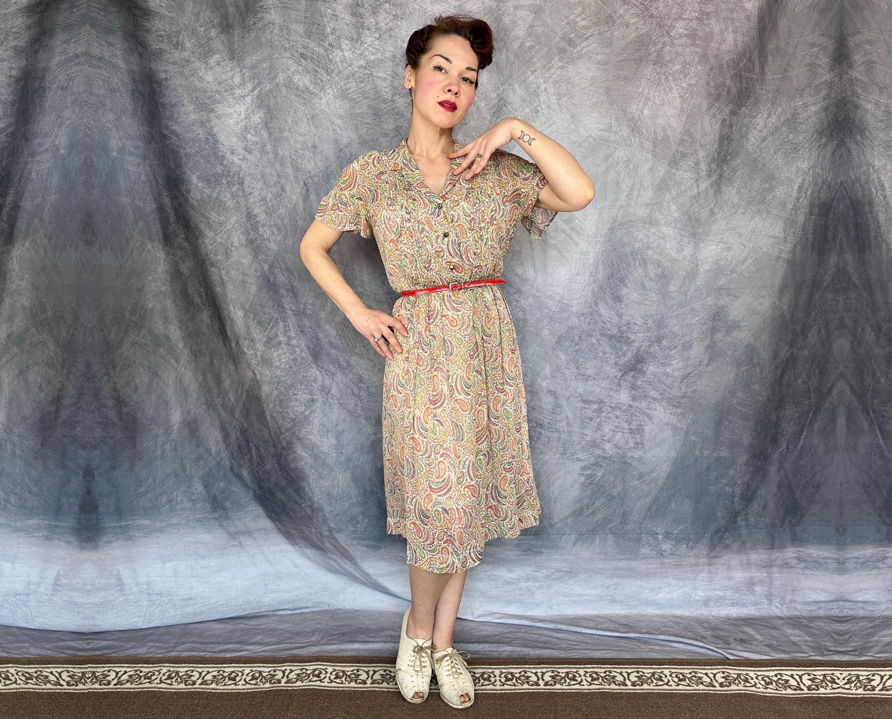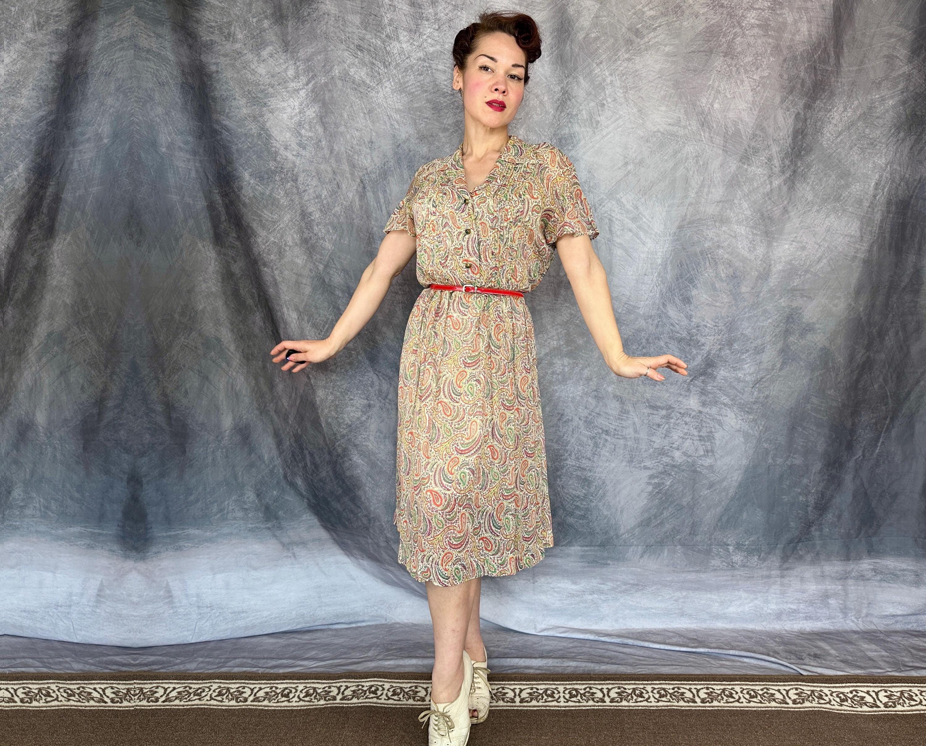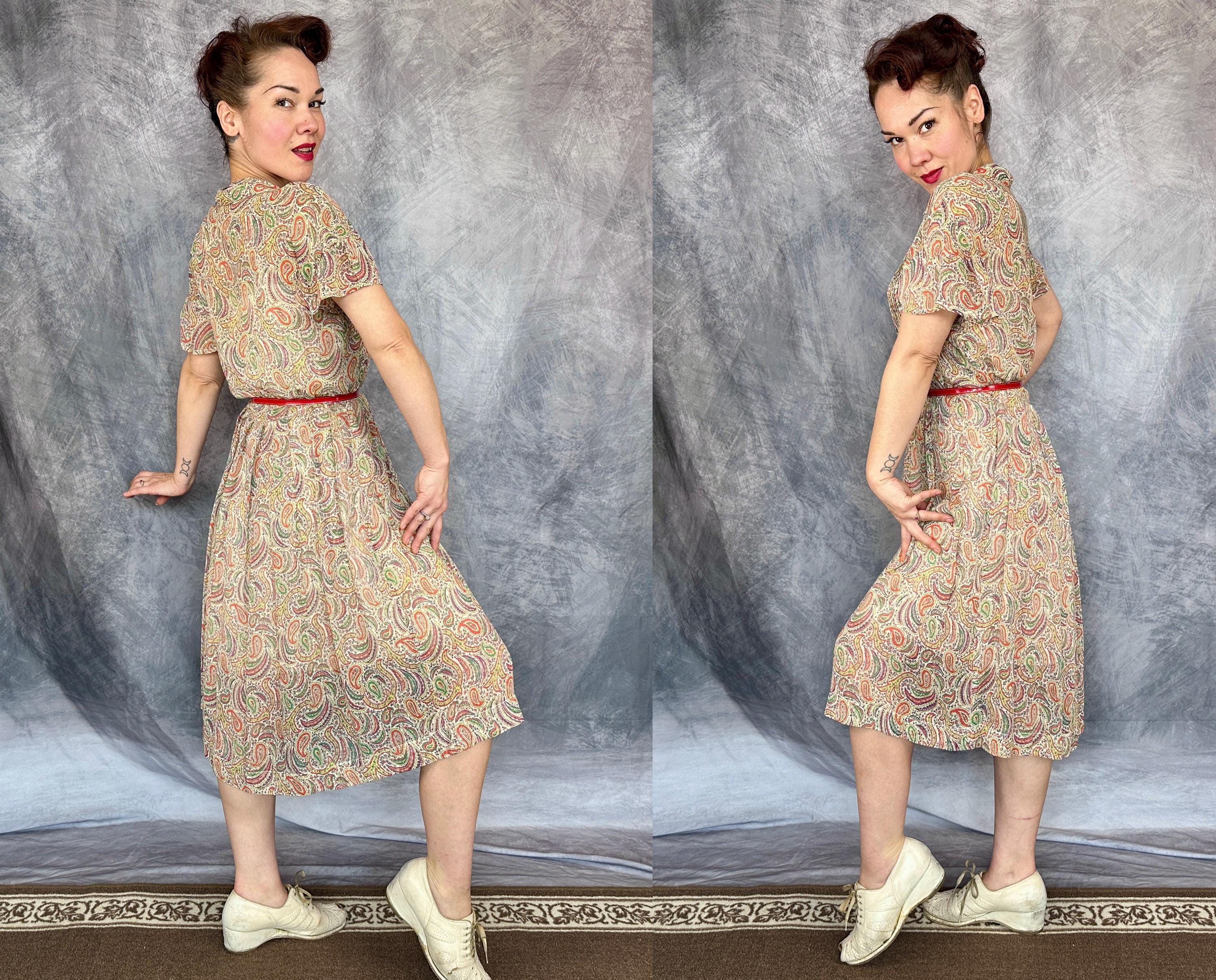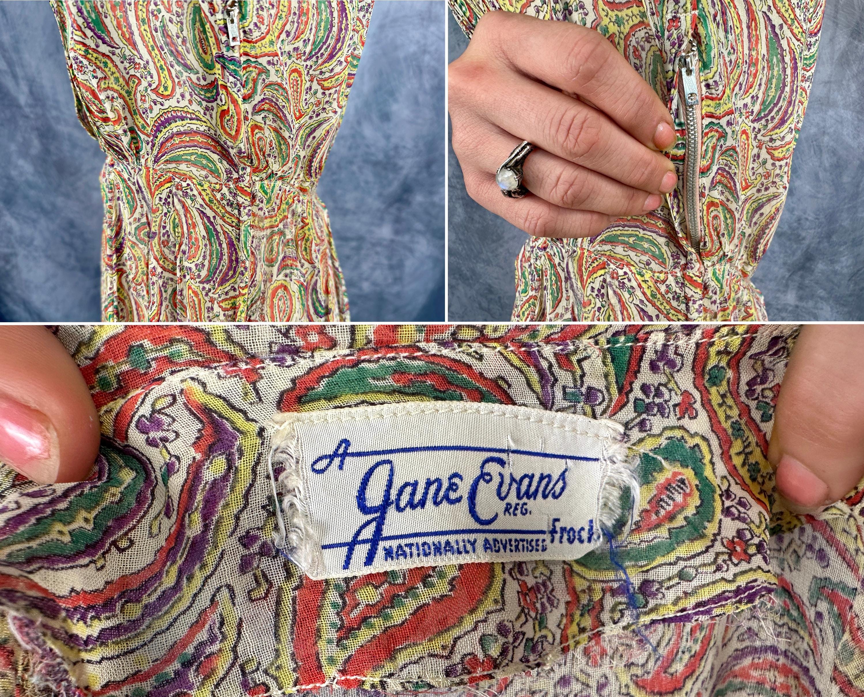 You'll gain so much poise in this paisley perfect 1940s dress! This cotton voile frock is sheer and light, perfect for summer. It is fully covered in paisleys of canary yellow, tomato red, grass green, and grape purple on white. The shirtwaist style fastens with green rhinestone buttons and has flutter sleeves, pintuck bodice stripes, and pleats around the waist making a full skirt. Metal zipper on the side. Labeled "Jane Evans". This dress is in great vintage condition, with no holes, stains, or odors to note. Please note, belt is model's own.