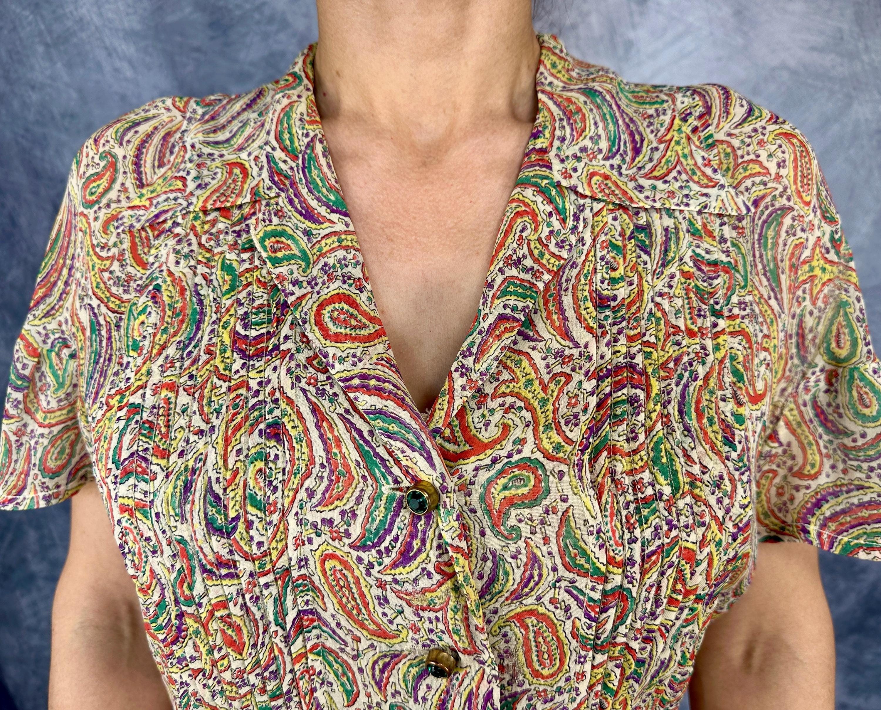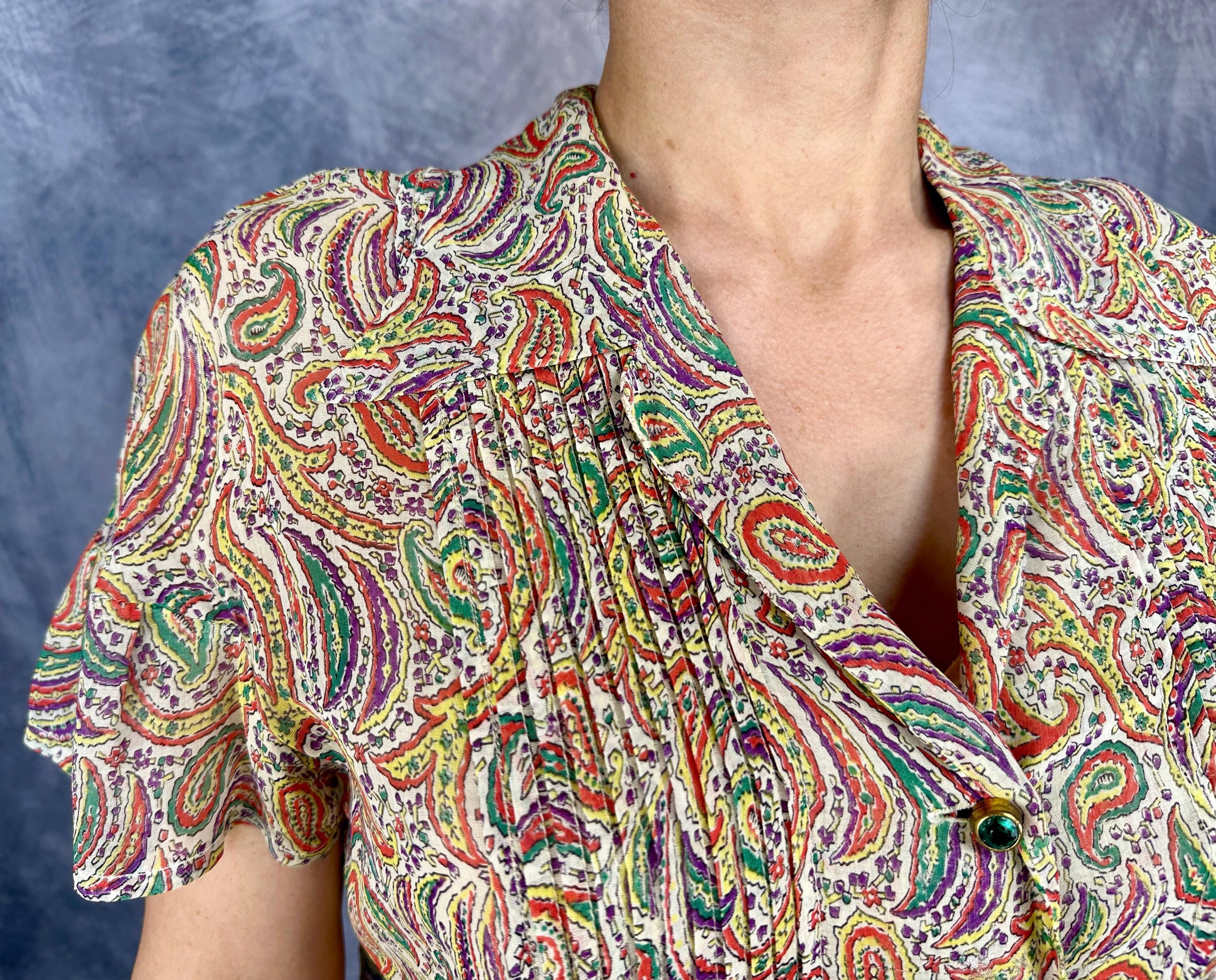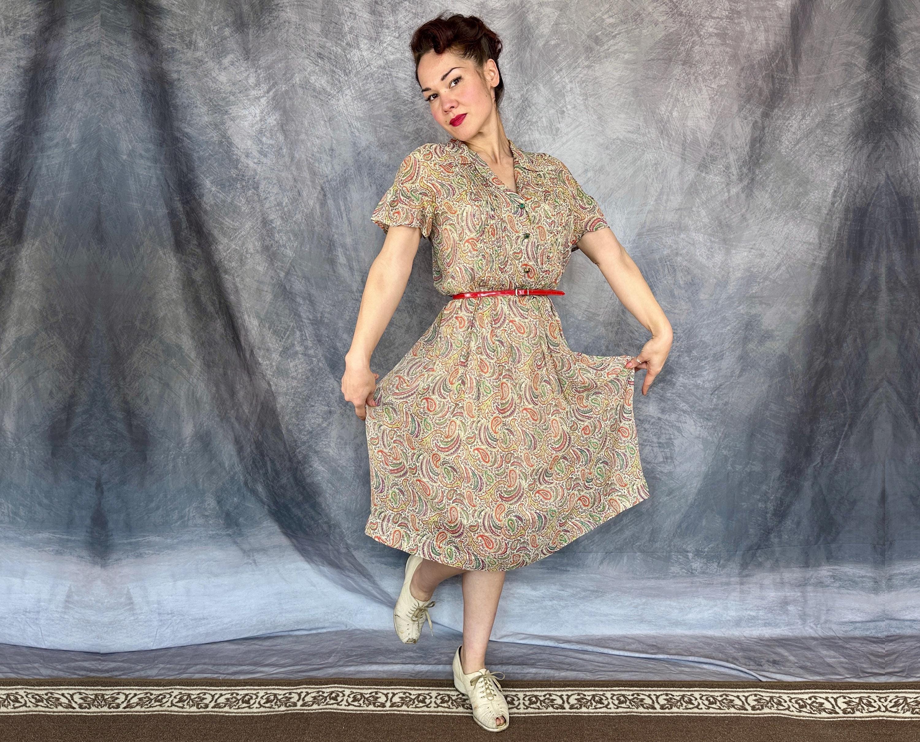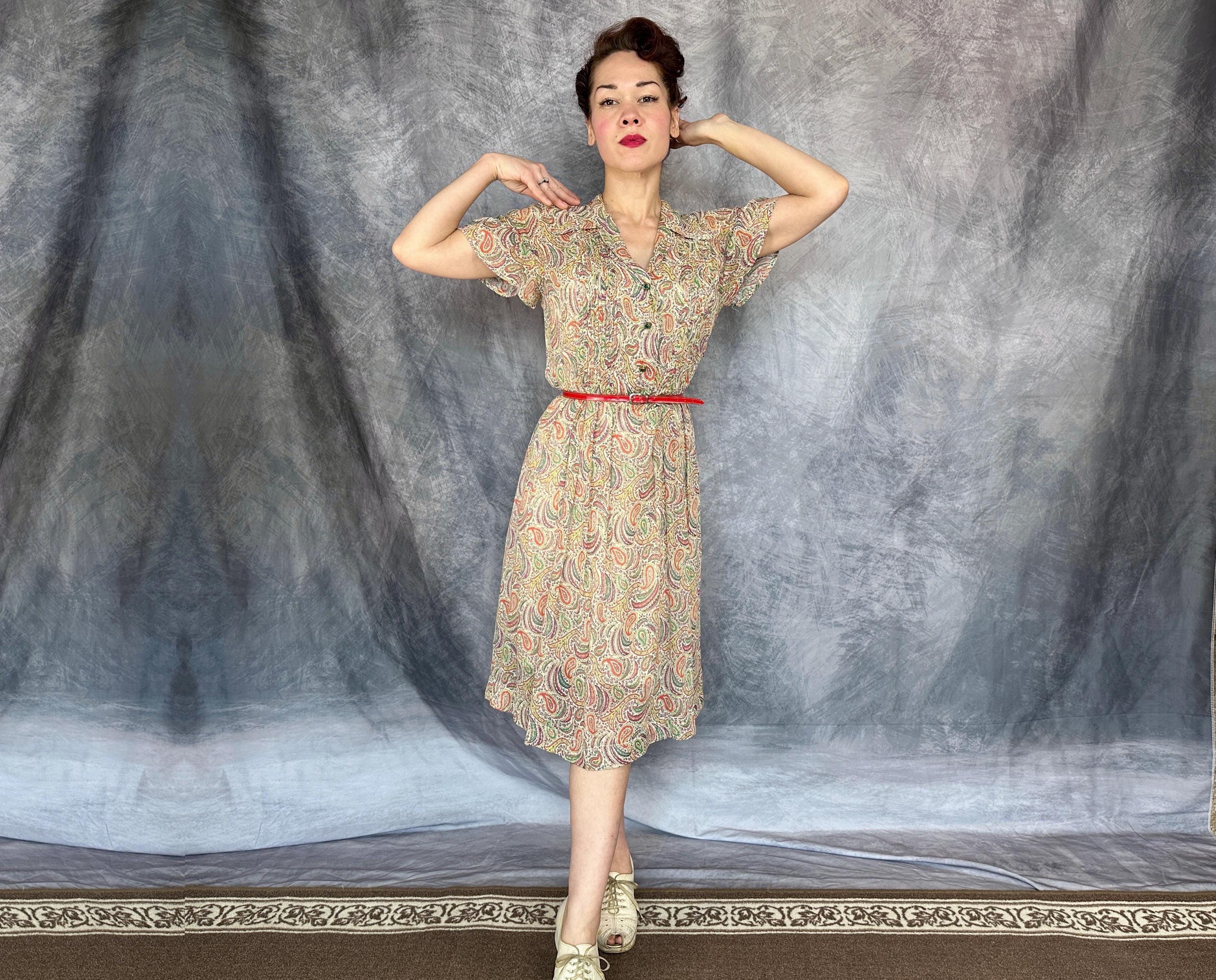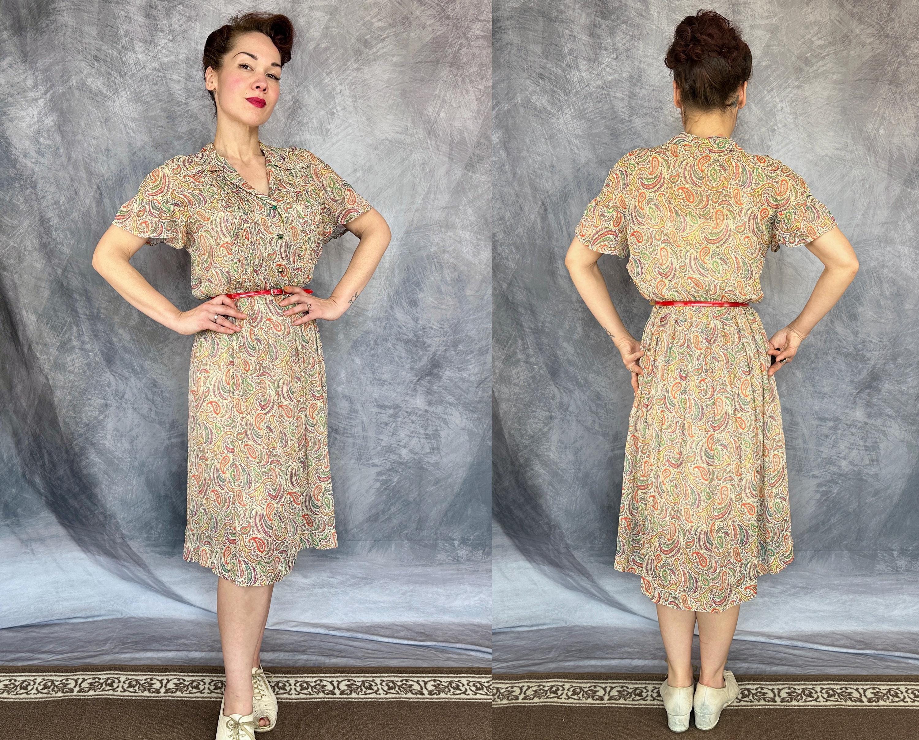 You'll gain so much poise in this paisley perfect 1940s dress! This cotton voile frock is sheer and light, perfect for summer. It is fully covered in paisleys of canary yellow, tomato red, grass green, and grape purple on white. The shirtwaist style fastens with green rhinestone buttons and has flutter sleeves, pintuck bodice stripes, and pleats around the waist making a full skirt. Metal zipper on the side. Labeled "Jane Evans". This dress is in great vintage condition, with no holes, stains, or odors to note. Please note, belt is model's own.