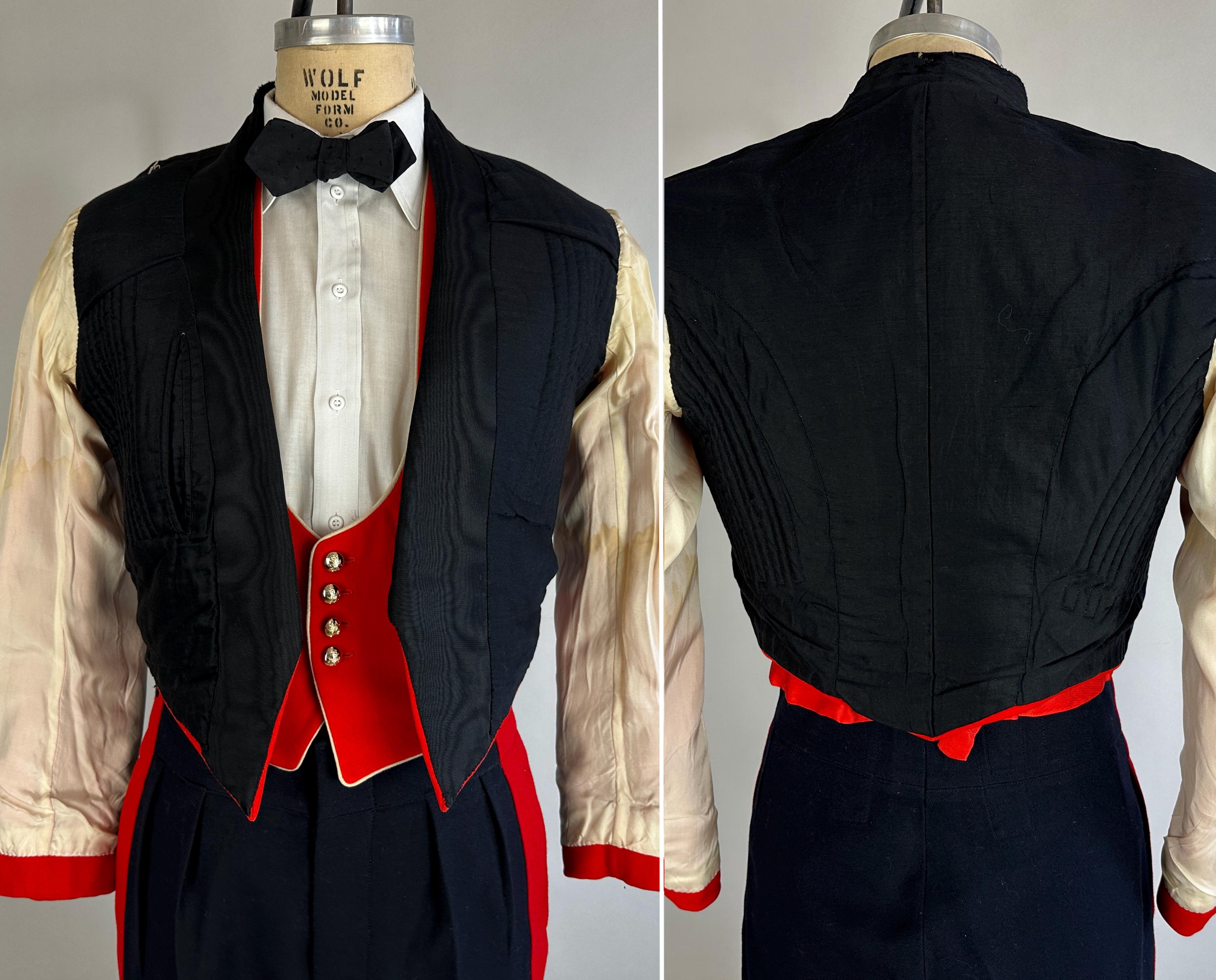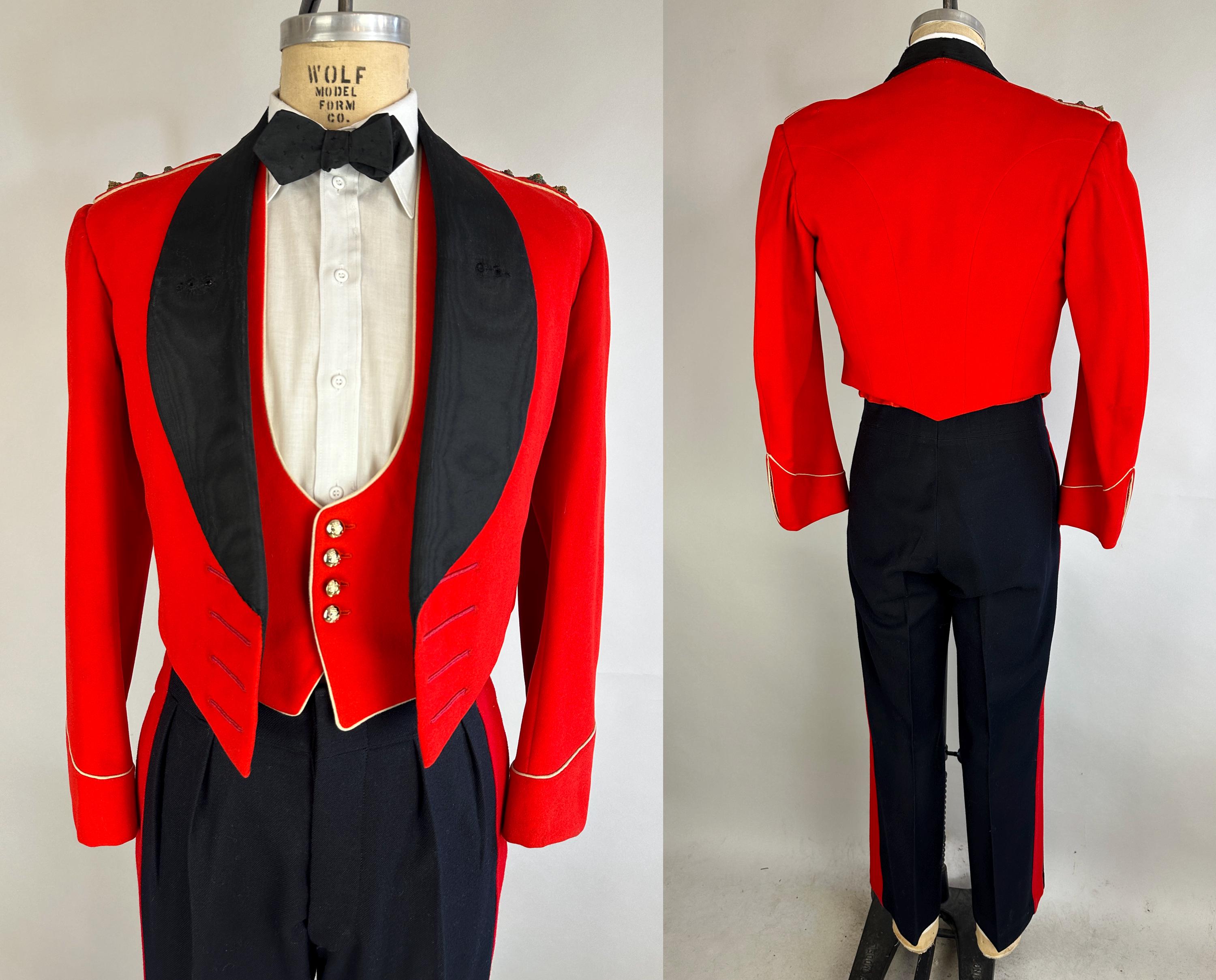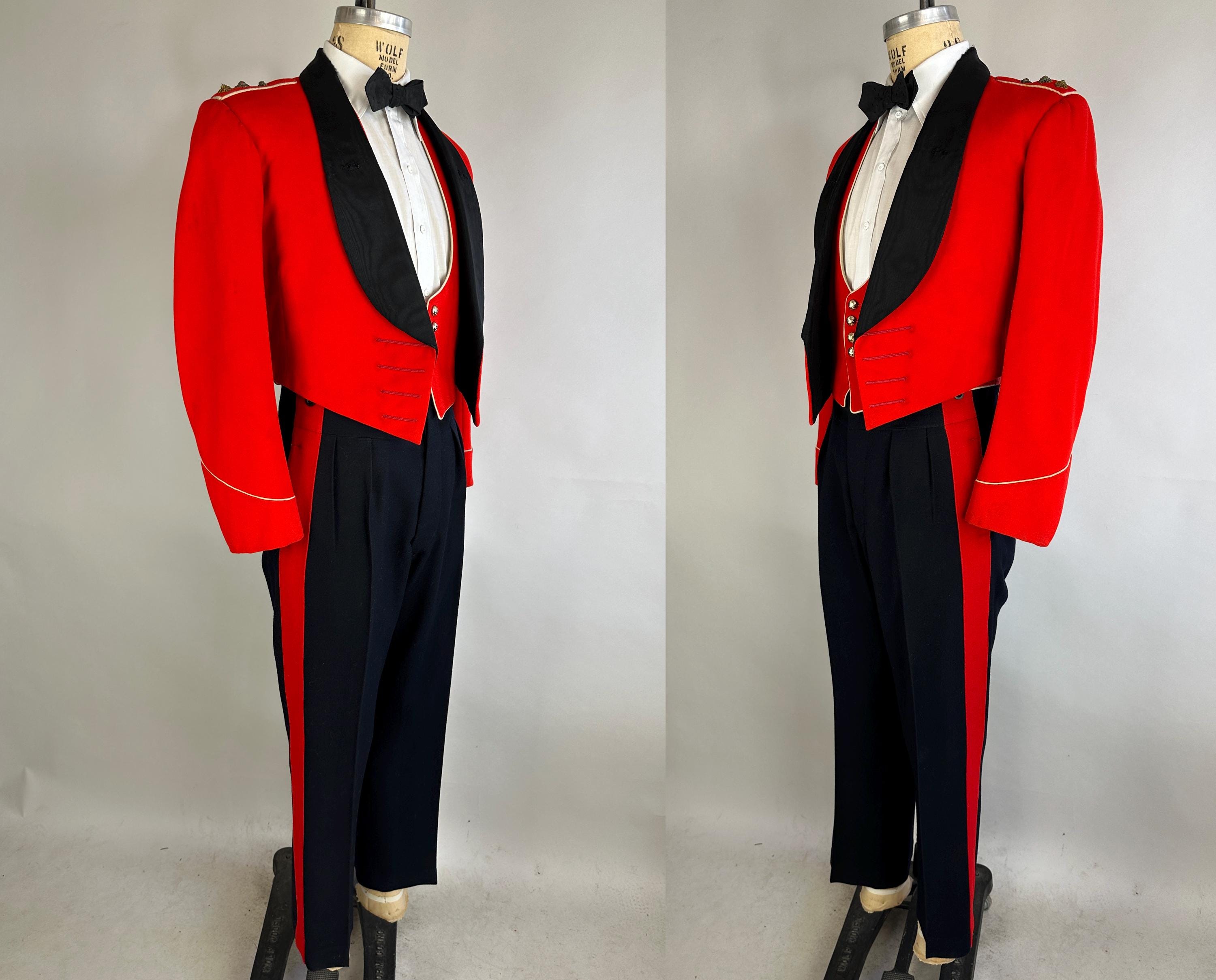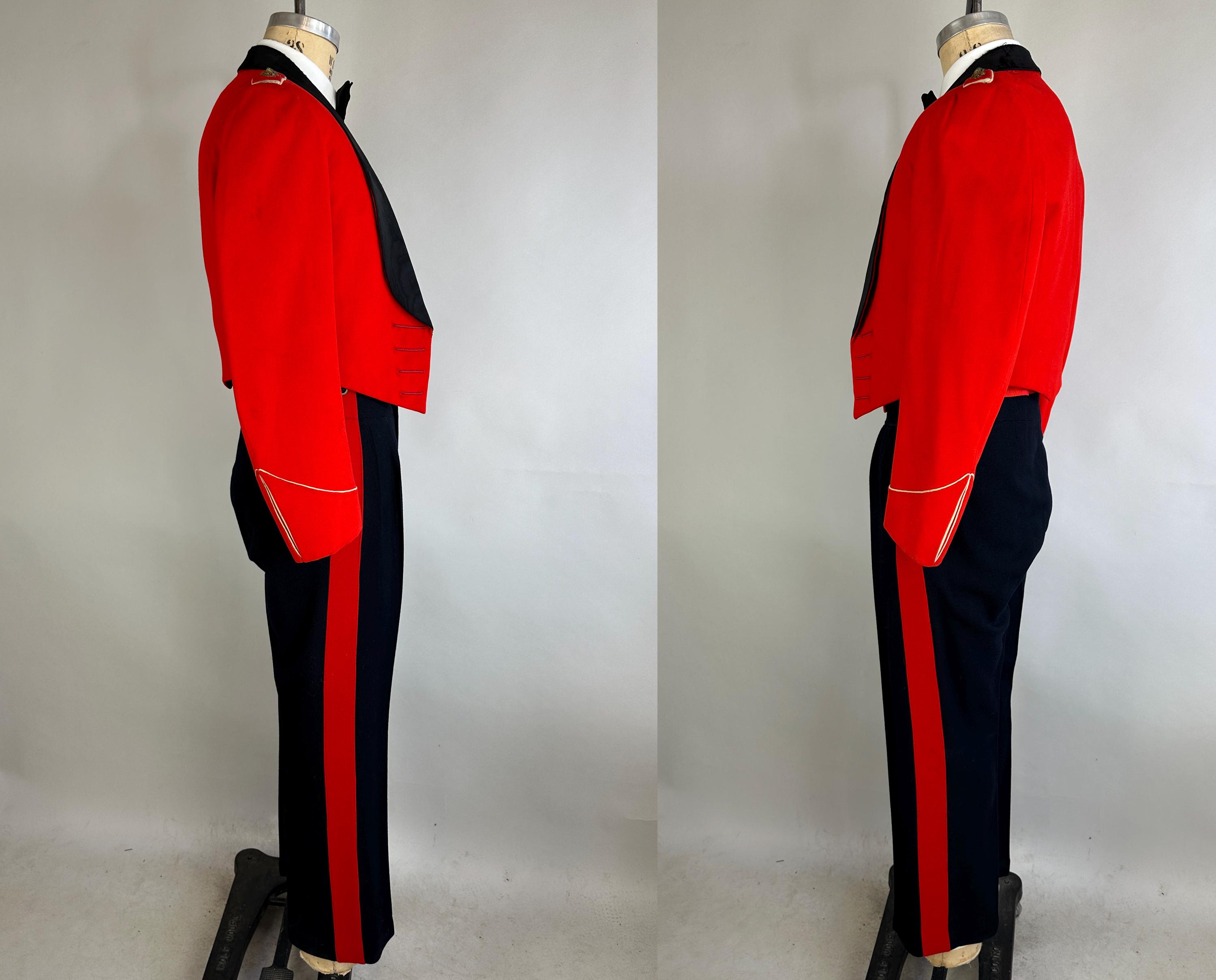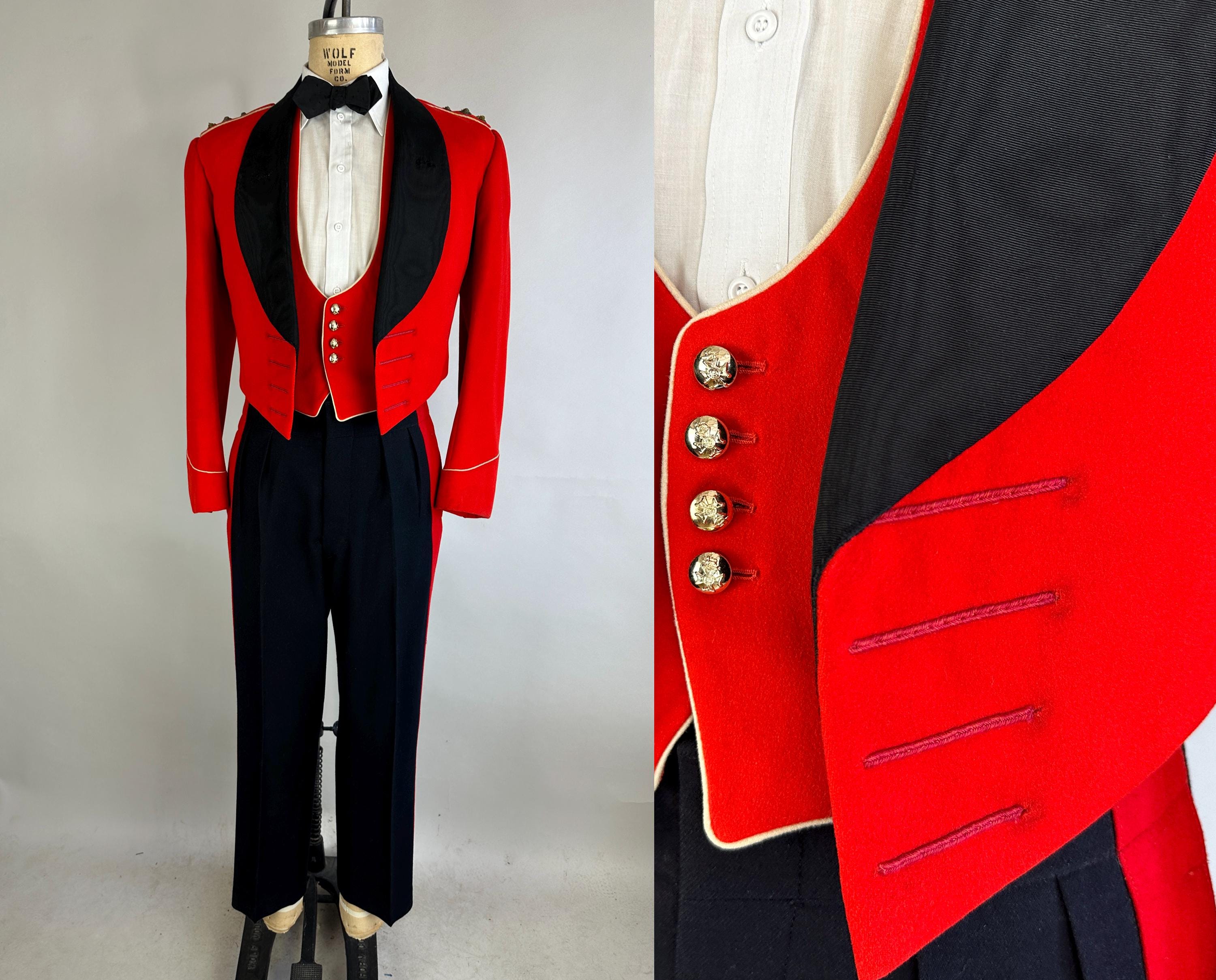 You'll be dressed to a T and true to regimen with this 1957 dated ceremonial uniform! This British issues ensemble makes a bold statement with it's contrast colours of black and fire red. Mainly wool but with accents of silk the contrast continues. The jacket is a cropped style with no closures though faux button holes of silk cord in fuchsia give a clean look. It has a shawl lapel of moire silk and white piping trims the cuffs and shoulder epaulets which are adorned with a trio of bullion embroidered medallions. It is fully lined with combed cotton with inner quilting for structure and a secret pocket is found within. The lack of closures on the jacket allows the waistcoat to shine with it's four gleaming silver button and white piping to match the coat. It is lined and backed with rayon and can be adjusted with a buckled cinch. The trousers have a wide waistband rising higher on the back with two peaks and double pleated front looks swell amongst the wide red side stripes. Side seam pockets keep the stripes straight and outer suspender buttons match the button fly. Buckling cummerbund of silk faille with wide pleats top it all off. This suit is in great vintage condition, the jacket back of neck has wear but no other holes, odors, nor stains to note.