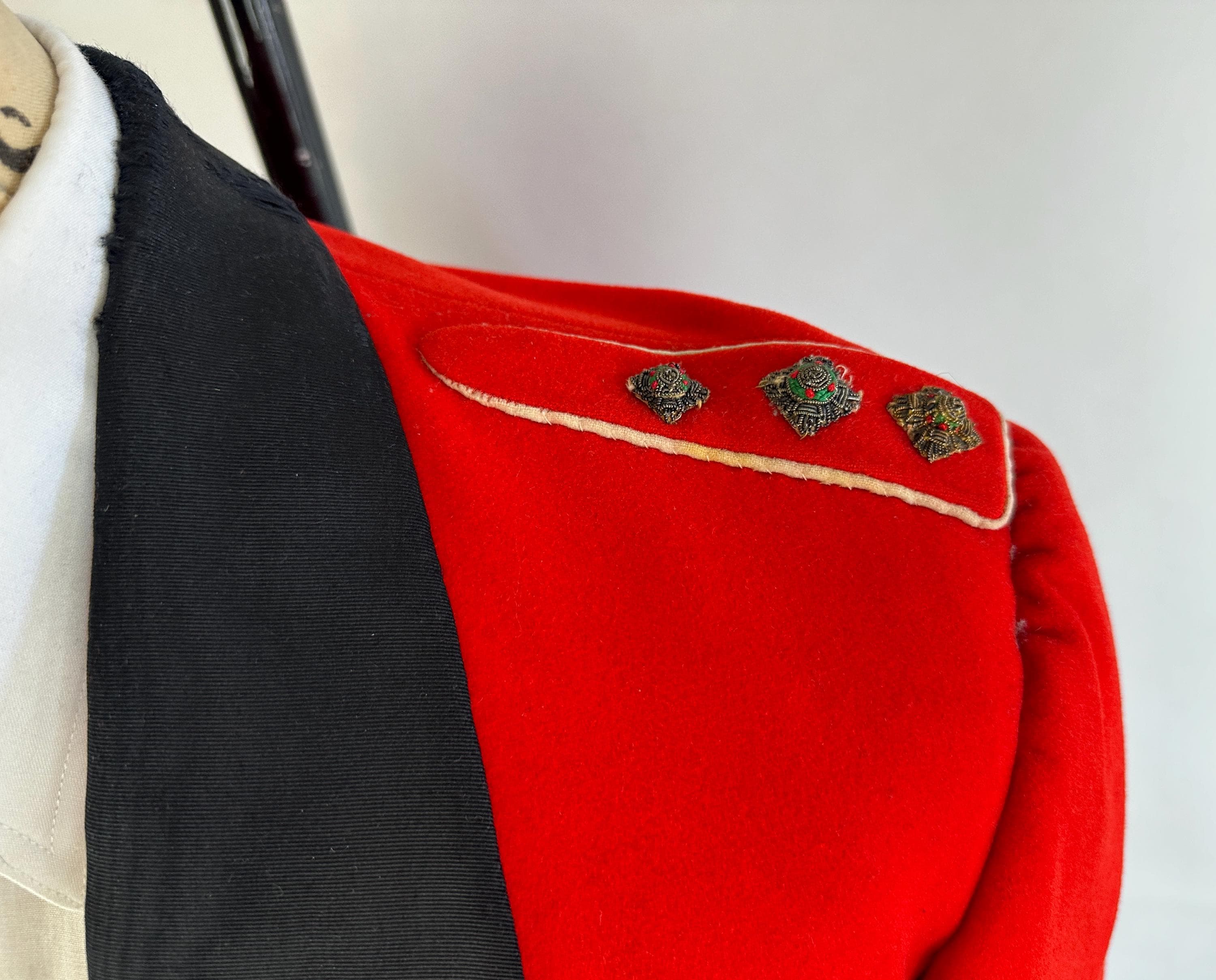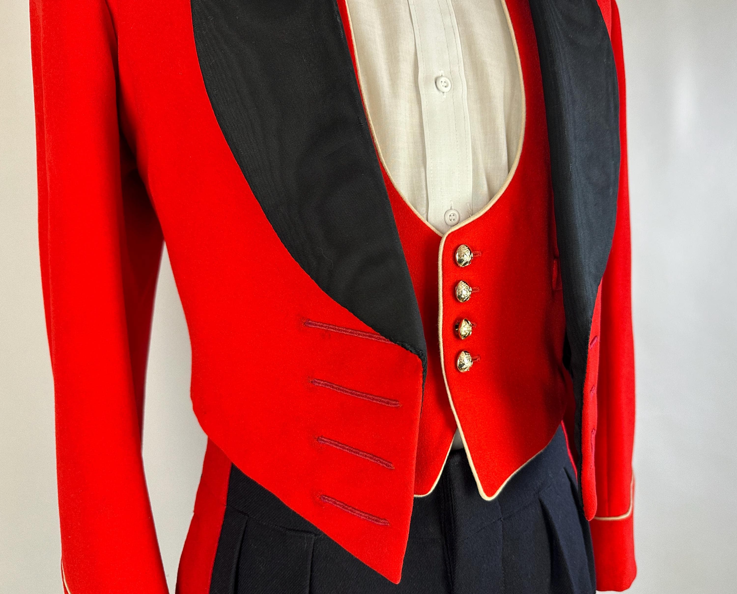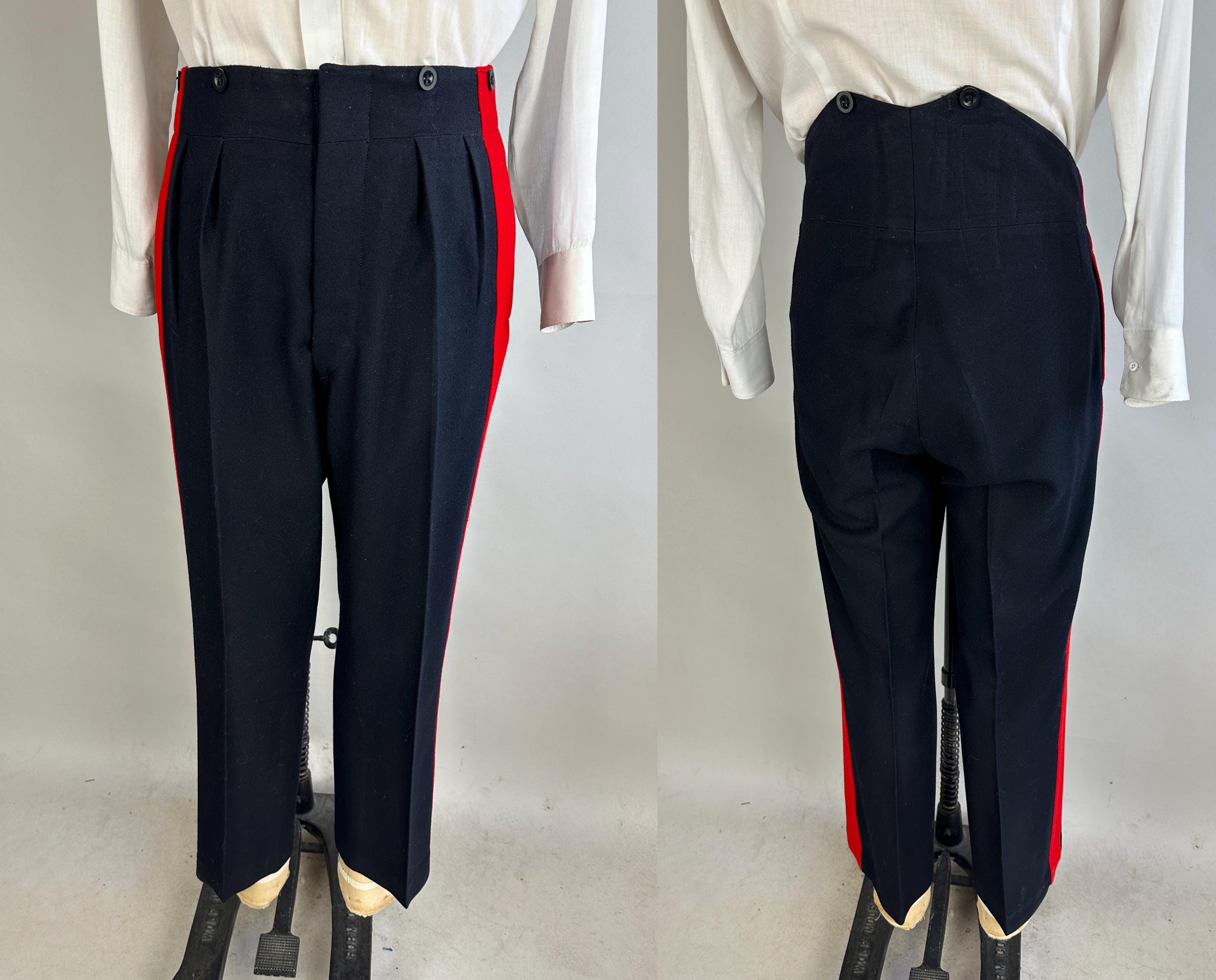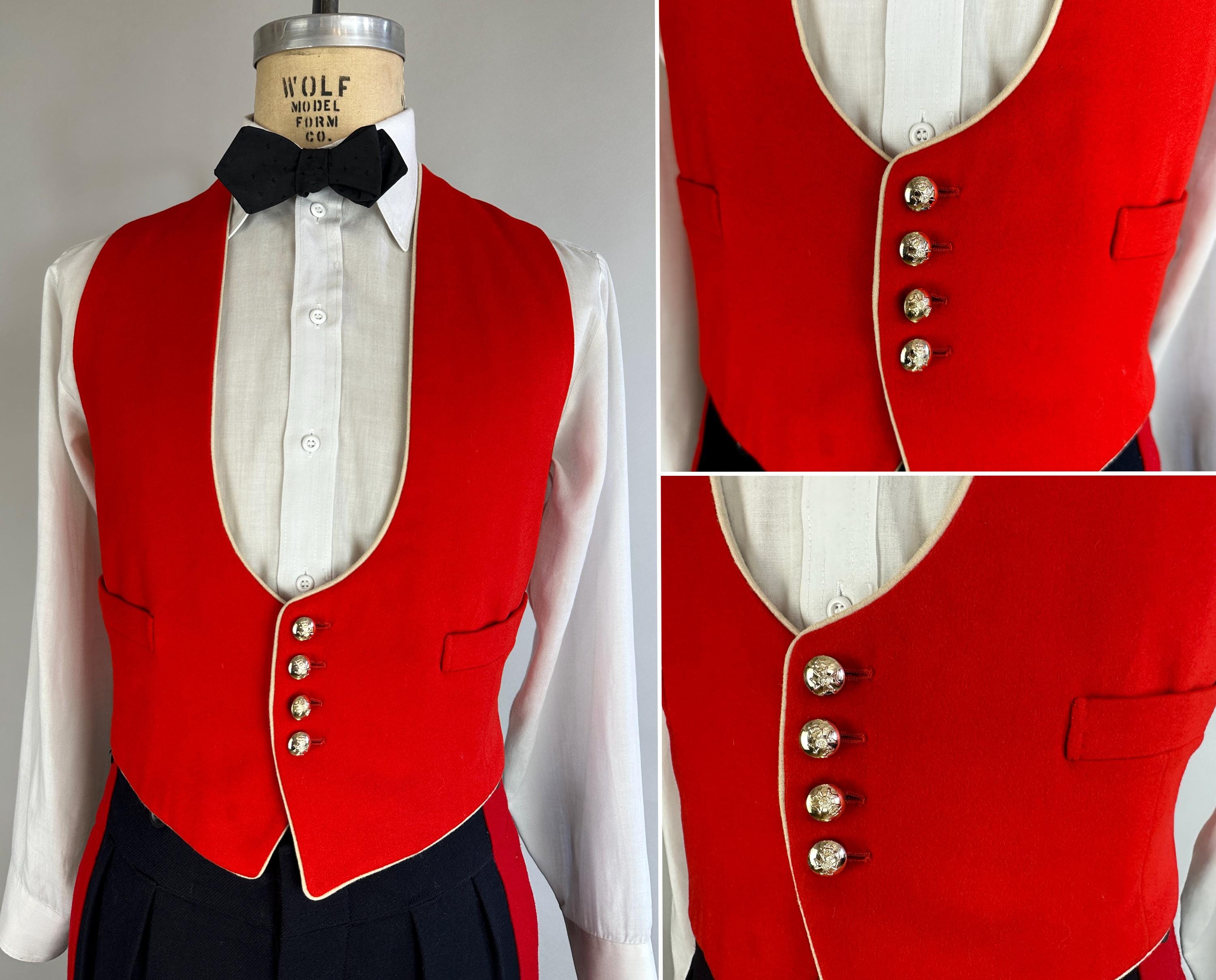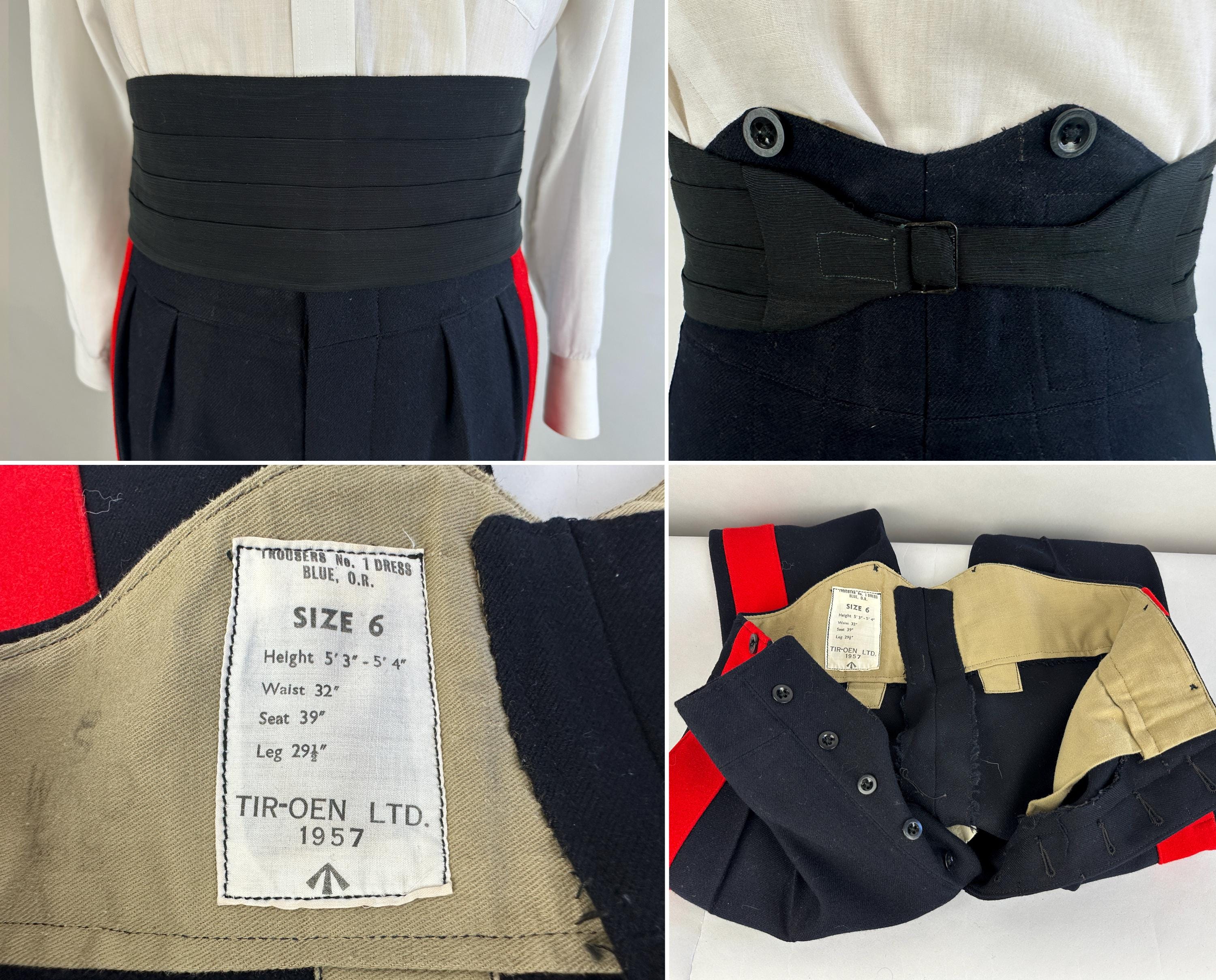 You'll be dressed to a T and true to regimen with this 1957 dated ceremonial uniform! This British issues ensemble makes a bold statement with it's contrast colours of black and fire red. Mainly wool but with accents of silk the contrast continues. The jacket is a cropped style with no closures though faux button holes of silk cord in fuchsia give a clean look. It has a shawl lapel of moire silk and white piping trims the cuffs and shoulder epaulets which are adorned with a trio of bullion embroidered medallions. It is fully lined with combed cotton with inner quilting for structure and a secret pocket is found within. The lack of closures on the jacket allows the waistcoat to shine with it's four gleaming silver button and white piping to match the coat. It is lined and backed with rayon and can be adjusted with a buckled cinch. The trousers have a wide waistband rising higher on the back with two peaks and double pleated front looks swell amongst the wide red side stripes. Side seam pockets keep the stripes straight and outer suspender buttons match the button fly. Buckling cummerbund of silk faille with wide pleats top it all off. This suit is in great vintage condition, the jacket back of neck has wear but no other holes, odors, nor stains to note.