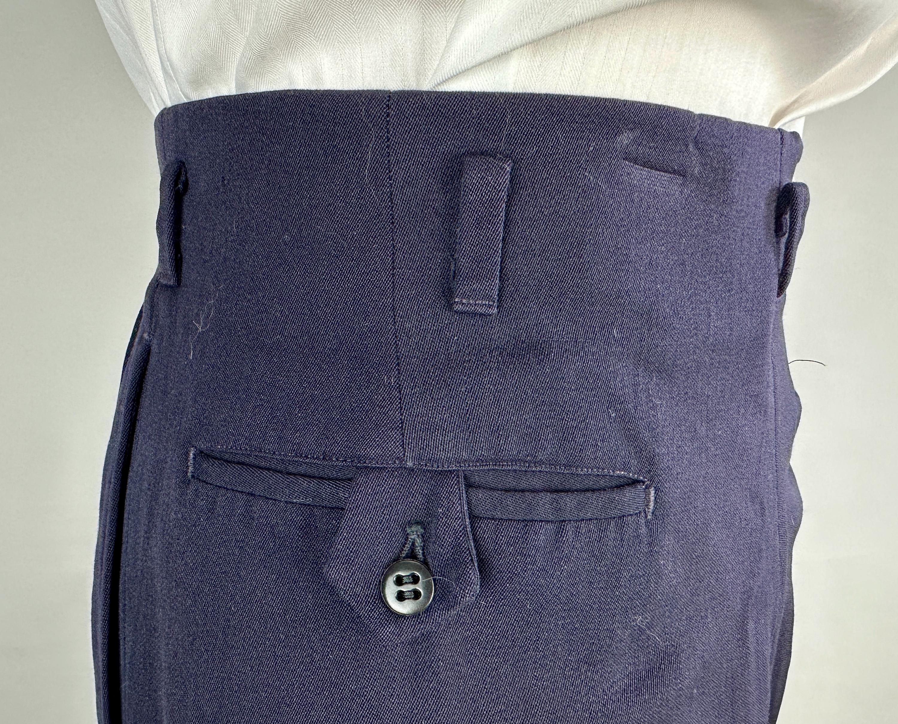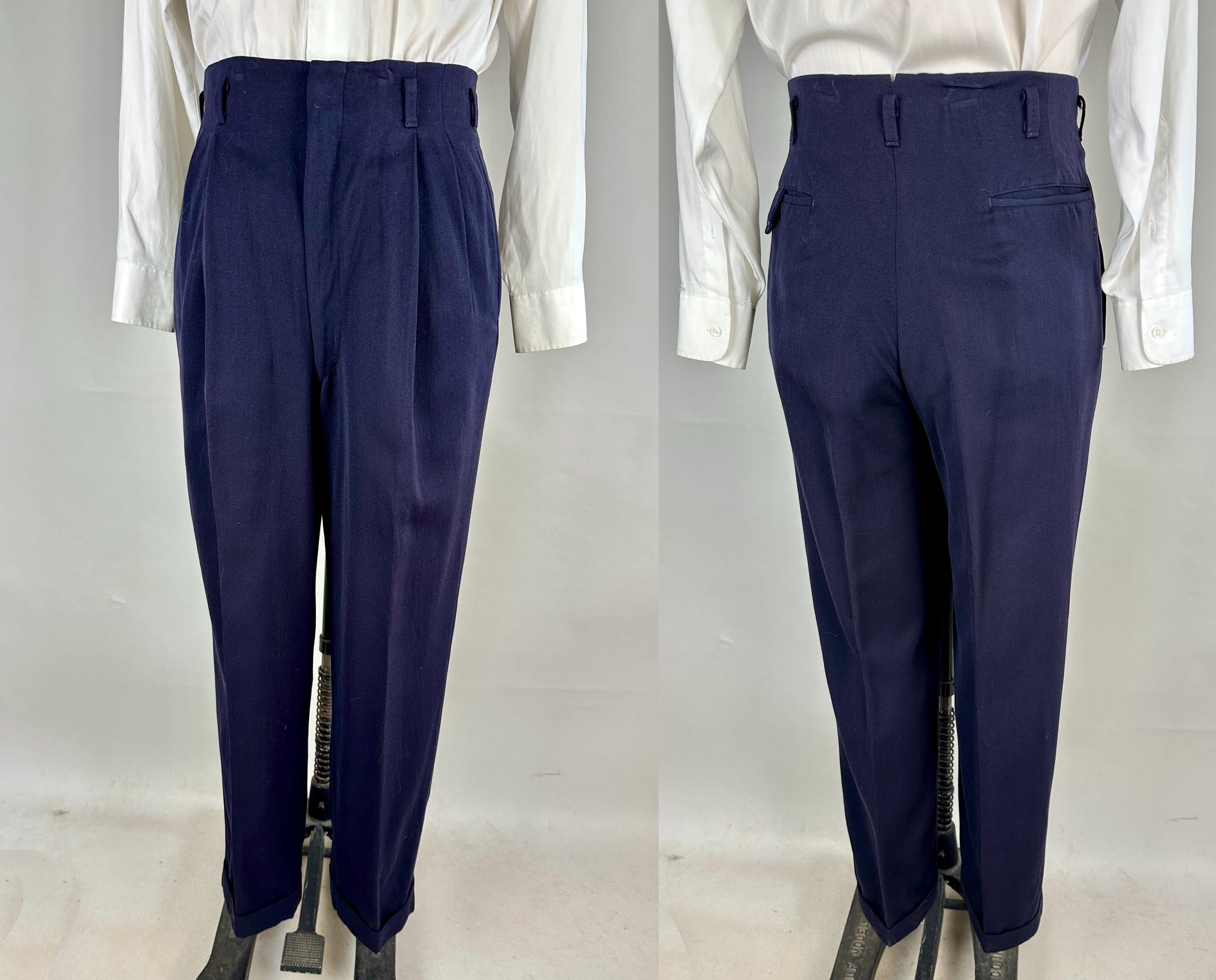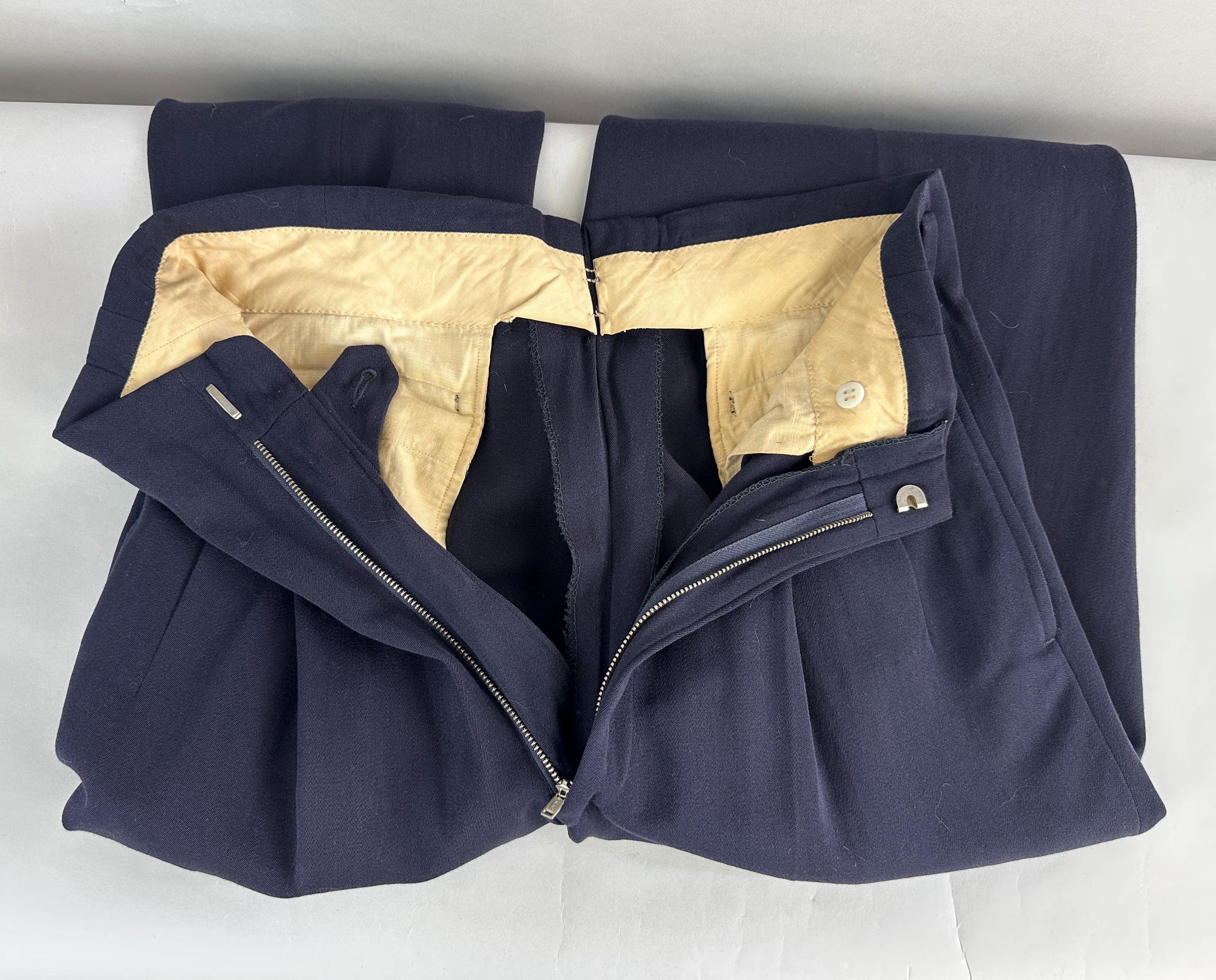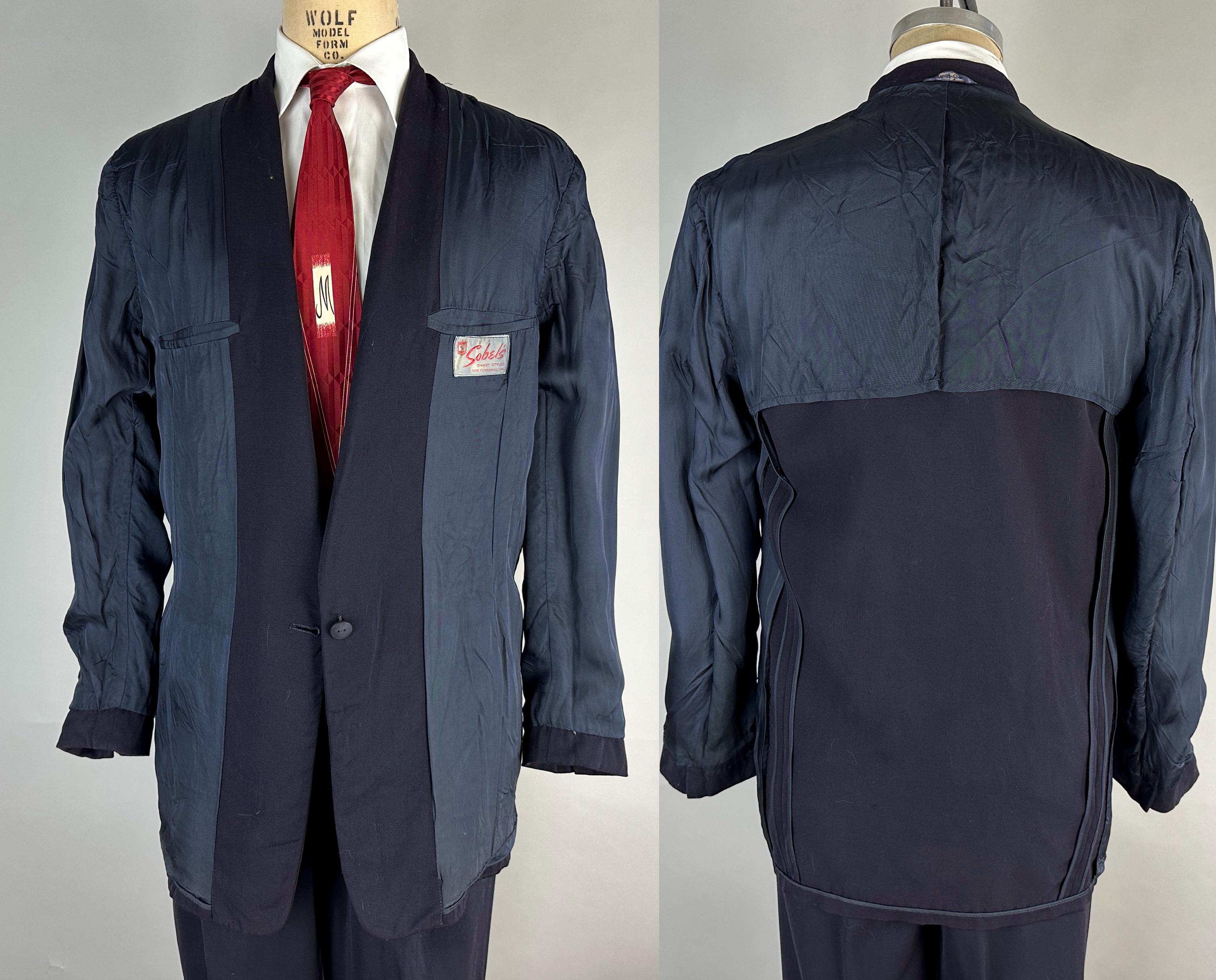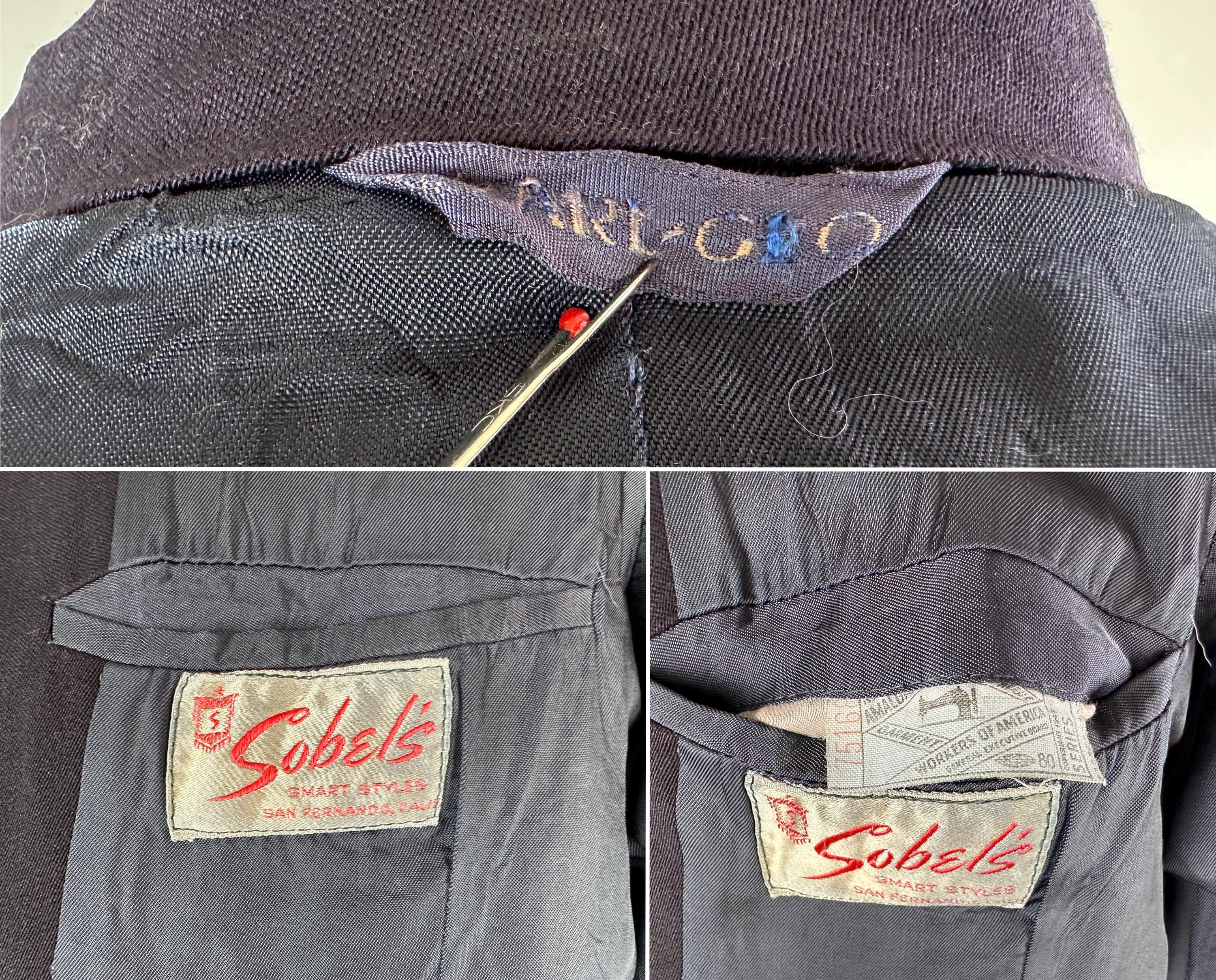 A smart suit for a smart man, this 1950s set will keep you fine while fine dining. The single breasted jacket has long notch lapels, three patch pockets, half lining with two inner pockets, ventless back, and after dinner style link-button closure option. The trousers have a double pleated Hollywood waist, dropped belt loops, four welted pockets with one buttoning in the back with a peaked tab, metal "Talon" zip fly, and cuffed hems. Labeled "Sobel's". 1949-62 Union Label dates this suit to the 1950s. This suit is in great vintage condition, with no stains, odors, or holes to note.