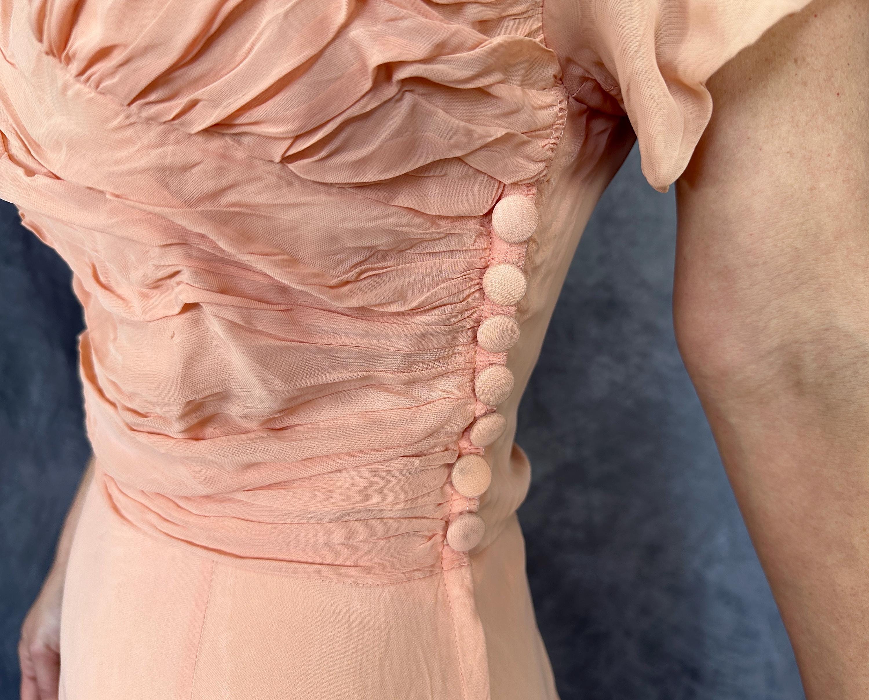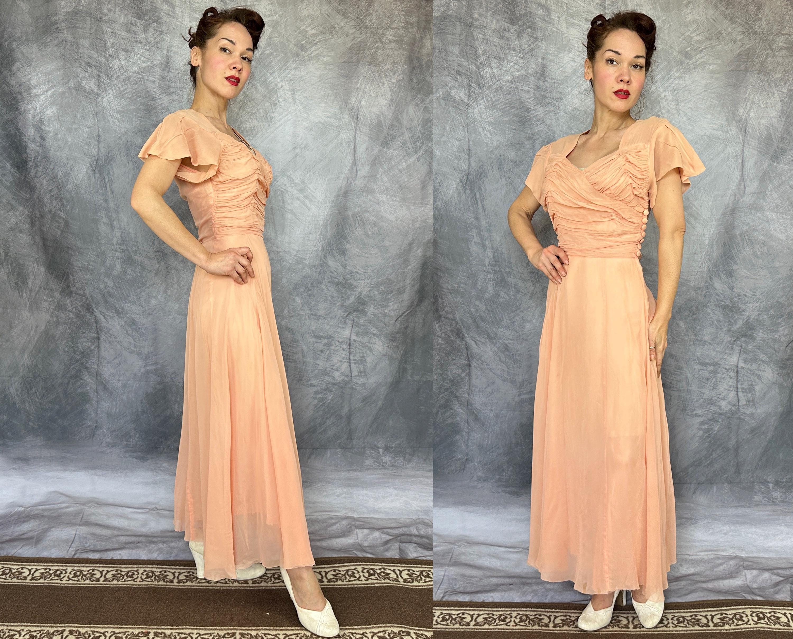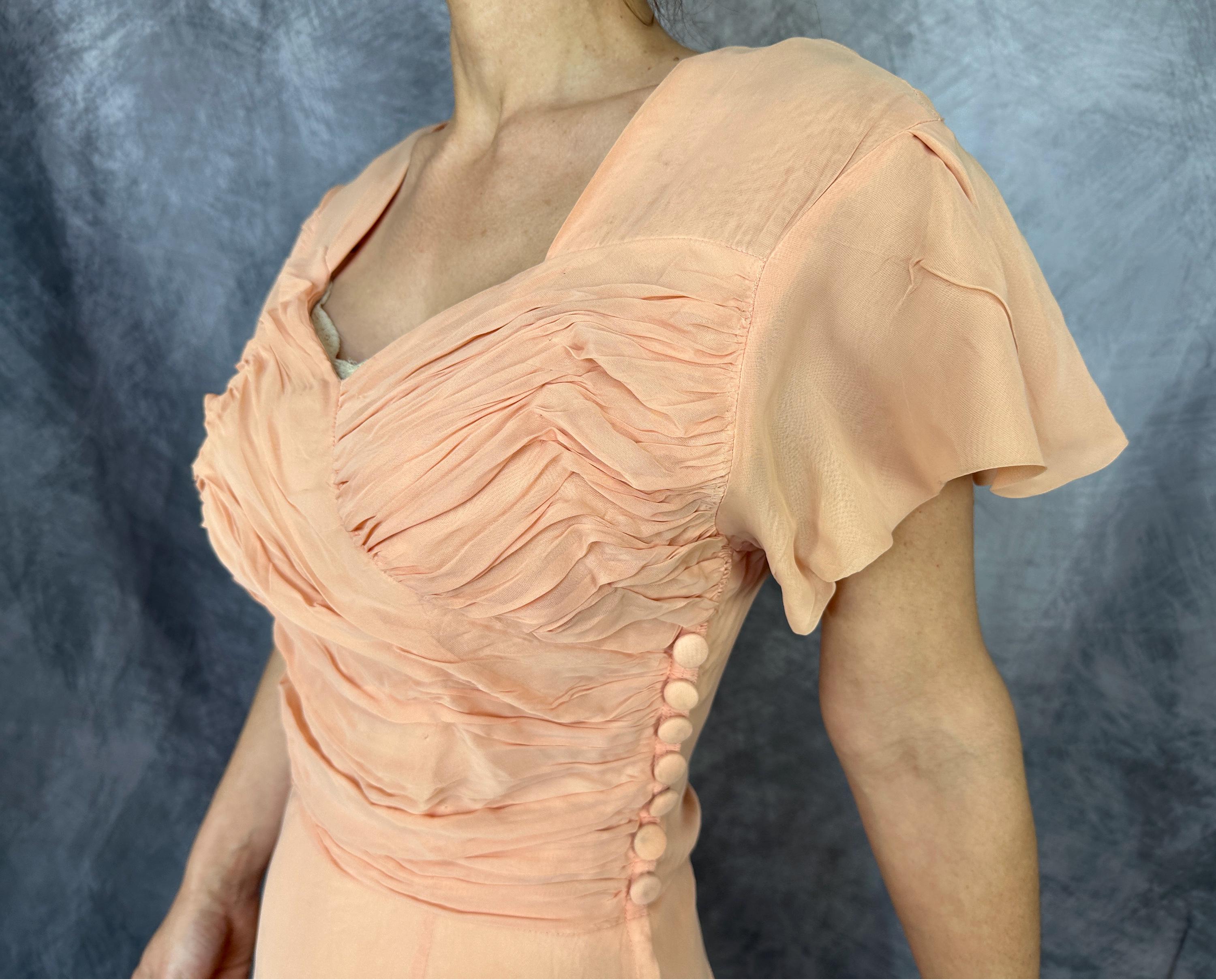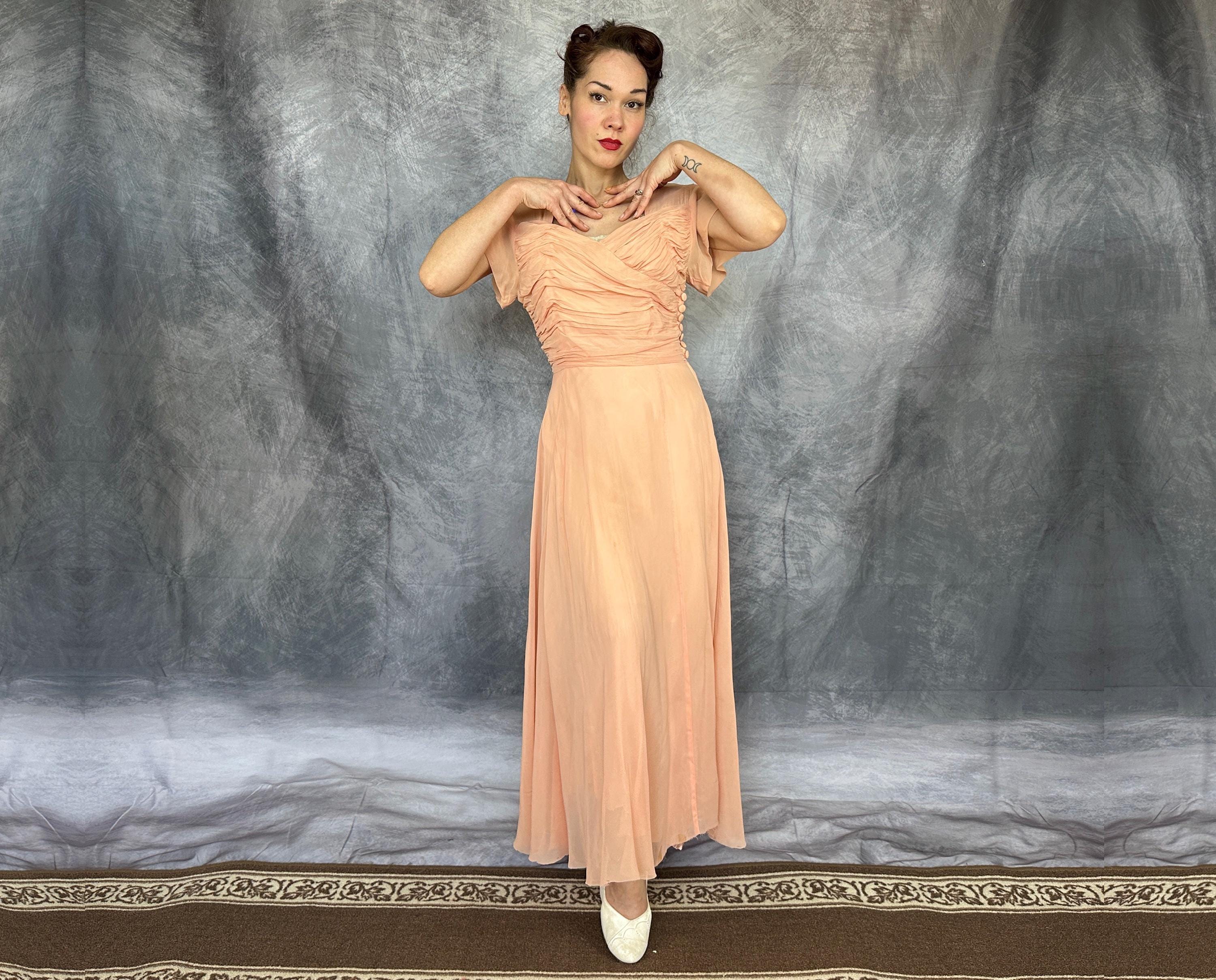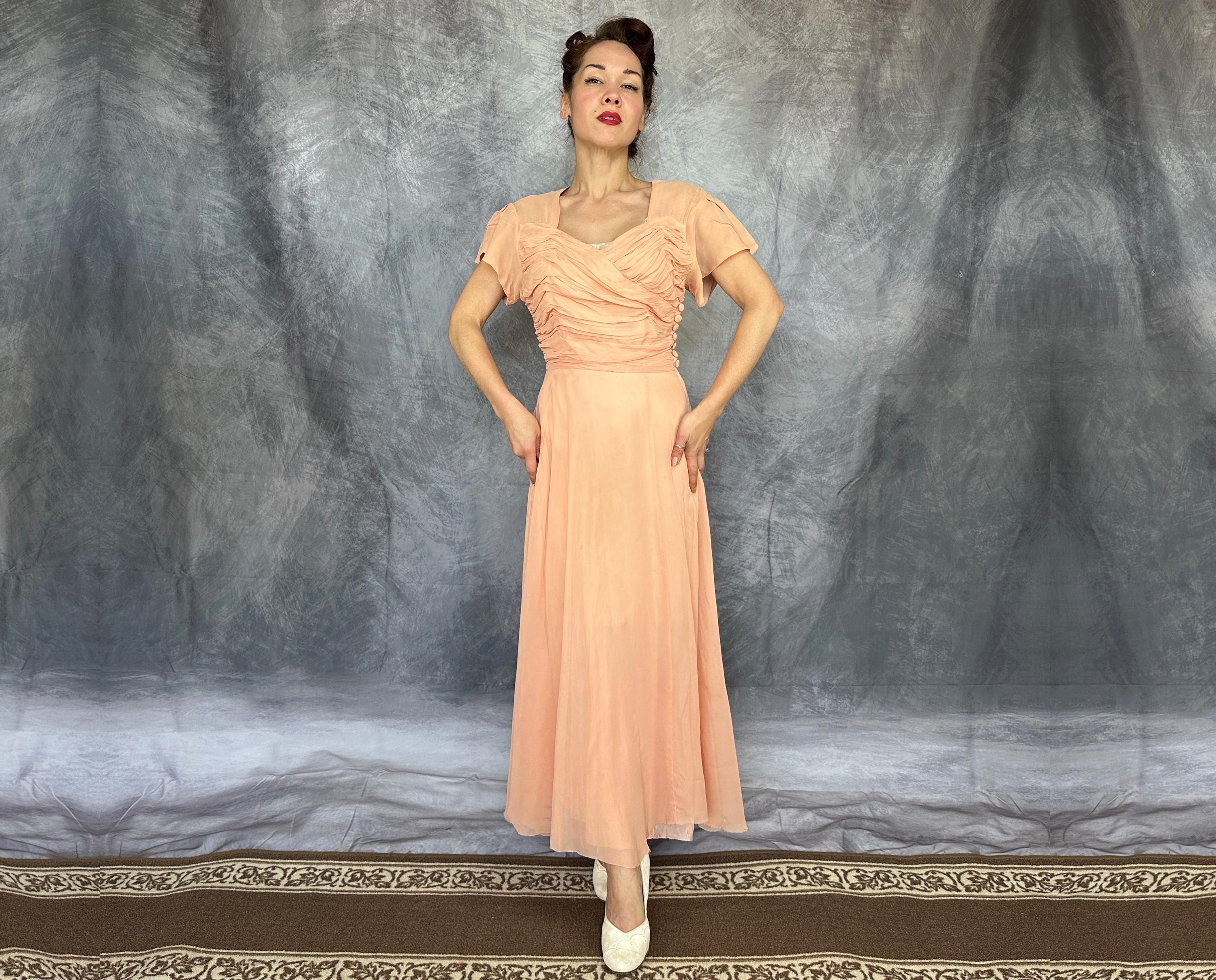 What a peach you'll be at a spring formal in this 1940s dress! This darling dress is peach pink rayon chiffon with a built-in slip. It's delightfully girlish with fluttery cap sleeves, sweetheart neckline, and full fluttery skirt hem. The front bodice is heavily ruched forming a faux wrap and decorated with seven self fabric buttons concealing the metal zip closure on the side. This dress is in great vintage condition, with no holes, stains, or odors to note.