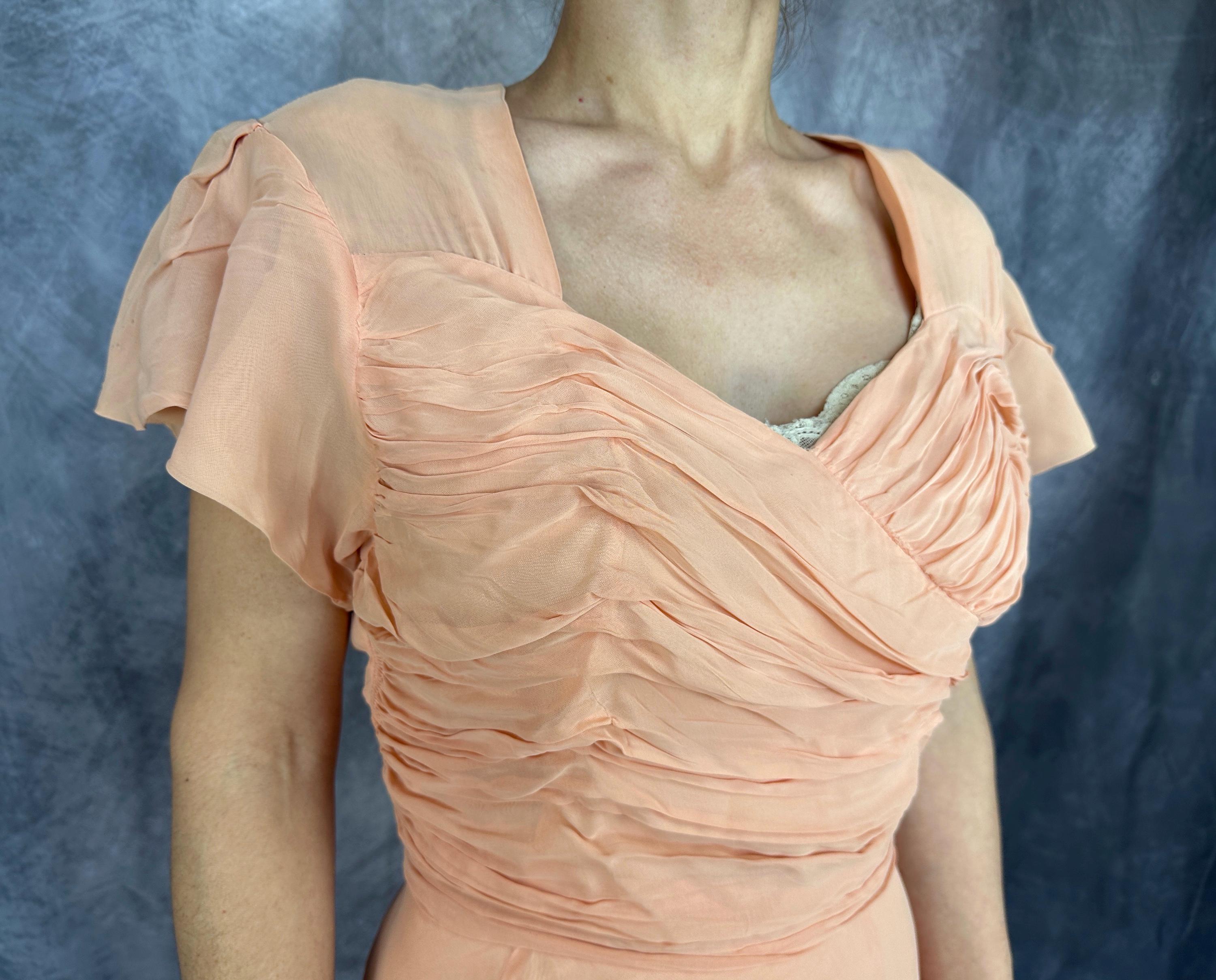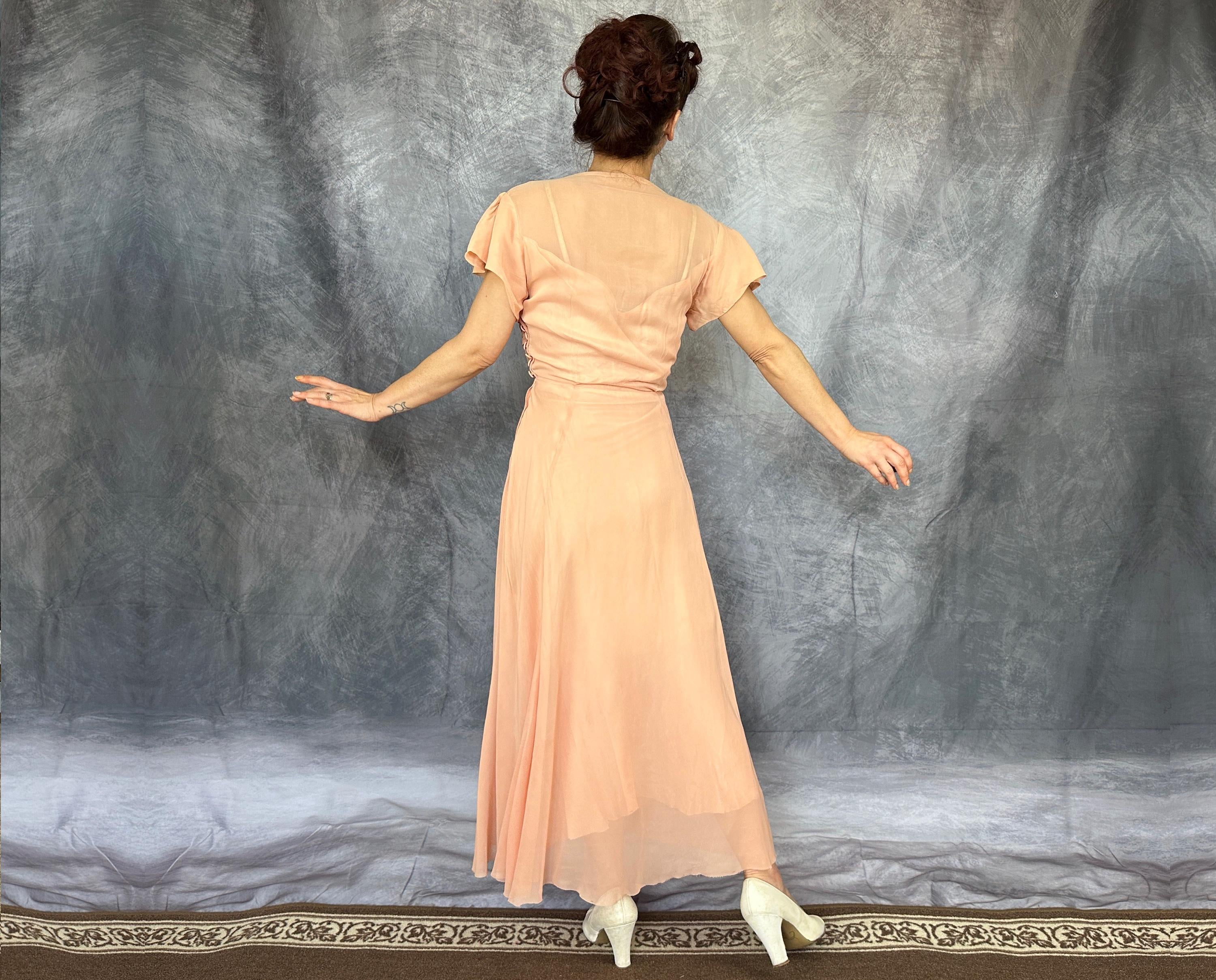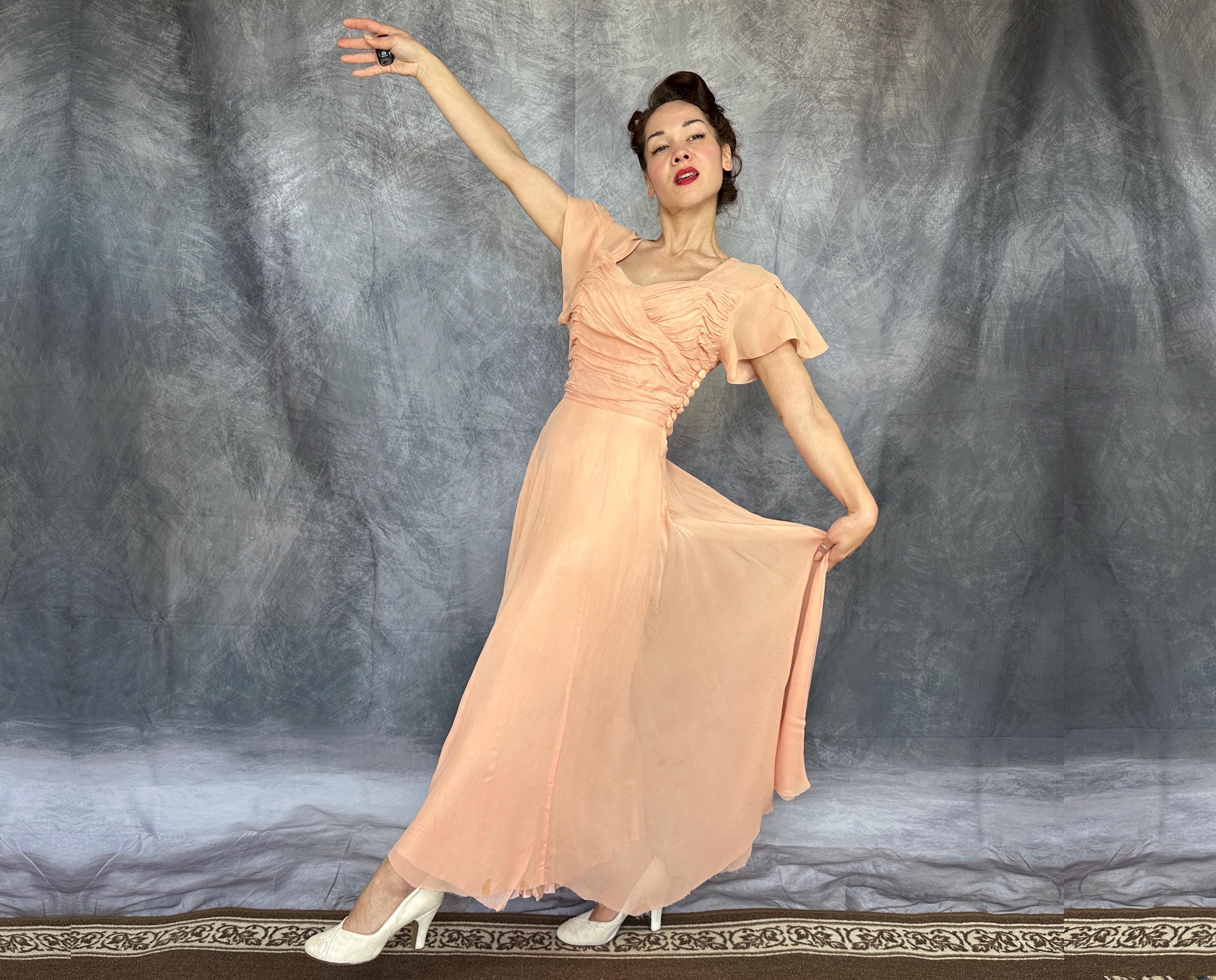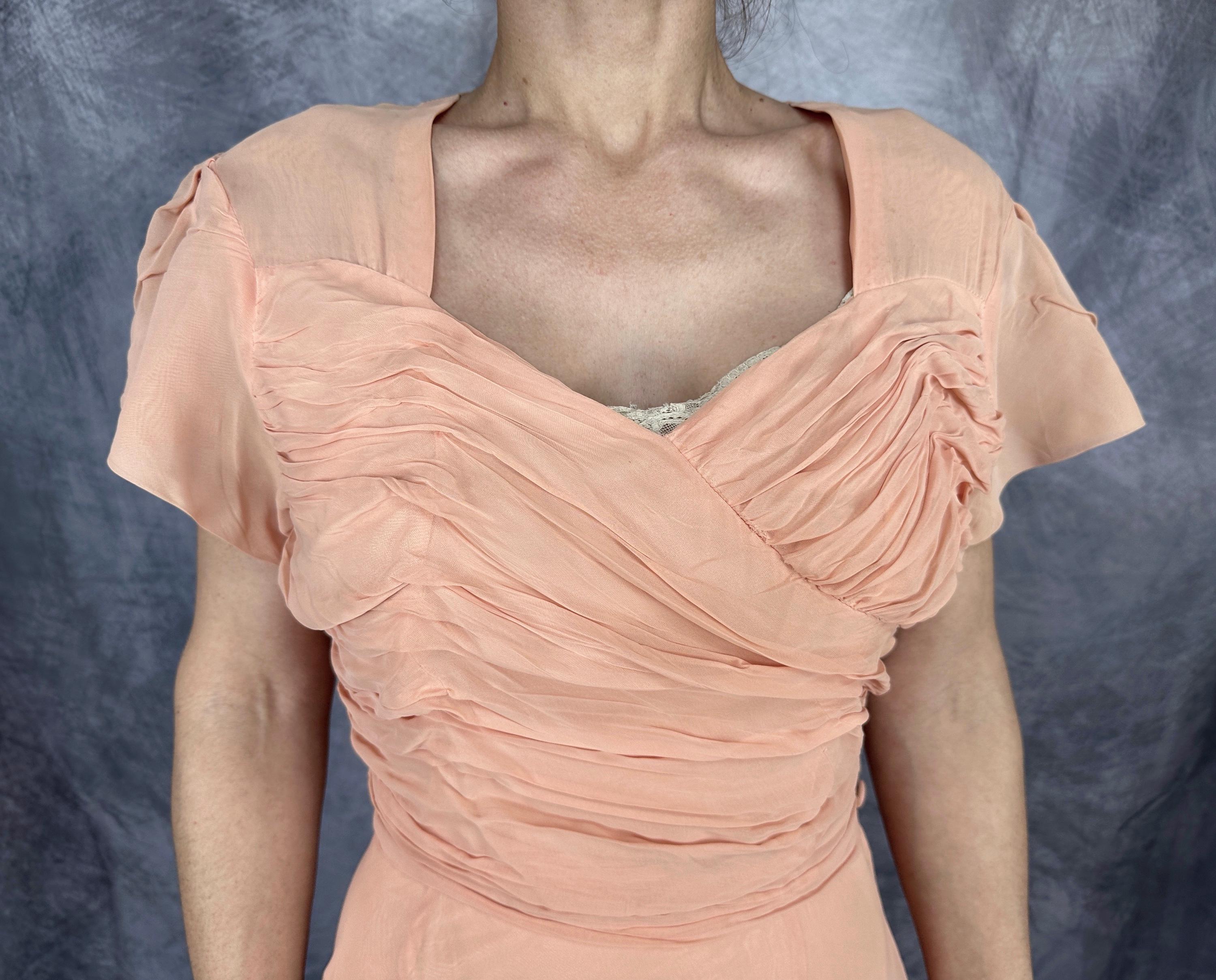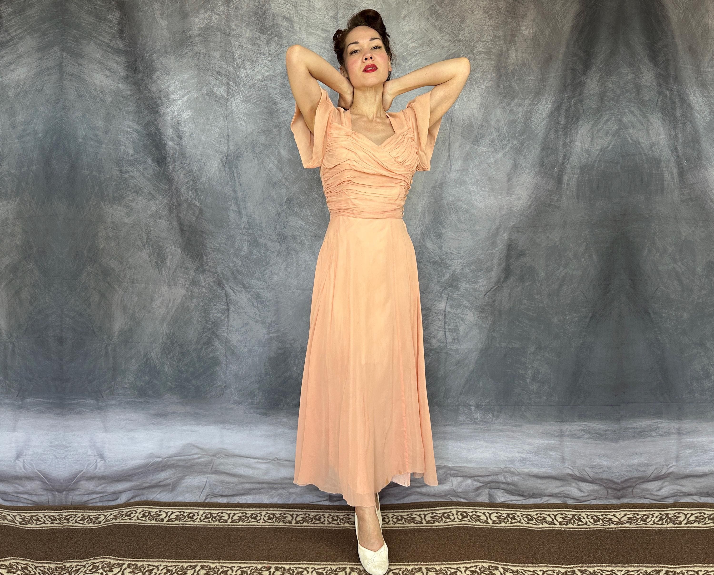 What a peach you'll be at a spring formal in this 1940s dress! This darling dress is peach pink rayon chiffon with a built-in slip. It's delightfully girlish with fluttery cap sleeves, sweetheart neckline, and full fluttery skirt hem. The front bodice is heavily ruched forming a faux wrap and decorated with seven self fabric buttons concealing the metal zip closure on the side. This dress is in great vintage condition, with no holes, stains, or odors to note.