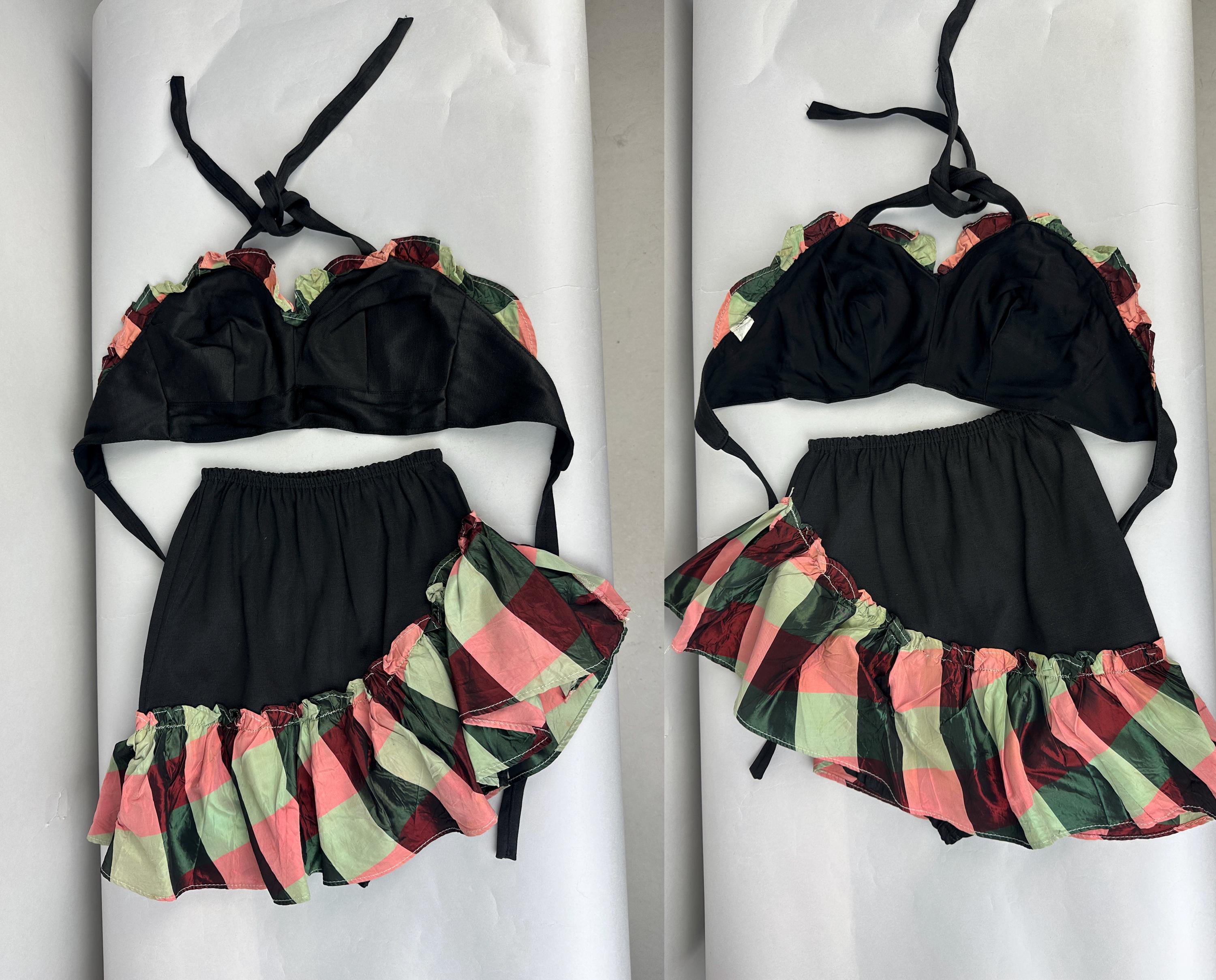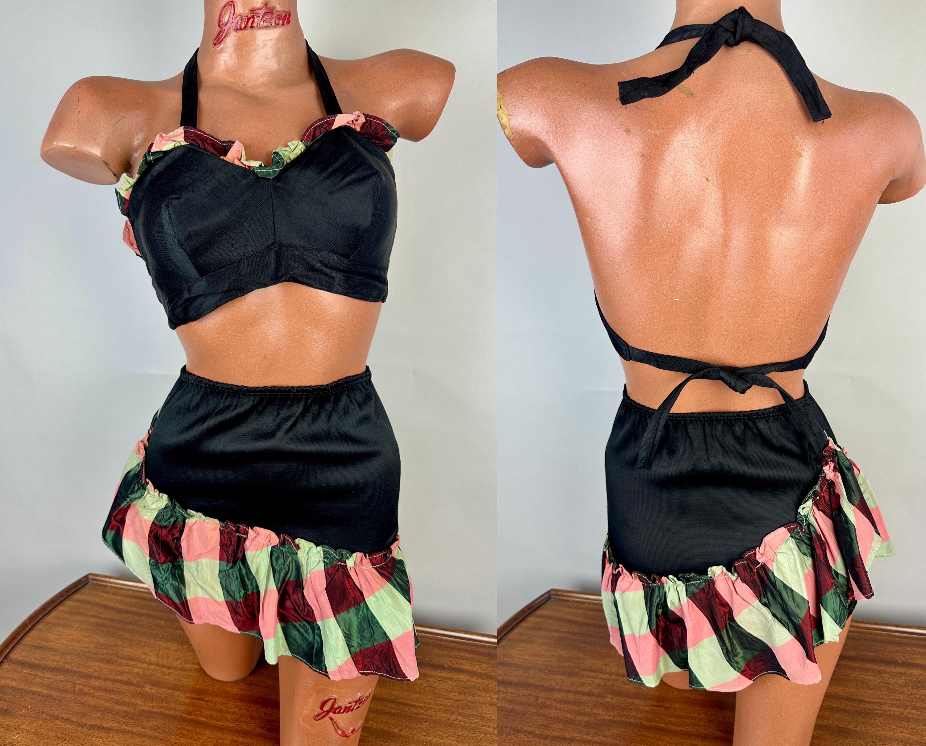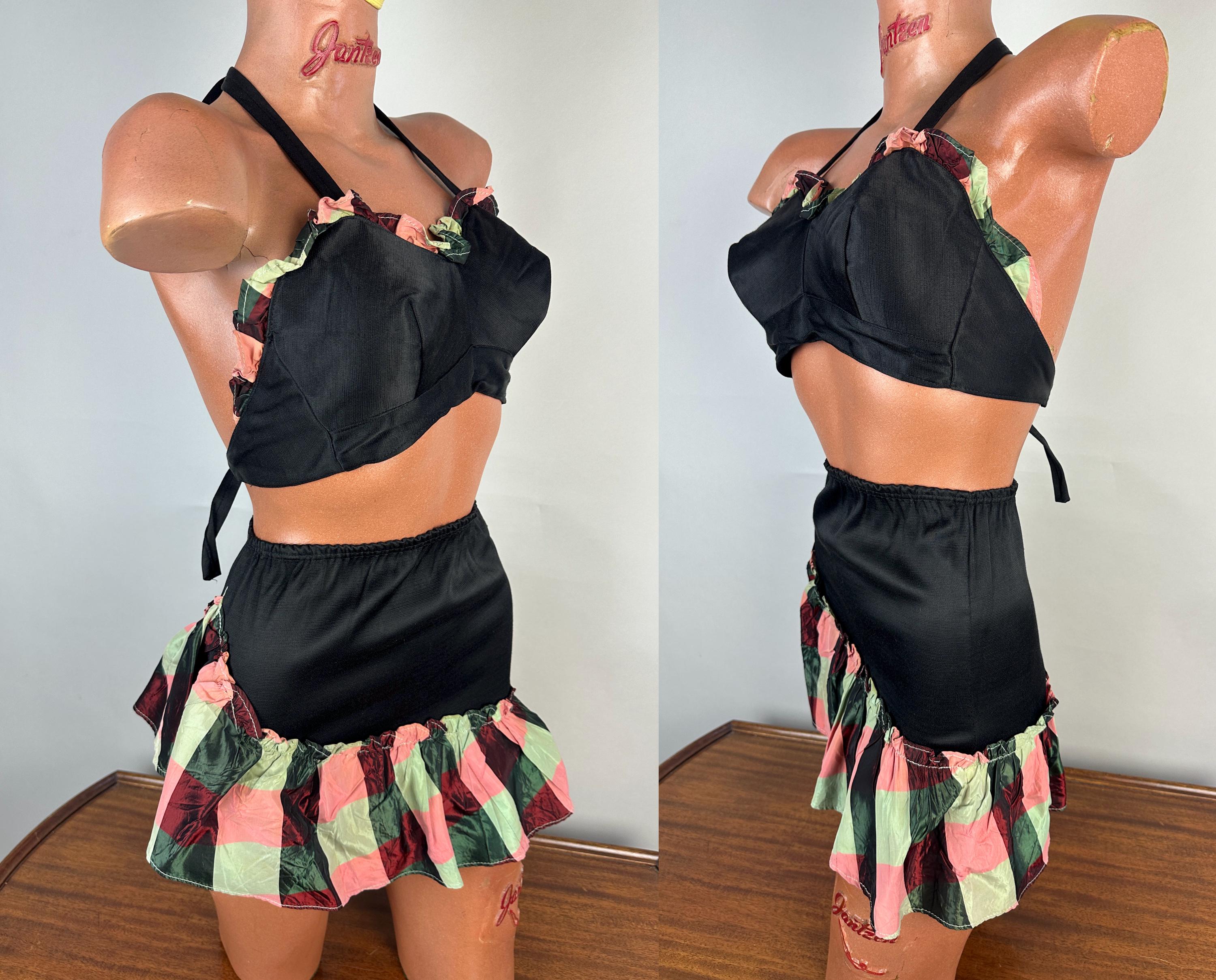 For bonnie babes to lay out on the beach you'll have the perfect ensemble with this 1940s bikini! This fantastic set is mainly black making a perfect backdrop to taffeta accents of plaid in mint green and forest greens, brick red, and salmon pink, all with iridescent flash. The top has a sweetheart bust with seamed cup shaping and the plaid ruffling along the top edge and tie straps wrap around the back and neck. The high waist bottoms have full elastic in the waist and leg holes and a ruffle of the plaid drapes high on the left hip and low on the right. Labeled "Brilliant Fashions". This swimsuit is in great vintage condition, with a couple very faint freckles and no holes or odors to note.