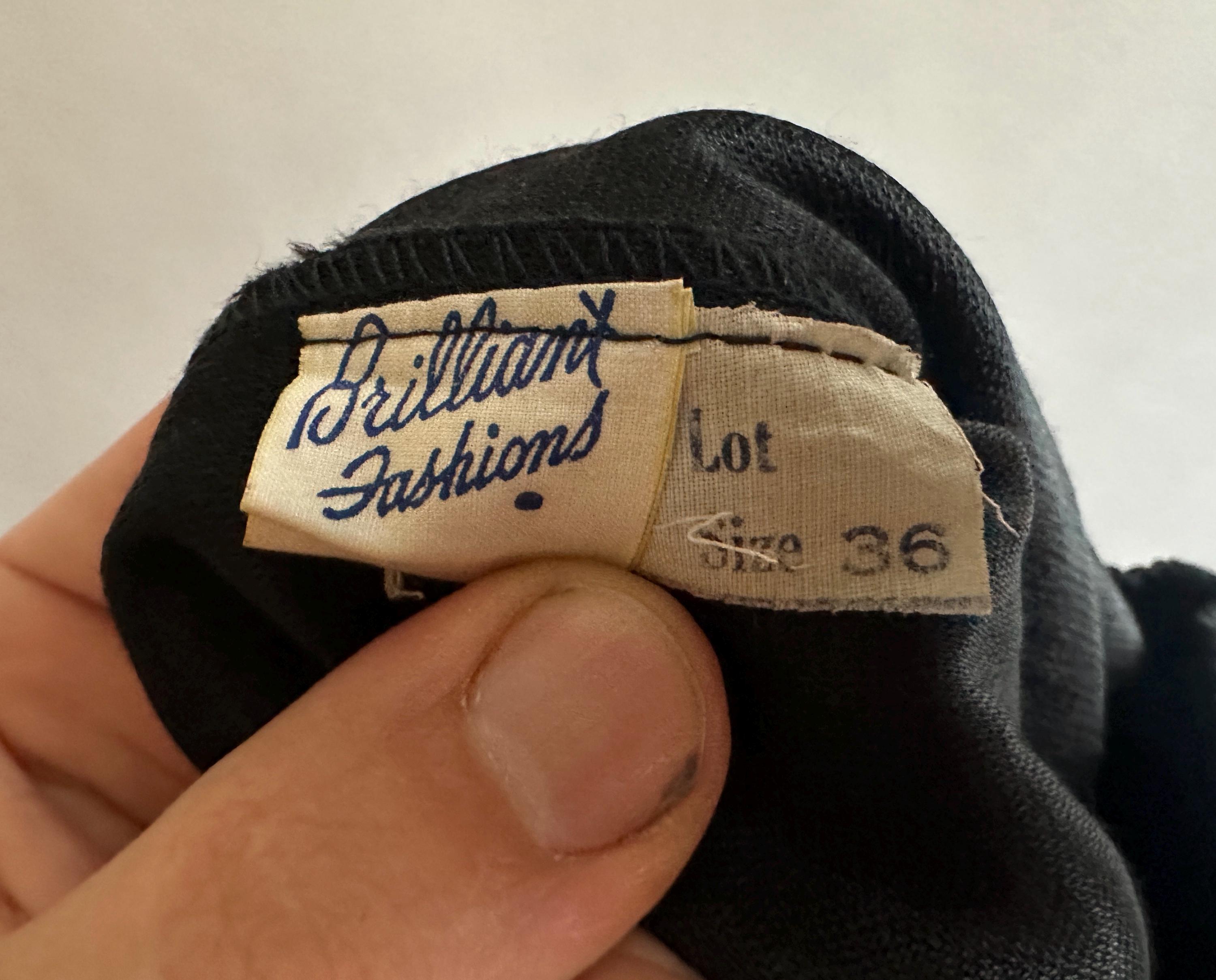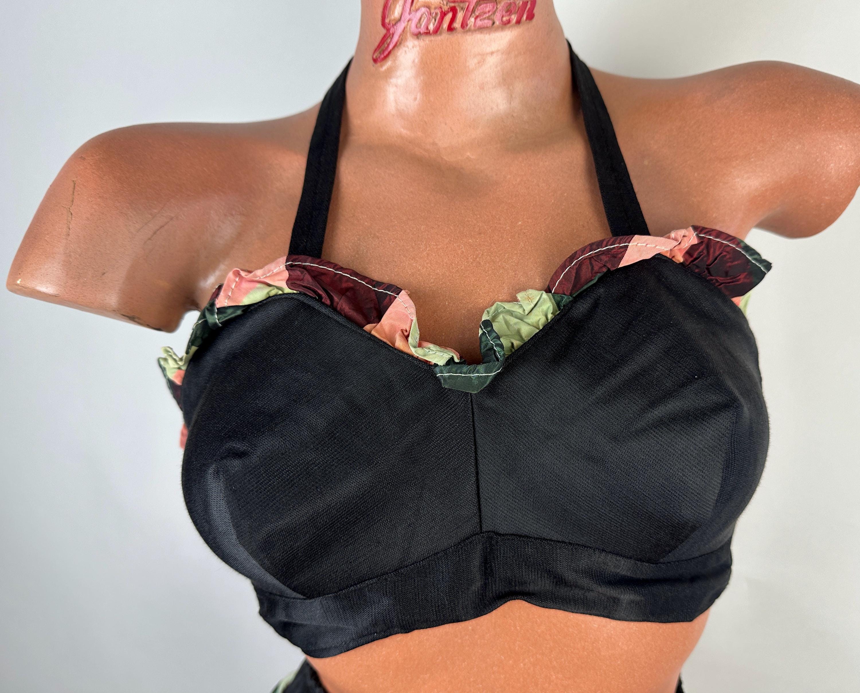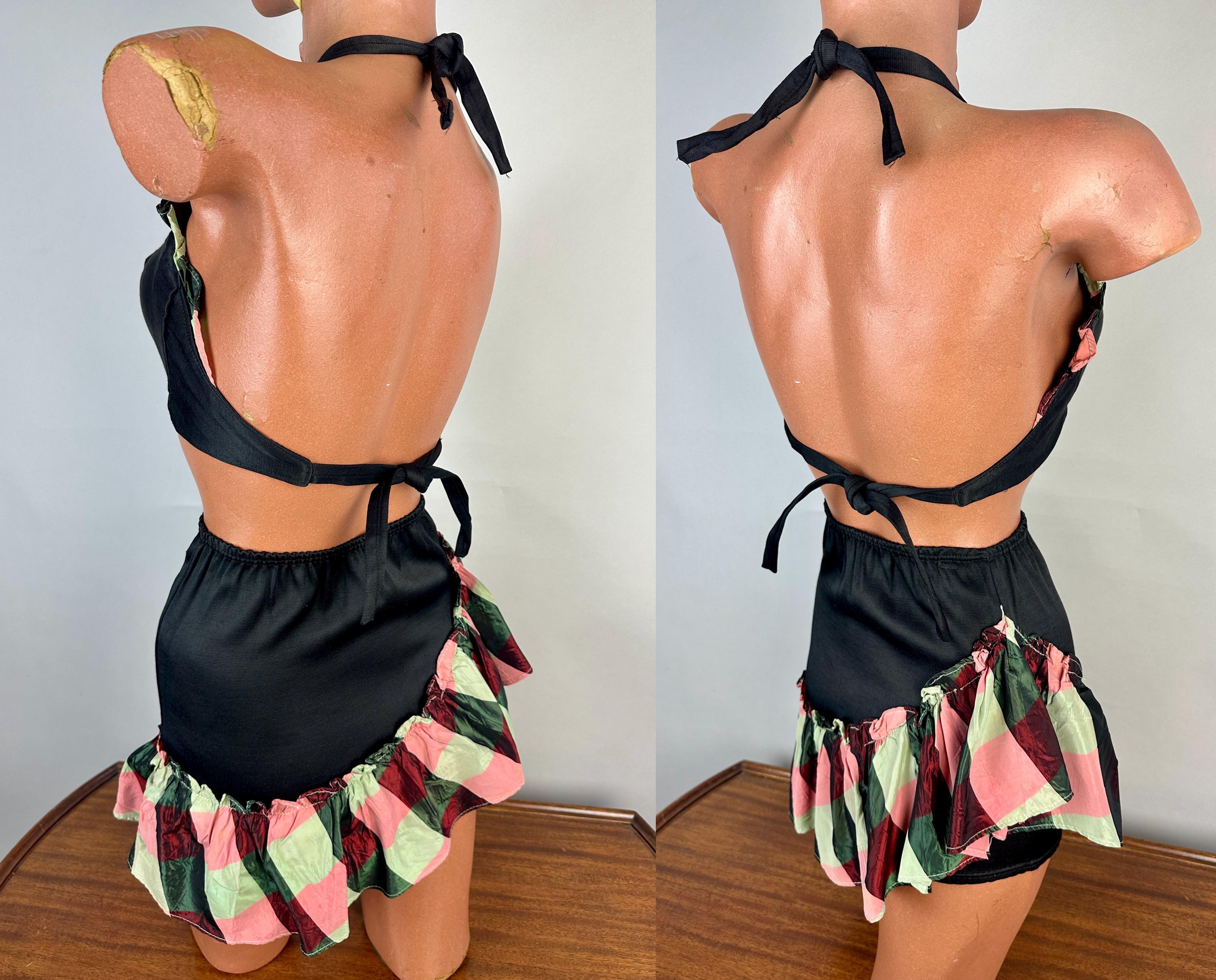 For bonnie babes to lay out on the beach you'll have the perfect ensemble with this 1940s bikini! This fantastic set is mainly black making a perfect backdrop to taffeta accents of plaid in mint green and forest greens, brick red, and salmon pink, all with iridescent flash. The top has a sweetheart bust with seamed cup shaping and the plaid ruffling along the top edge and tie straps wrap around the back and neck. The high waist bottoms have full elastic in the waist and leg holes and a ruffle of the plaid drapes high on the left hip and low on the right. Labeled "Brilliant Fashions". This swimsuit is in great vintage condition, with a couple very faint freckles and no holes or odors to note.
