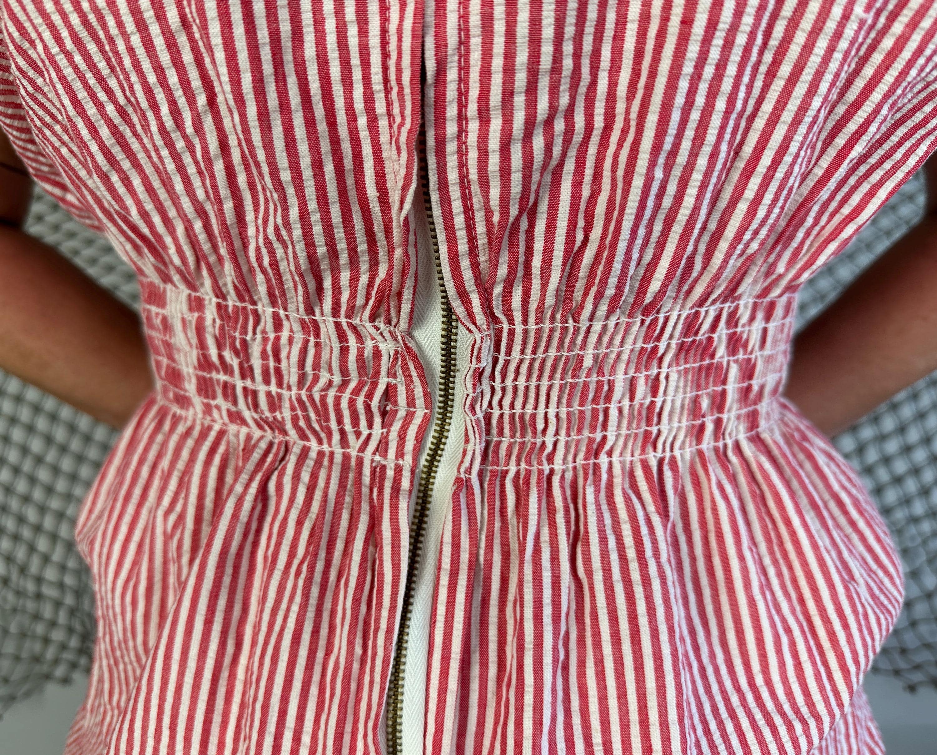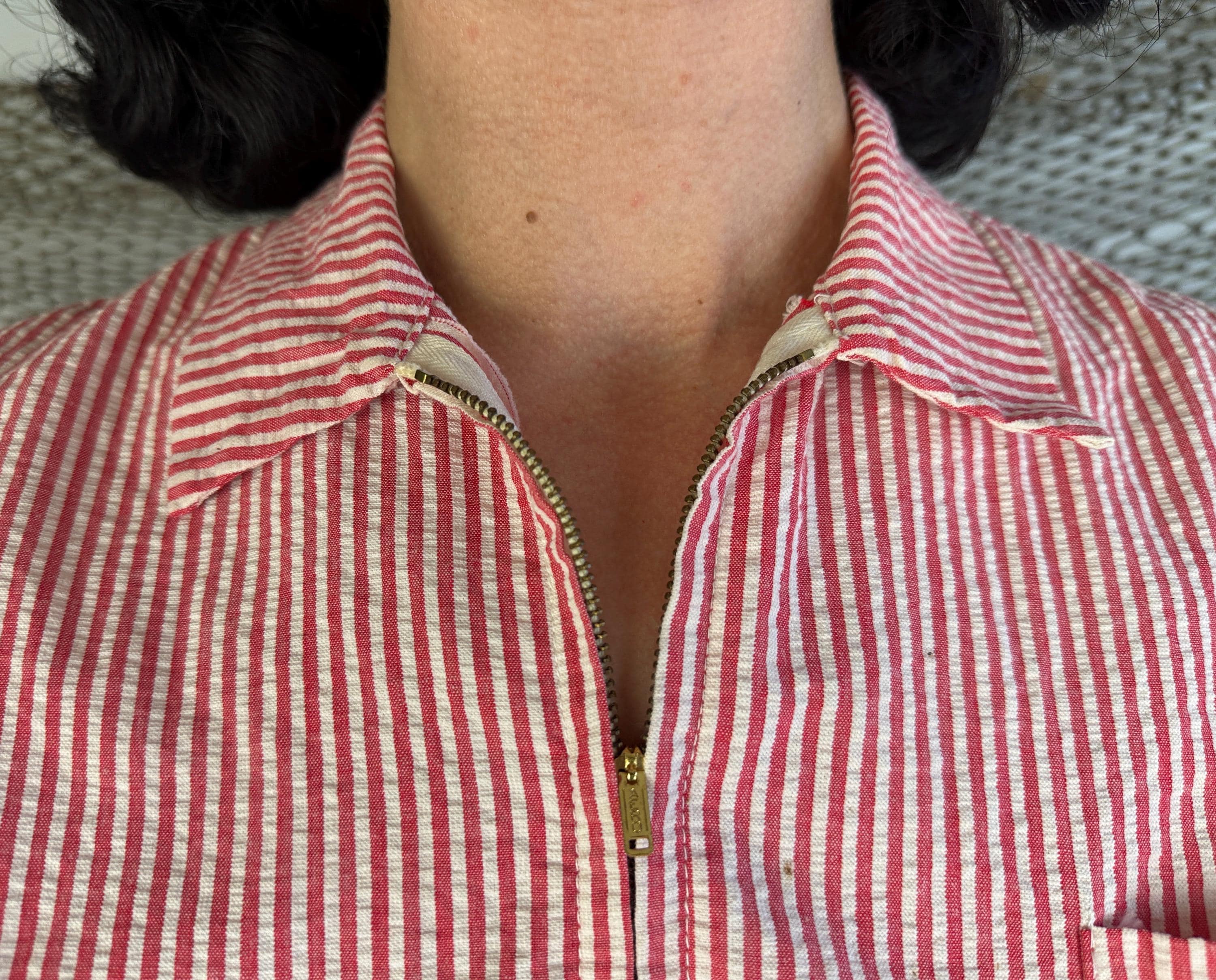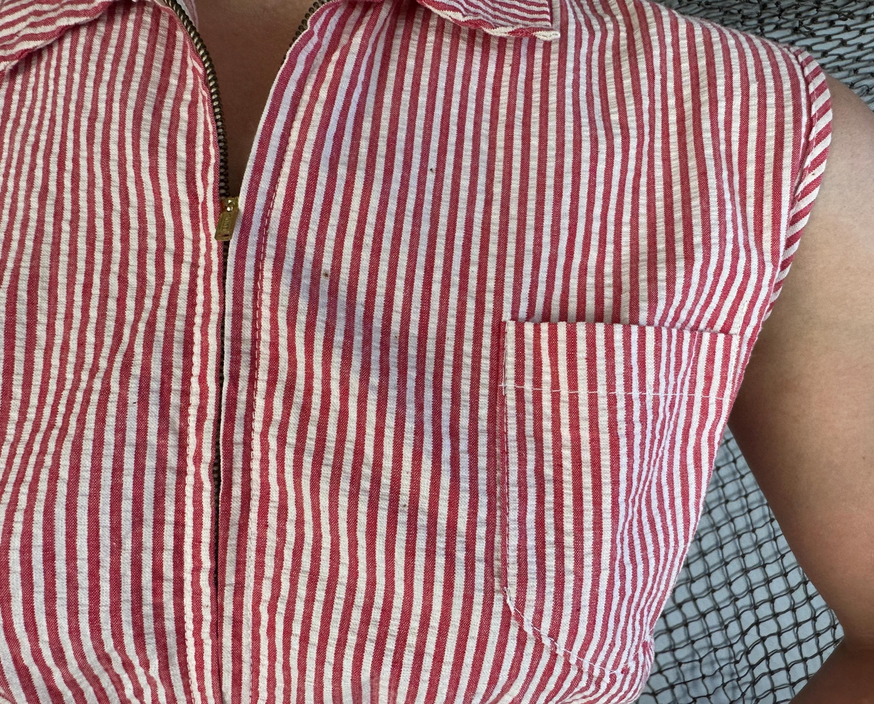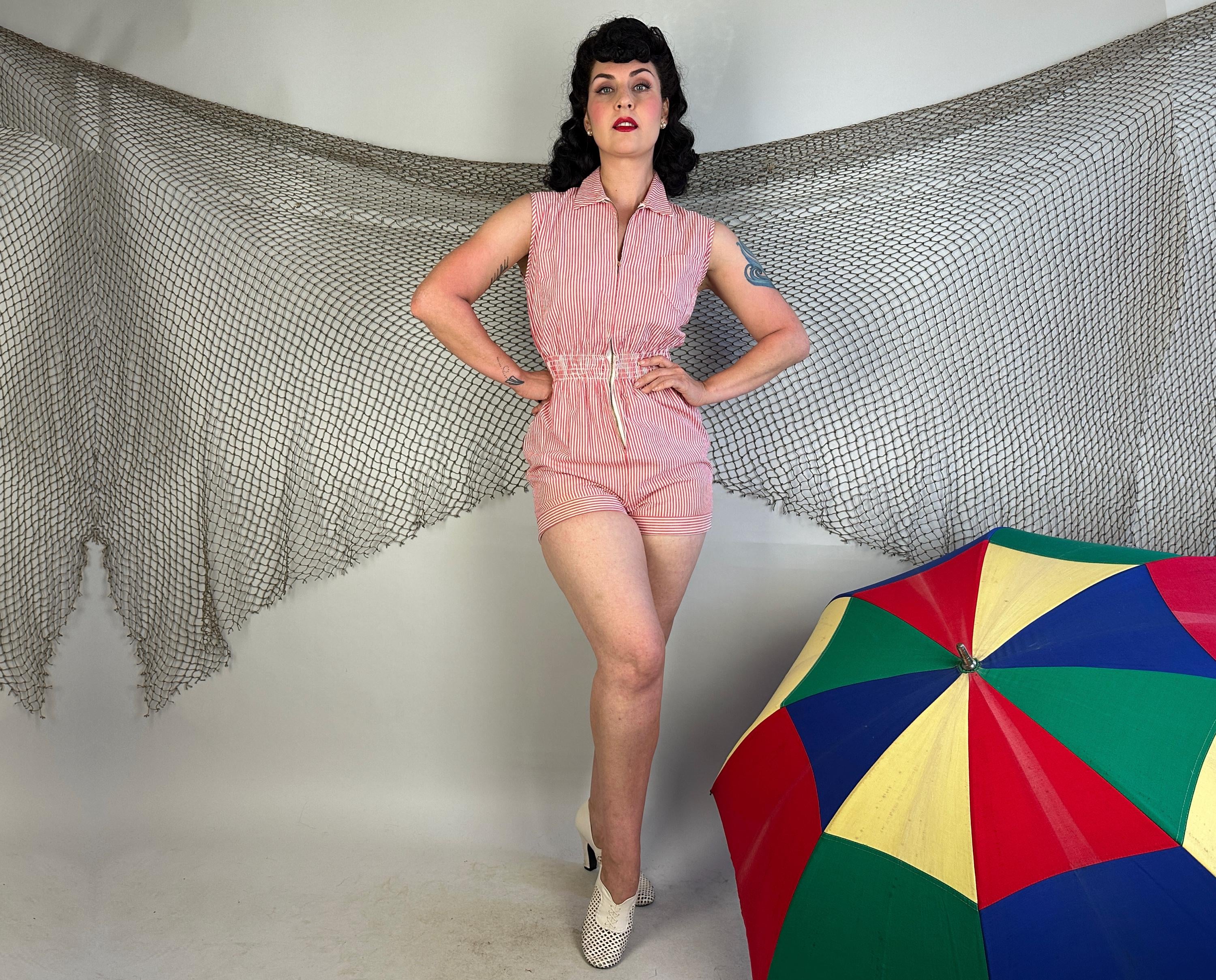 Summer fun is the name of the game in this 1950s romper! You'll be ready to romp in cotton seersucker of bubblegum pink and white in a one piece cut featuring a full length metal zip up front. The waistband is wide with six rows of stretchy shirring and the short shorts are cuffed and have a wide comfy cut. Patch pocket on the chest. This romper is in great vintage condition with no stains, holes, nor odors to note.