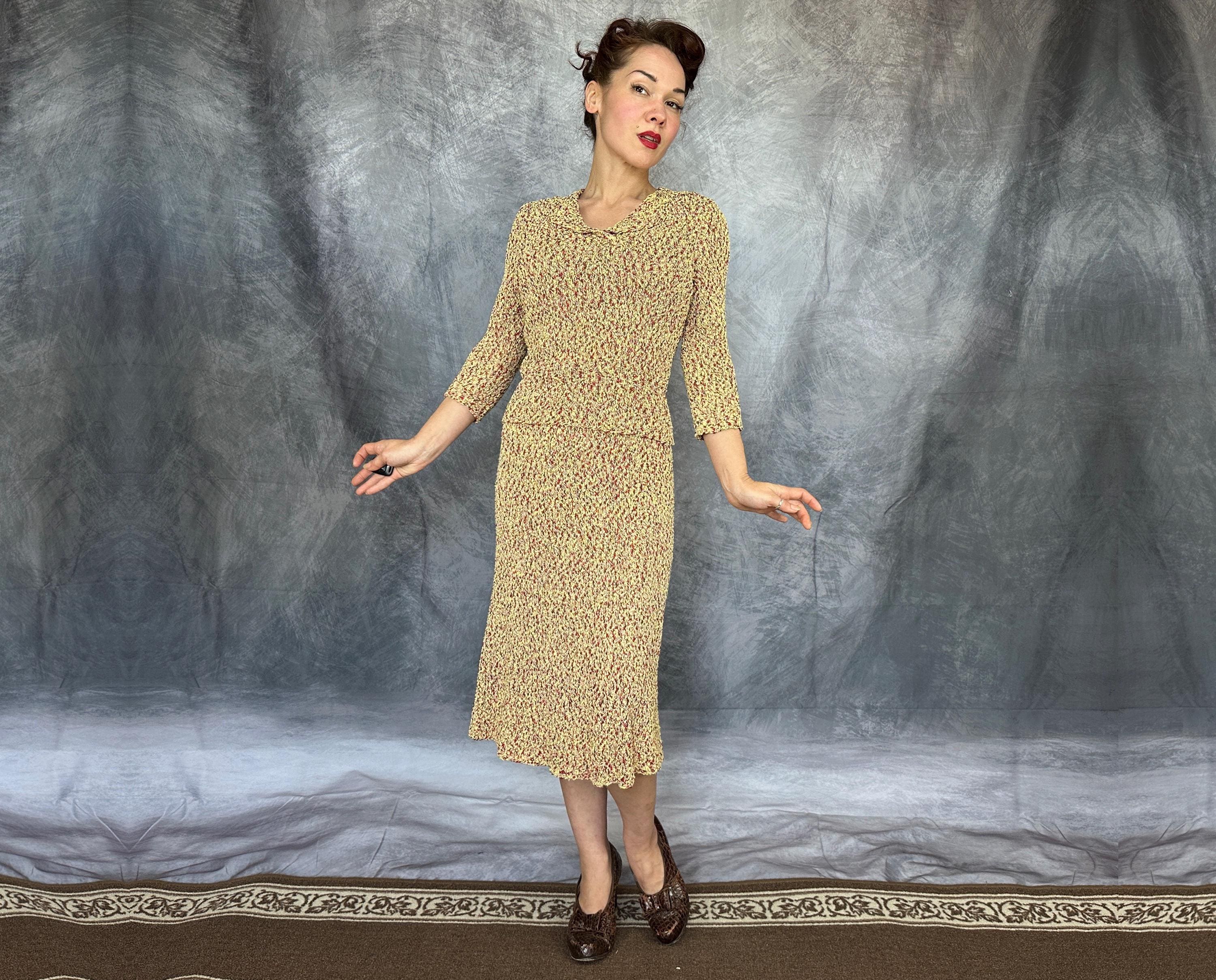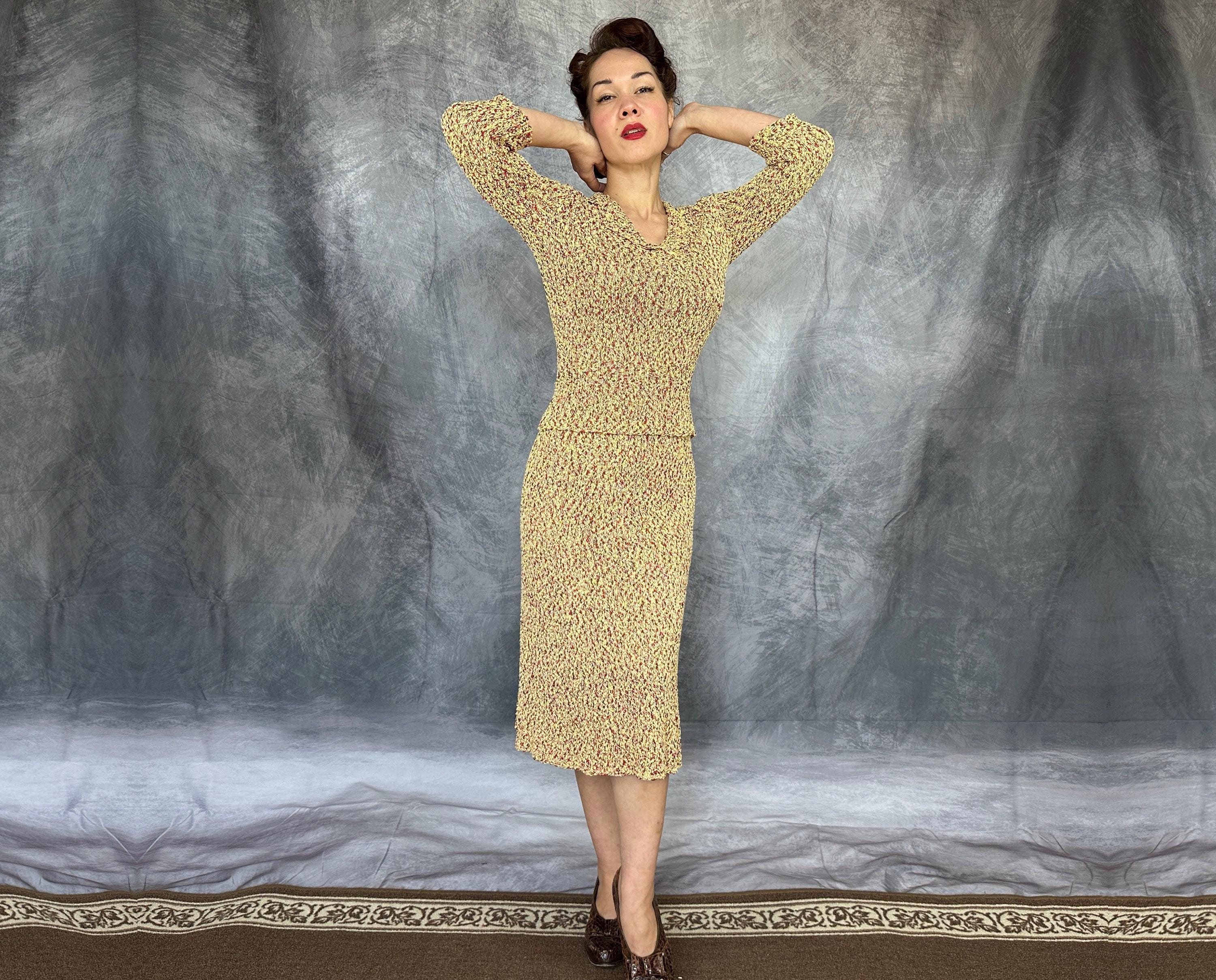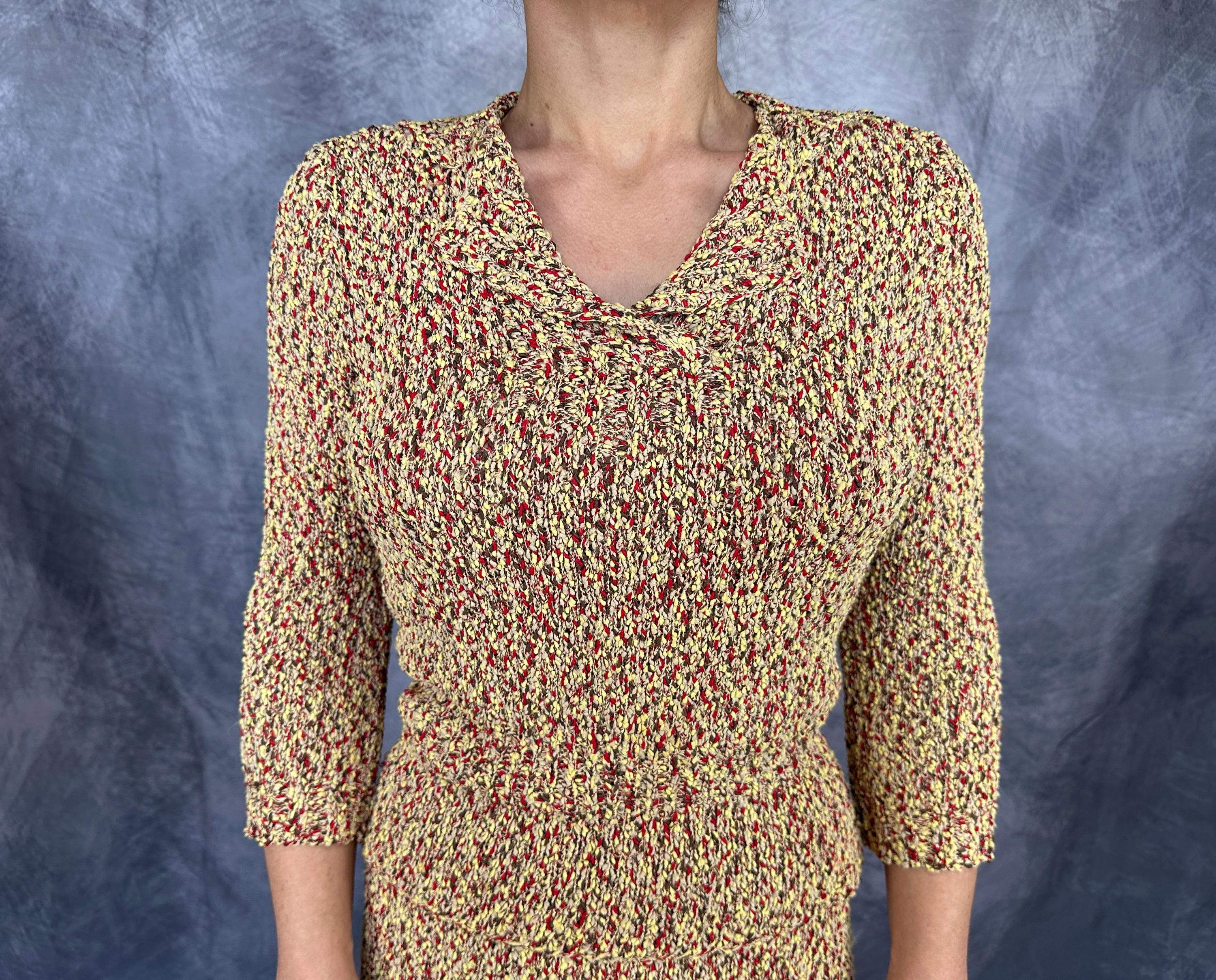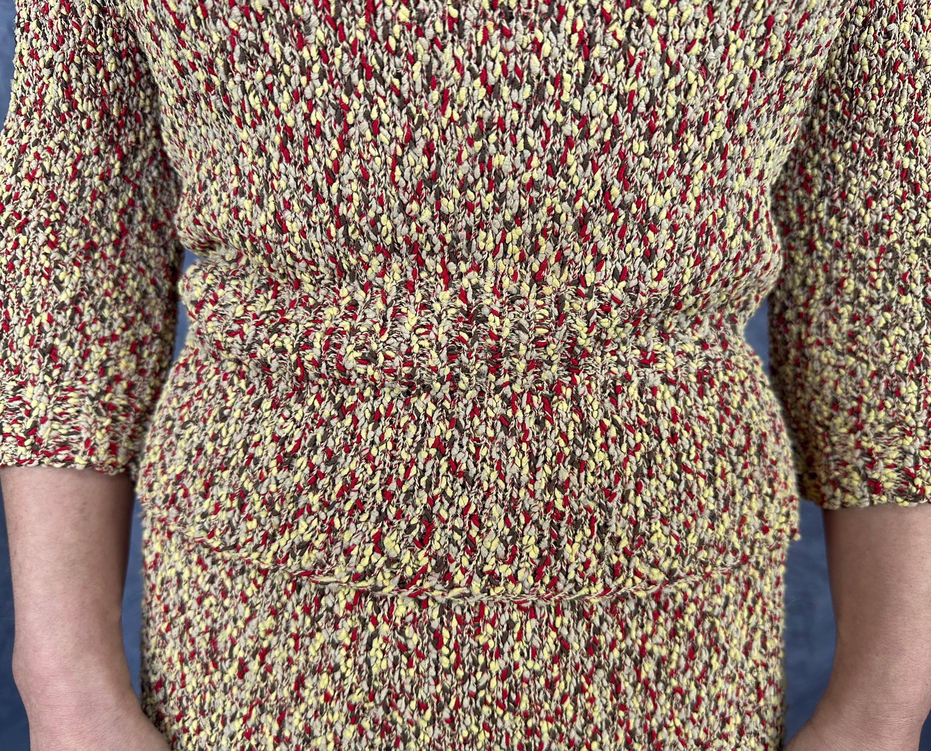 You'll feel fantastic adorned in the textured flecks of this 1930’s knit set! Knit in rayon yarn heavily flecked and slubbed in lipstick red, chocolate brown, and blush beige, an overall Neapolitan ice cream kind of vibe. The weightiness of the rayon makes a great drape giving a different feel to the curve hugging elements of knits. The top is a pullover style with double peaked collar, three quarter length sleeves, and subtle waist definition that gives the hem a slight peplum. The skirt is pencil cut and has a full elastic waist. This set is in great vintage condition, with no holes, stains, or odors to note.