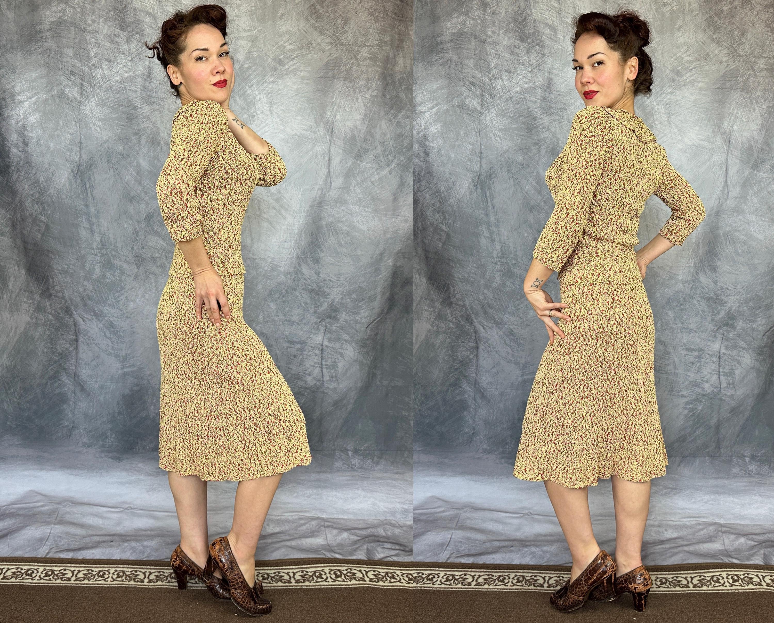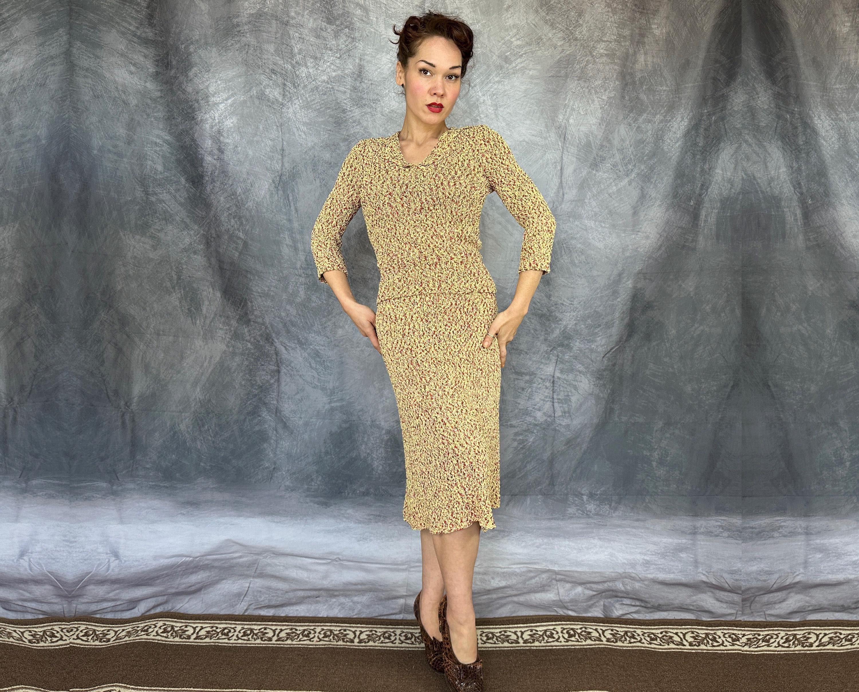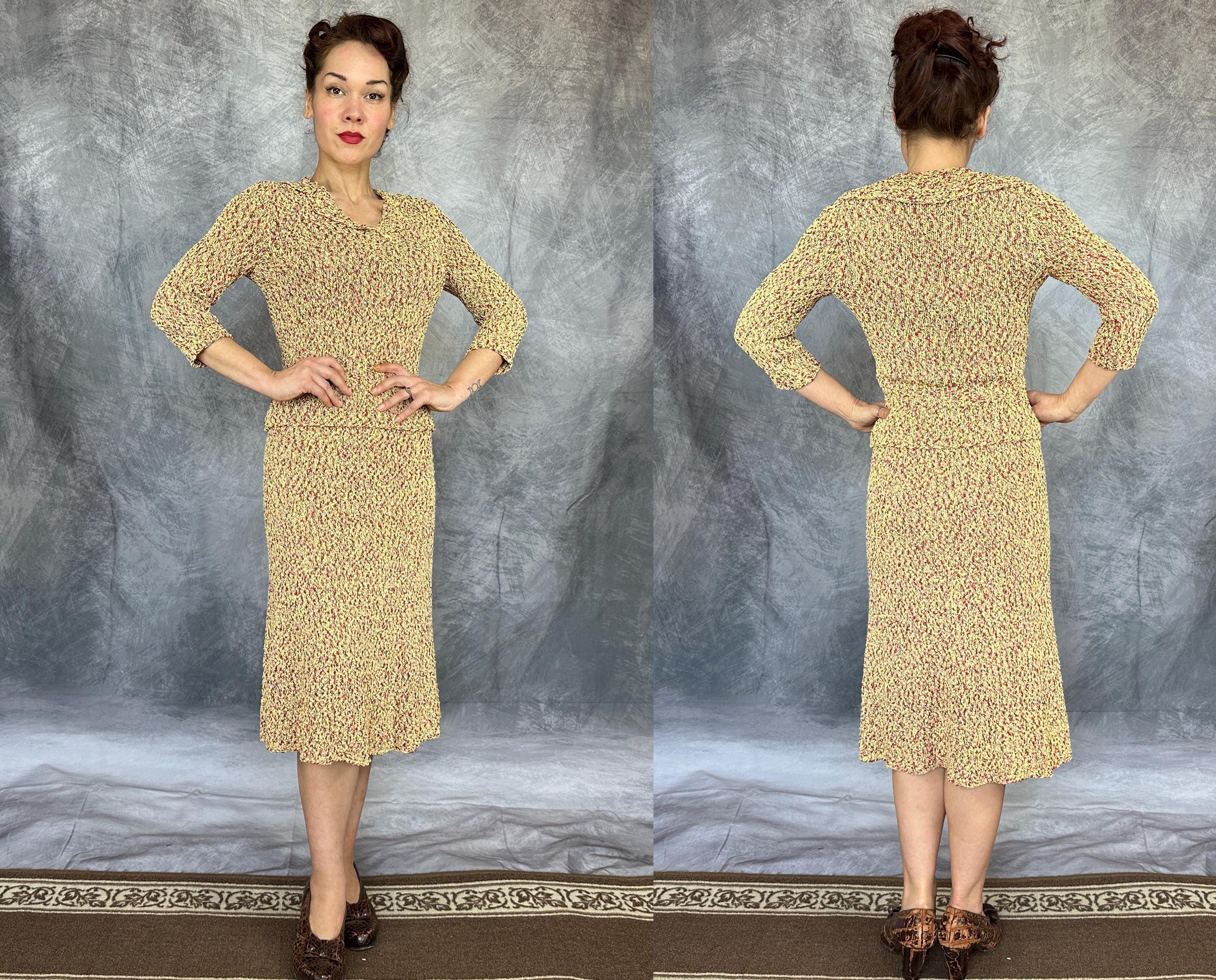 You'll feel fantastic adorned in the textured flecks of this 1930’s knit set! Knit in rayon yarn heavily flecked and slubbed in lipstick red, chocolate brown, and blush beige, an overall Neapolitan ice cream kind of vibe. The weightiness of the rayon makes a great drape giving a different feel to the curve hugging elements of knits. The top is a pullover style with double peaked collar, three quarter length sleeves, and subtle waist definition that gives the hem a slight peplum. The skirt is pencil cut and has a full elastic waist. This set is in great vintage condition, with no holes, stains, or odors to note.