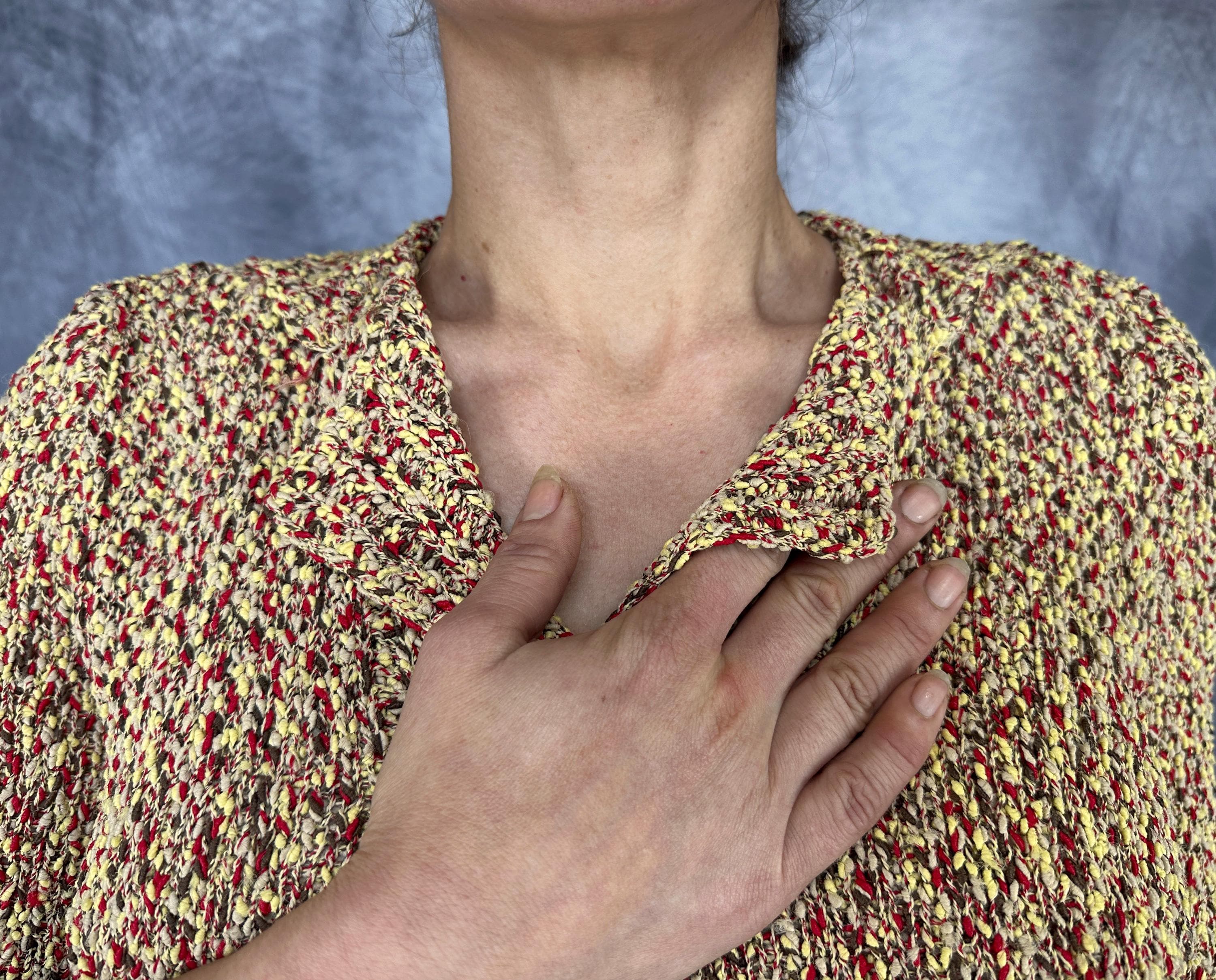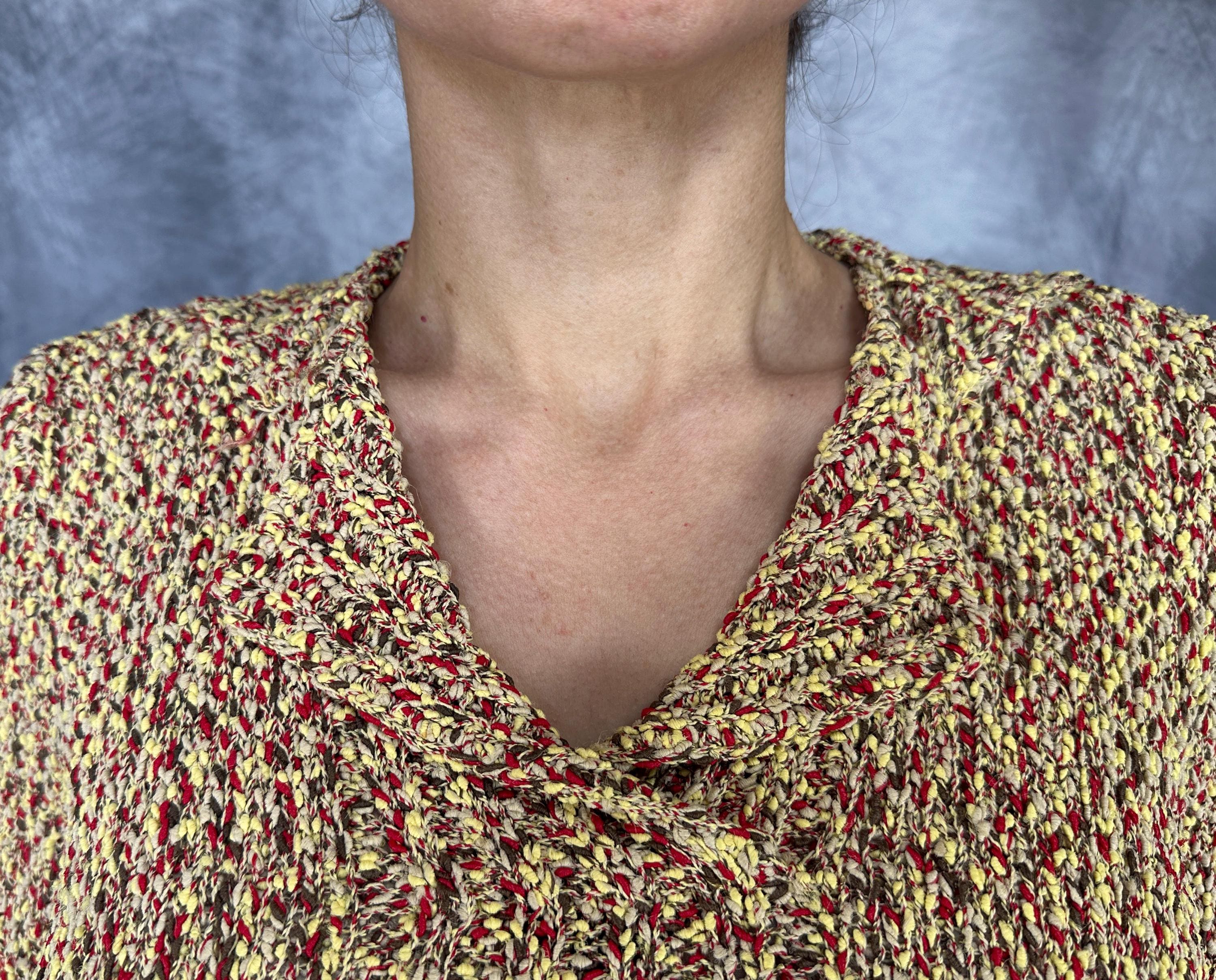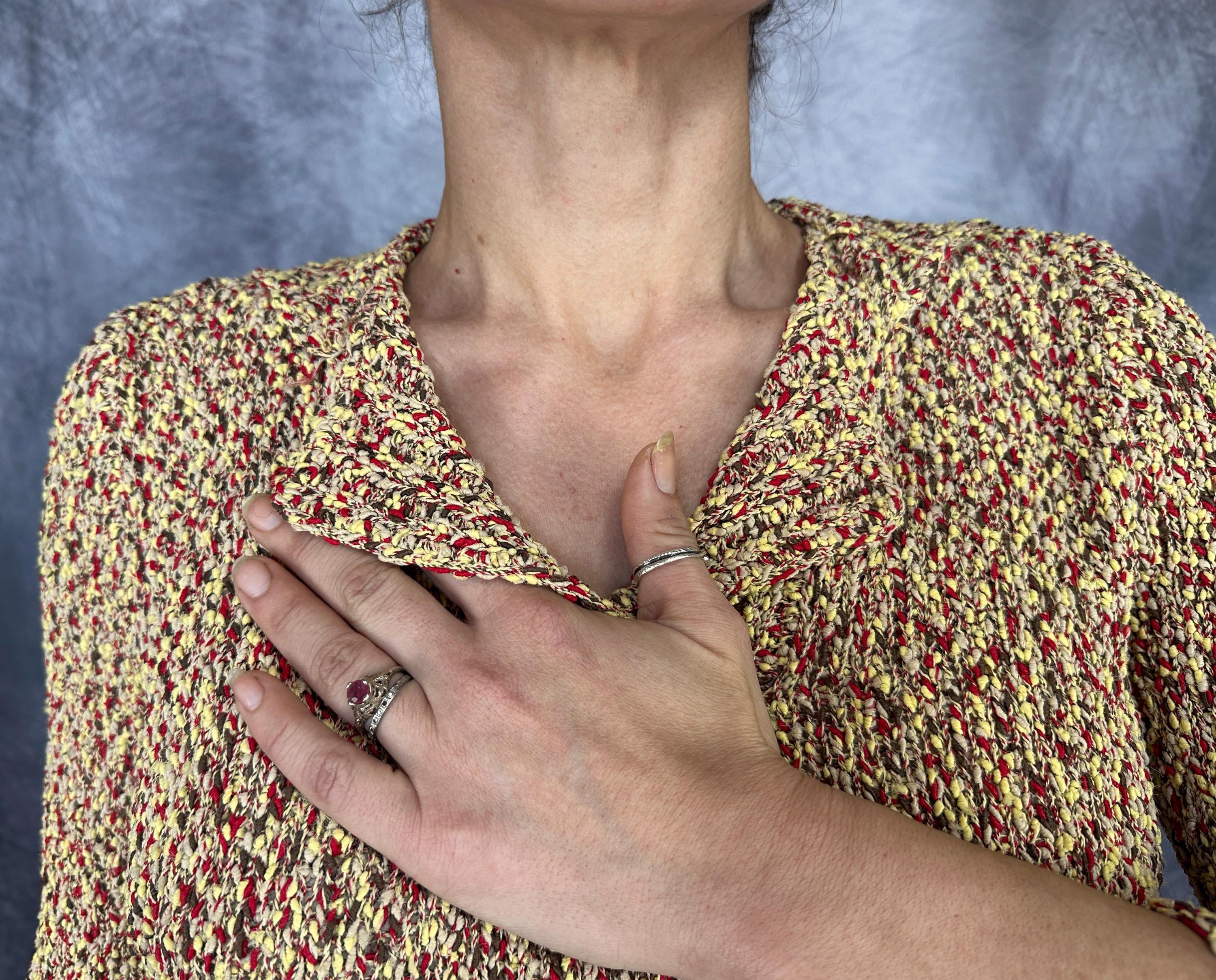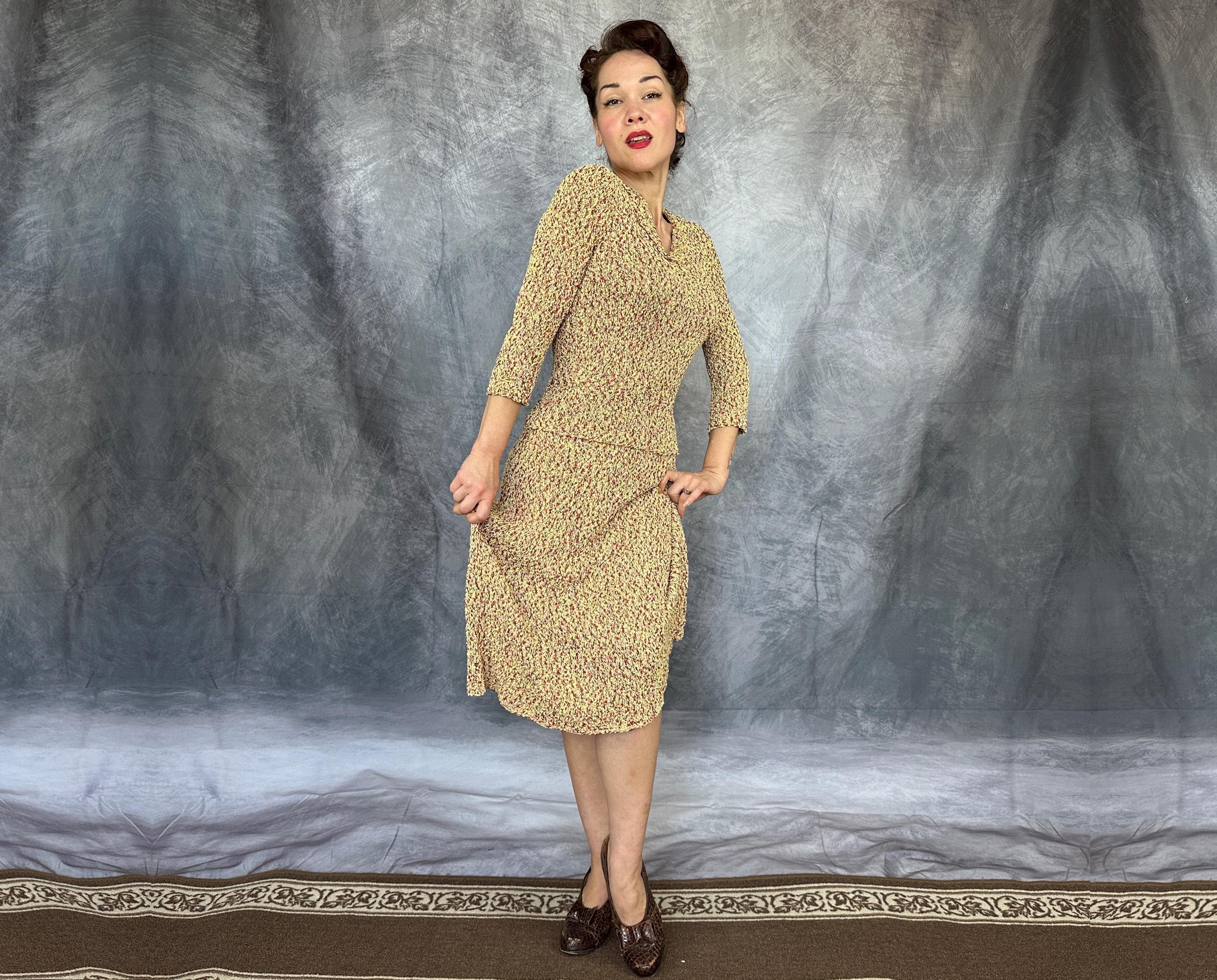 You'll feel fantastic adorned in the textured flecks of this 1930’s knit set! Knit in rayon yarn heavily flecked and slubbed in lipstick red, chocolate brown, and blush beige, an overall Neapolitan ice cream kind of vibe. The weightiness of the rayon makes a great drape giving a different feel to the curve hugging elements of knits. The top is a pullover style with double peaked collar, three quarter length sleeves, and subtle waist definition that gives the hem a slight peplum. The skirt is pencil cut and has a full elastic waist. This set is in great vintage condition, with no holes, stains, or odors to note.