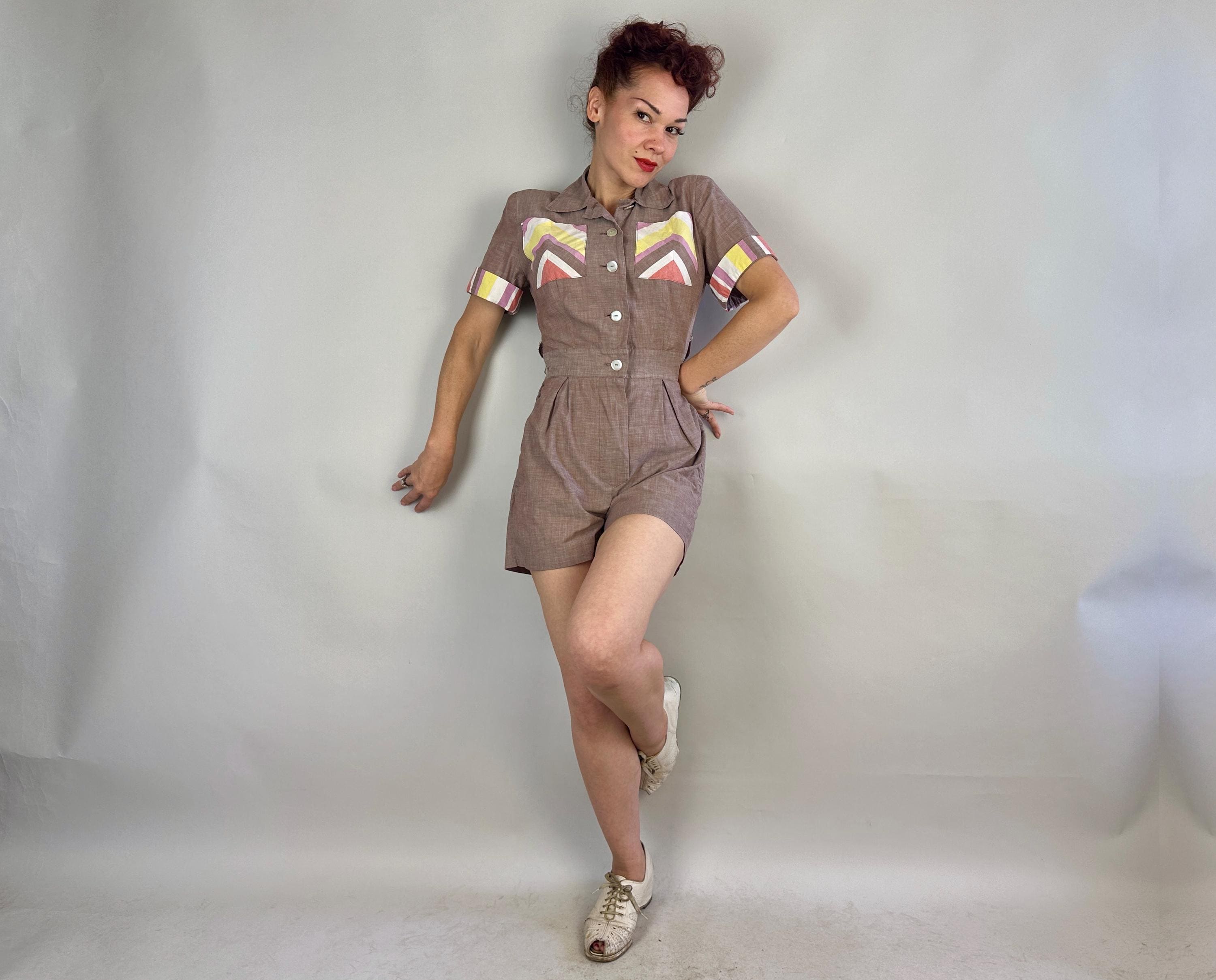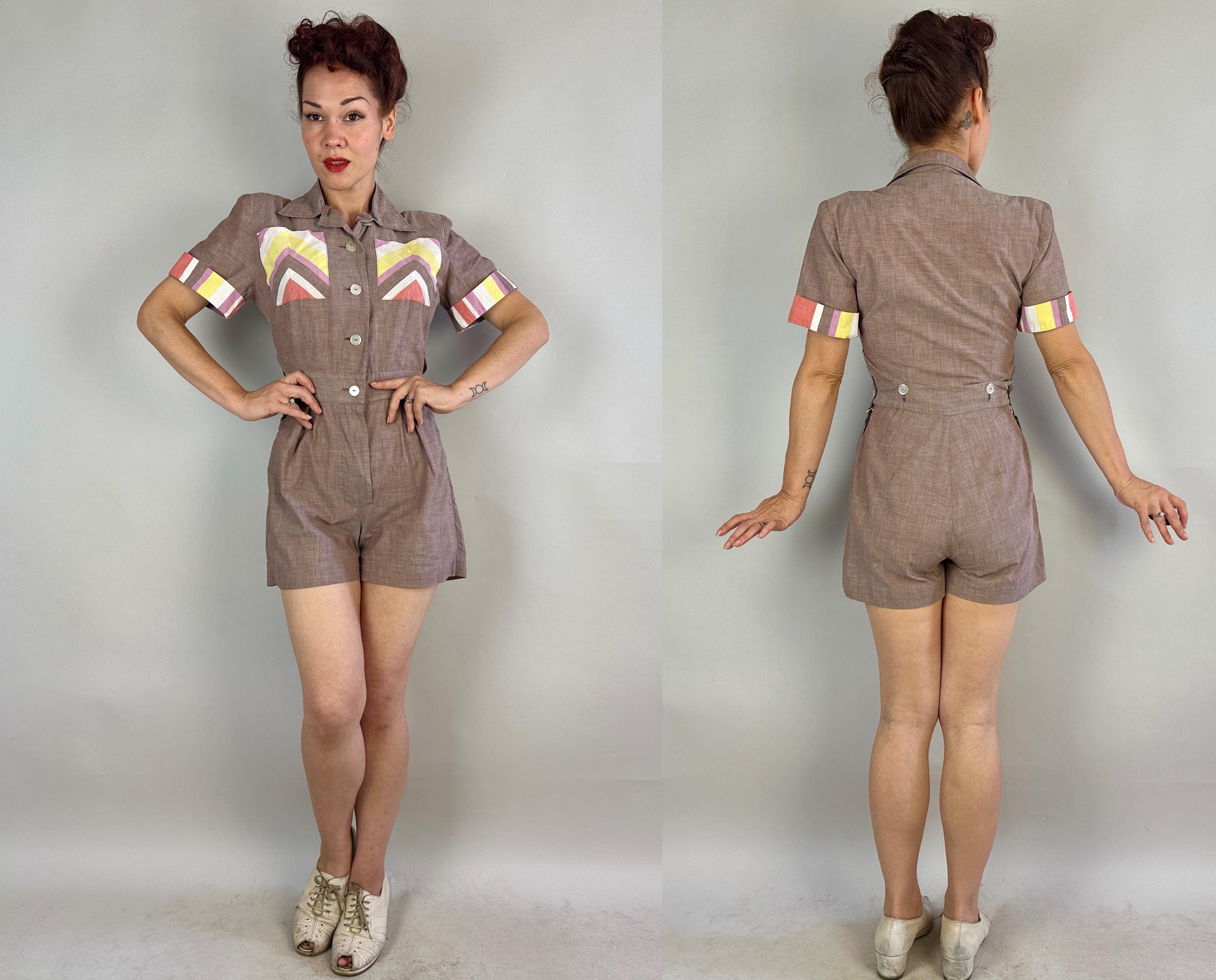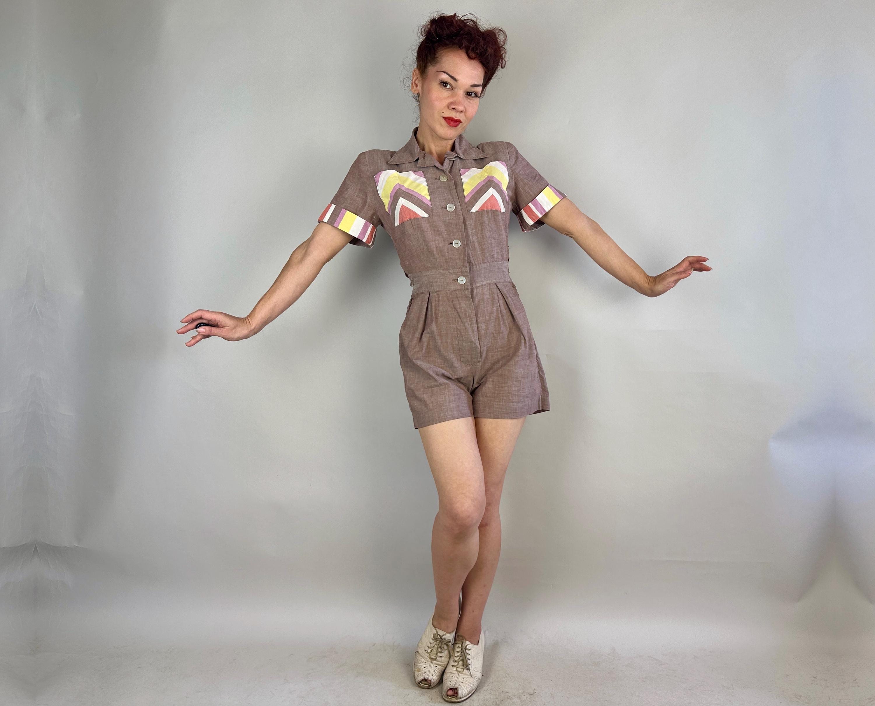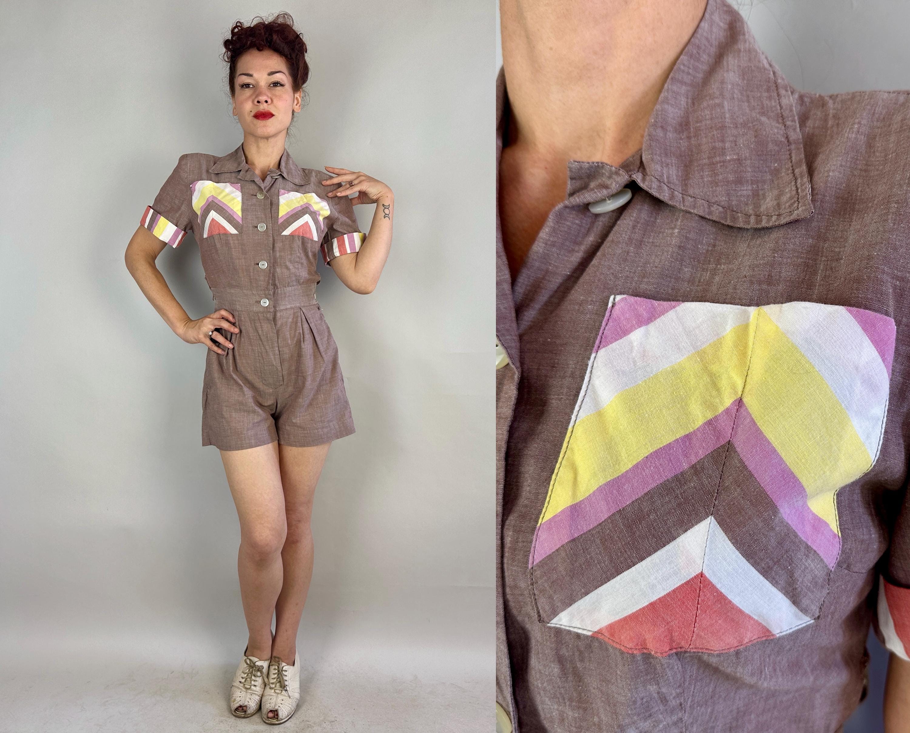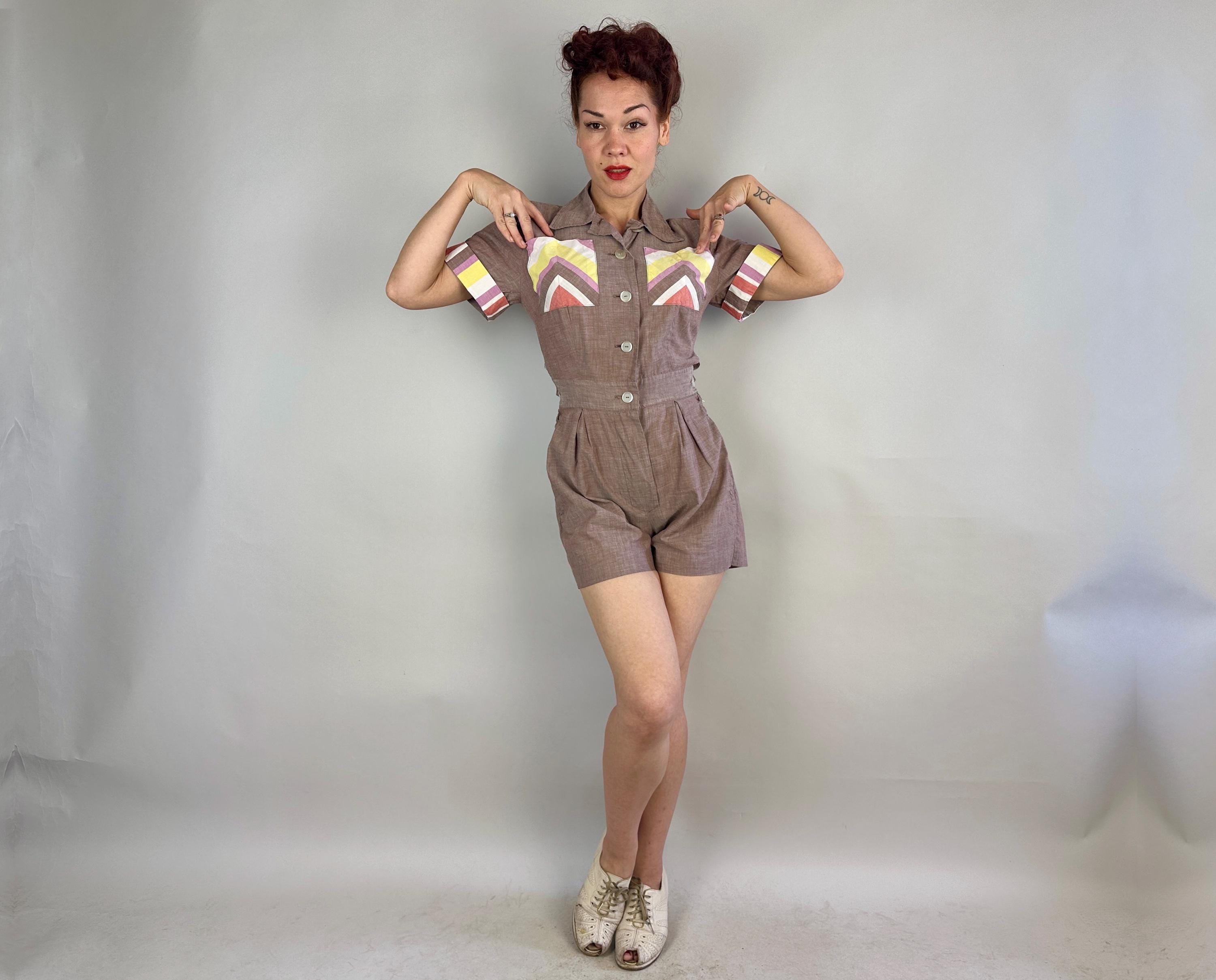 Make a playdate and send hearts a flutter when you're basking in this 1940s playsuit! Made of cotton chambray in puce (brown-purple taupe) with stripe accents in watermelon red, butter yellow, white, and orchid purple. Two patch pockets on the chest utilize the stripes in a chevron formation for extra fun detail. The shirtwaist style romper fastens with white buttons up the front but then also on each side of the waist along with each hip getting a metal zipper, all of which leads to something that is seriously lacking in a lot of rompers, a trap door! Around the back of the waist are more buttons fastening the shorts to the shirt so you can relieve yourself without time consuming fuss! Also styled with small pads in the shoulders, box pleats below the waist, and wide cut leg openings on the shorts. From 'Barbara Field by Joyce of Chicago". This playsuit is in great vintage condition, with no holes, stains or odors to note.