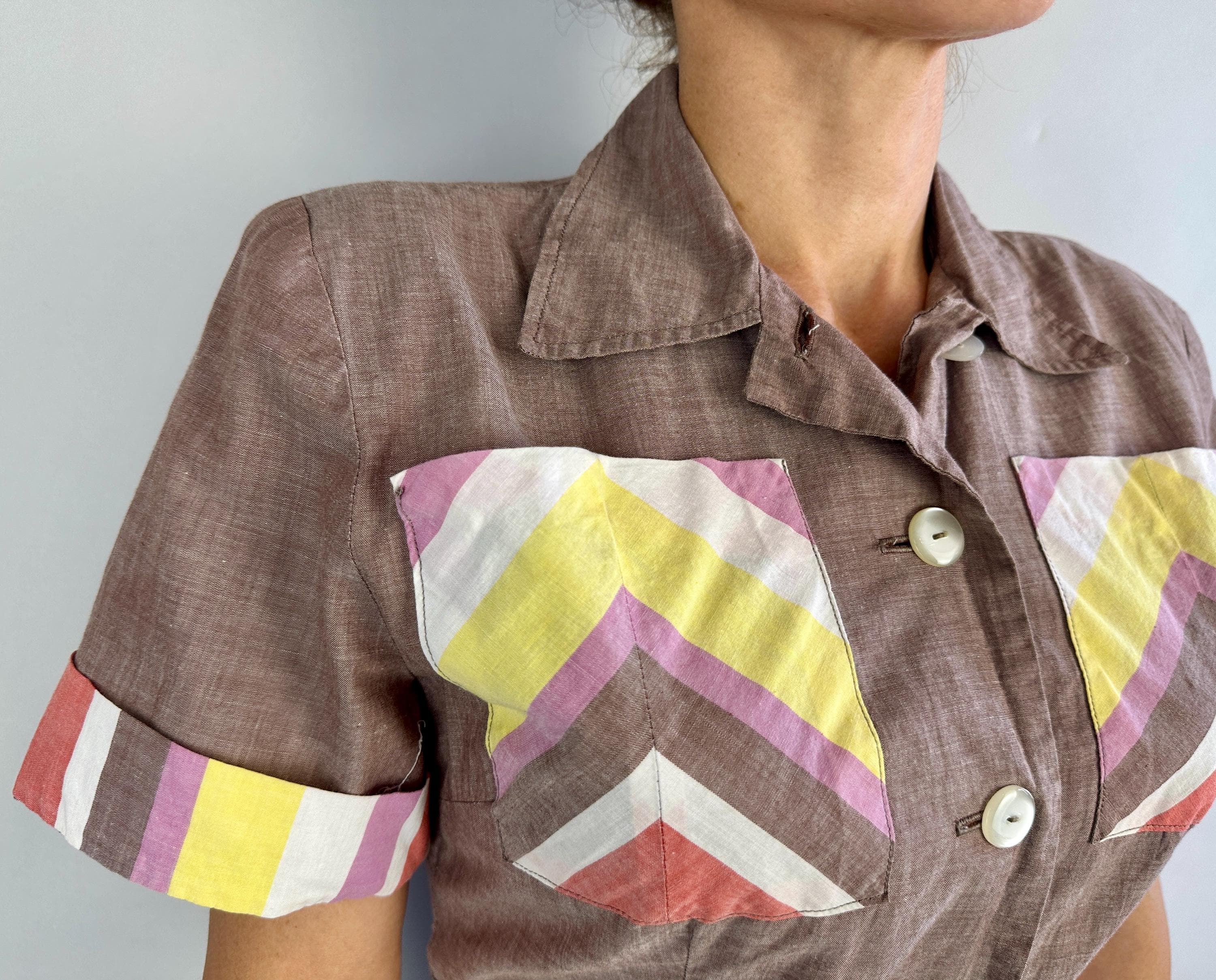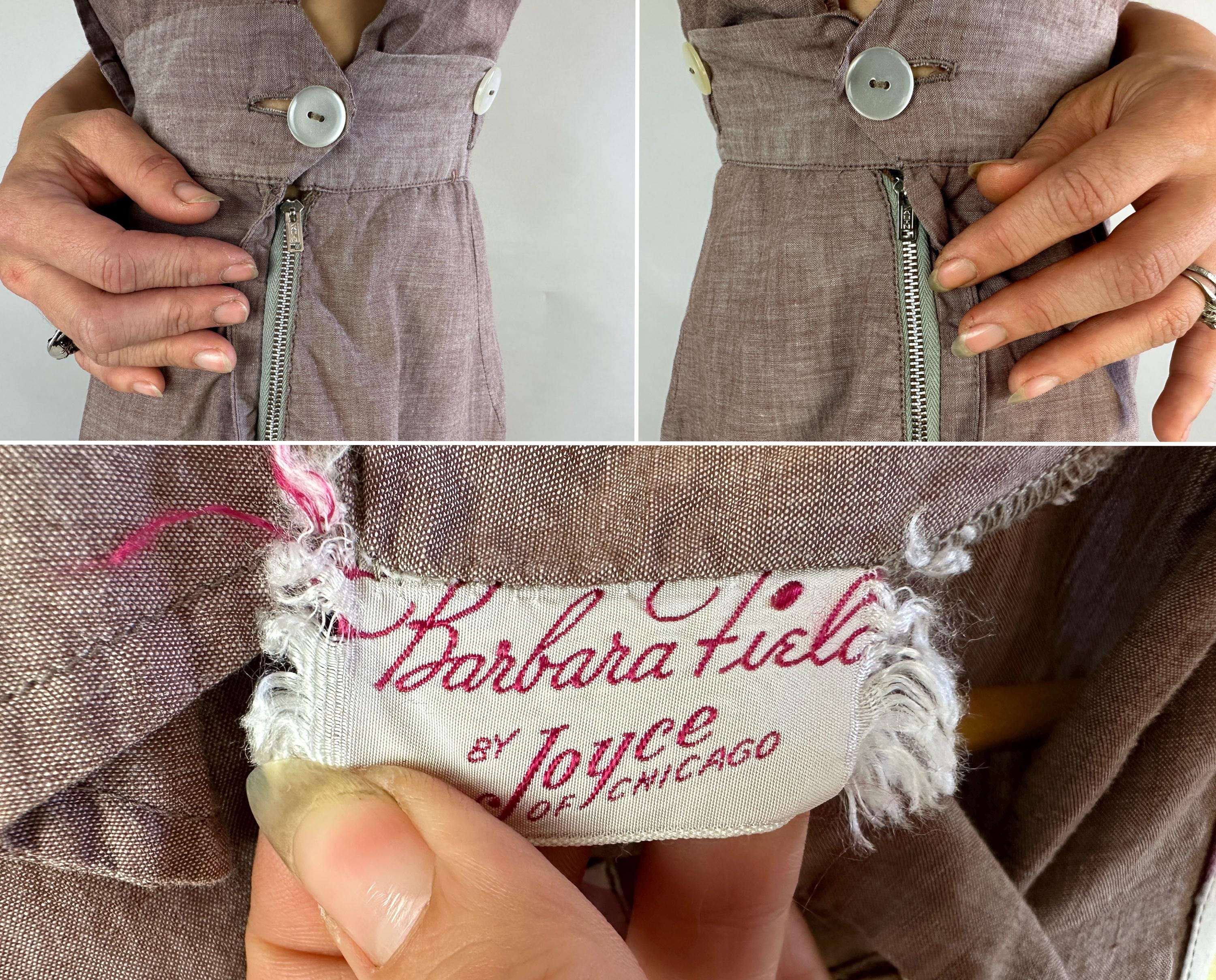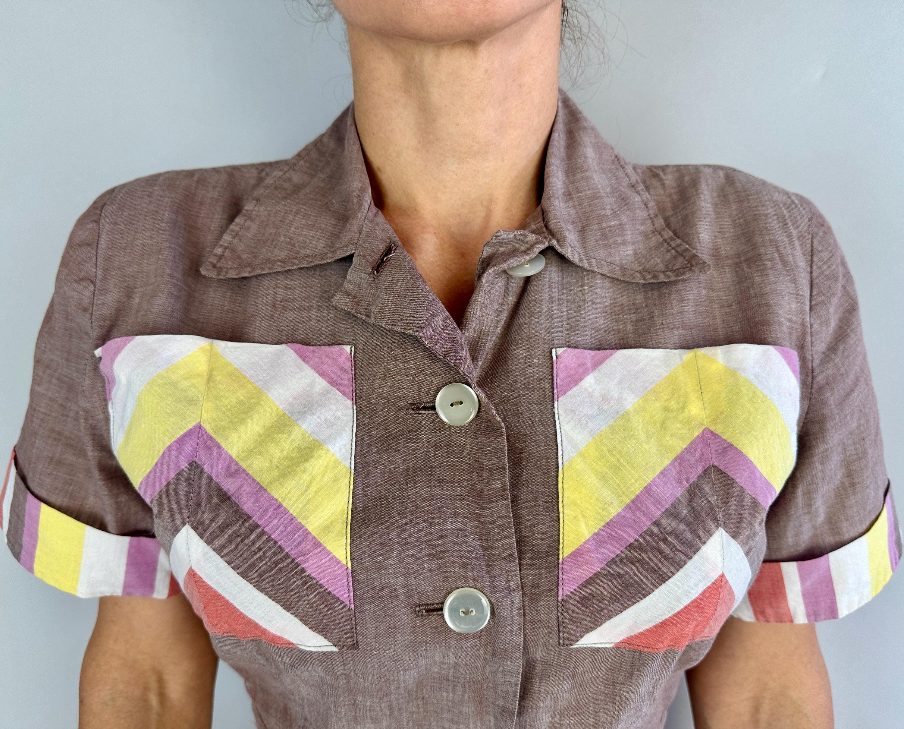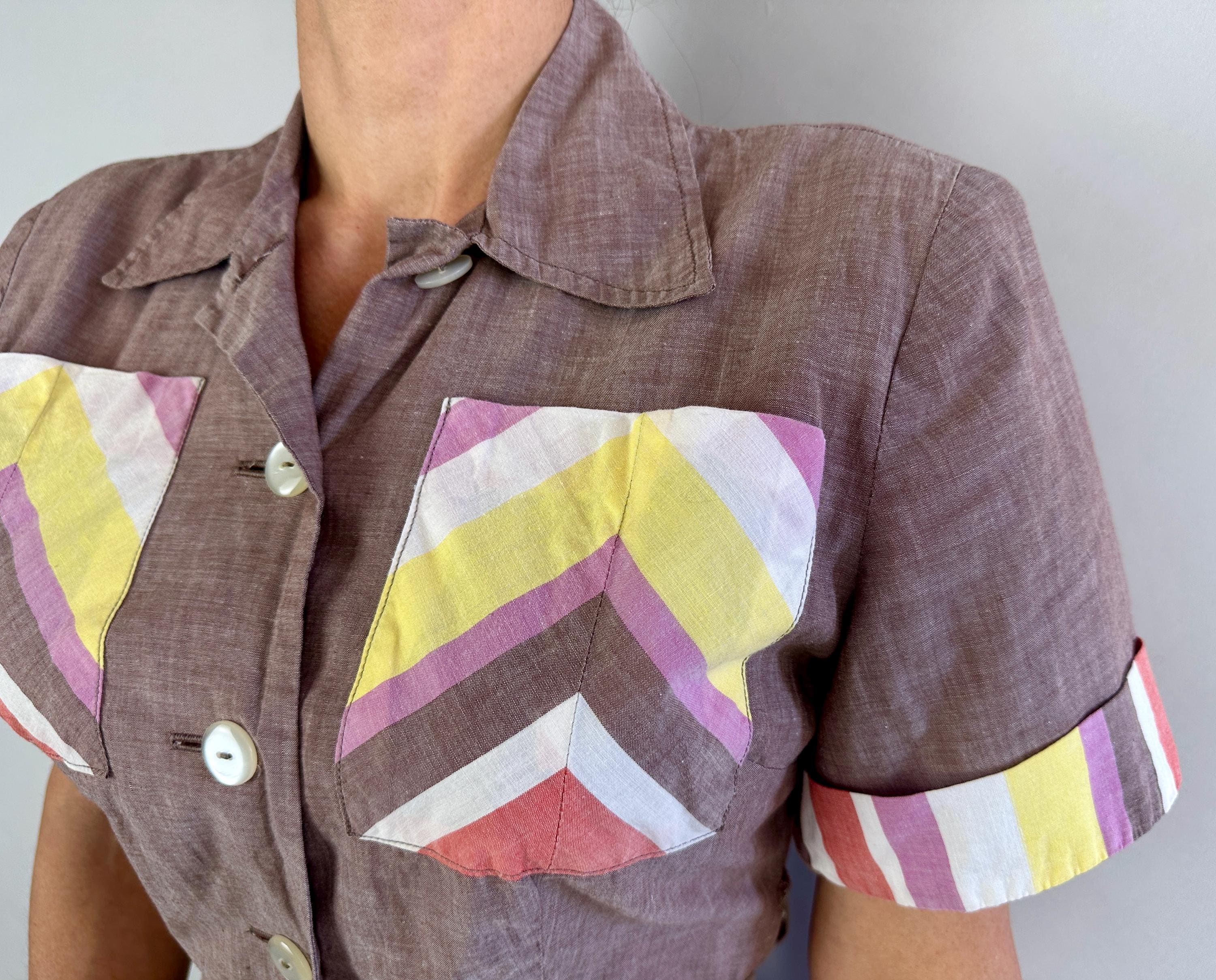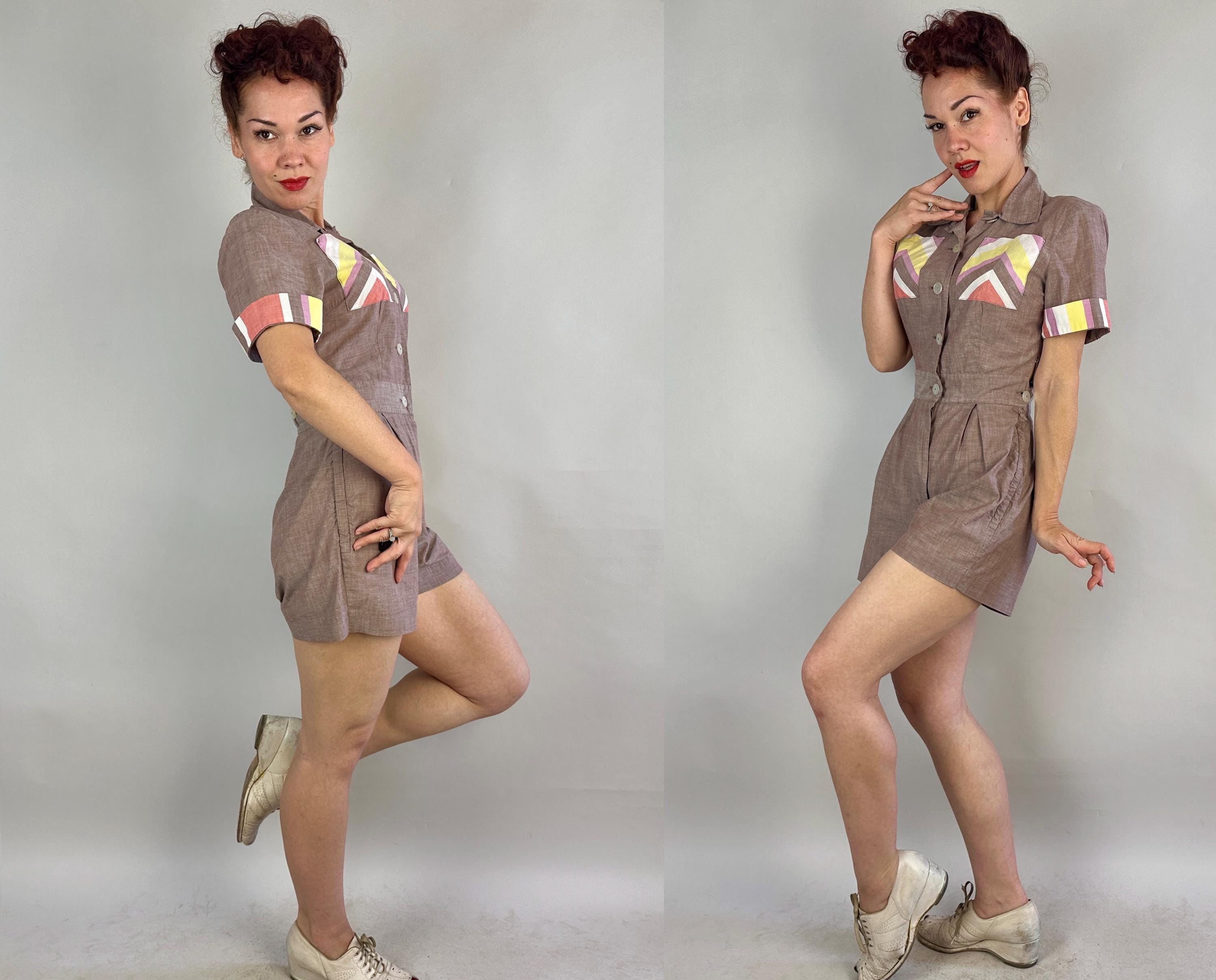 Make a playdate and send hearts a flutter when you're basking in this 1940s playsuit! Made of cotton chambray in puce (brown-purple taupe) with stripe accents in watermelon red, butter yellow, white, and orchid purple. Two patch pockets on the chest utilize the stripes in a chevron formation for extra fun detail. The shirtwaist style romper fastens with white buttons up the front but then also on each side of the waist along with each hip getting a metal zipper, all of which leads to something that is seriously lacking in a lot of rompers, a trap door! Around the back of the waist are more buttons fastening the shorts to the shirt so you can relieve yourself without time consuming fuss! Also styled with small pads in the shoulders, box pleats below the waist, and wide cut leg openings on the shorts. From 'Barbara Field by Joyce of Chicago". This playsuit is in great vintage condition, with no holes, stains or odors to note.