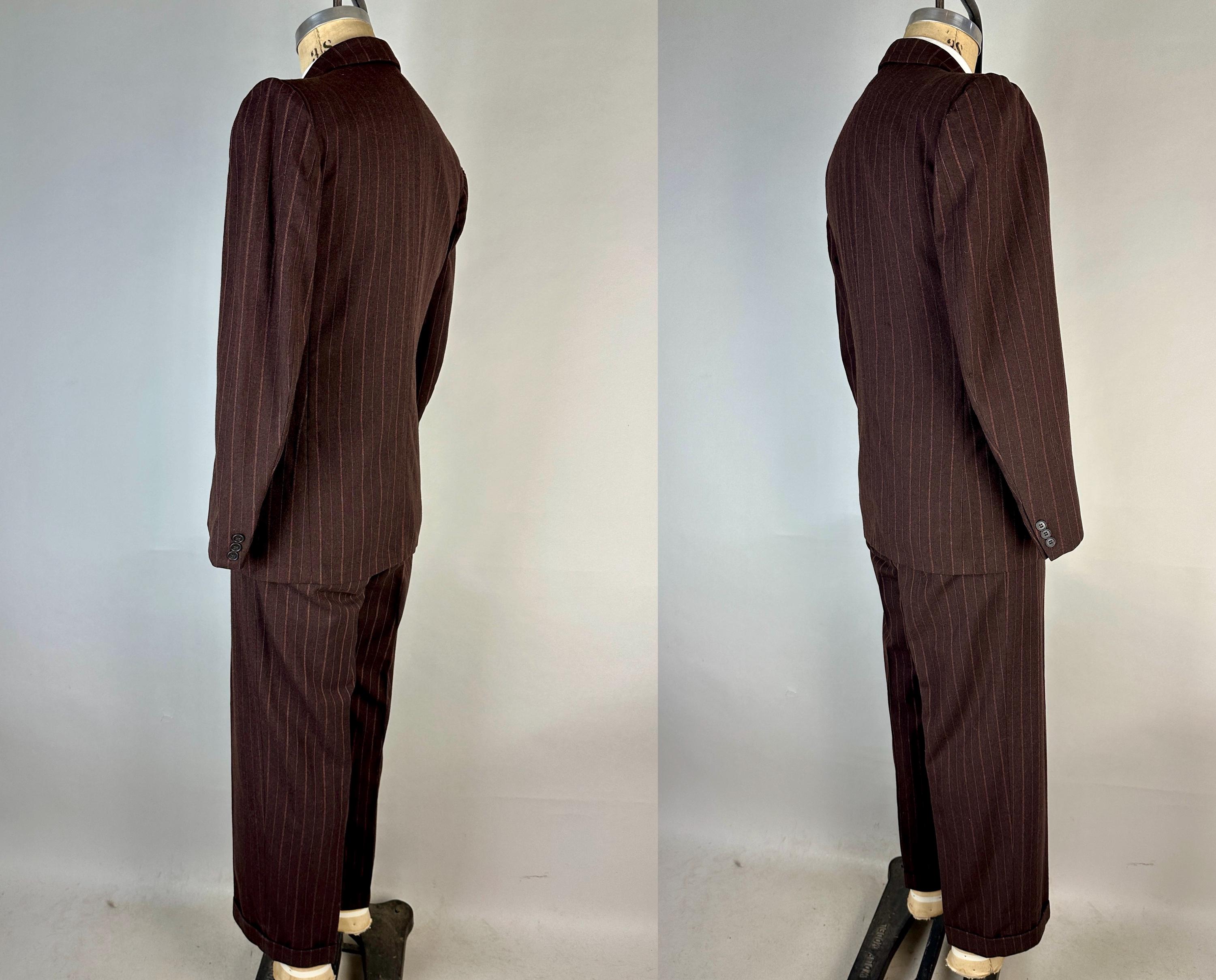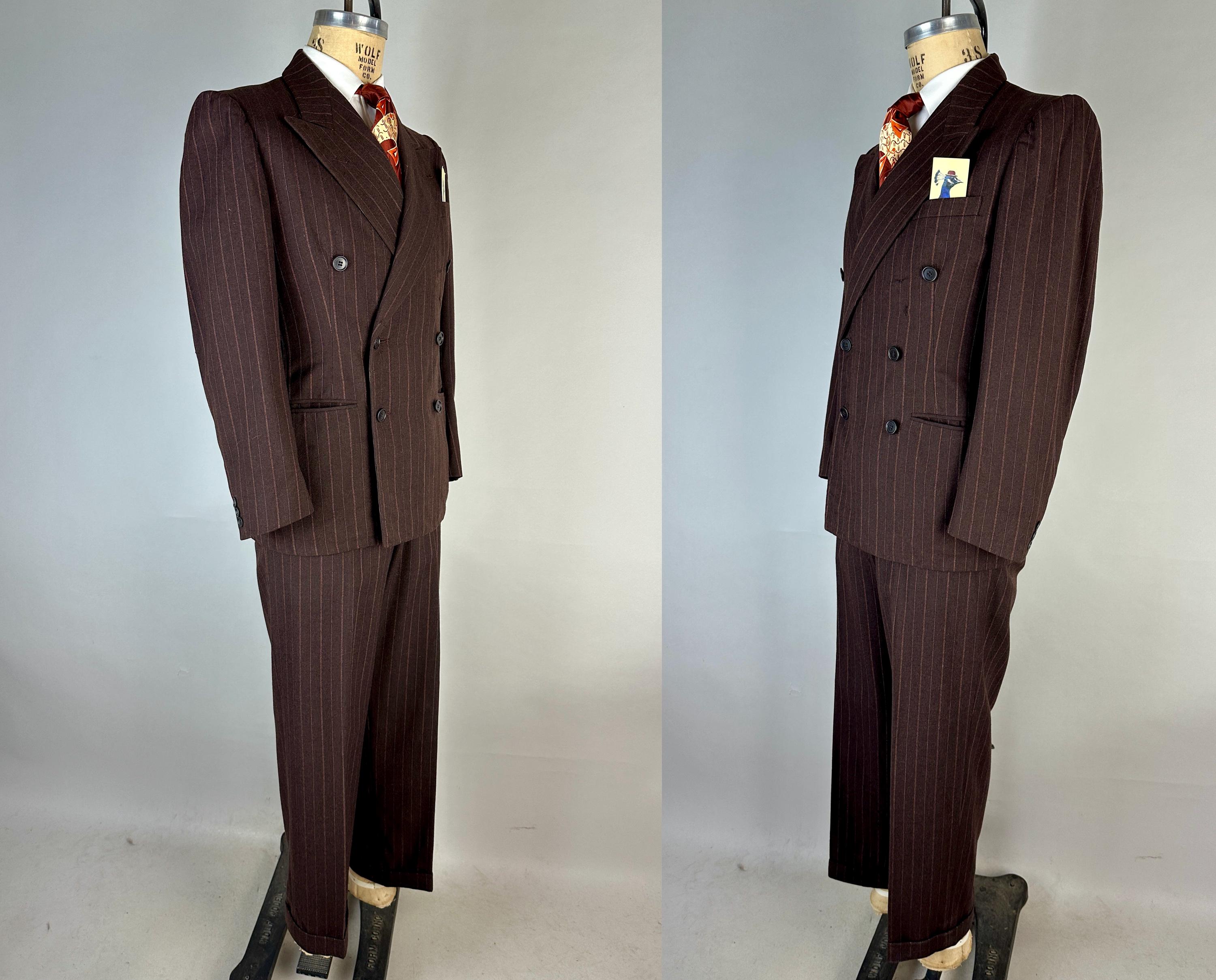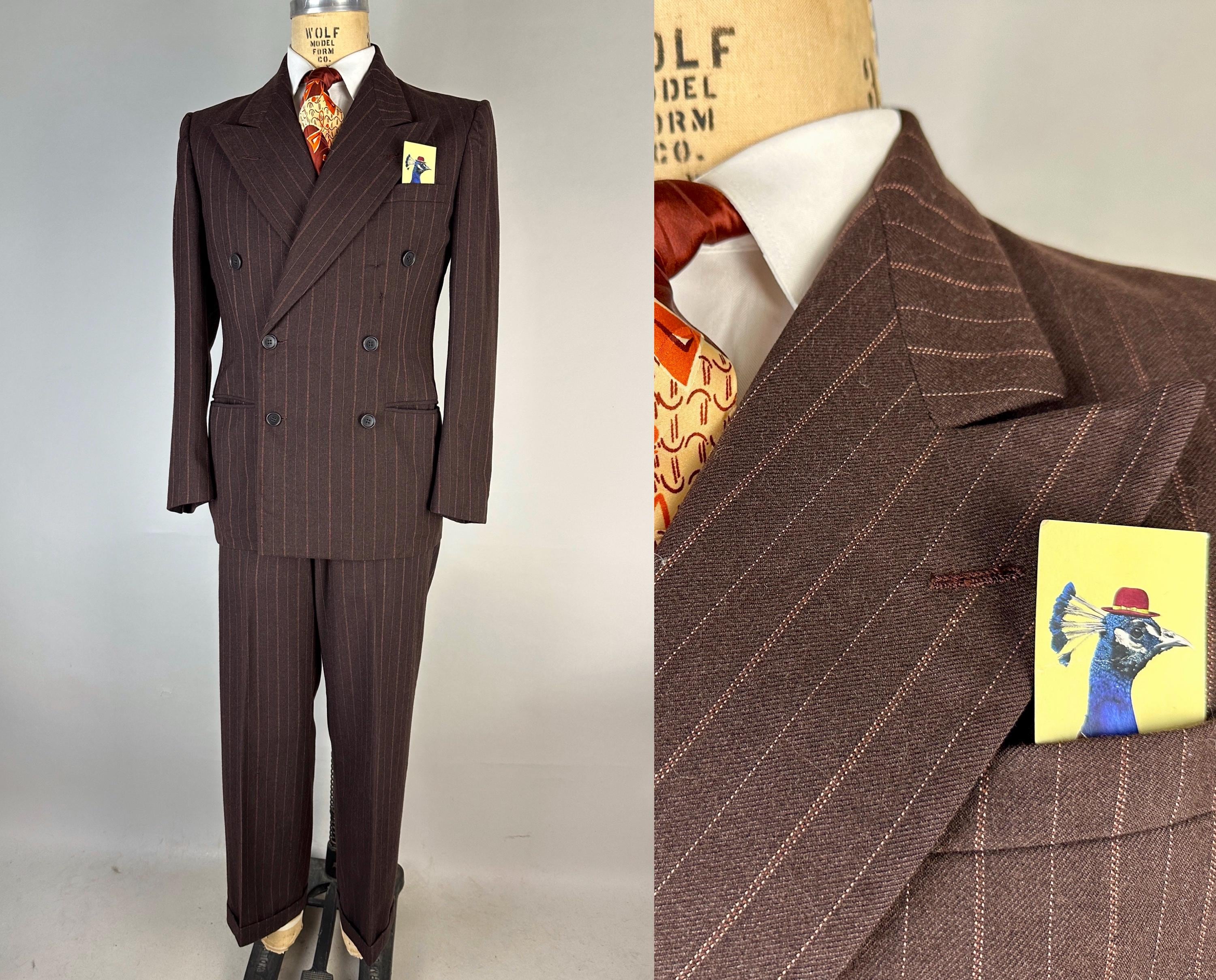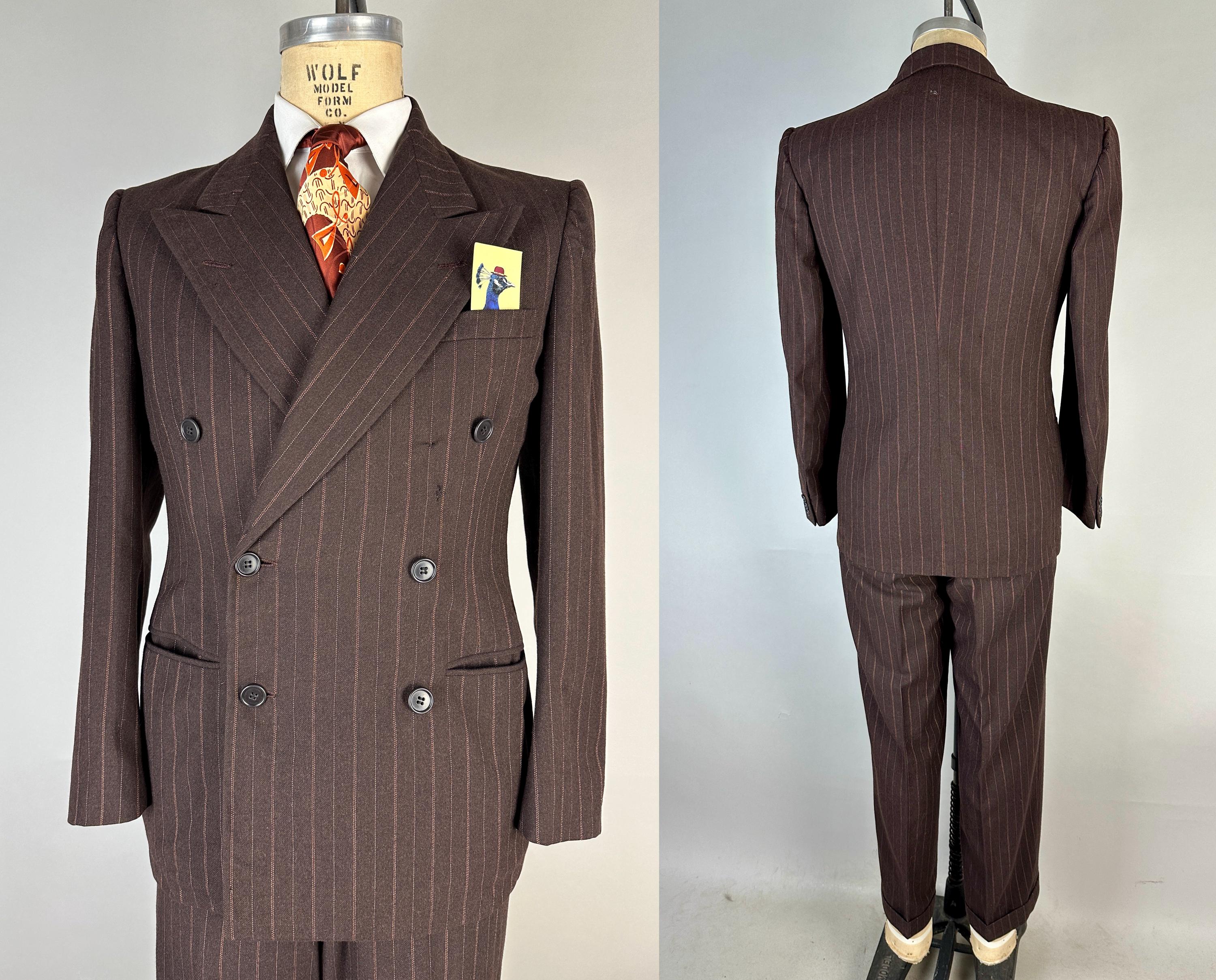You’re sure to look delicious and feel it too in this 1930s suit! The wool of this suit is dark chocolate brown with pinstripes of peachy orange and burnt orange, such a unique combo with great eye appeal! The jacket is double breasted with a 2x6 button stance, wide peak lapels, jetted chest pocket, welted hip pockets, and ventless back. The shoulders are padded and with a butterfly lining it also includes two inner pockets. The flat front trousers have dropped belt loops, inner suspender buttons, five welted pockets (one with button closure on the back), button fly, and cuffed hems. Labeled "Thompsons Redding California" with a 1936-39 Union Label dating this suit to the 1930s. This suit is in great vintage condition, with no holes, stains, or odors to note.