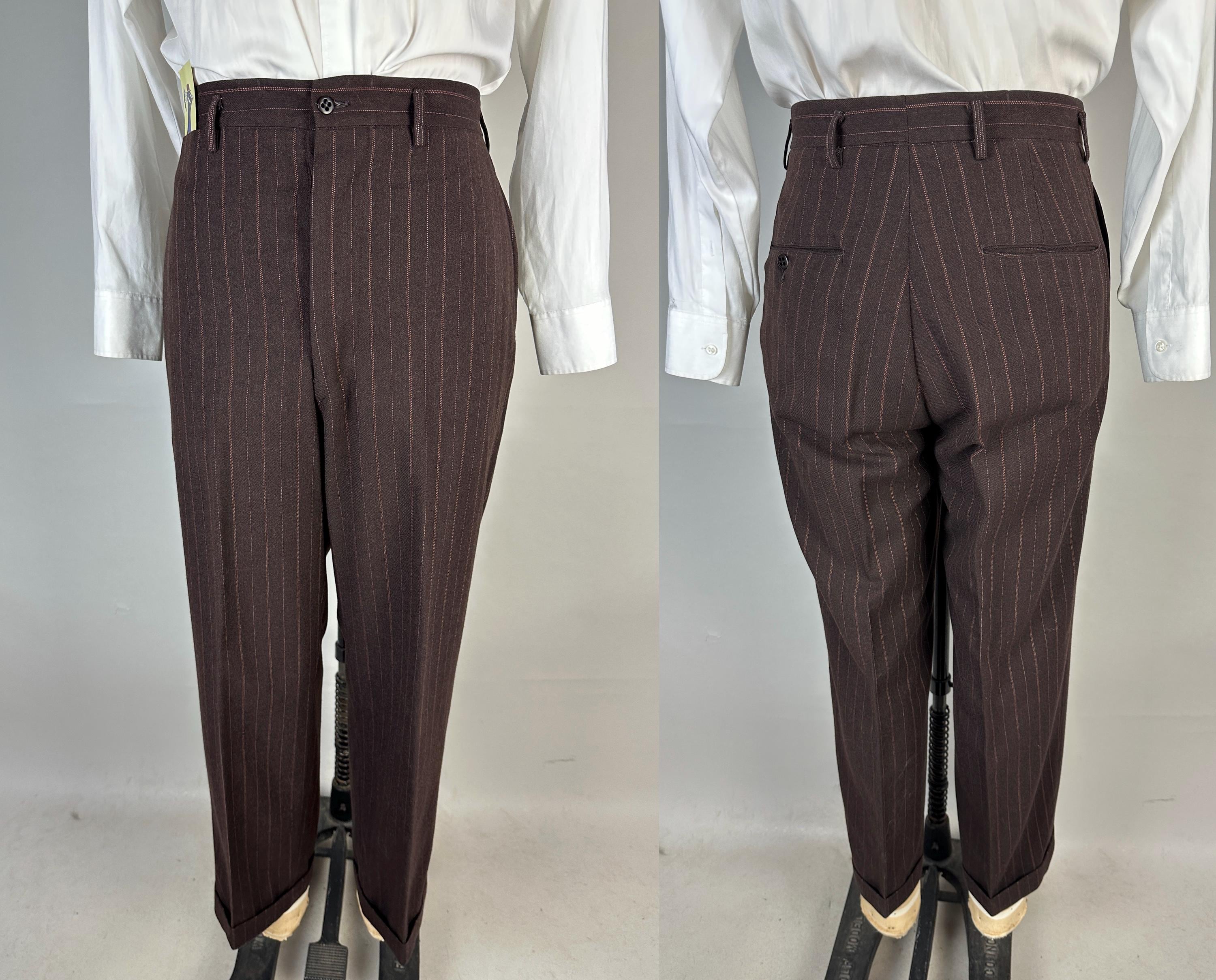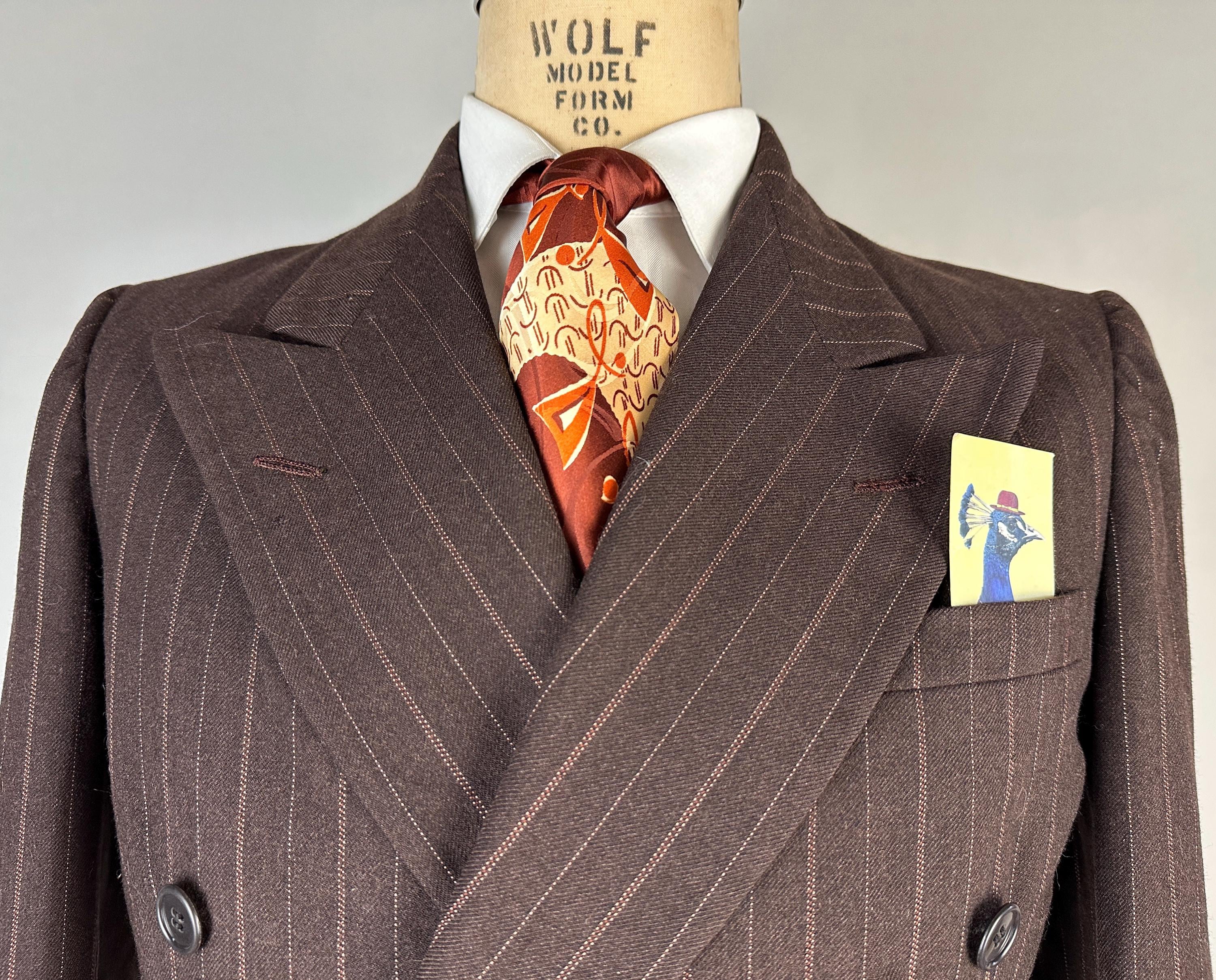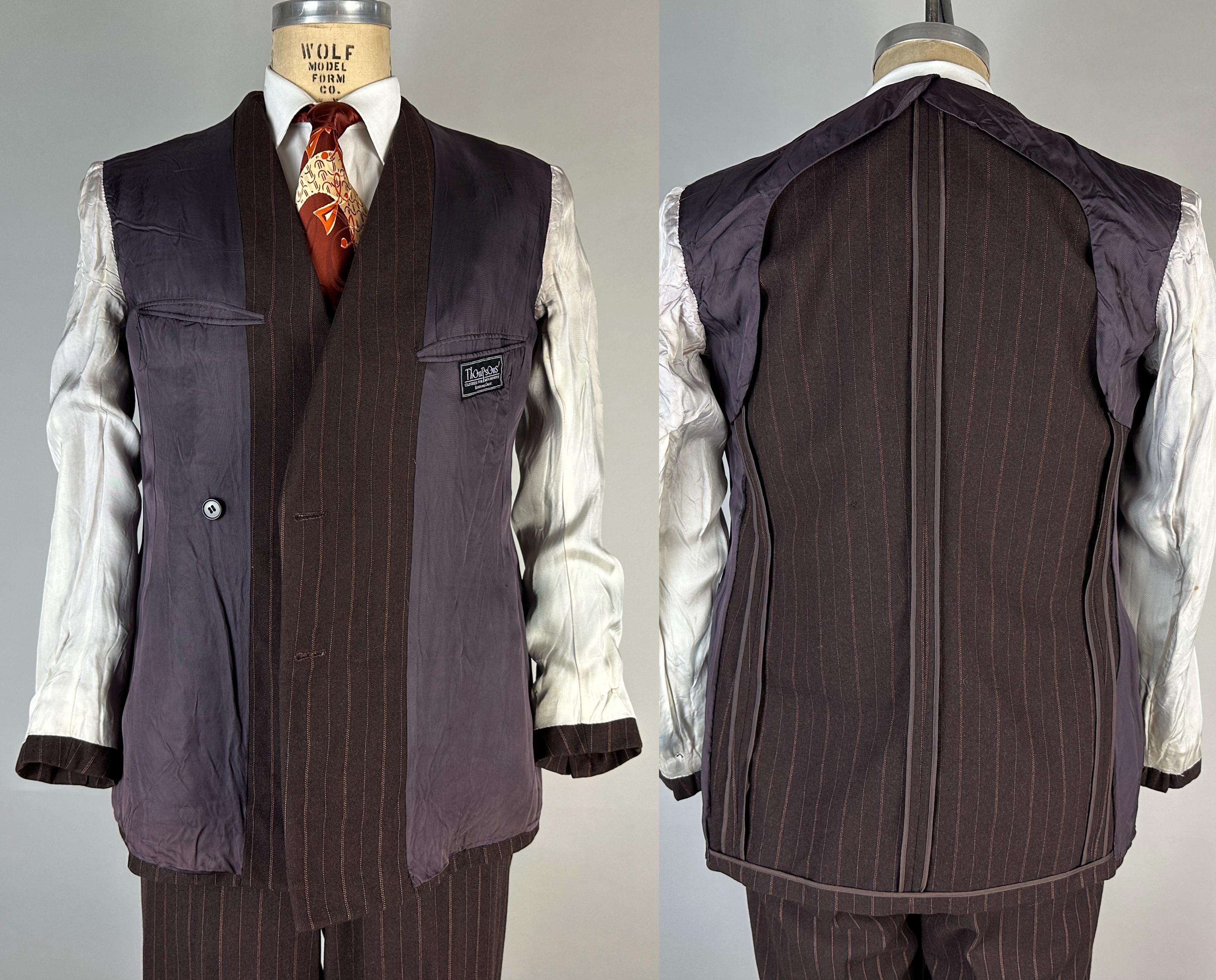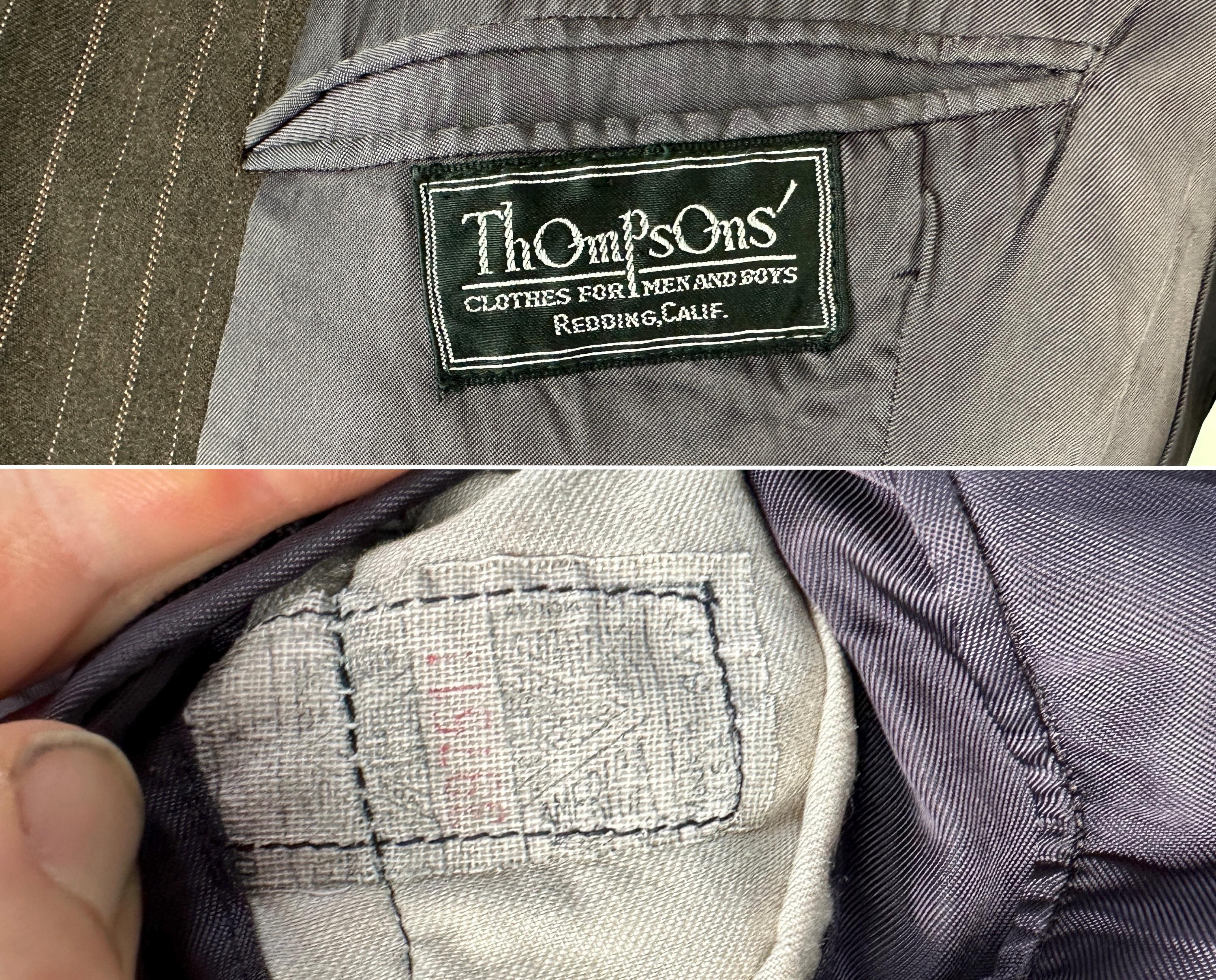 You’re sure to look delicious and feel it too in this 1930s suit! The wool of this suit is dark chocolate brown with pinstripes of peachy orange and burnt orange, such a unique combo with great eye appeal! The jacket is double breasted with a 2x6 button stance, wide peak lapels, jetted chest pocket, welted hip pockets, and ventless back. The shoulders are padded and with a butterfly lining it also includes two inner pockets. The flat front trousers have dropped belt loops, inner suspender buttons, five welted pockets (one with button closure on the back), button fly, and cuffed hems. Labeled "Thompsons Redding California" with a 1936-39 Union Label dating this suit to the 1930s. This suit is in great vintage condition, with no holes, stains, or odors to note.