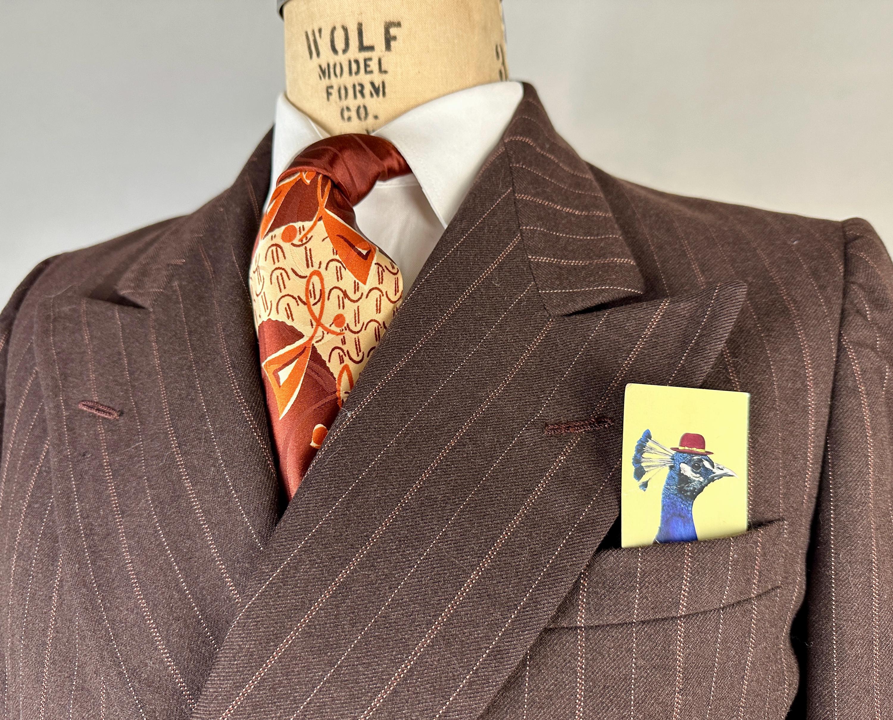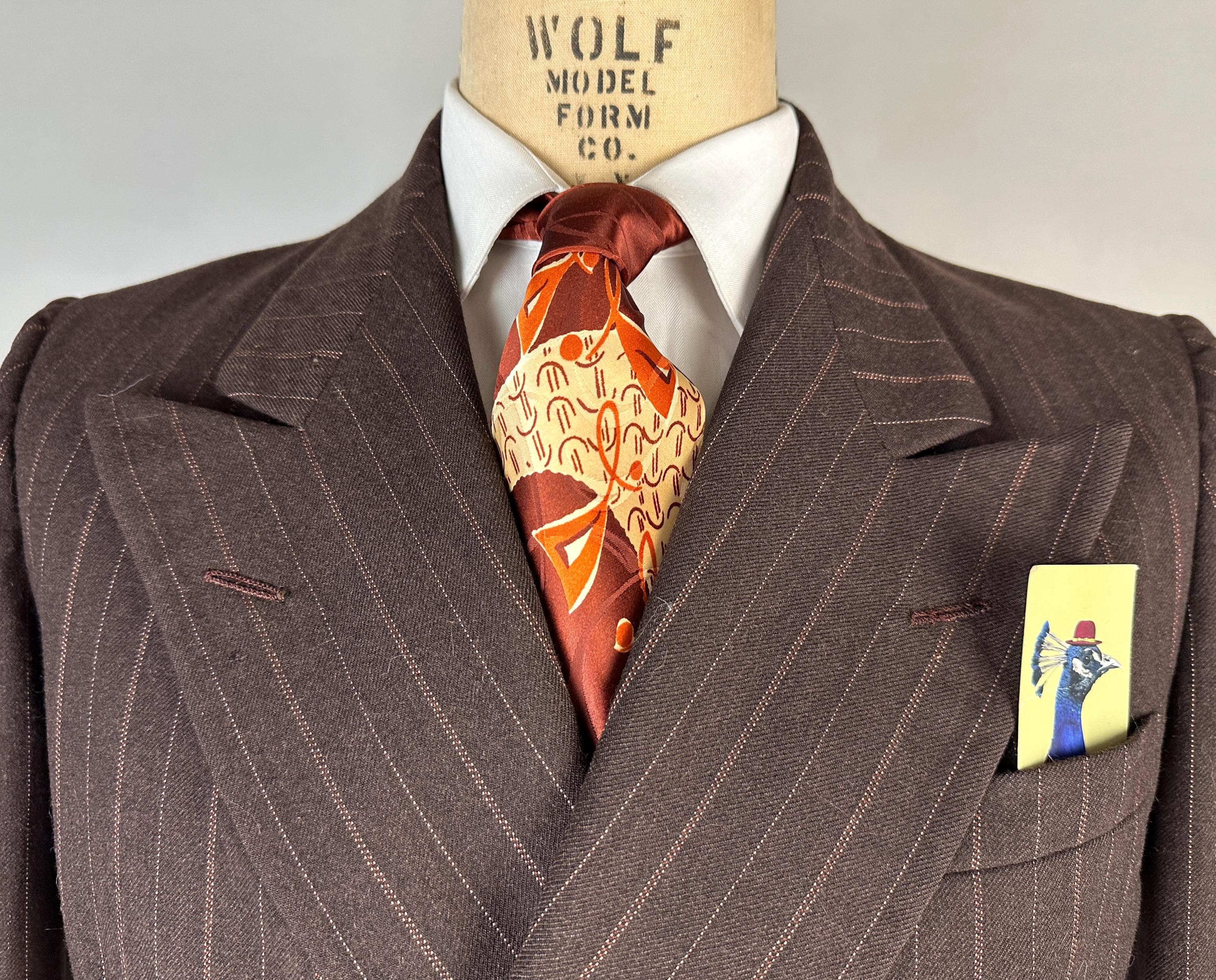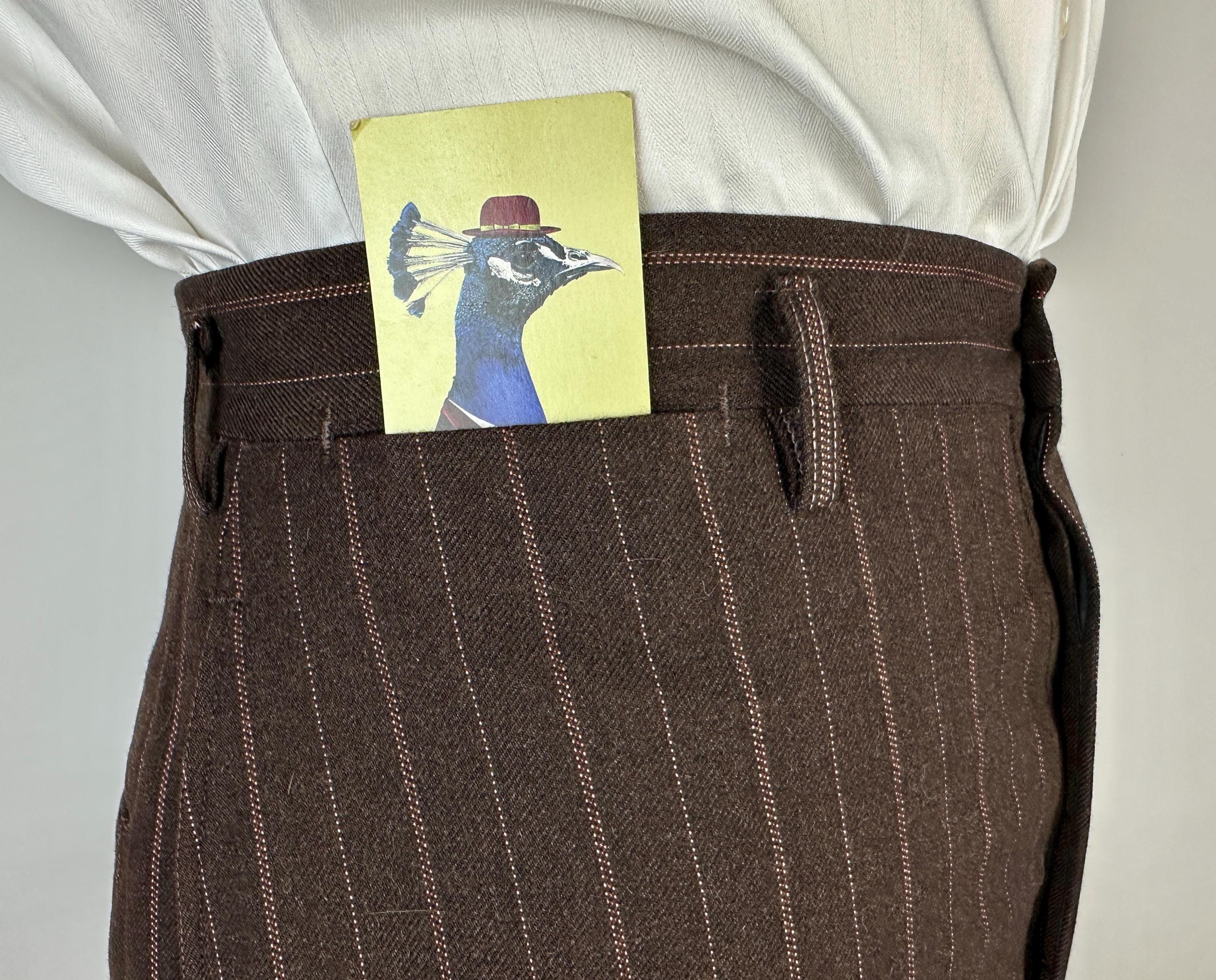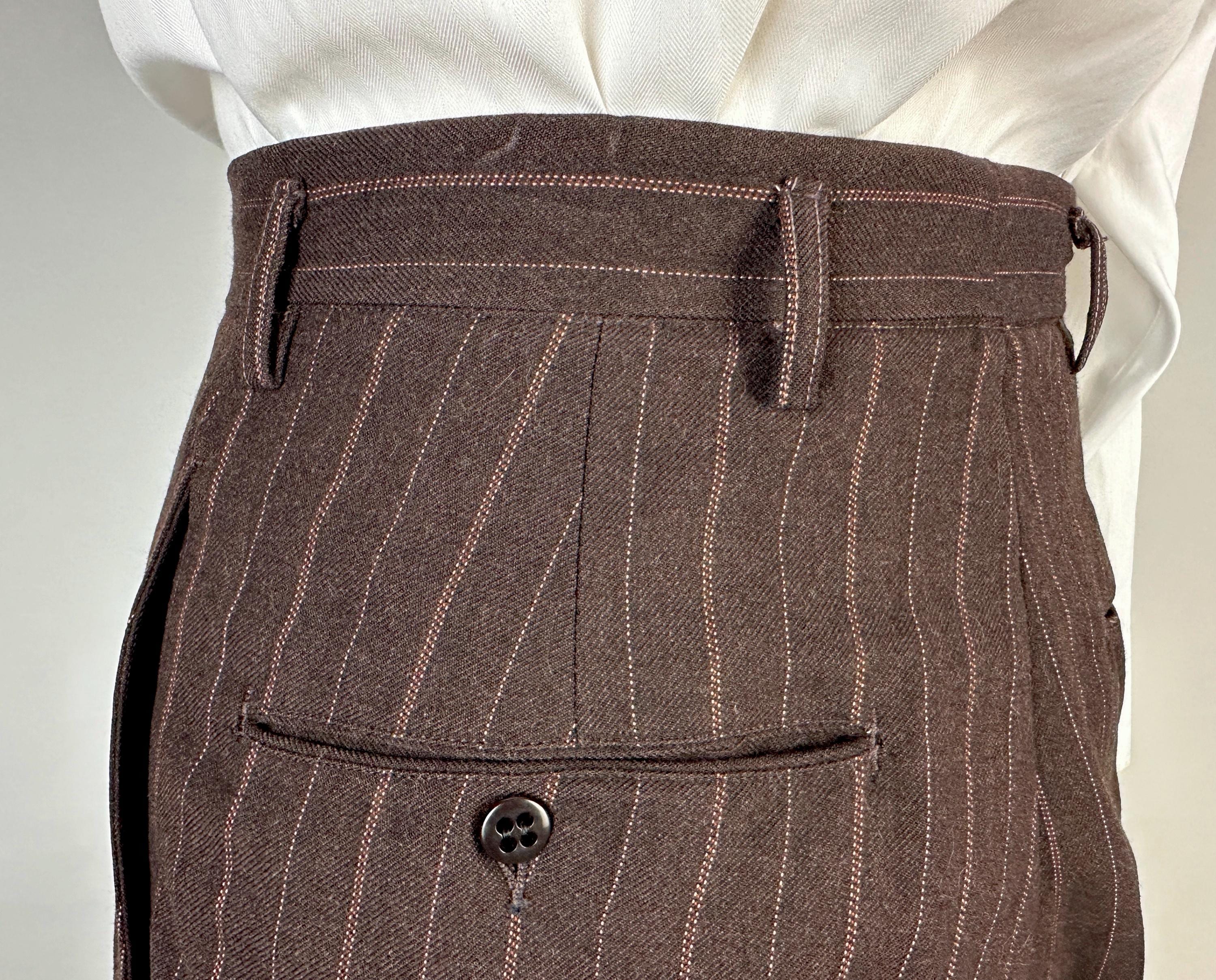 You’re sure to look delicious and feel it too in this 1930s suit! The wool of this suit is dark chocolate brown with pinstripes of peachy orange and burnt orange, such a unique combo with great eye appeal! The jacket is double breasted with a 2x6 button stance, wide peak lapels, jetted chest pocket, welted hip pockets, and ventless back. The shoulders are padded and with a butterfly lining it also includes two inner pockets. The flat front trousers have dropped belt loops, inner suspender buttons, five welted pockets (one with button closure on the back), button fly, and cuffed hems. Labeled "Thompsons Redding California" with a 1936-39 Union Label dating this suit to the 1930s. This suit is in great vintage condition, with no holes, stains, or odors to note.