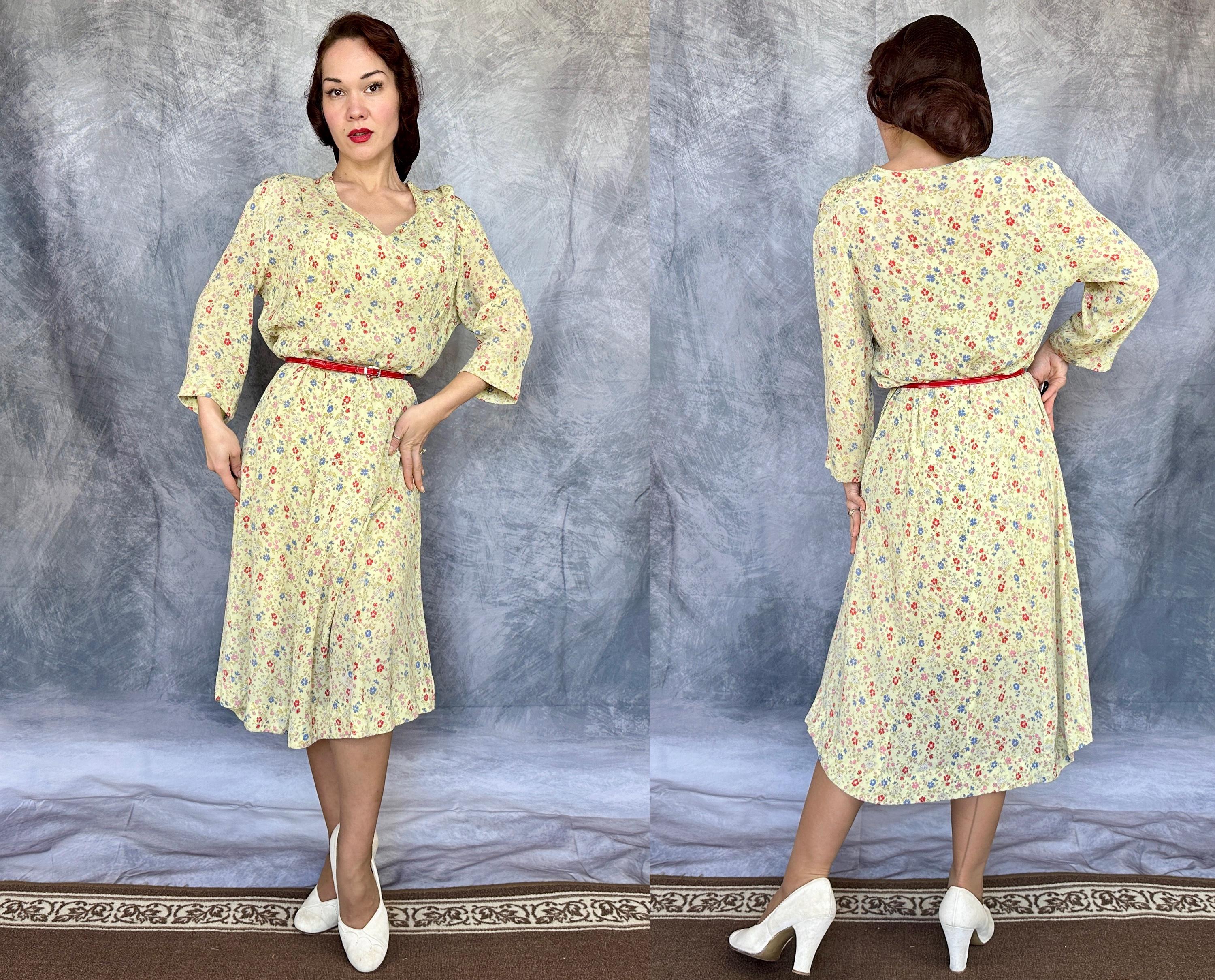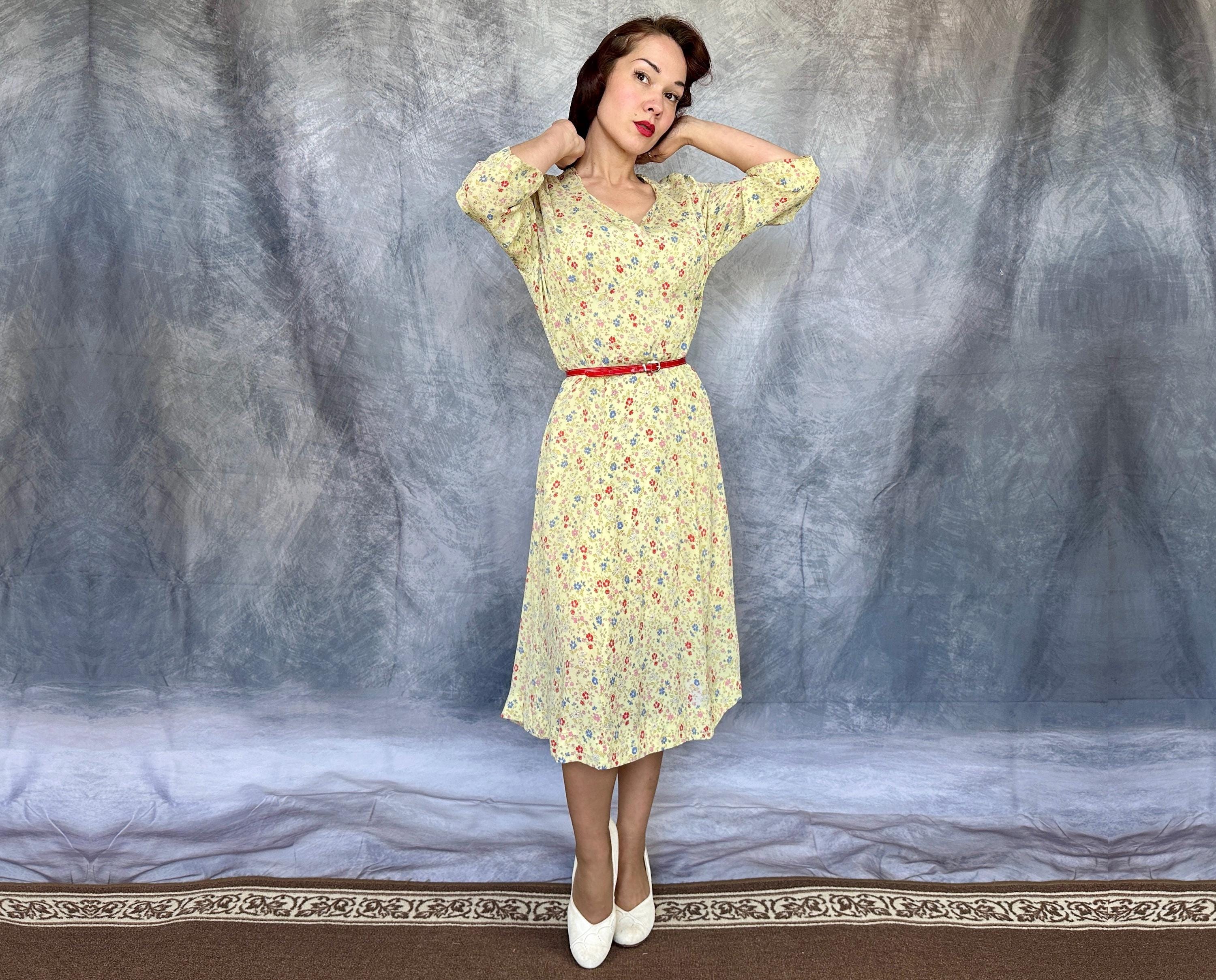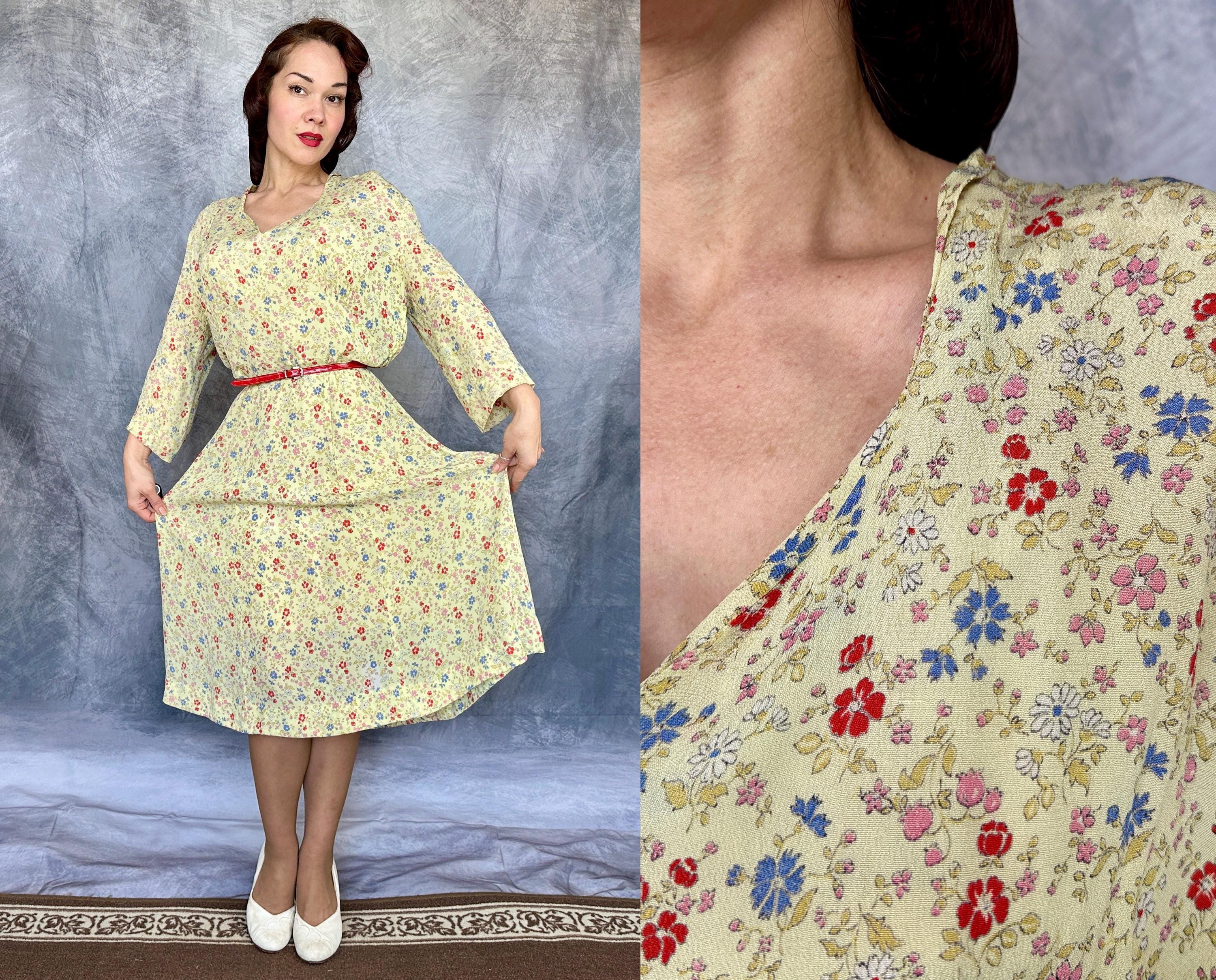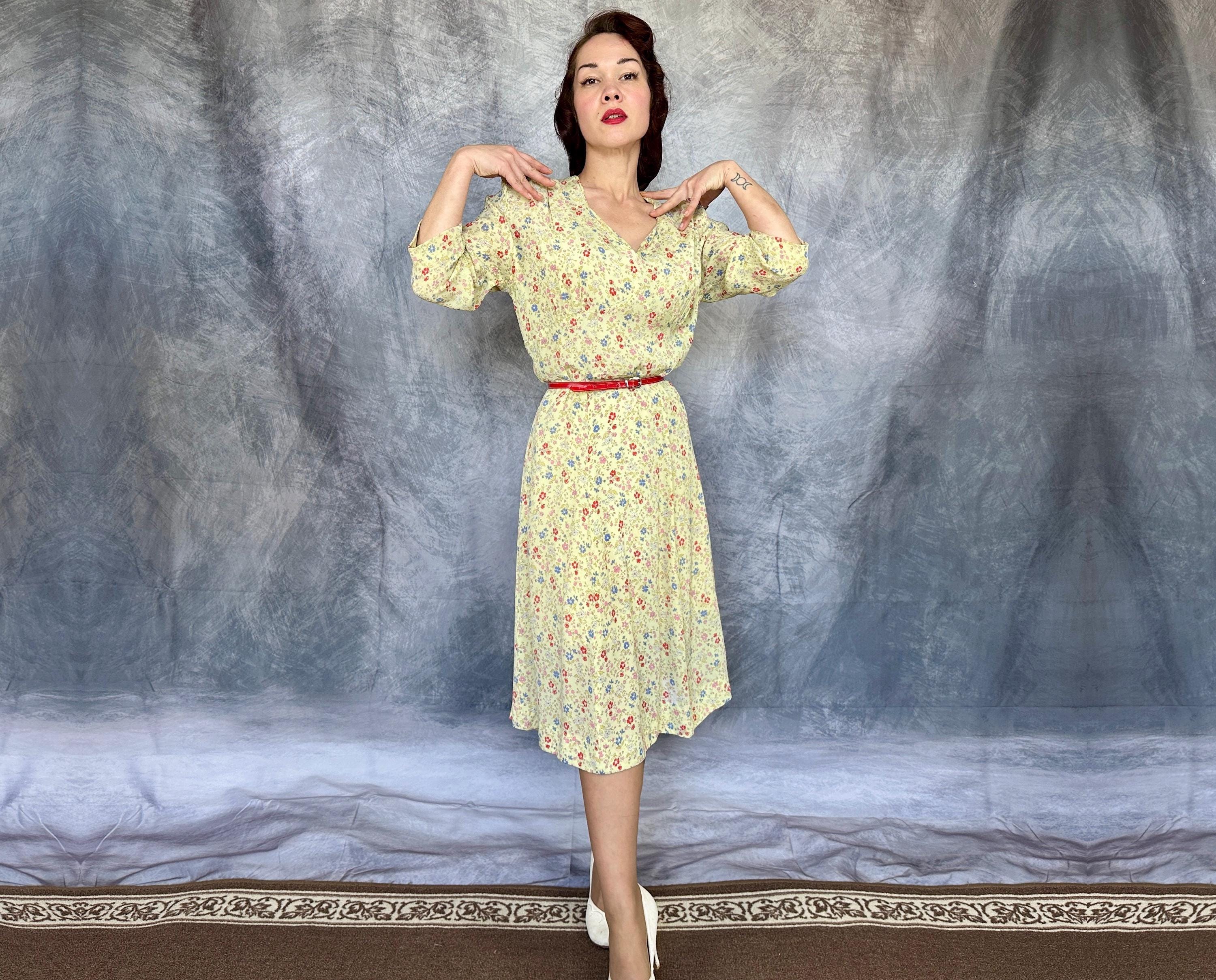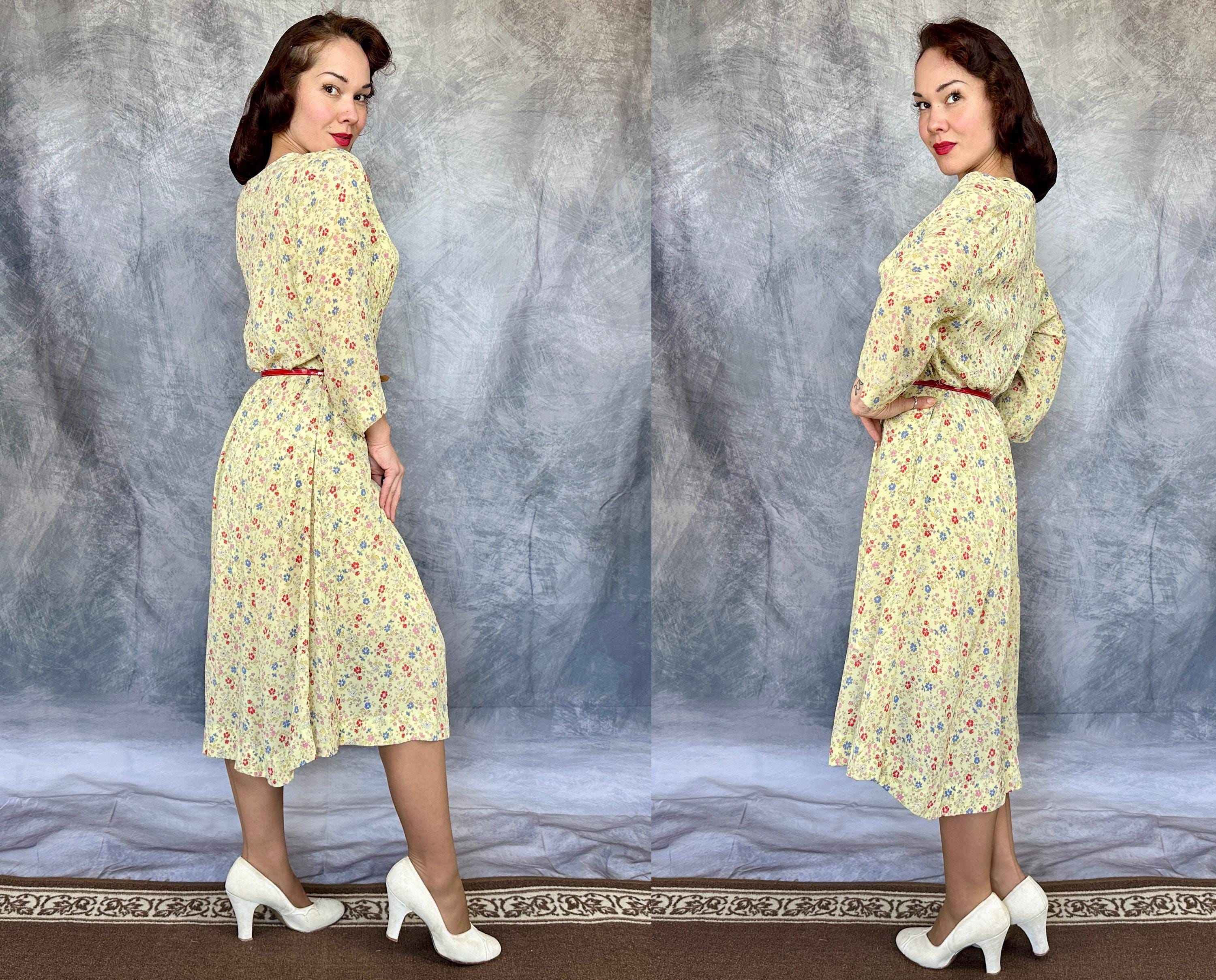 Have a picnic amongst the wildflowers and blend right in with this 1940s frock! Rayon crepe is just singing with spring in it's butter yellow background topped with a wildflower floral in cornflower blue, tomato red, ochre, bubblegum pink, and white. Fashioned with a deep V-neck, shoulder smocking, three quarter length sleeves, and ascending point bodice with bust gathers, a meadow frolic will be a delight! Metal zipper on the side. This dress is in great vintage condition, with a little bit of faint discolouration near the hem but no holes or odors to note. Please note, belt is model's own.