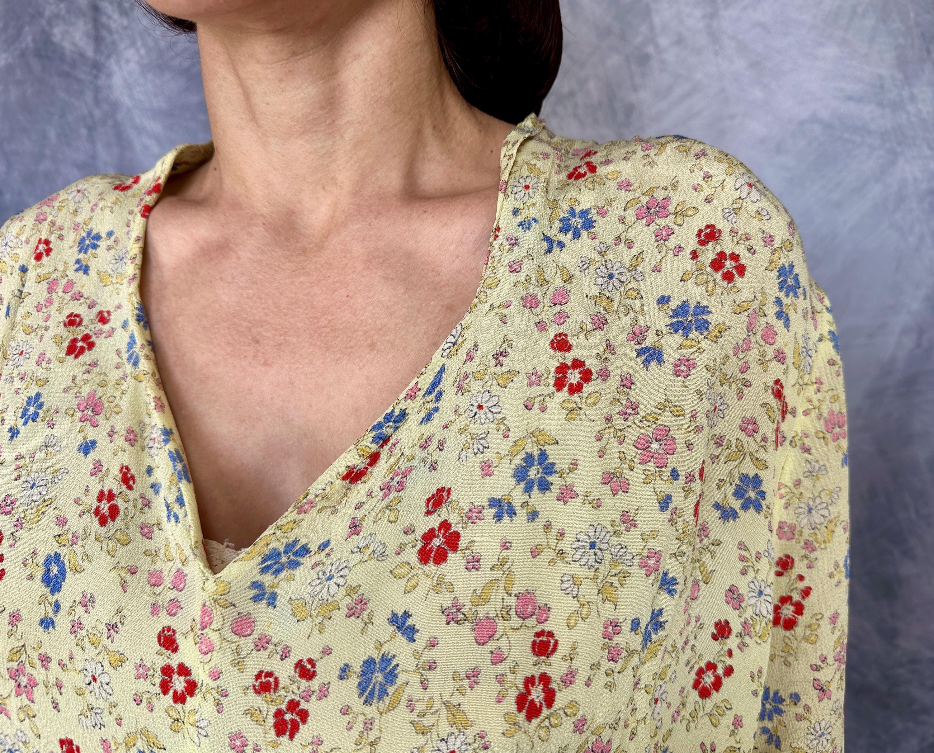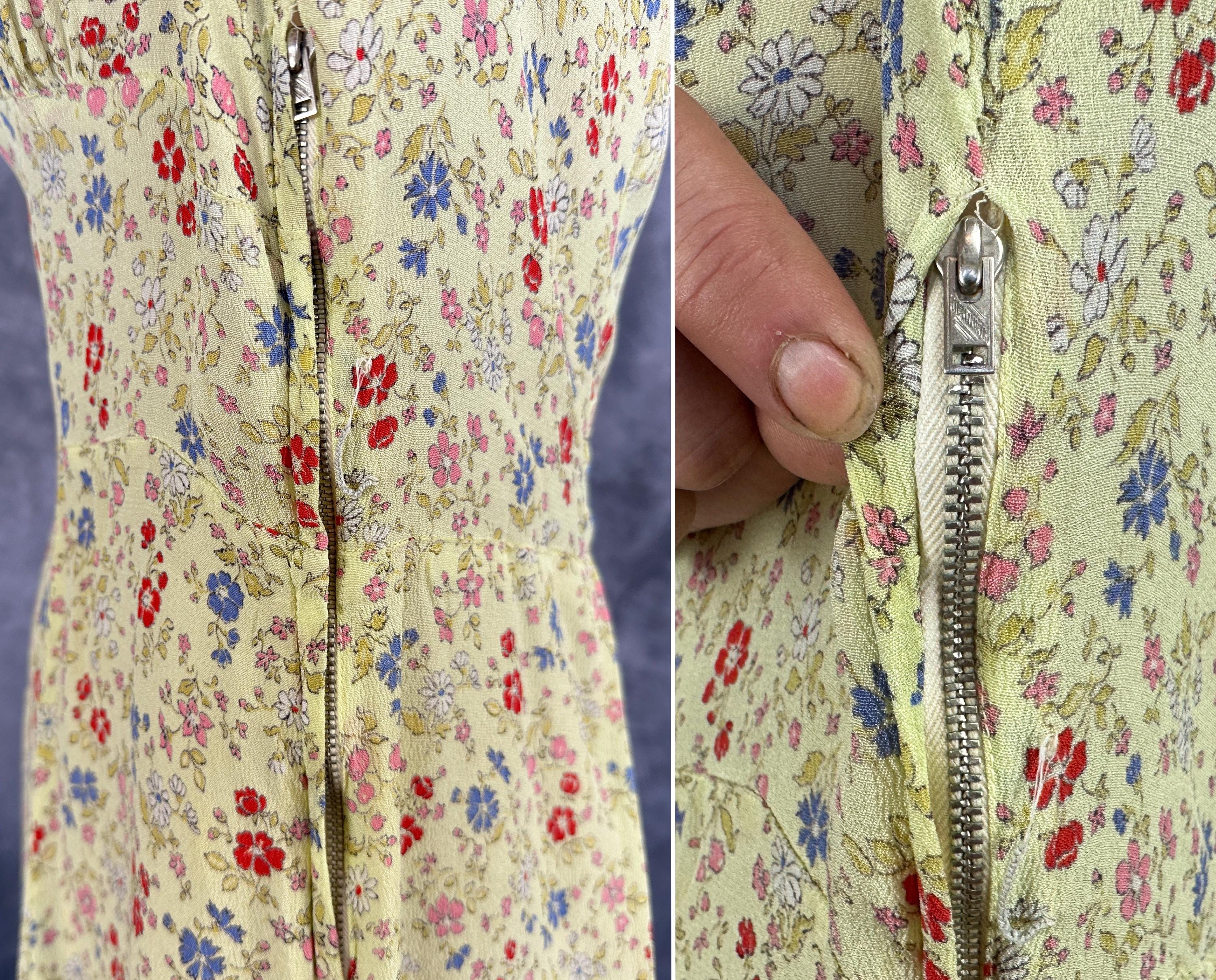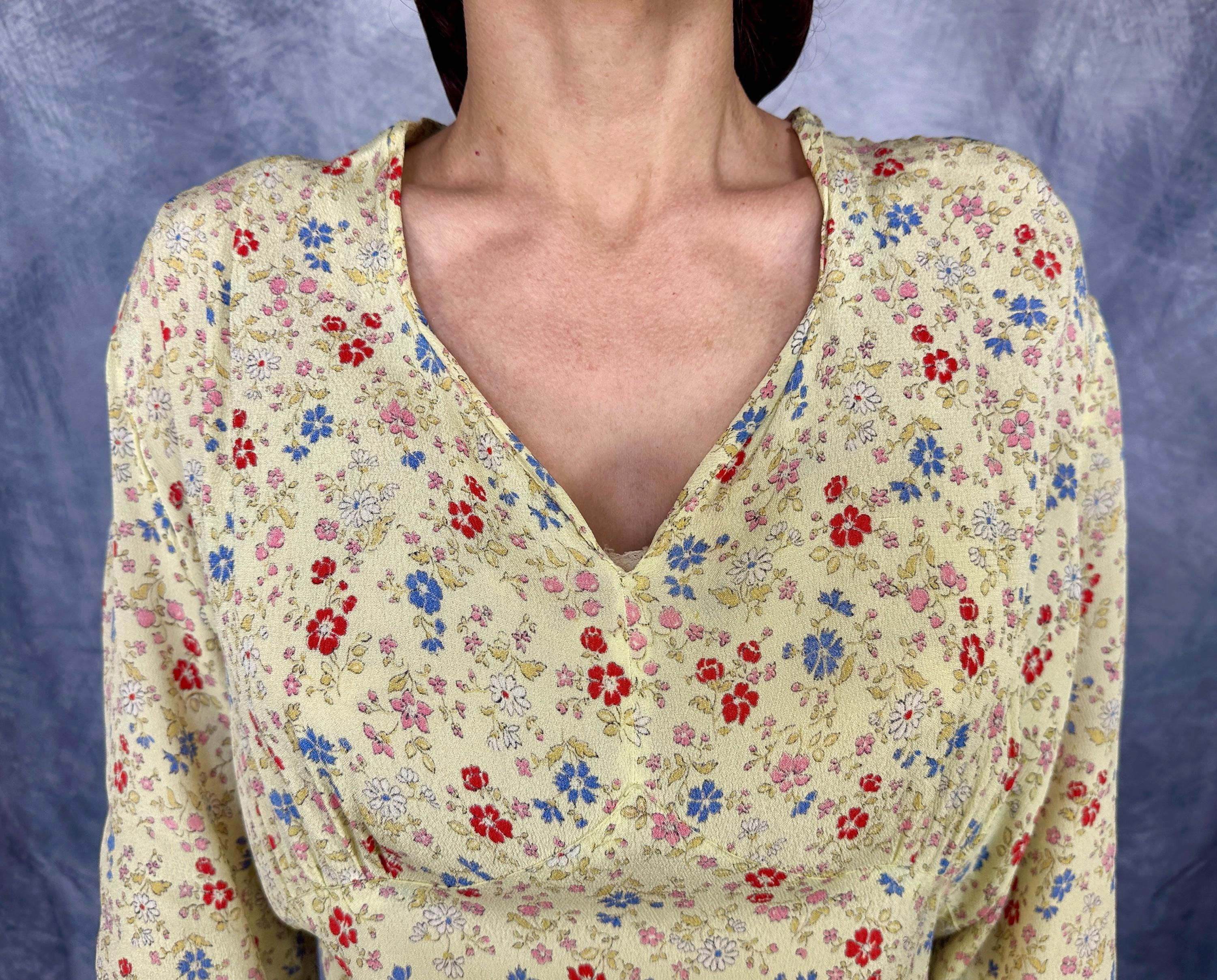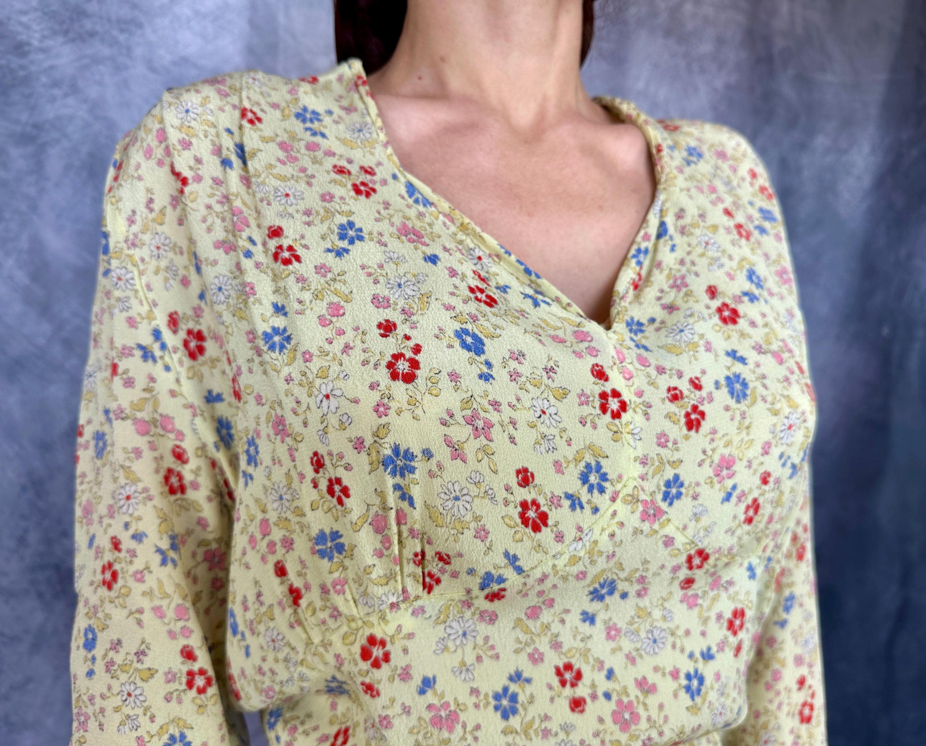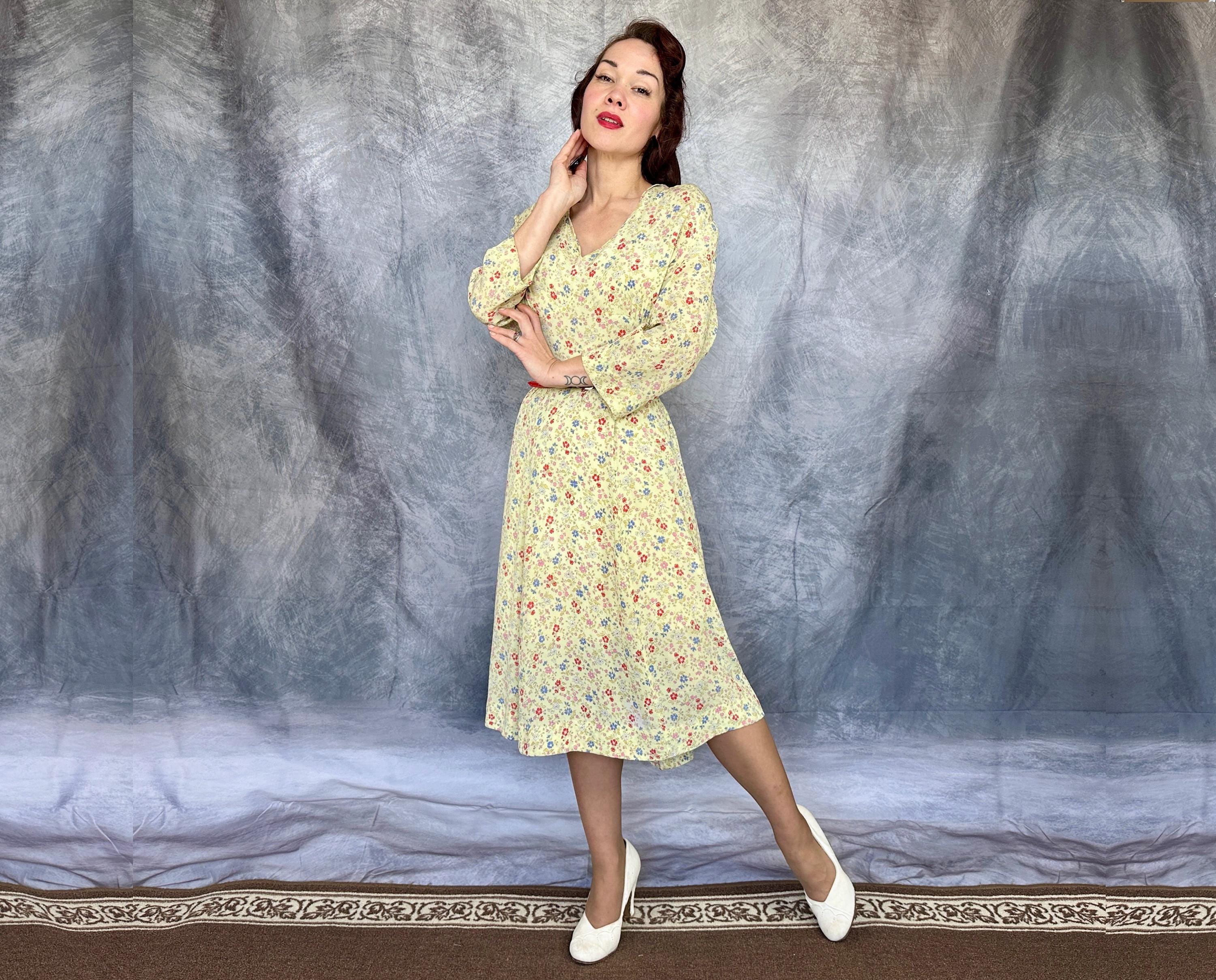 Have a picnic amongst the wildflowers and blend right in with this 1940s frock! Rayon crepe is just singing with spring in it's butter yellow background topped with a wildflower floral in cornflower blue, tomato red, ochre, bubblegum pink, and white. Fashioned with a deep V-neck, shoulder smocking, three quarter length sleeves, and ascending point bodice with bust gathers, a meadow frolic will be a delight! Metal zipper on the side. This dress is in great vintage condition, with a little bit of faint discolouration near the hem but no holes or odors to note. Please note, belt is model's own.