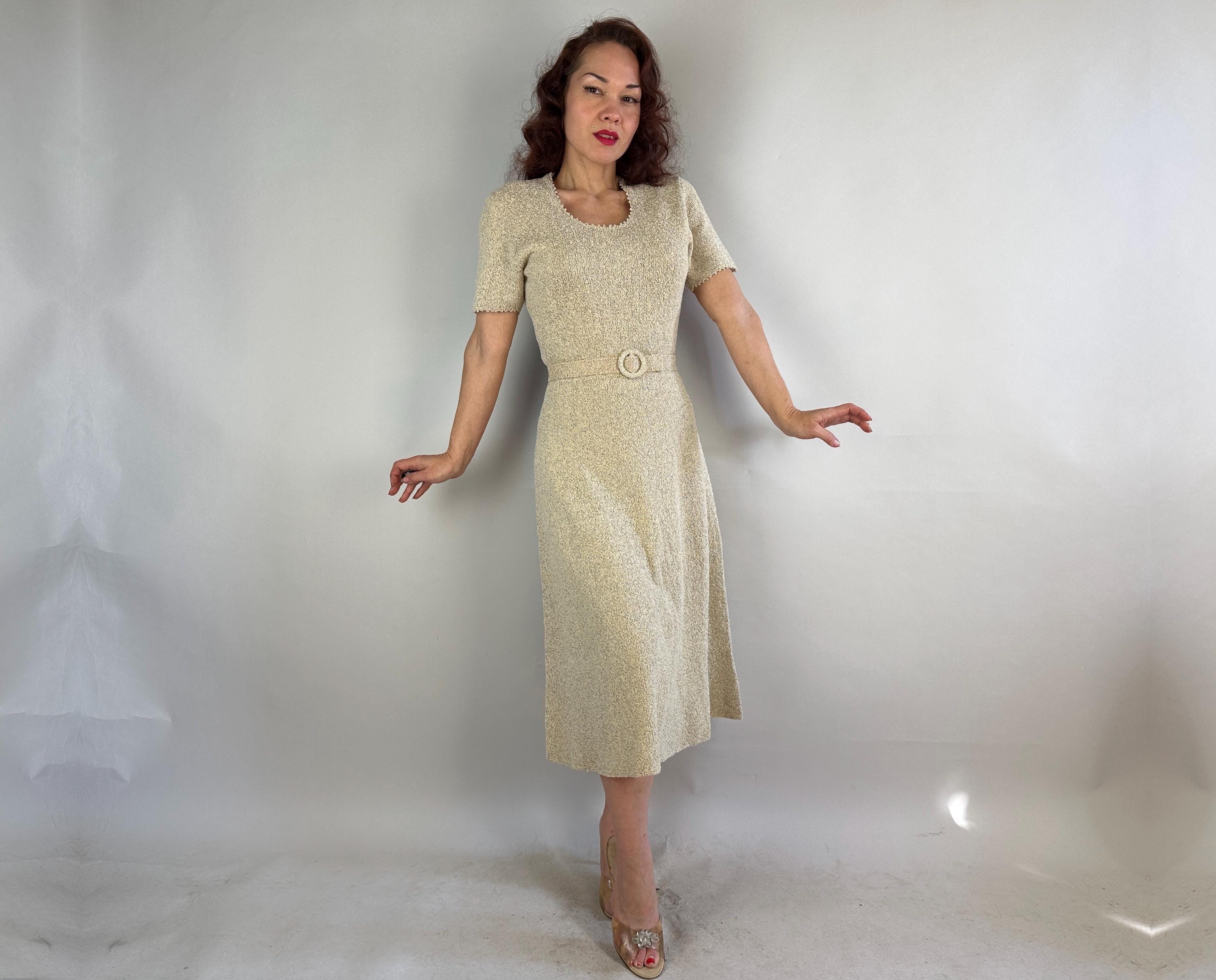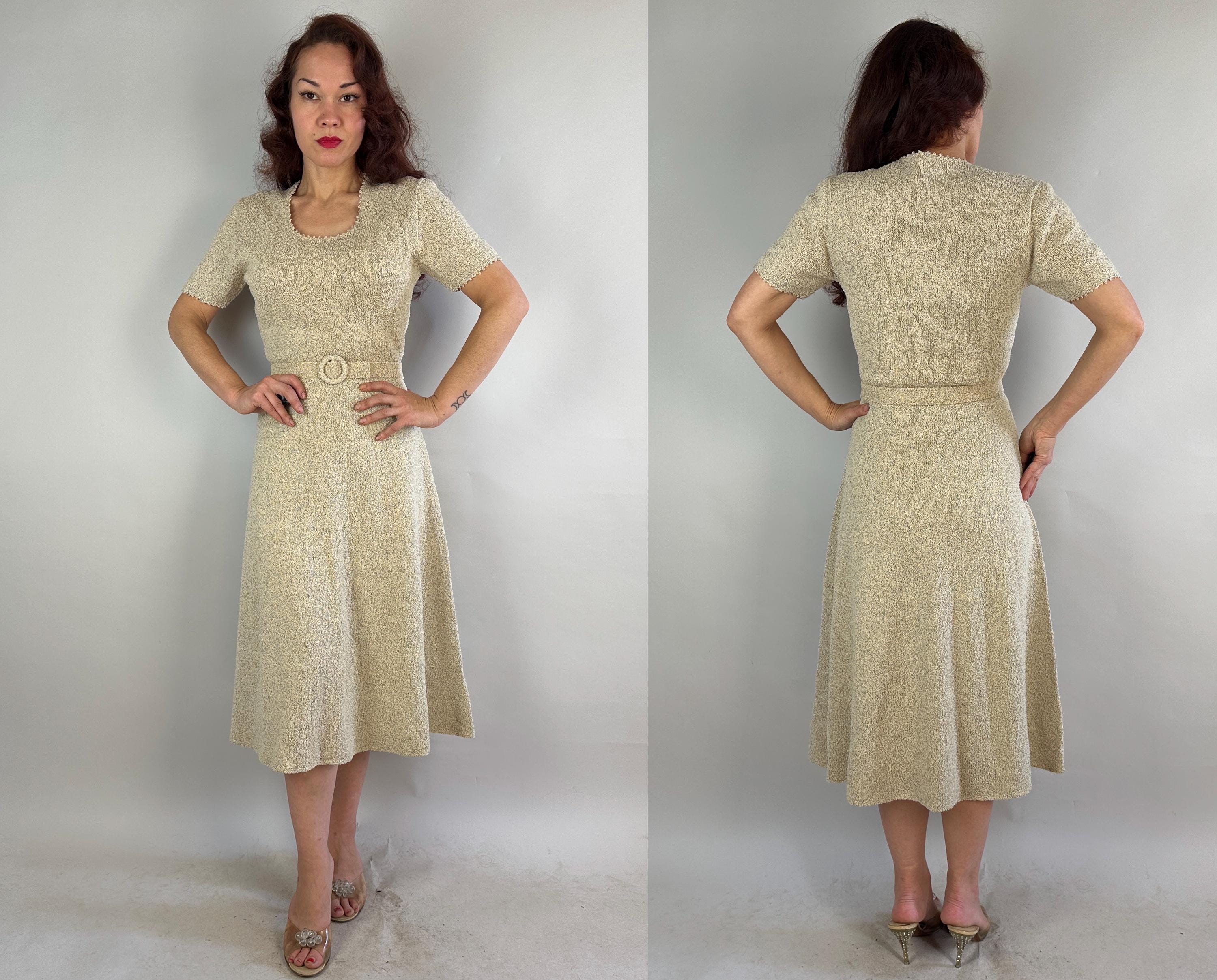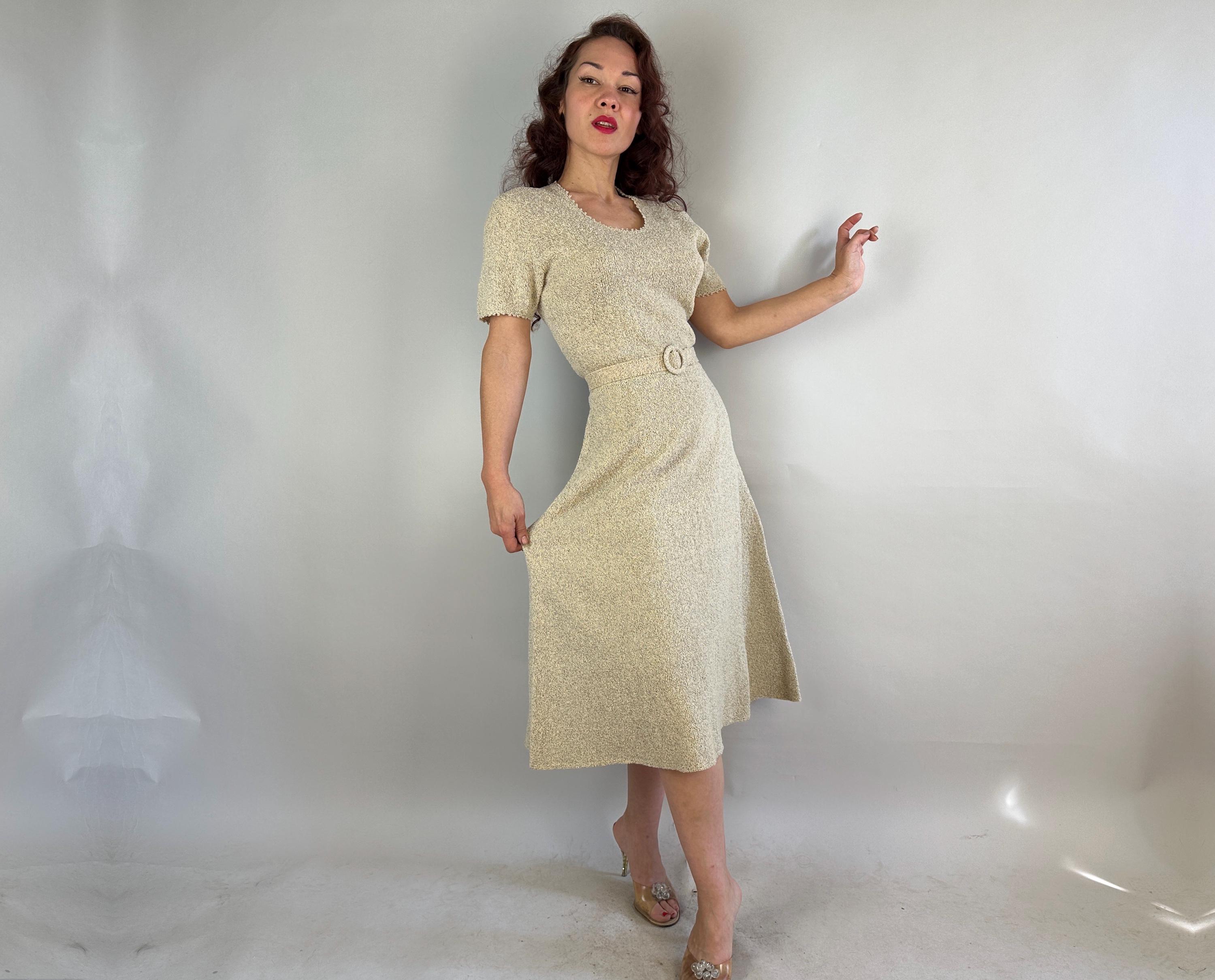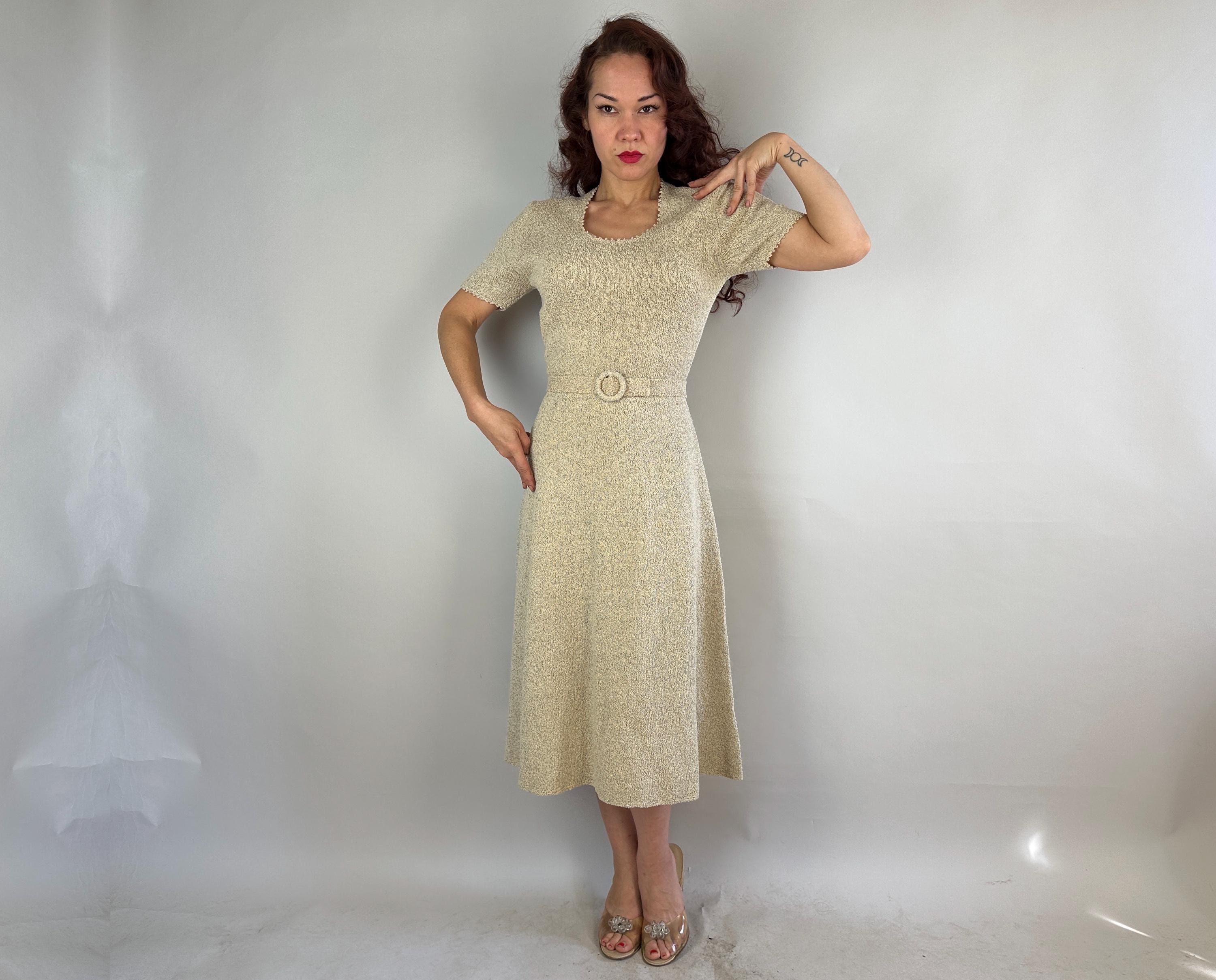Be a part of a winter wonderland by decorating yourself with this 1950s knit dress! Knit in dove white wool boucle and thoroughly flecked with gold and electric blue lurex, you'll dazzle amongst tinsel adorned trees. The curve hugging fit features a wide scoop neck and cuffs with picot edging, gentle A-line skirt, and matching belt. Full elastic in the waist. This dress is in great vintage condition with no stains, holes, or odors to note.