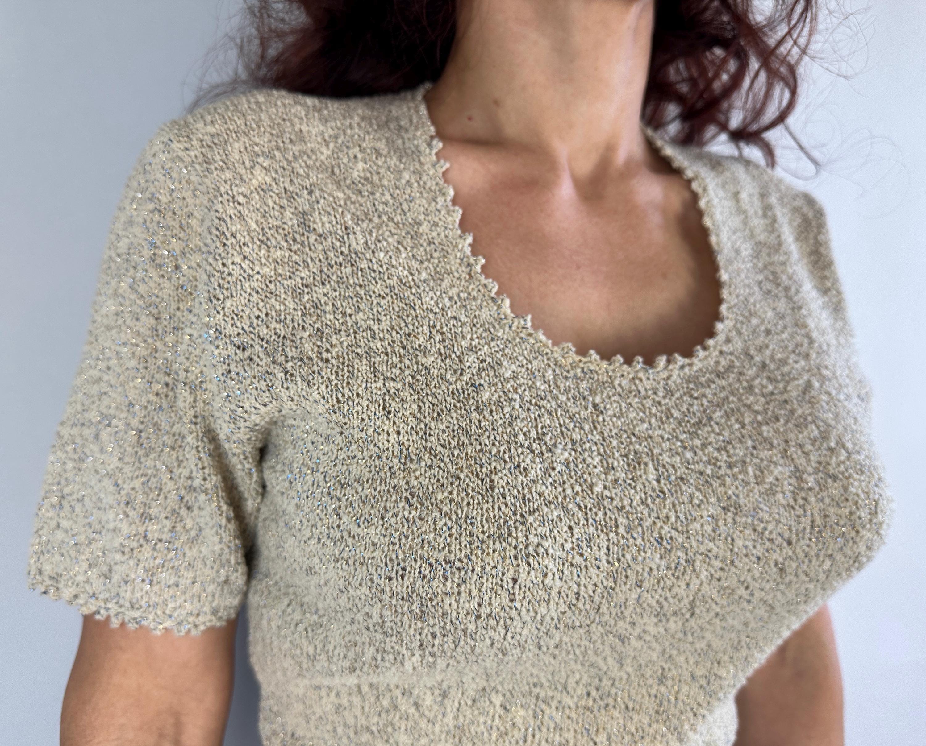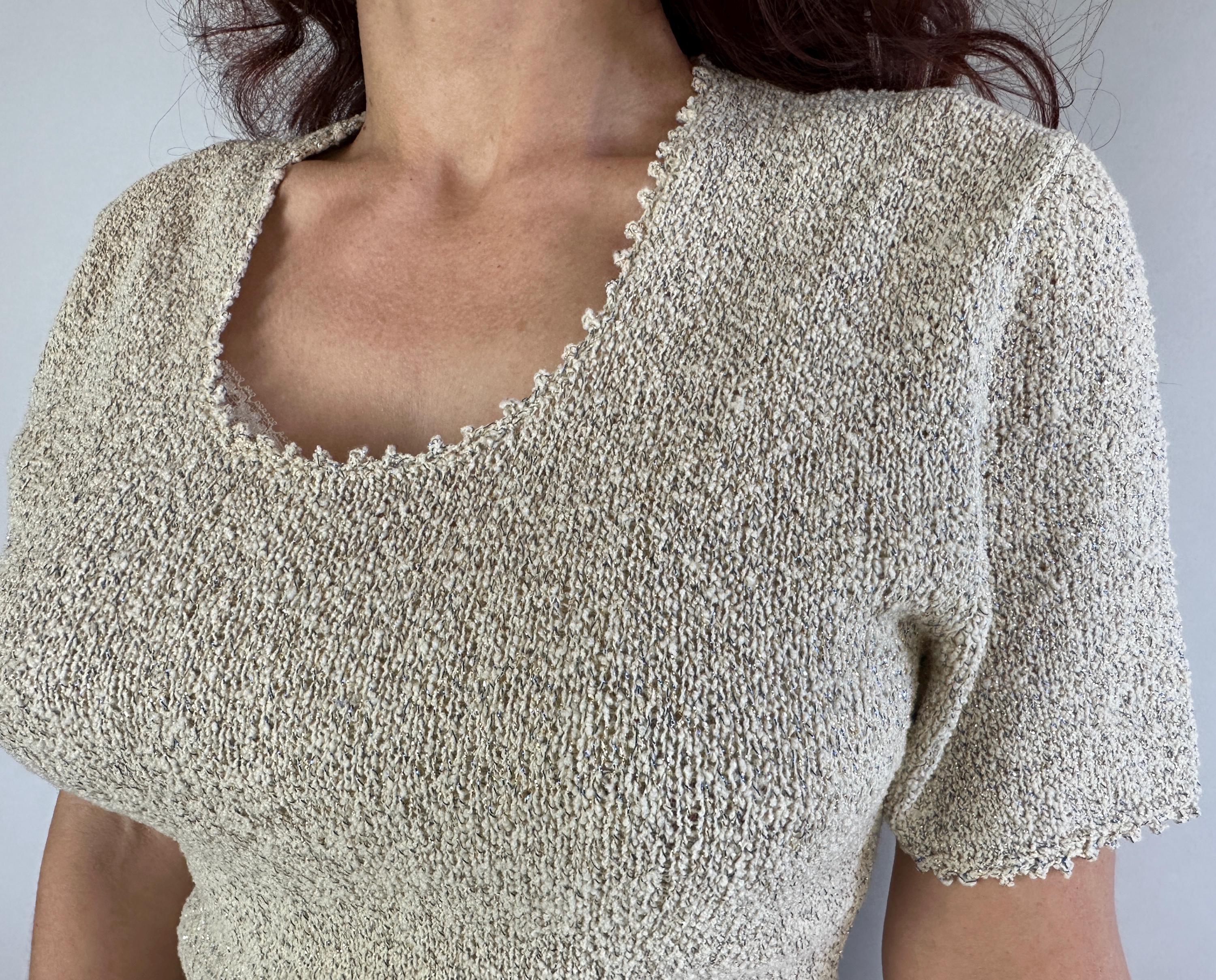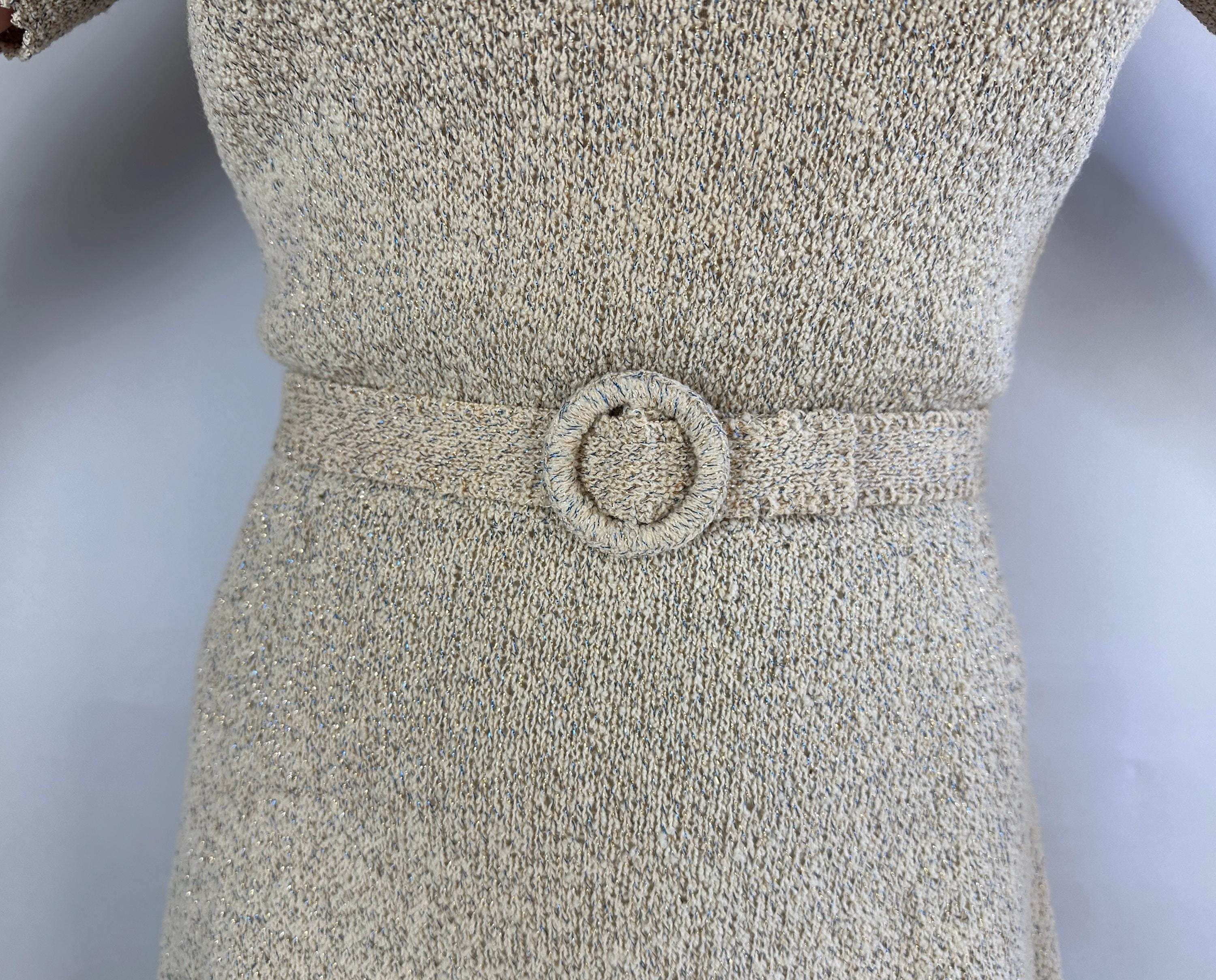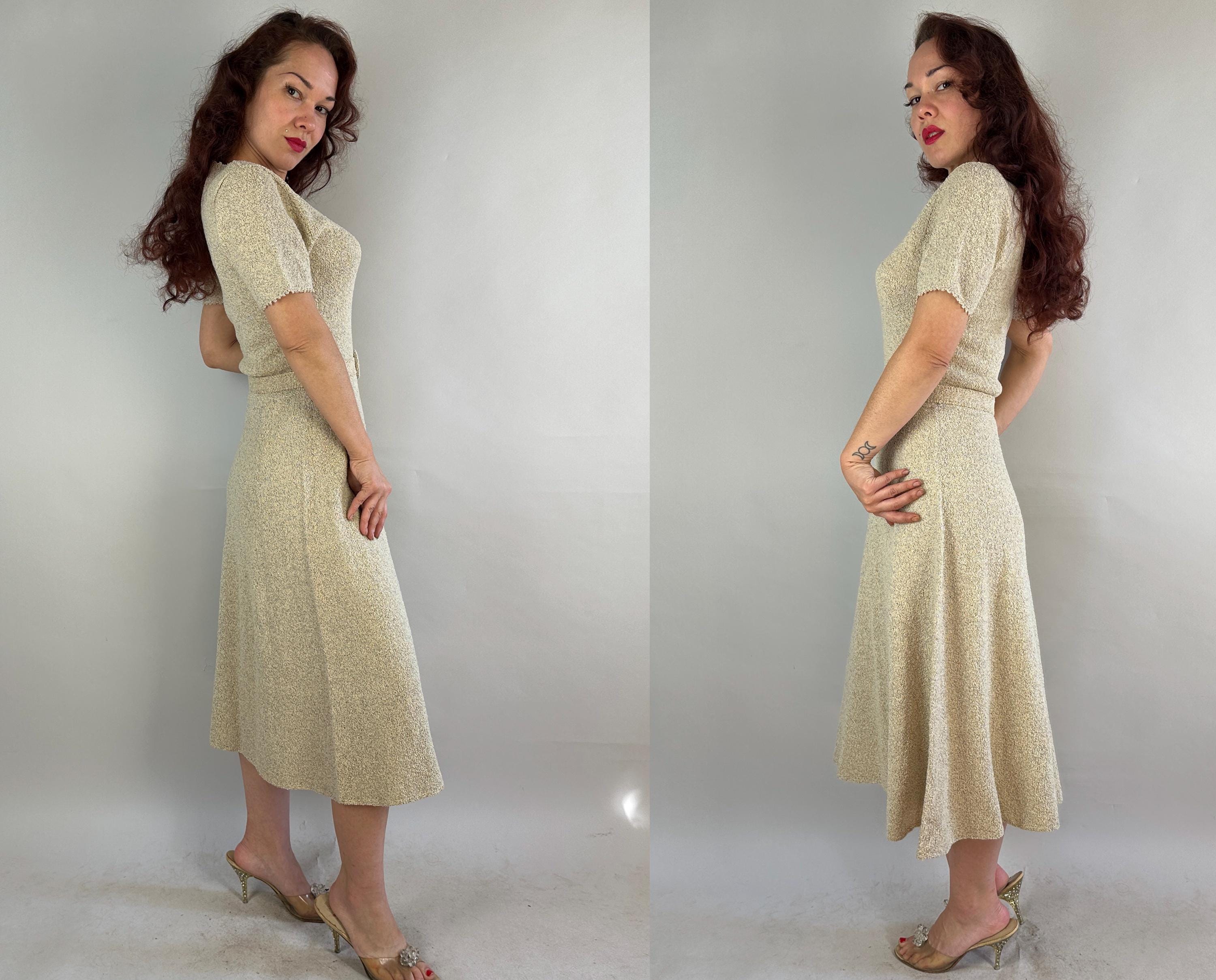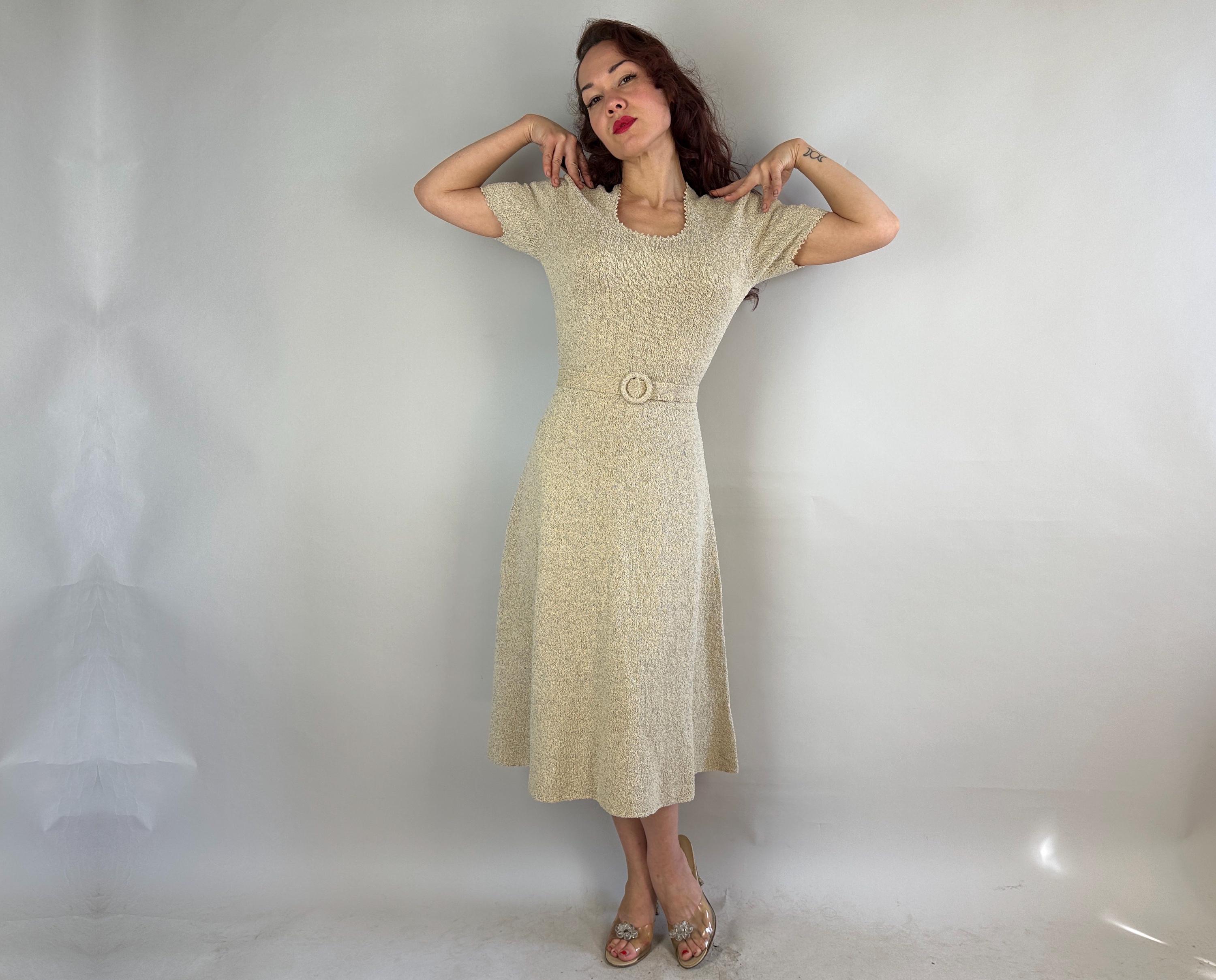 Be a part of a winter wonderland by decorating yourself with this 1950s knit dress! Knit in dove white wool boucle and thoroughly flecked with gold and electric blue lurex, you'll dazzle amongst tinsel adorned trees. The curve hugging fit features a wide scoop neck and cuffs with picot edging, gentle A-line skirt, and matching belt. Full elastic in the waist. This dress is in great vintage condition with no stains, holes, or odors to note.