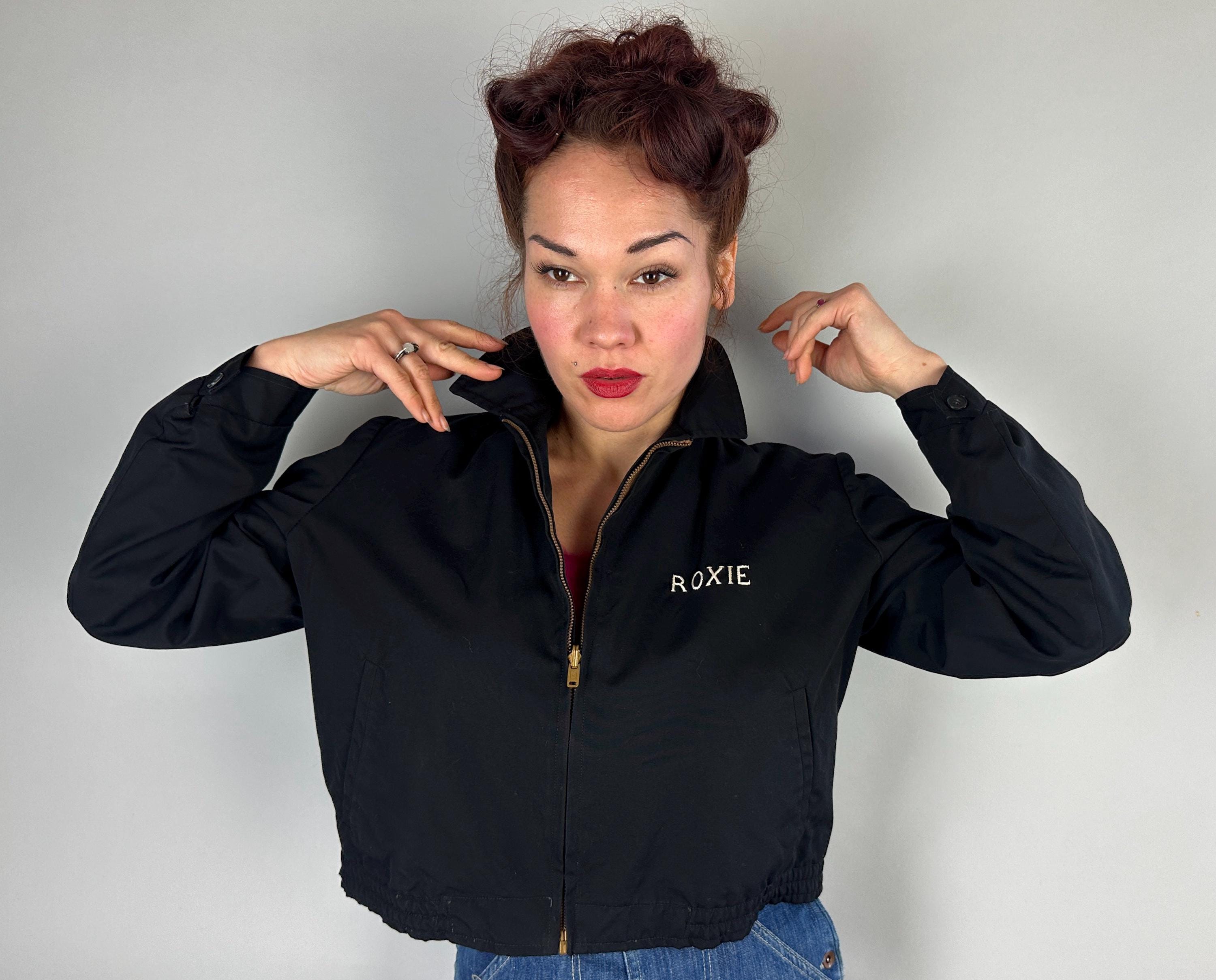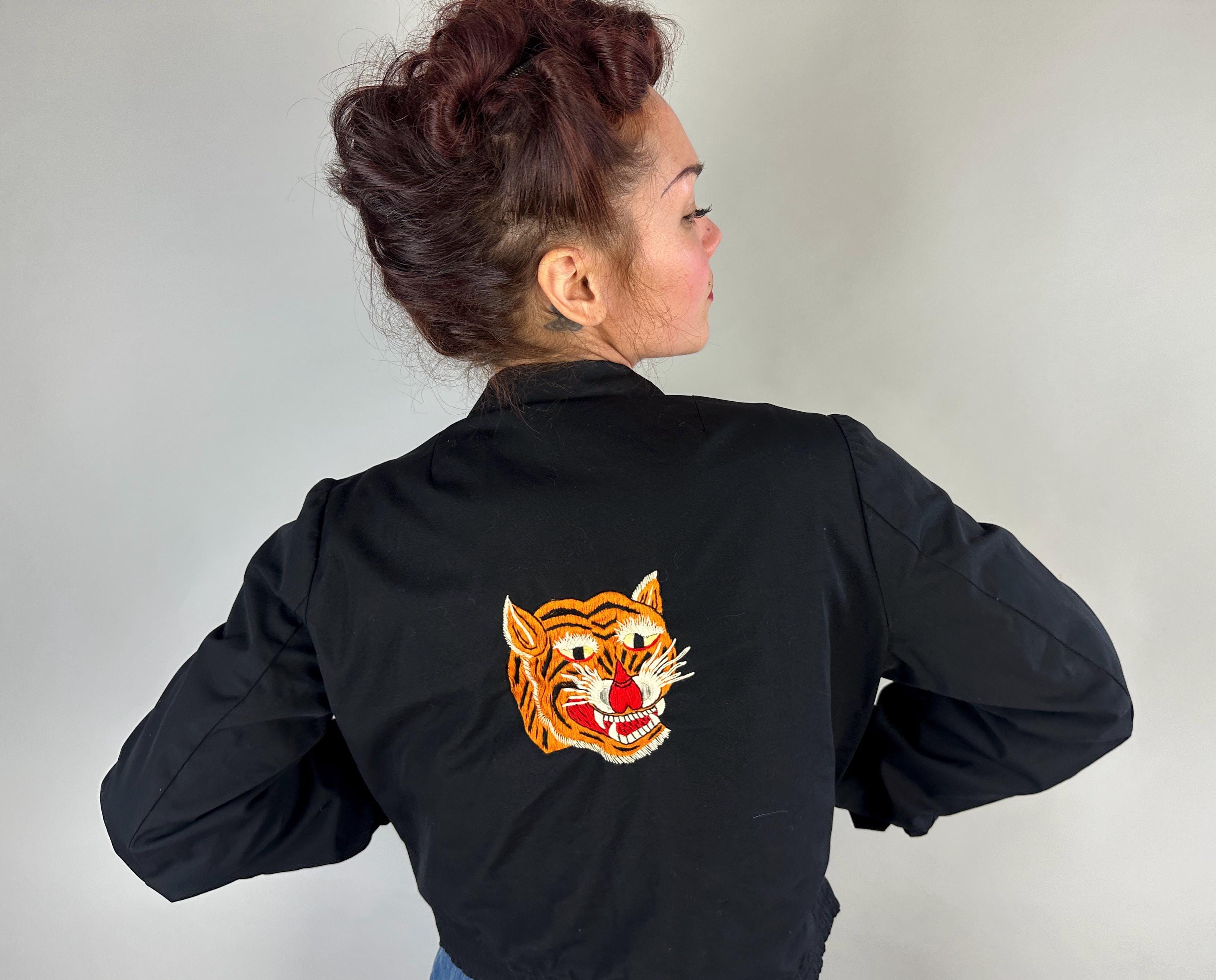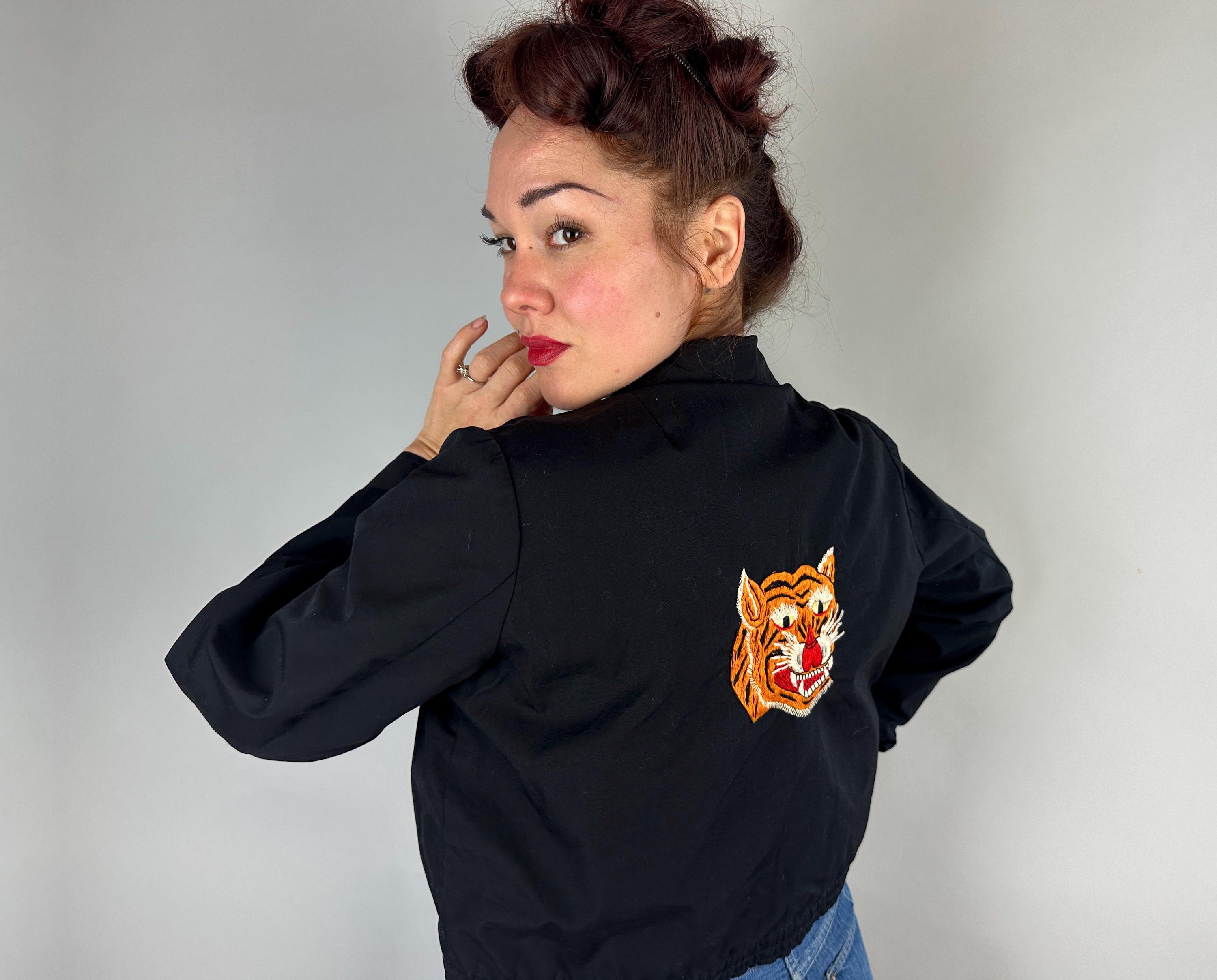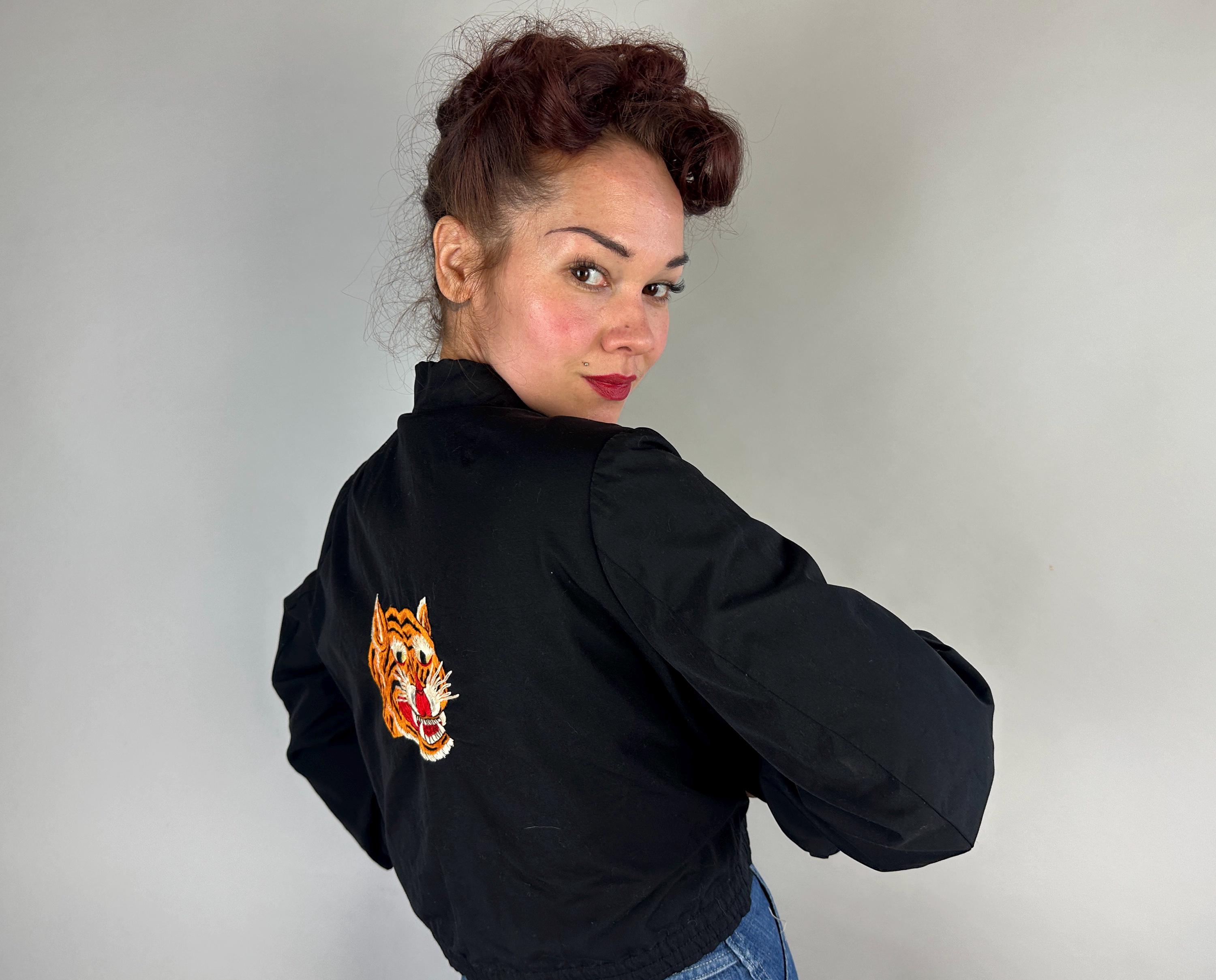 Have the eye of the tiger watch your back with this 1950s jacket! This windbreaker jacket in a weather-proofed cotton of black makes a statement with stunning embroidery of a large tiger head in realism colours. Named "Roxie" on the front in white embroidery, this bad girl piece has pedigree! It fastens with a heavy duty brass zip along with buttons on the cuffs and the cropped waist has elastic gathers. Slanted hand pockets are lined in lipstick red while the rest of the jacket is fully lined with black acetate. This jacket is in great vintage condition, with no holes, stains, or odors to note.