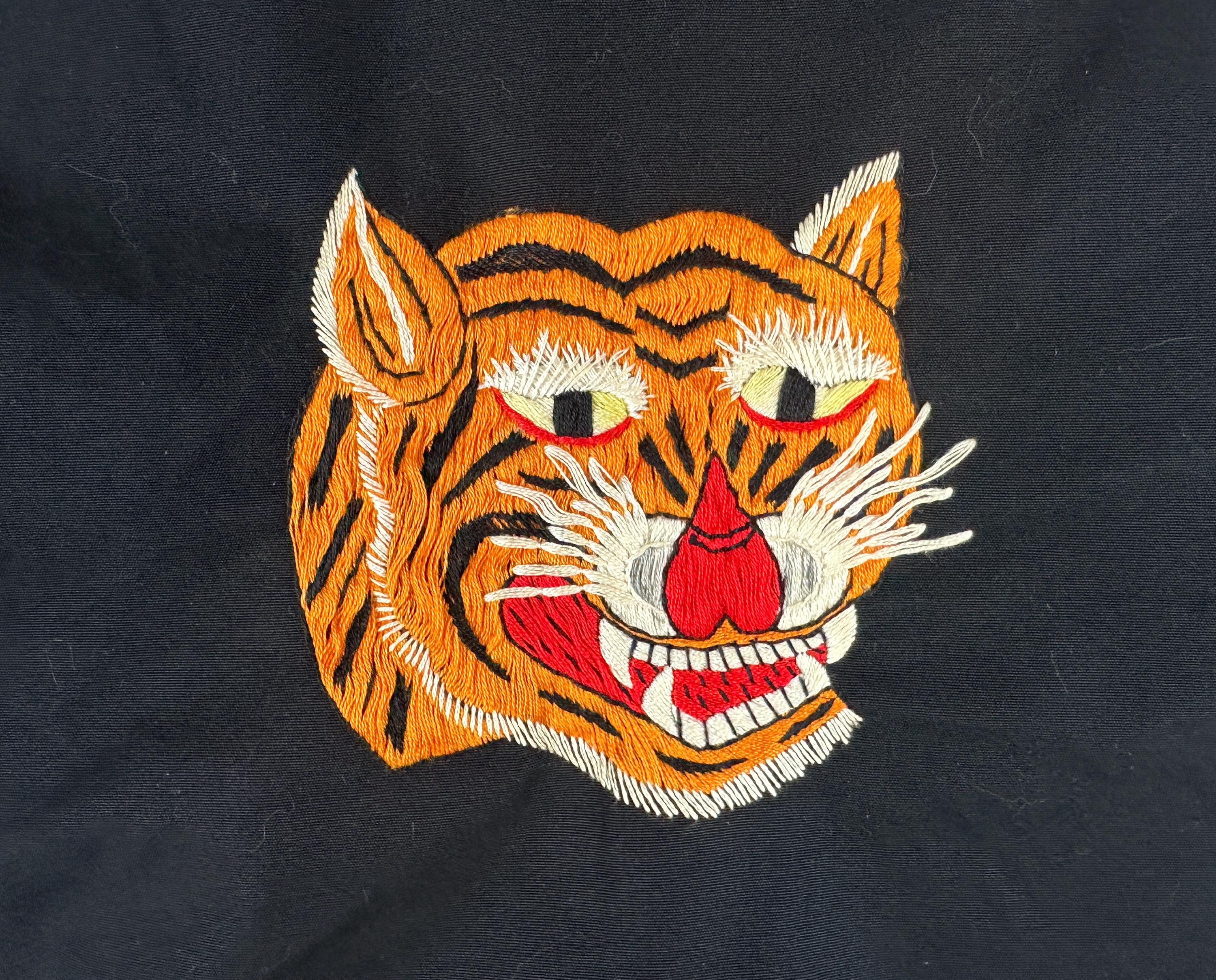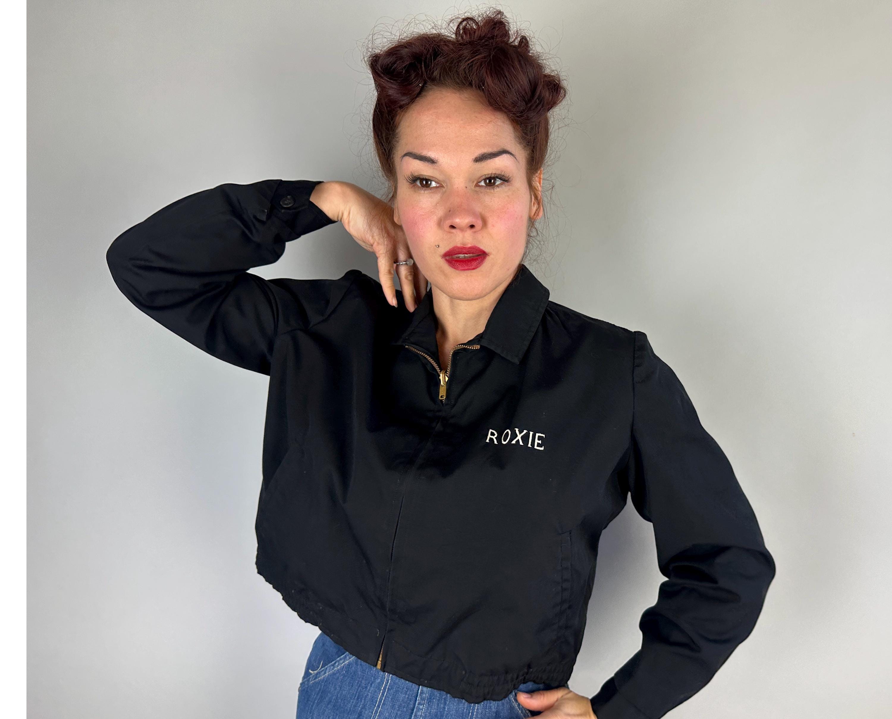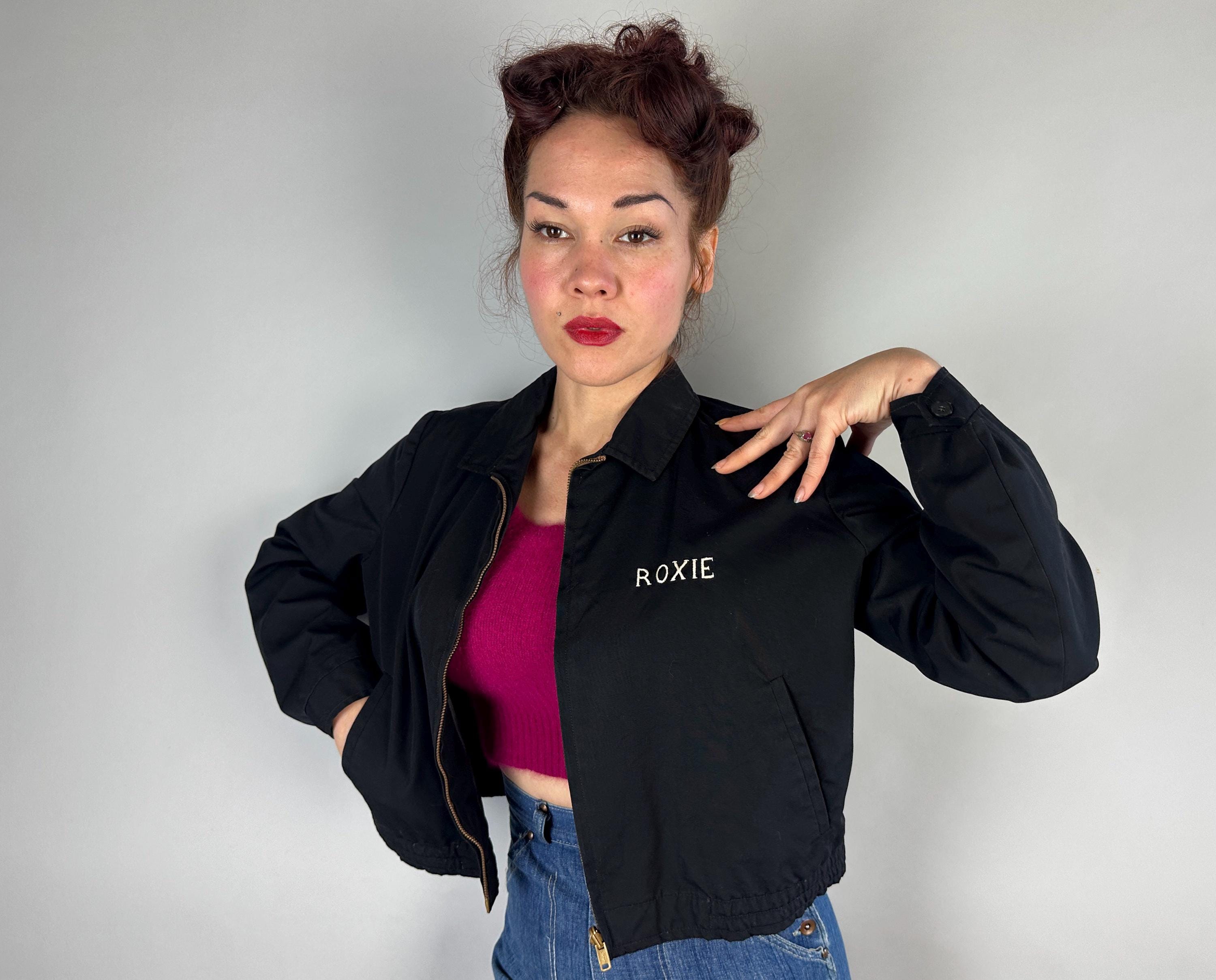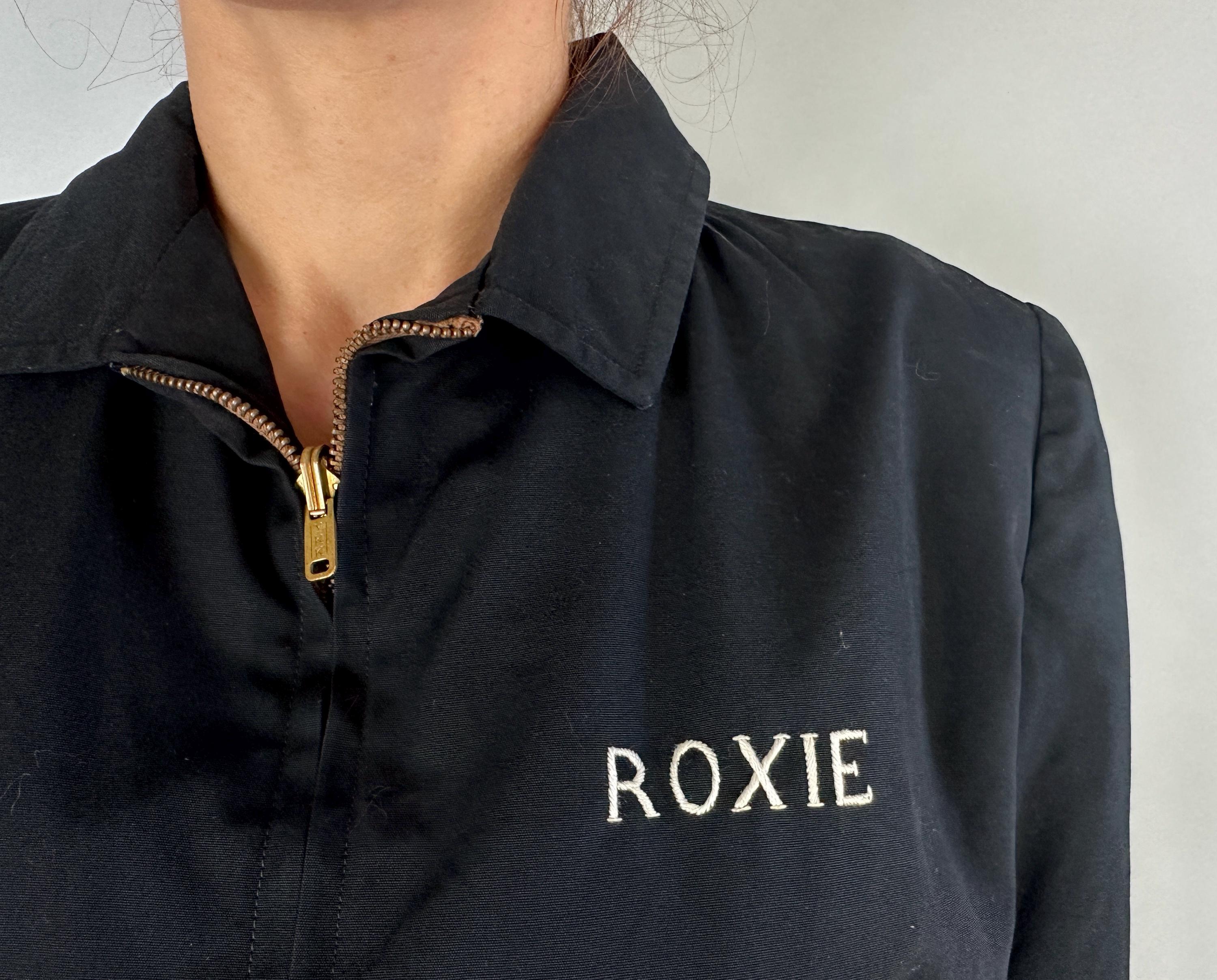 Have the eye of the tiger watch your back with this 1950s jacket! This windbreaker jacket in a weather-proofed cotton of black makes a statement with stunning embroidery of a large tiger head in realism colours. Named "Roxie" on the front in white embroidery, this bad girl piece has pedigree! It fastens with a heavy duty brass zip along with buttons on the cuffs and the cropped waist has elastic gathers. Slanted hand pockets are lined in lipstick red while the rest of the jacket is fully lined with black acetate. This jacket is in great vintage condition, with no holes, stains, or odors to note.