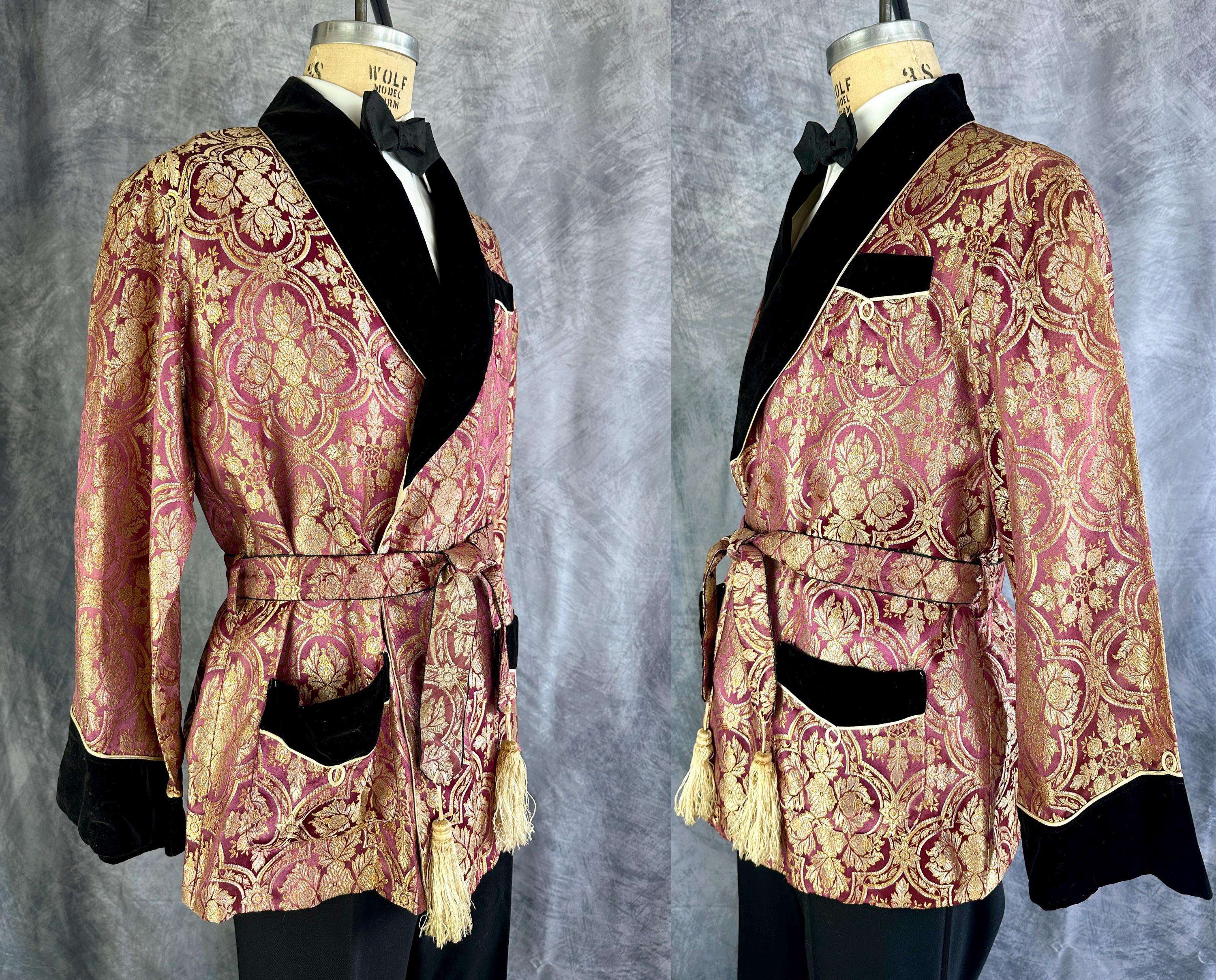 Man your manor and look utterly regal while doing it in this 1940s smoking jacket! Silk brocade looks absolutely stunning in shimmering mauve, silver, and yellow gold, all flashing in harmony with changes in light. Black velvet trimmed with white silk cord makes up the shawl lapel and trims all three patch pockets and cuffs. Self fabric belt is trimmed with white silk tassels. Fully lined in silk and light padding in the shoulders. By "Mount Antelope". This smoking jacket is in great vintage condition, a little discoloration to the tassels, no other stains, holes, nor odors to note.