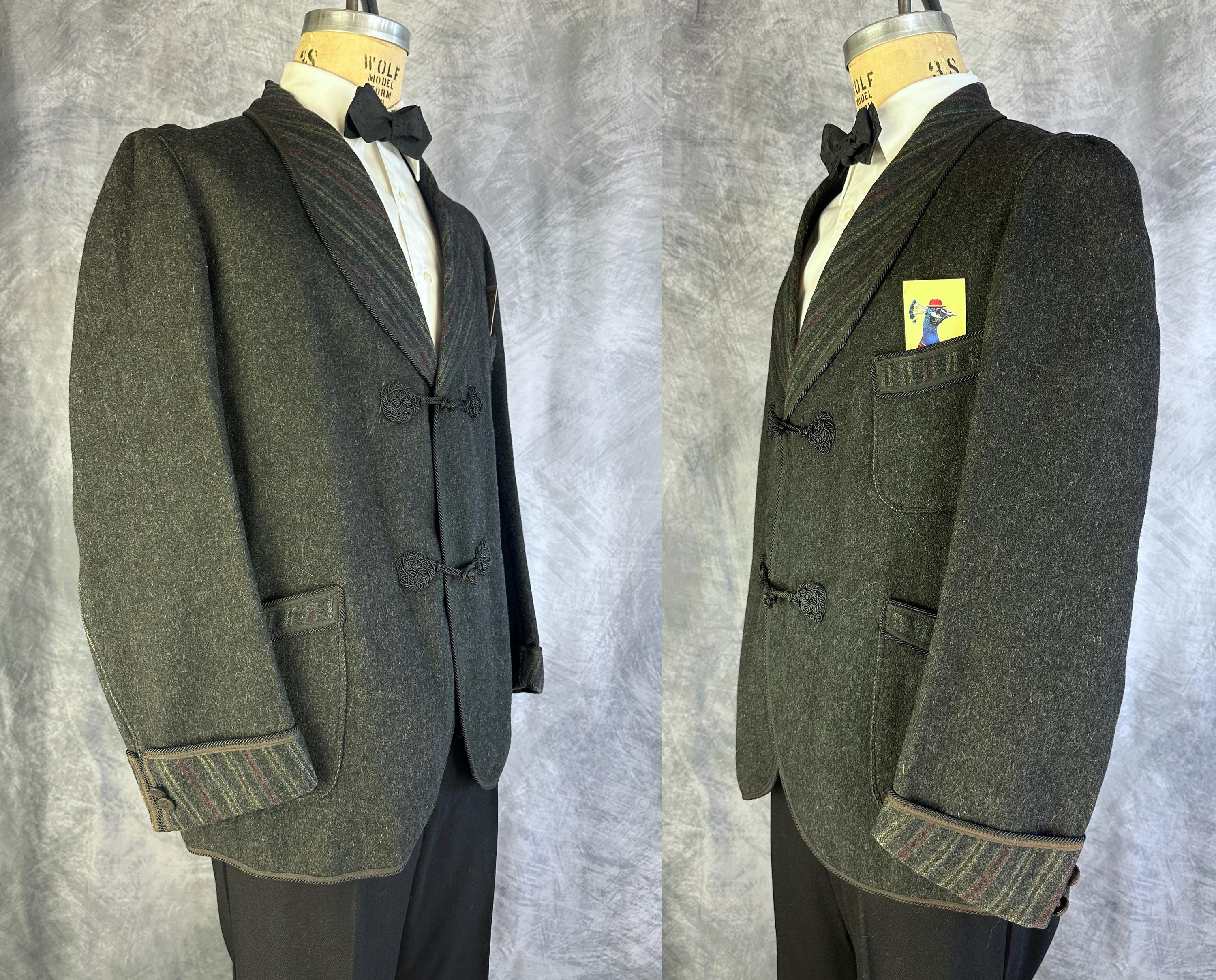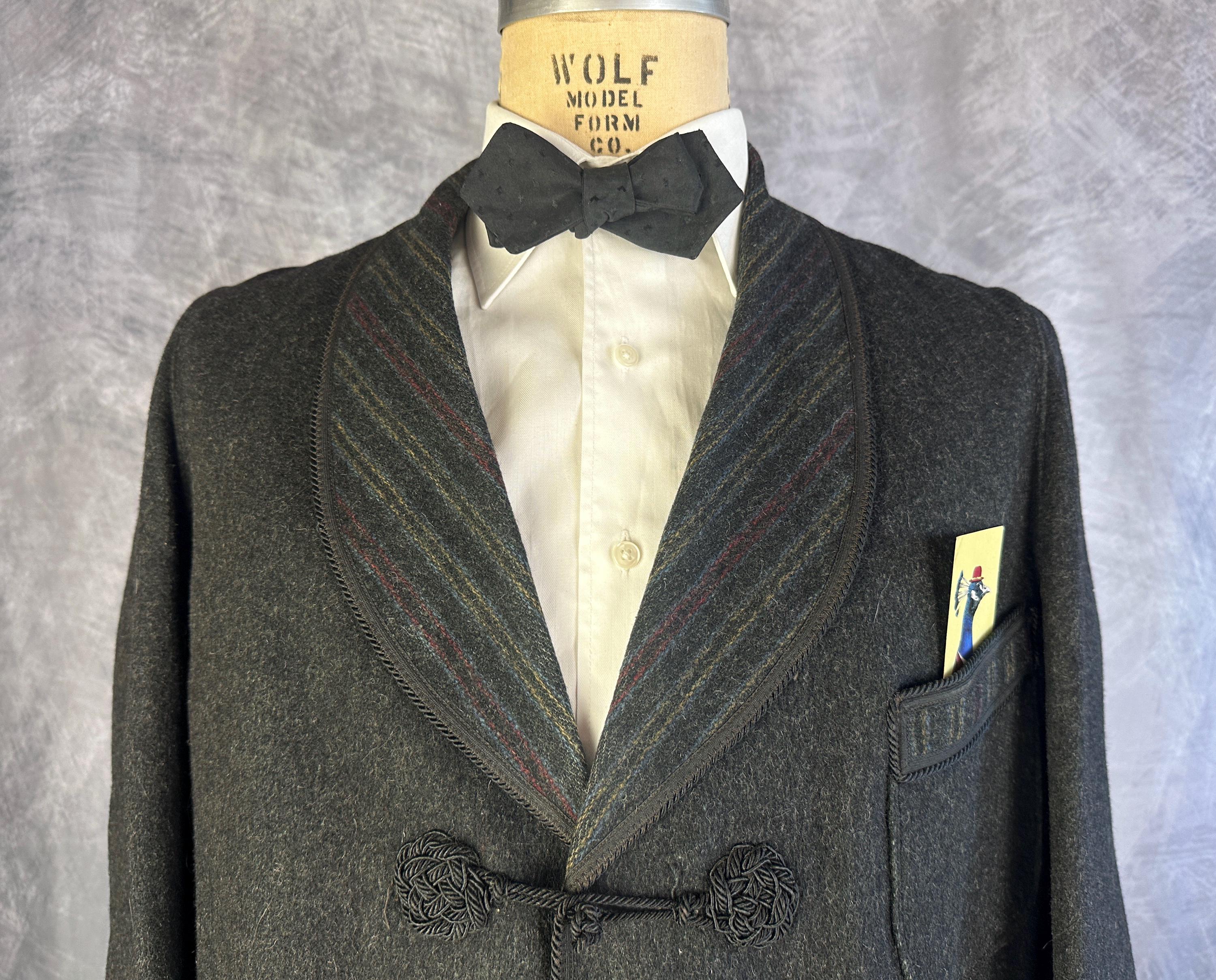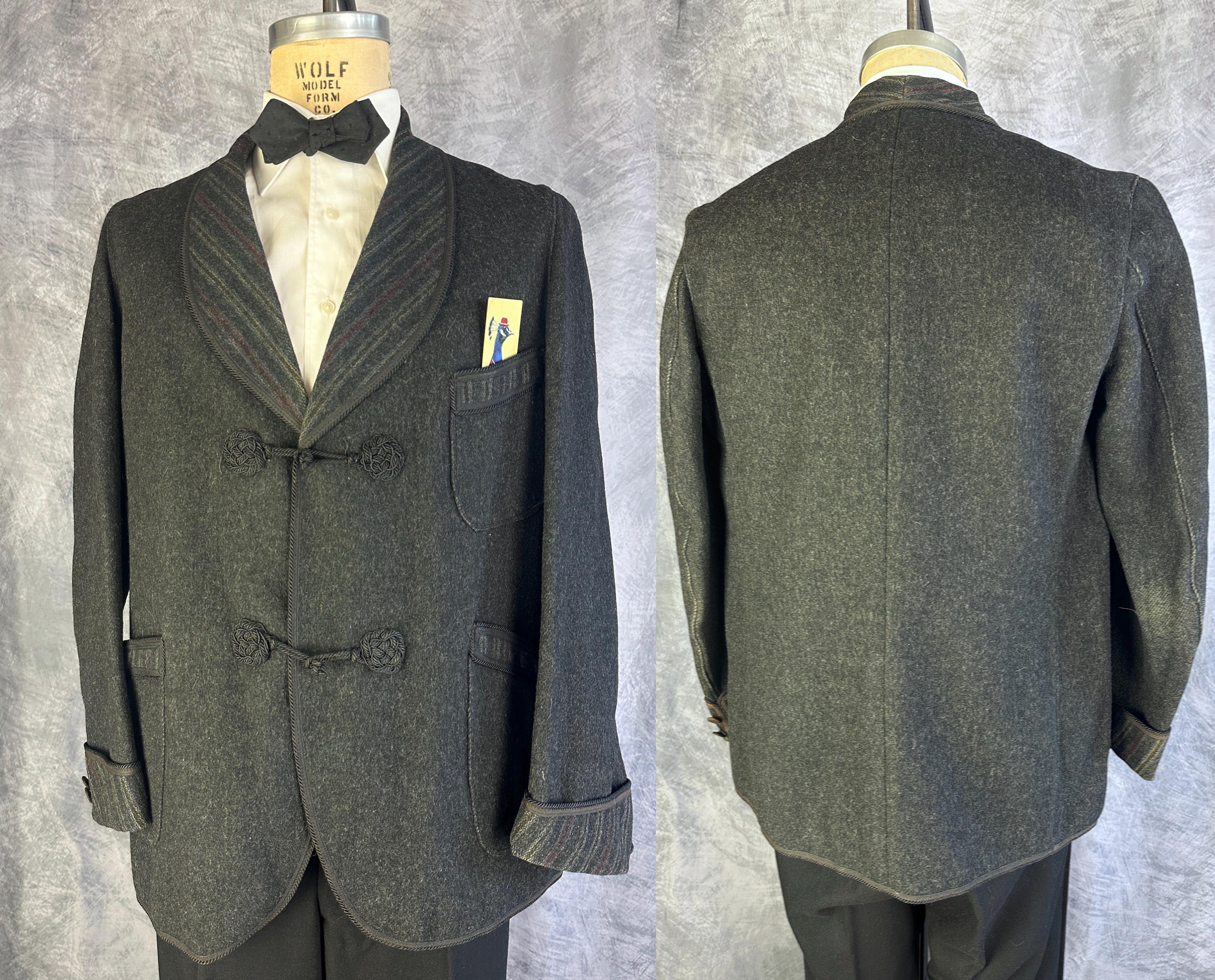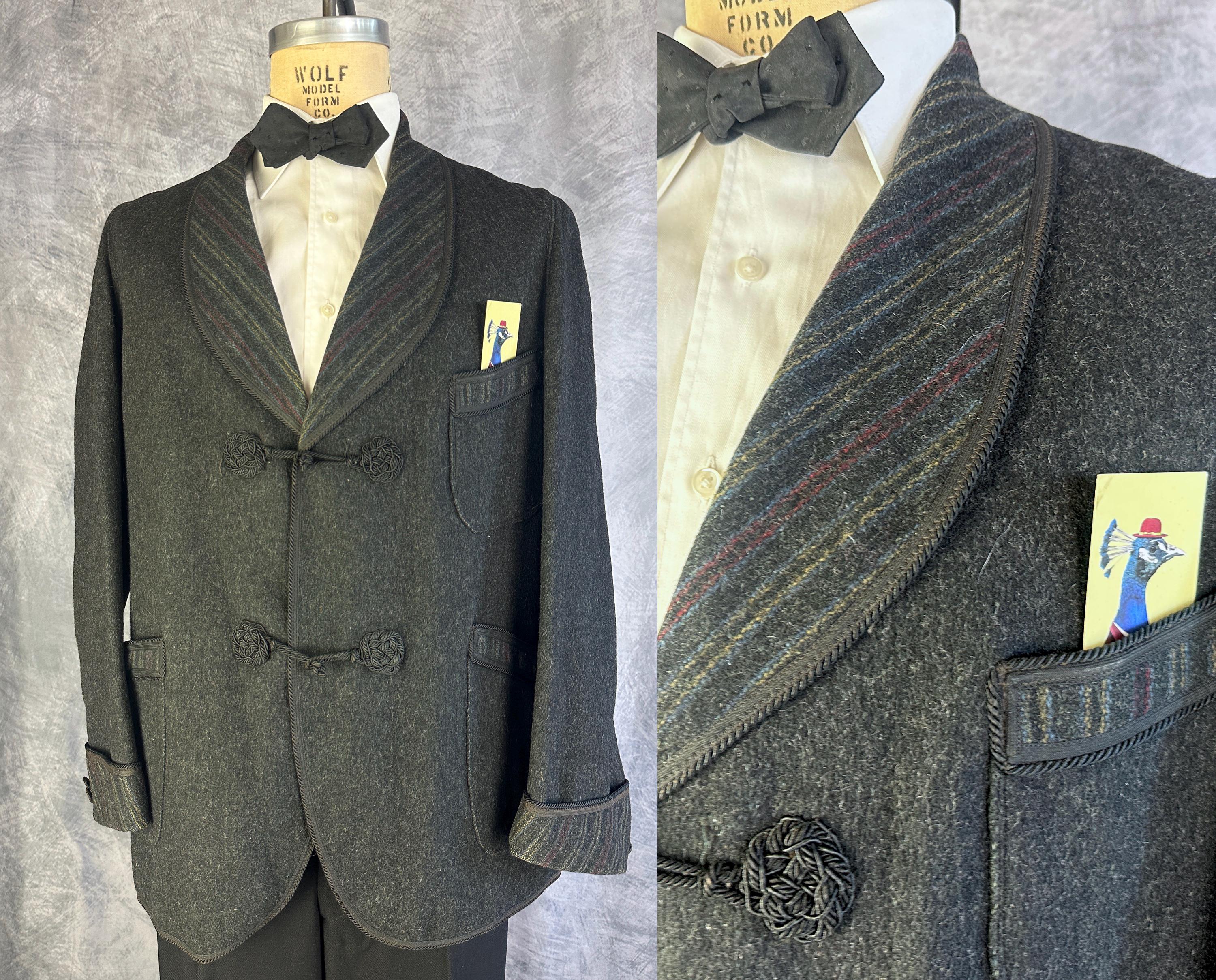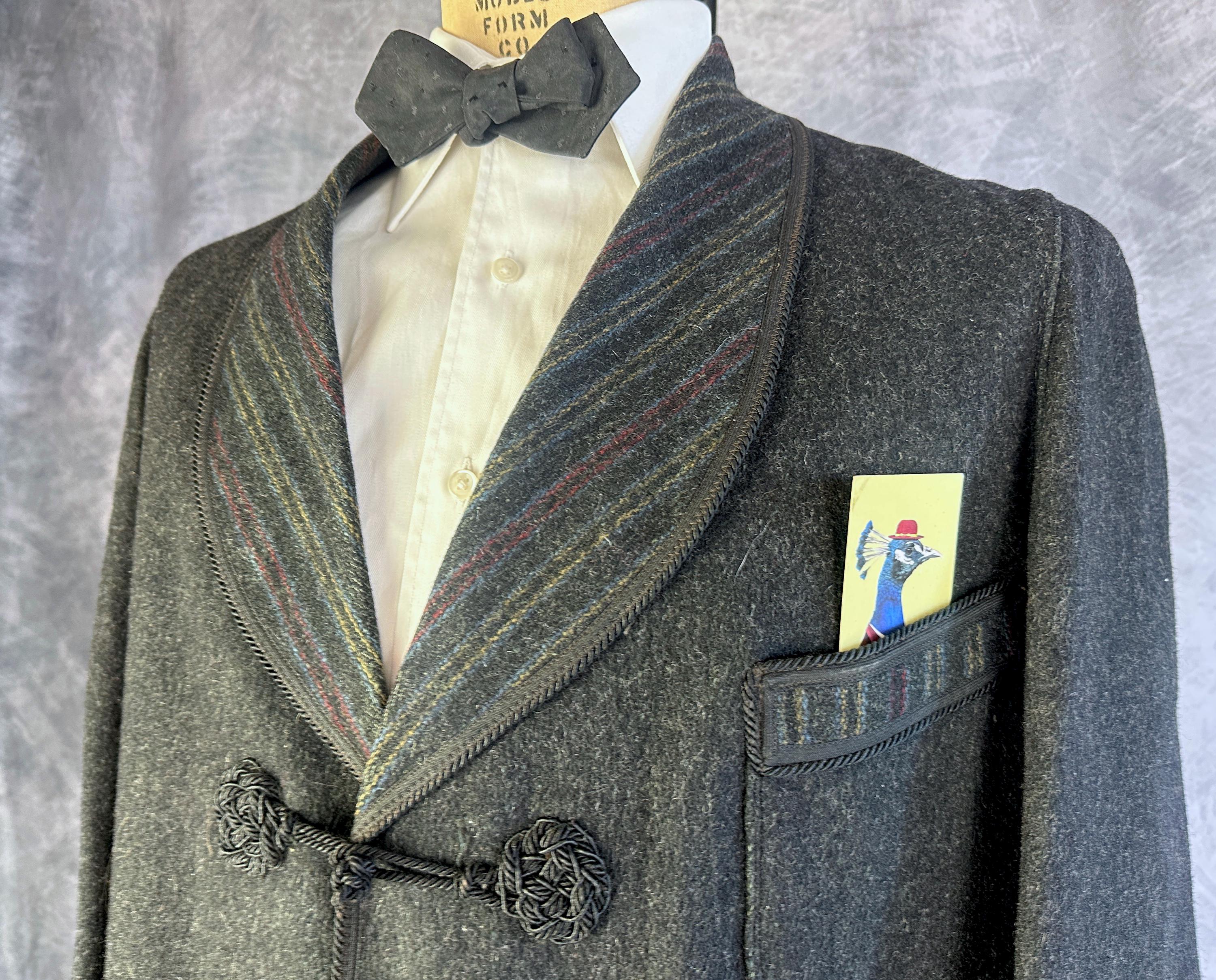 End your evening in dapper style with this 1920s smoking jacket! The charcoal grey wool has a lightly raised nap adding touches of smoke grey flecks and muted stripes in ochre, crimson, and slate blue accent the shawl lapel, cuffs, and the trim of the three patch pockets. Trimmed in black silk cord and band all around the edges and fastening with two silk frog toggles. Unlined but the striped underside makes a lovely touch. This smoking jacket is in great vintage condition, small very subtle mend on one pocket that got stitched through to the underside of the jacket but pocket is still useable. No stains, holes nor odors to note.