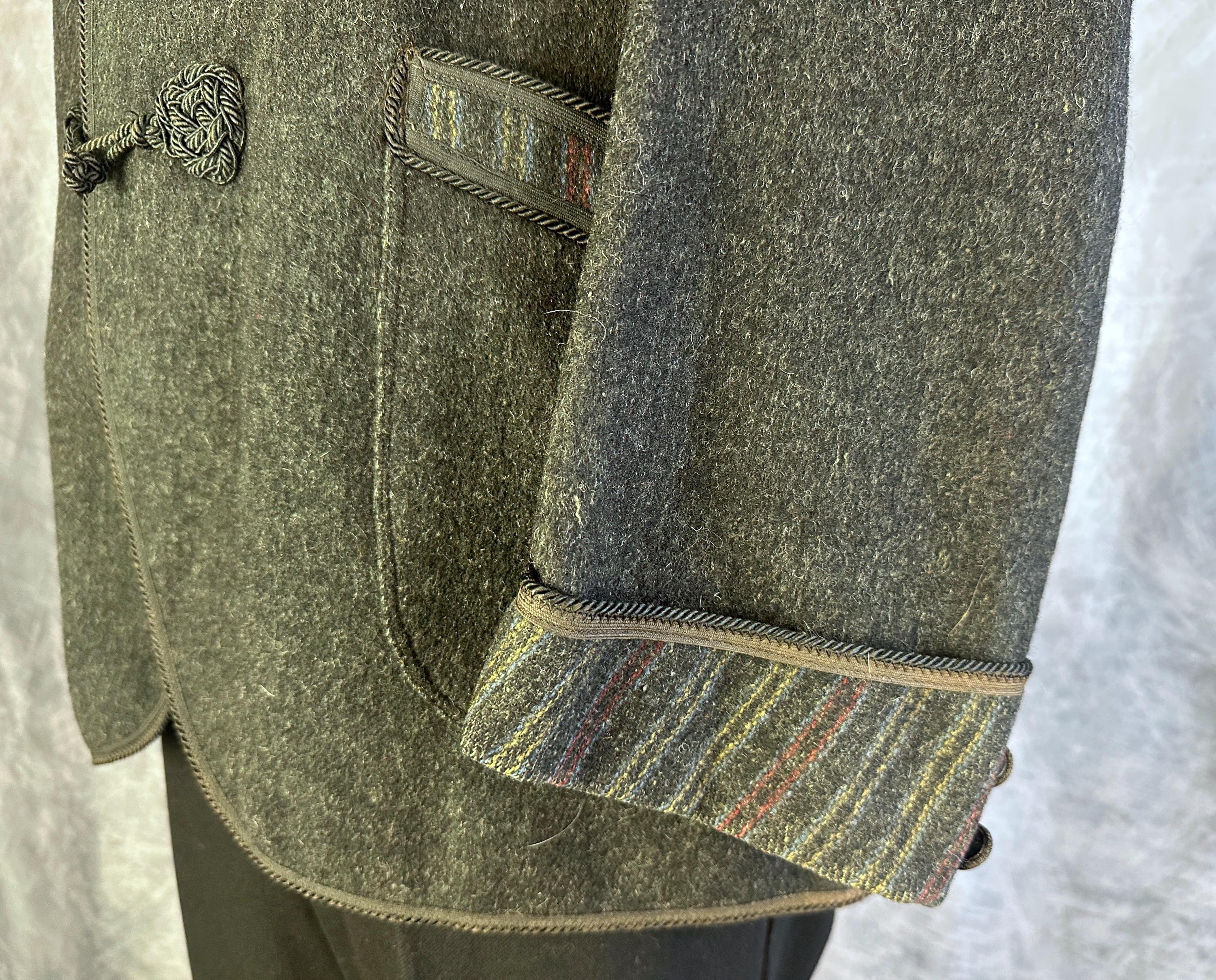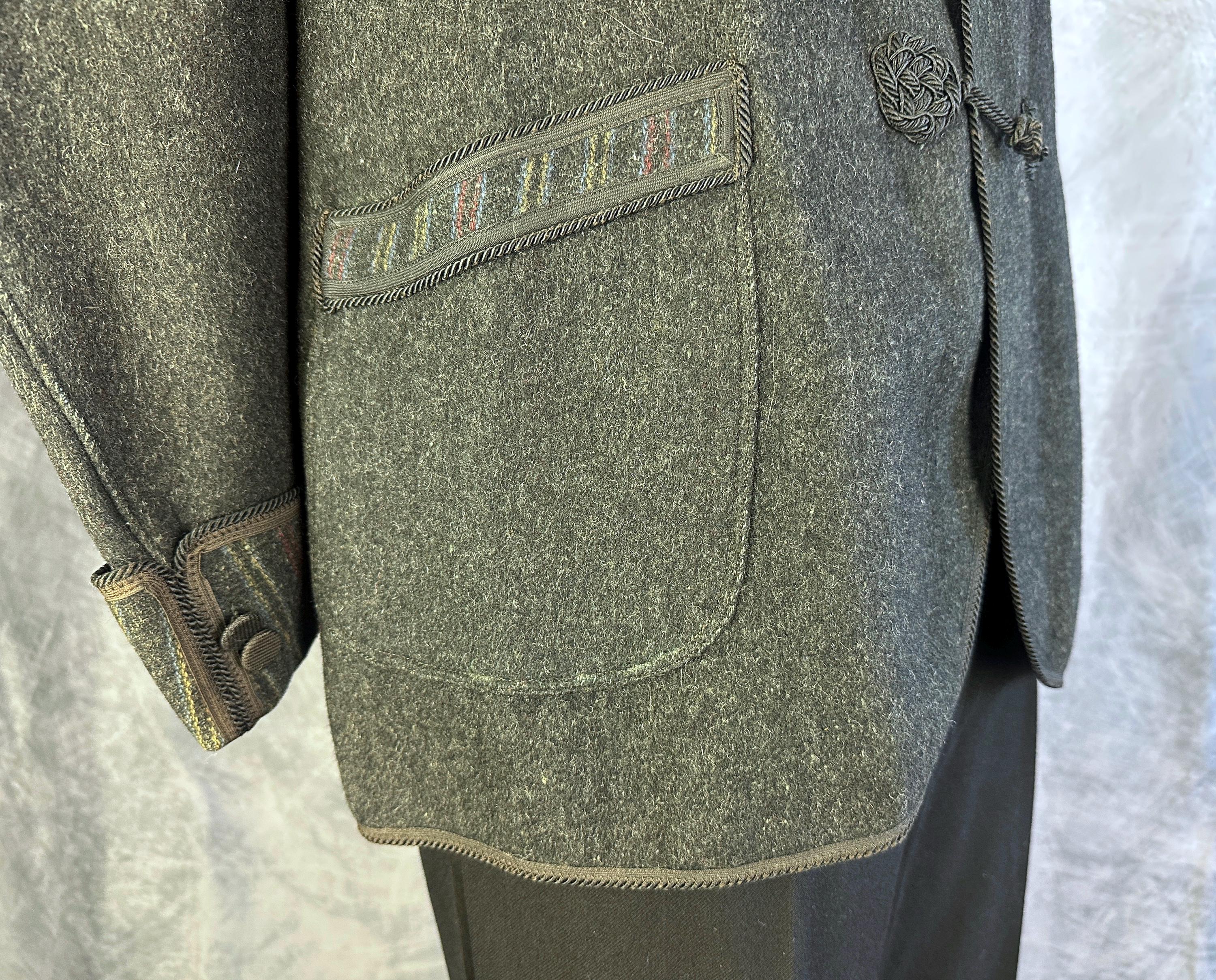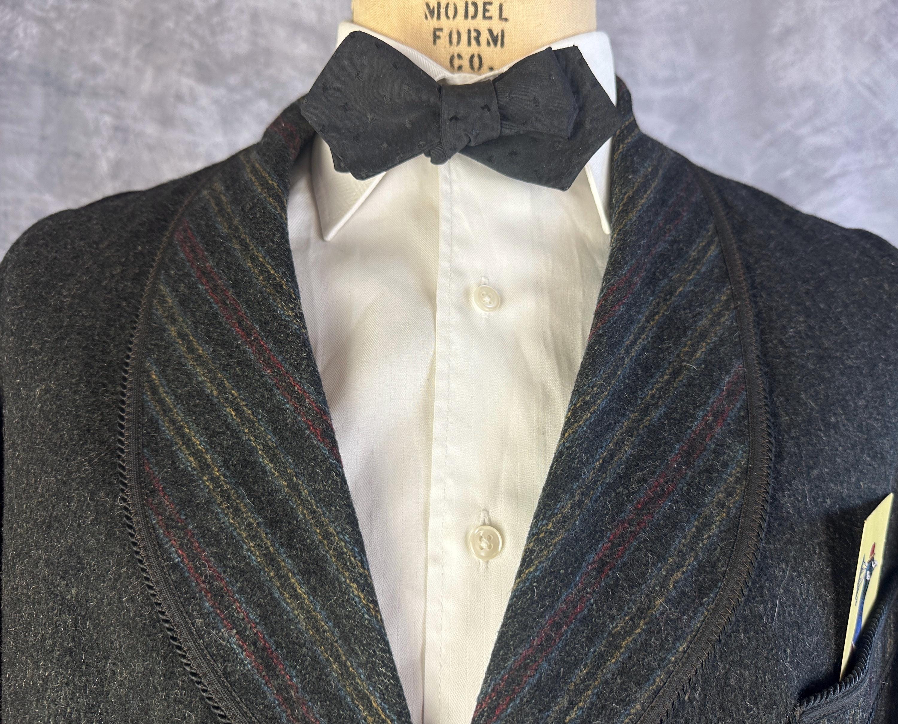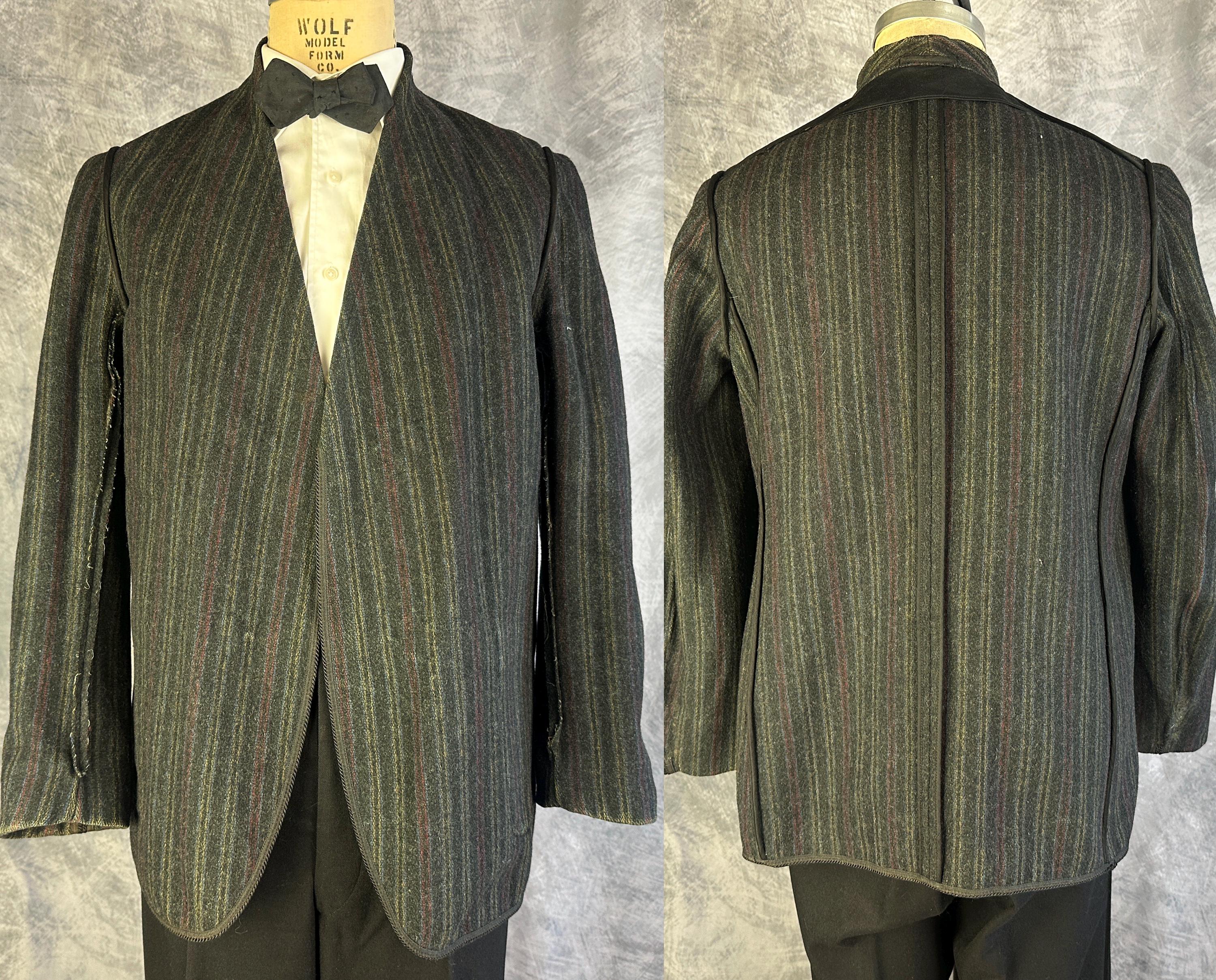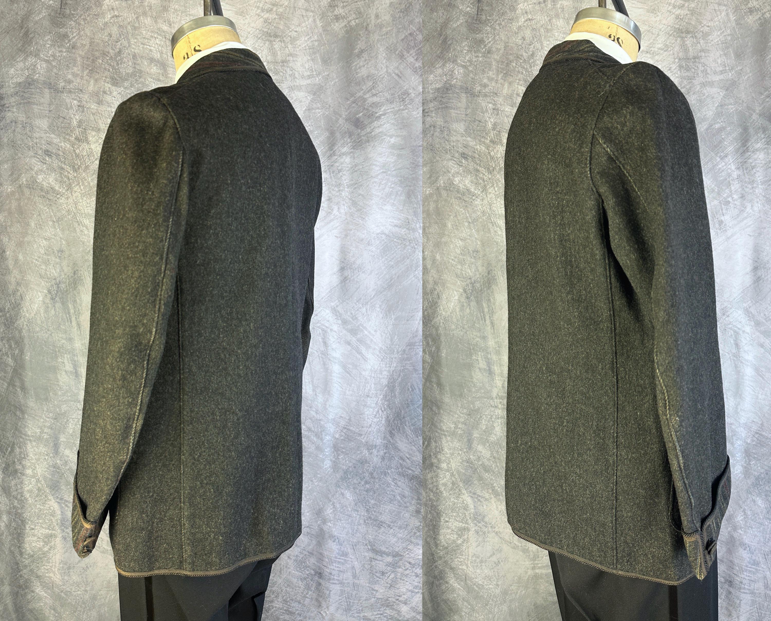 End your evening in dapper style with this 1920s smoking jacket! The charcoal grey wool has a lightly raised nap adding touches of smoke grey flecks and muted stripes in ochre, crimson, and slate blue accent the shawl lapel, cuffs, and the trim of the three patch pockets. Trimmed in black silk cord and band all around the edges and fastening with two silk frog toggles. Unlined but the striped underside makes a lovely touch. This smoking jacket is in great vintage condition, small very subtle mend on one pocket that got stitched through to the underside of the jacket but pocket is still useable. No stains, holes nor odors to note.