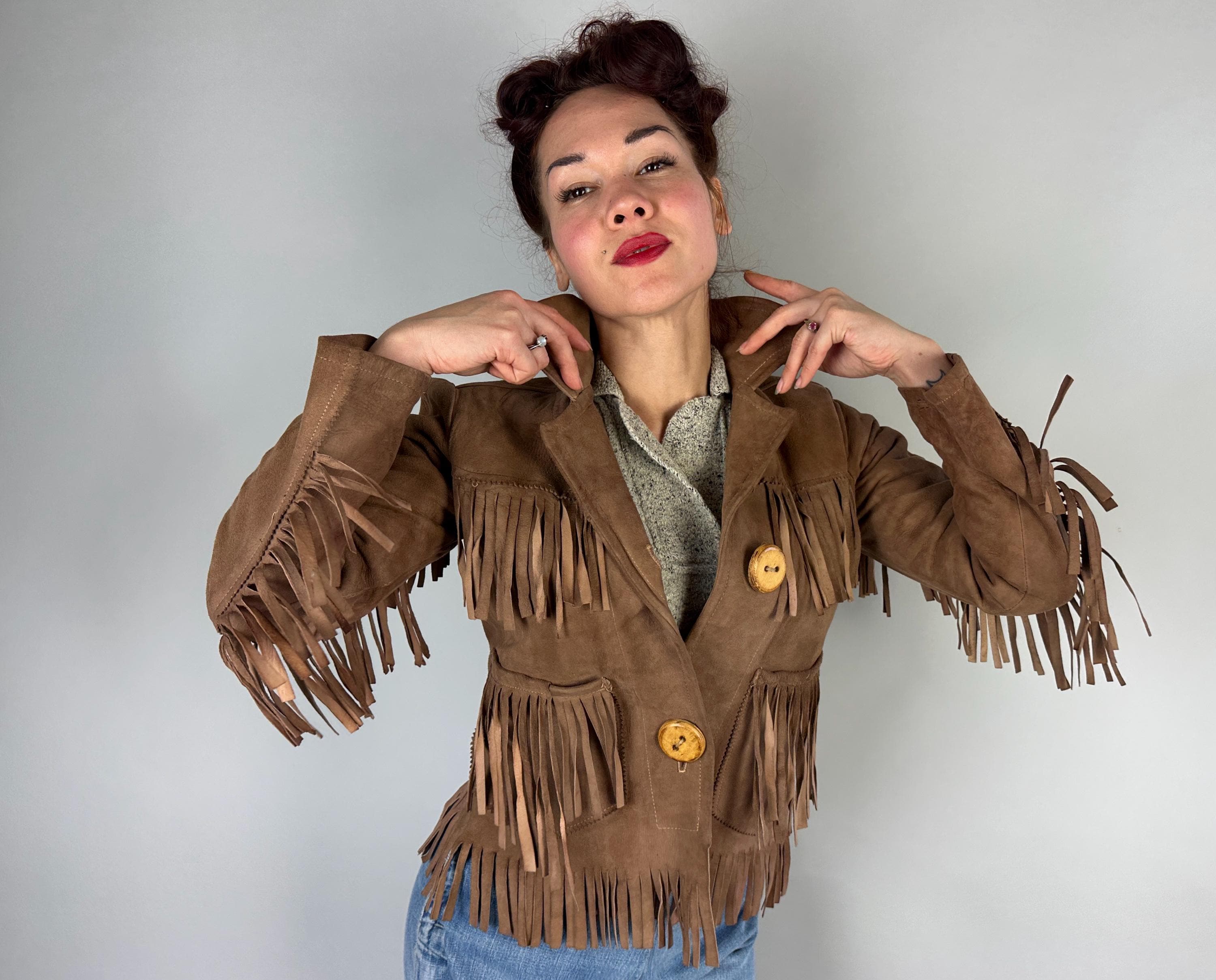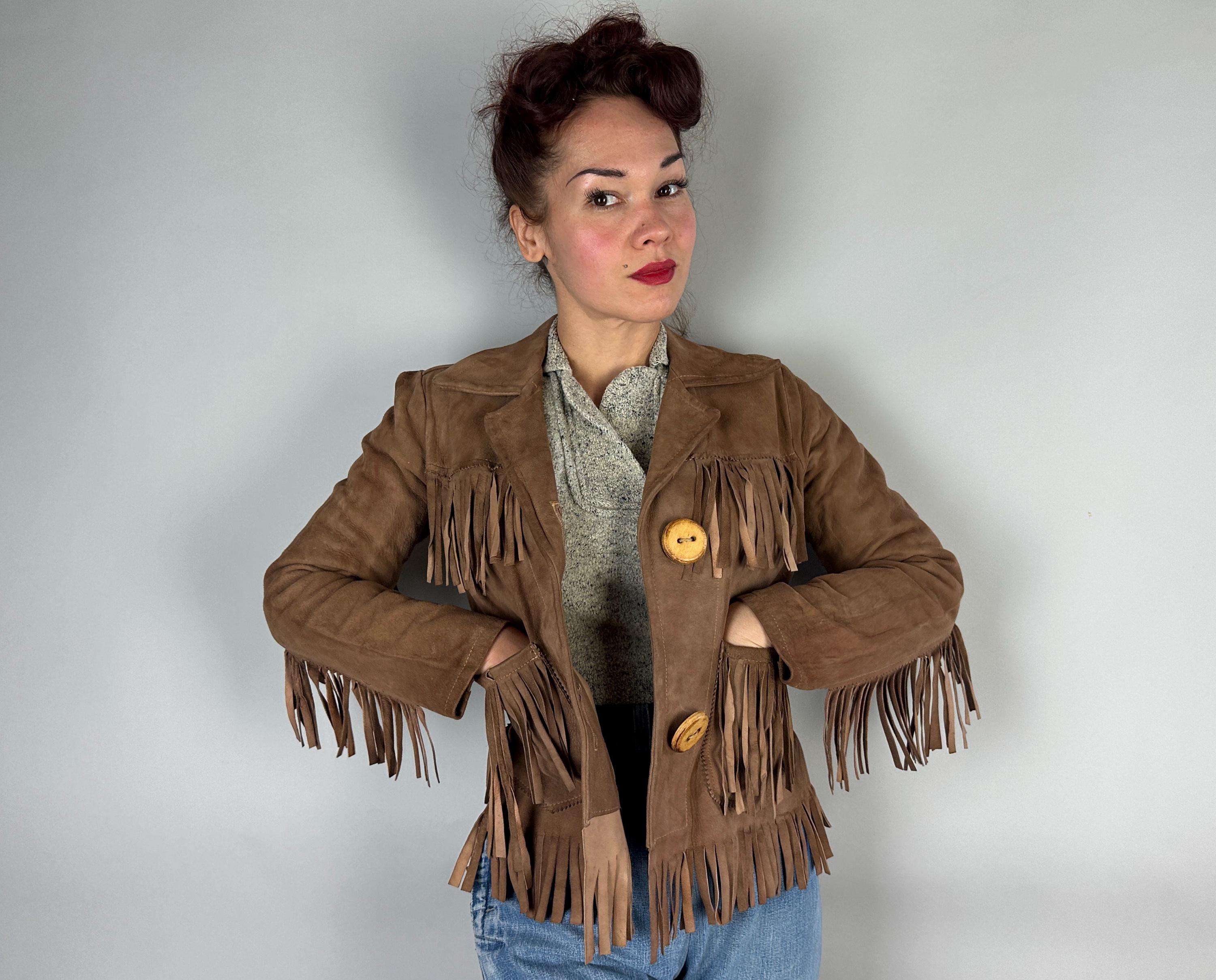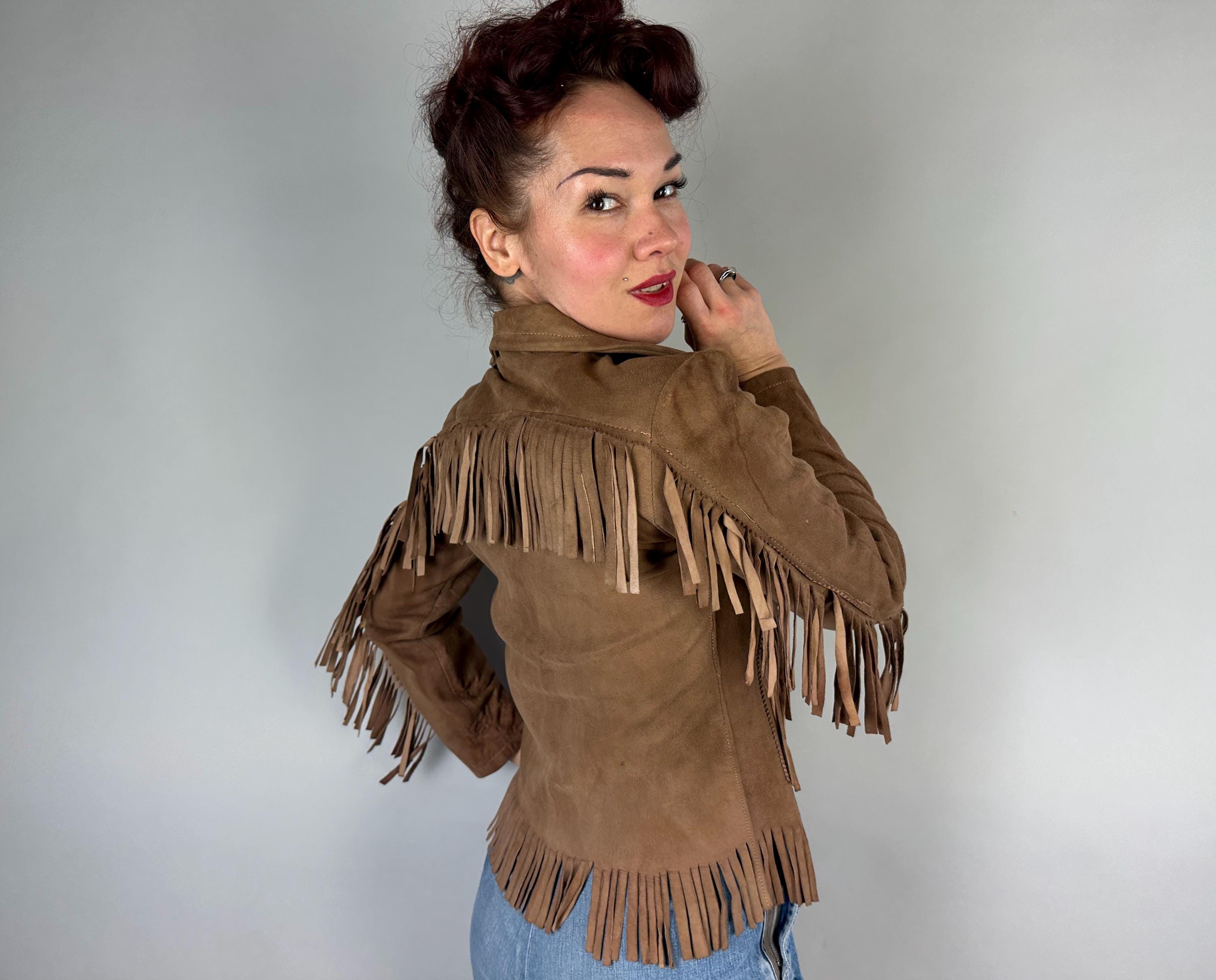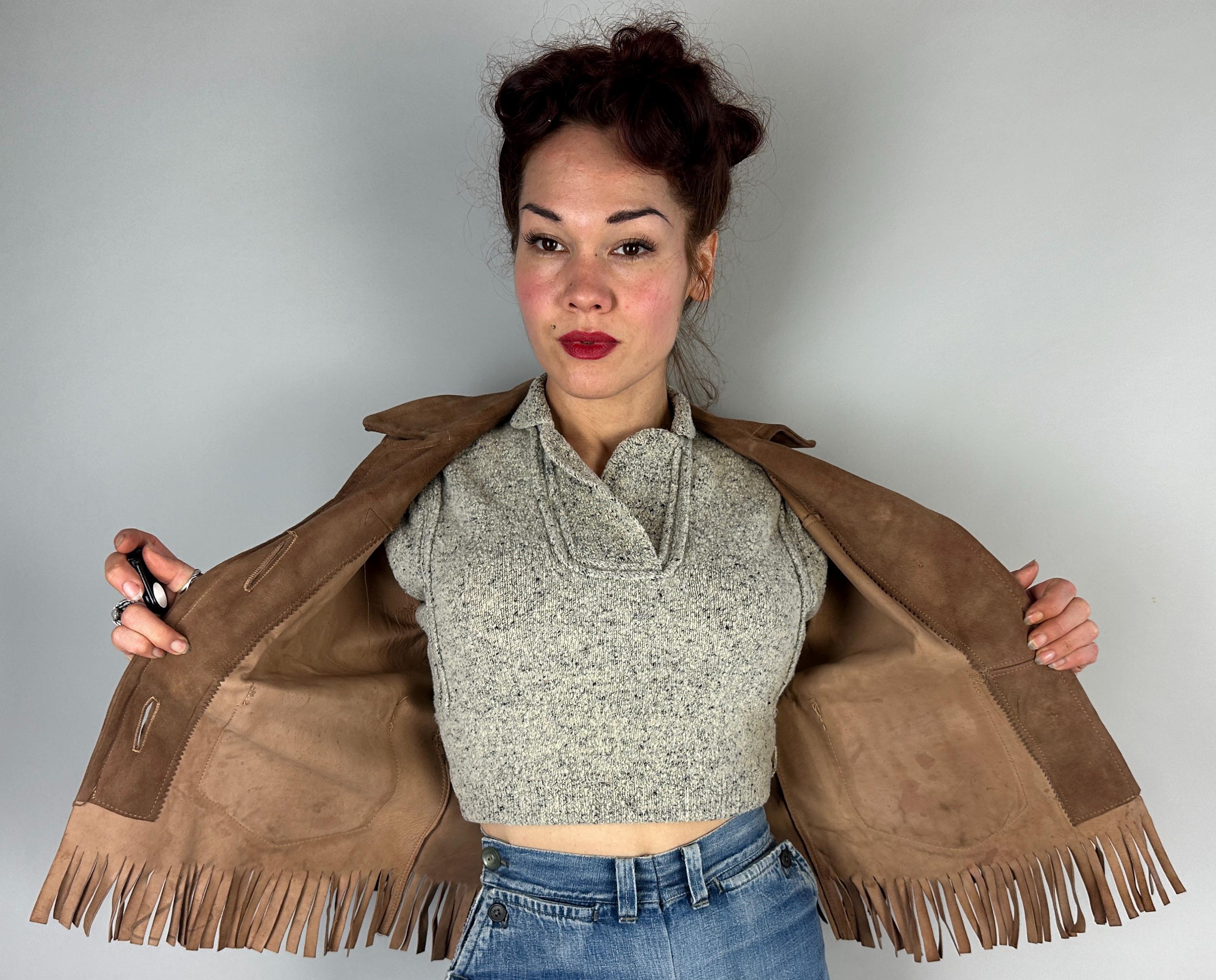 Feel like queen of the wild west in this 1950s jacket! Made of supple deerhide in taupe brown with the suede facing out and the leather on the underside. Perfect for transitional weather, the lack of lining keeps it light and slim. It features pinked edging along the yoke and patch pockets and two giant wooden buttons for fastening. Fringe adorns the back, down the sleeves, hem, and pocket tops. This jacket is in great vintage condition, with no stains, holes, or odors to note.