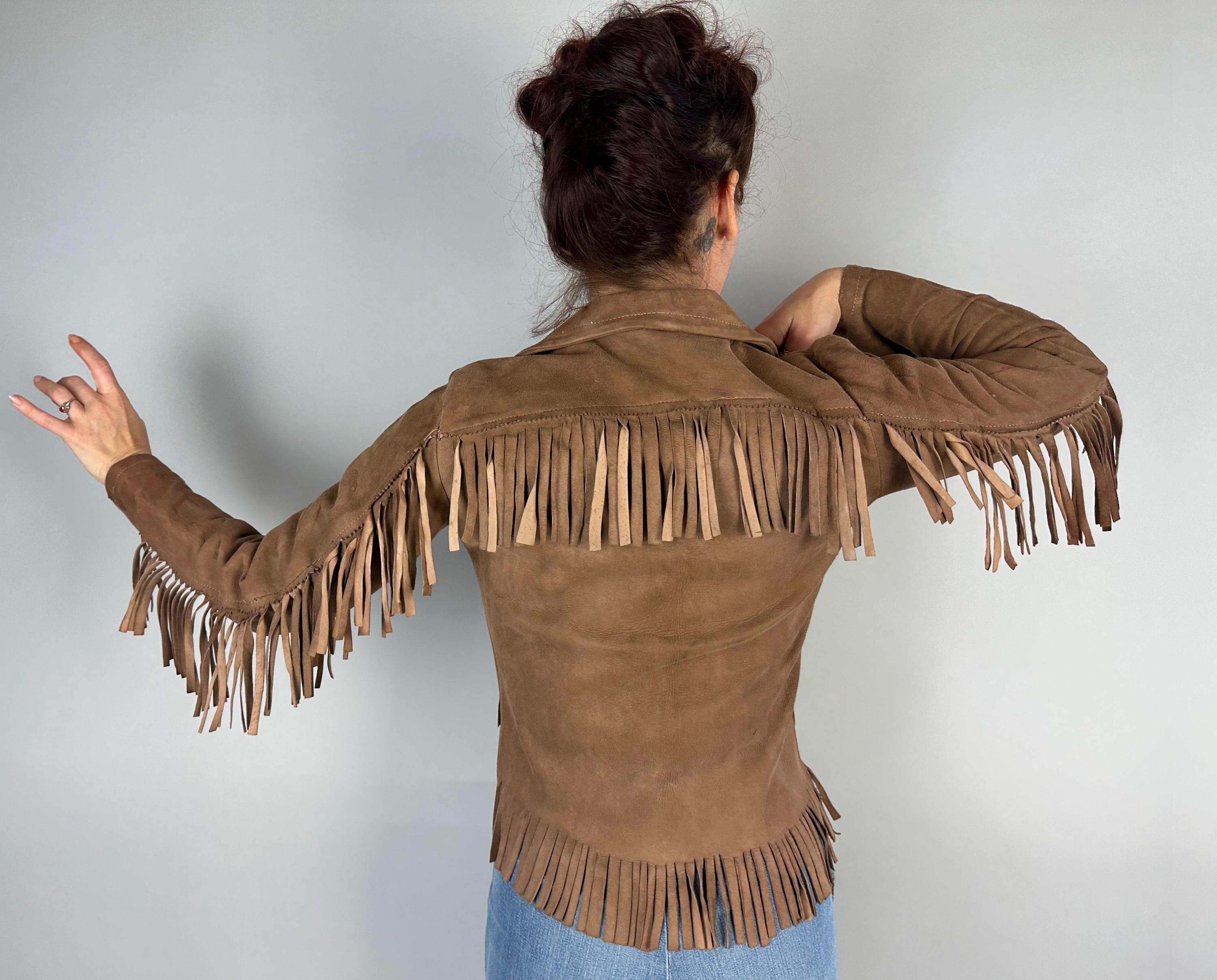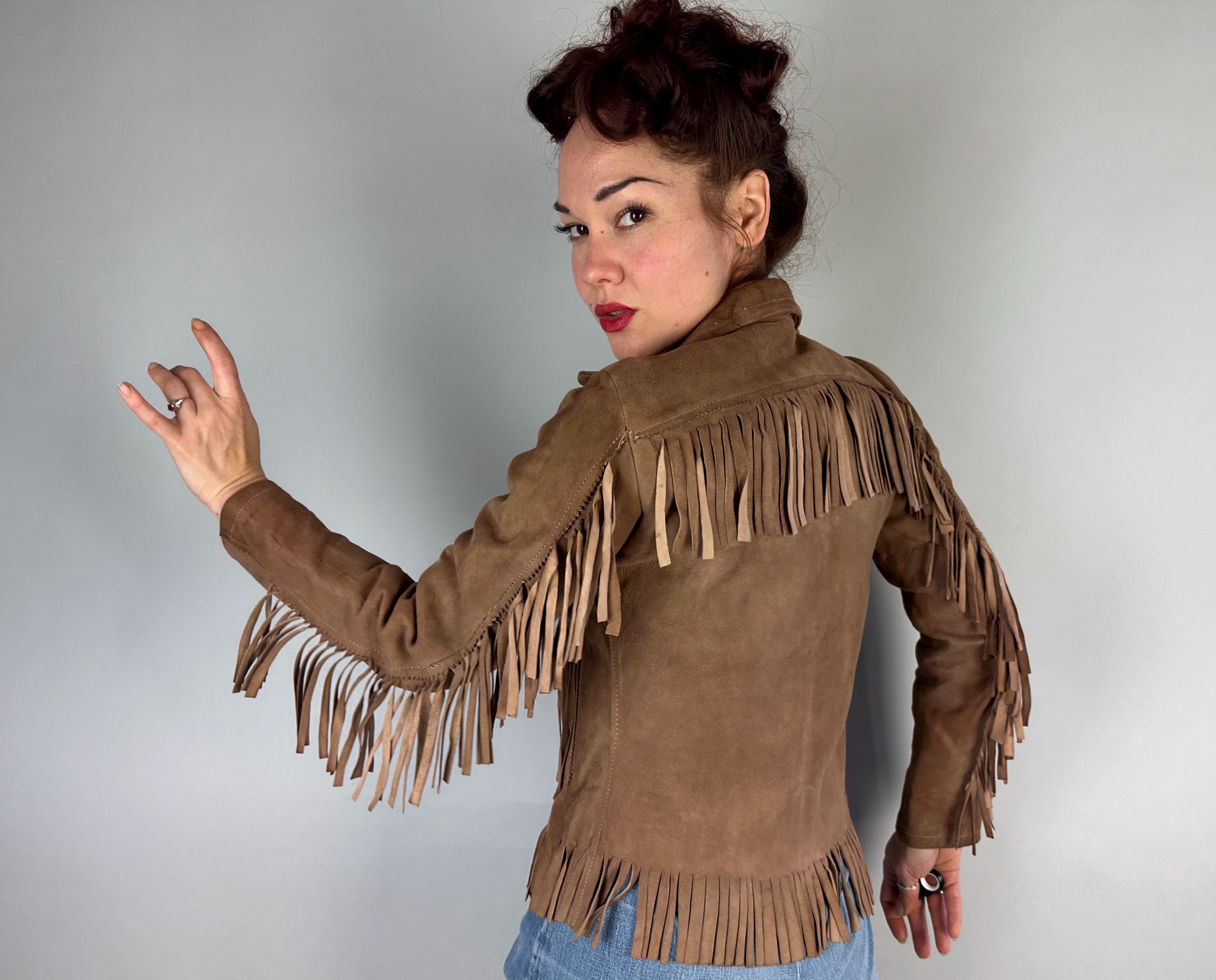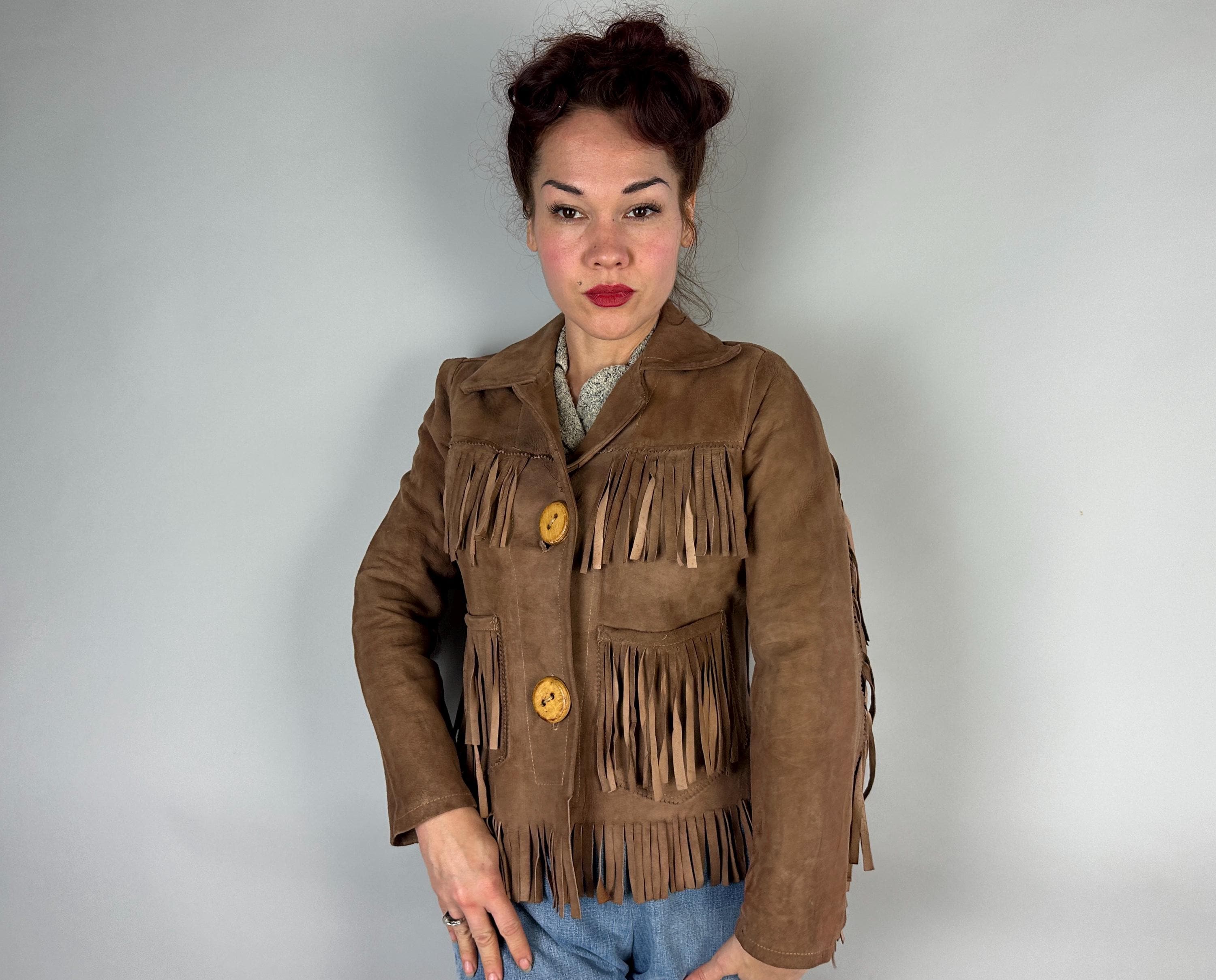 Feel like queen of the wild west in this 1950s jacket! Made of supple deerhide in taupe brown with the suede facing out and the leather on the underside. Perfect for transitional weather, the lack of lining keeps it light and slim. It features pinked edging along the yoke and patch pockets and two giant wooden buttons for fastening. Fringe adorns the back, down the sleeves, hem, and pocket tops. This jacket is in great vintage condition, with no stains, holes, or odors to note.
