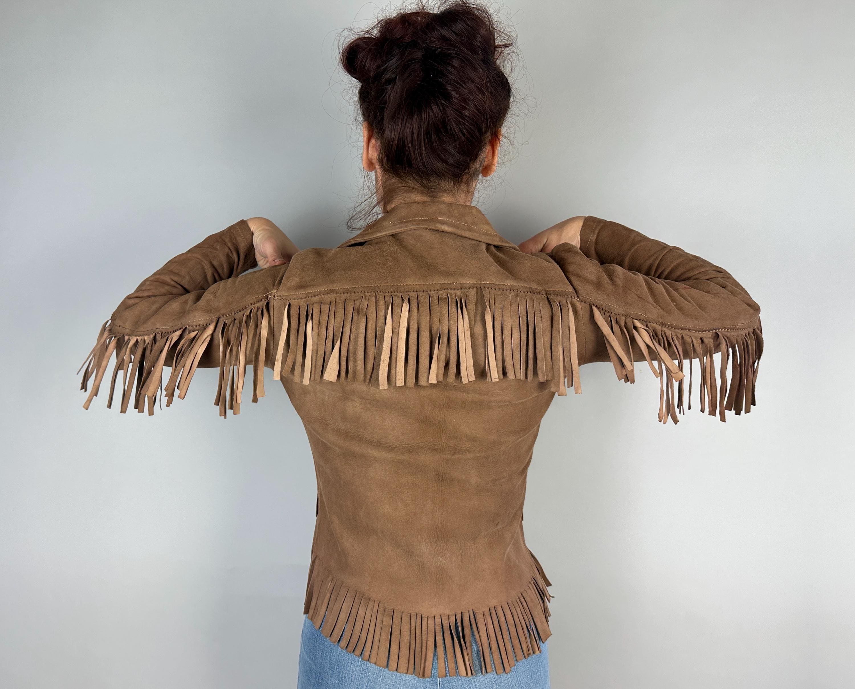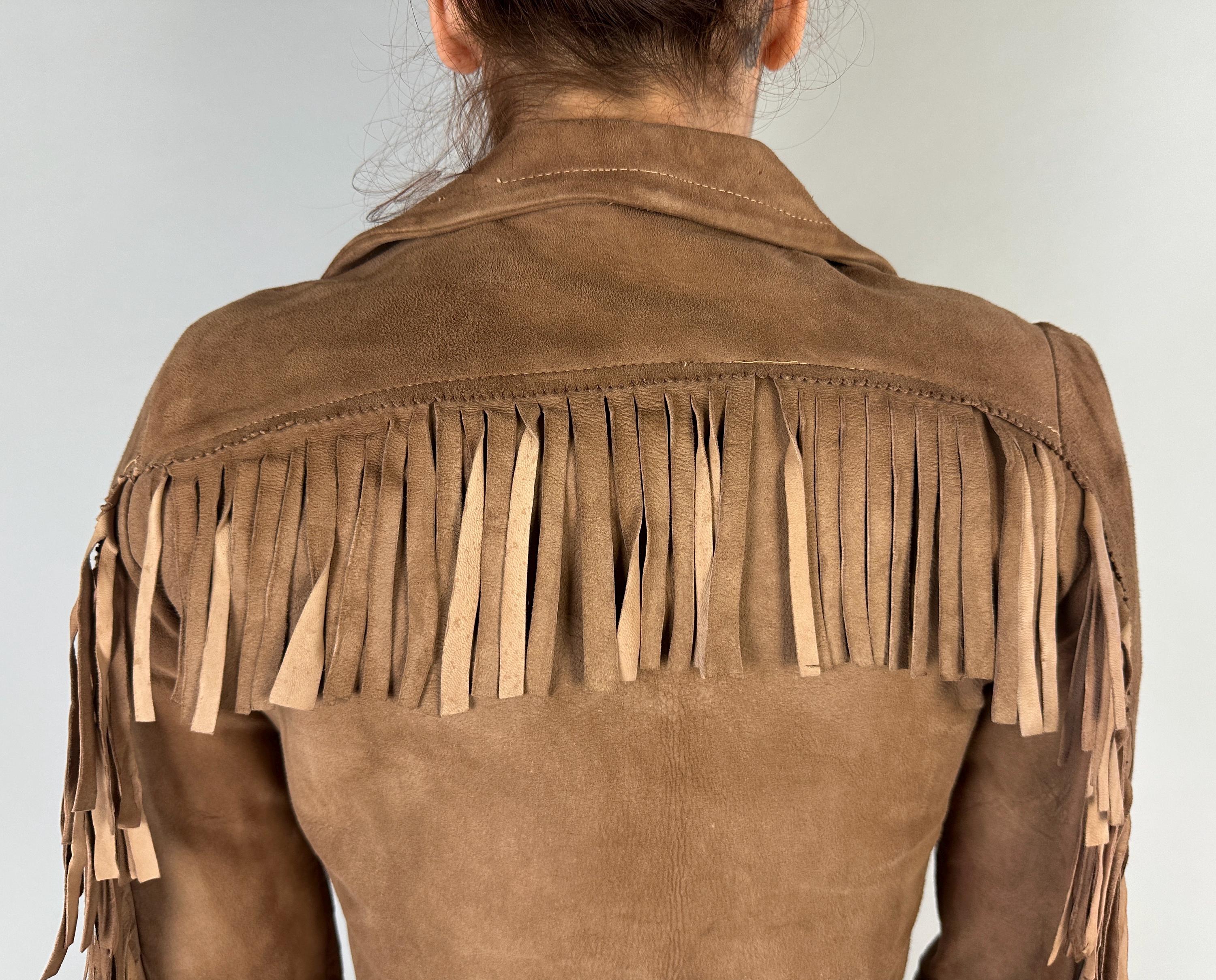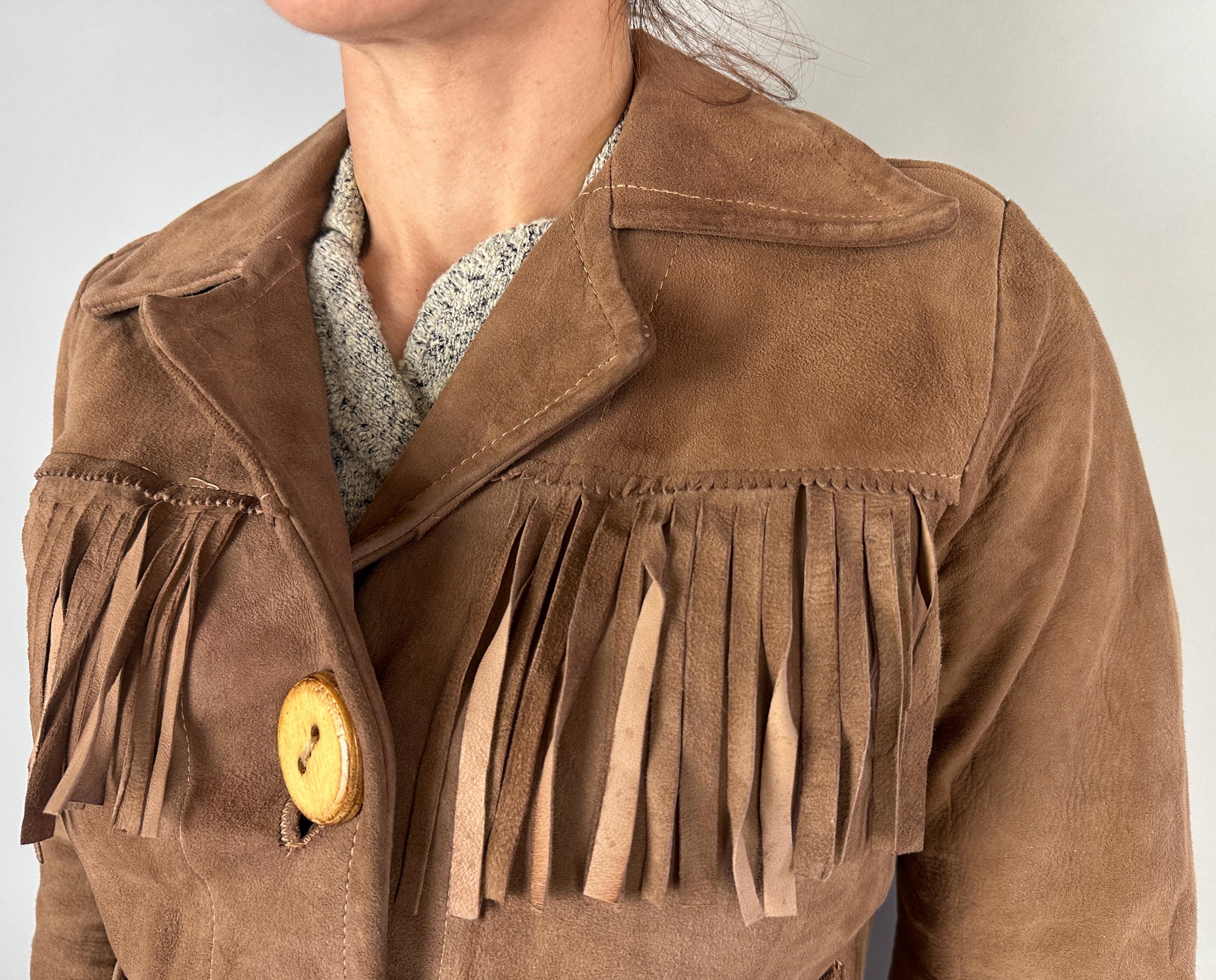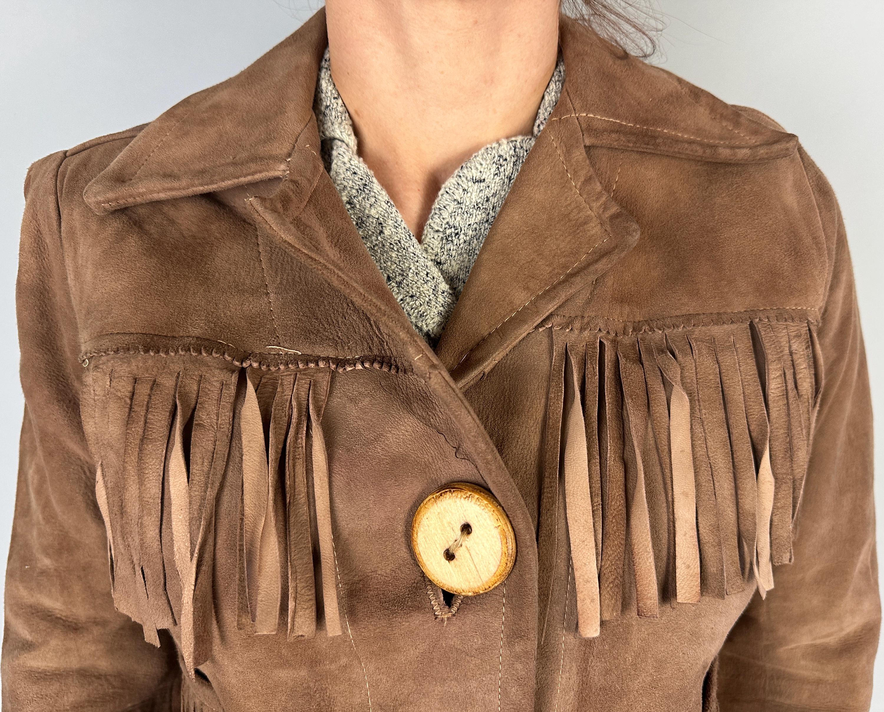 Feel like queen of the wild west in this 1950s jacket! Made of supple deerhide in taupe brown with the suede facing out and the leather on the underside. Perfect for transitional weather, the lack of lining keeps it light and slim. It features pinked edging along the yoke and patch pockets and two giant wooden buttons for fastening. Fringe adorns the back, down the sleeves, hem, and pocket tops. This jacket is in great vintage condition, with no stains, holes, or odors to note.