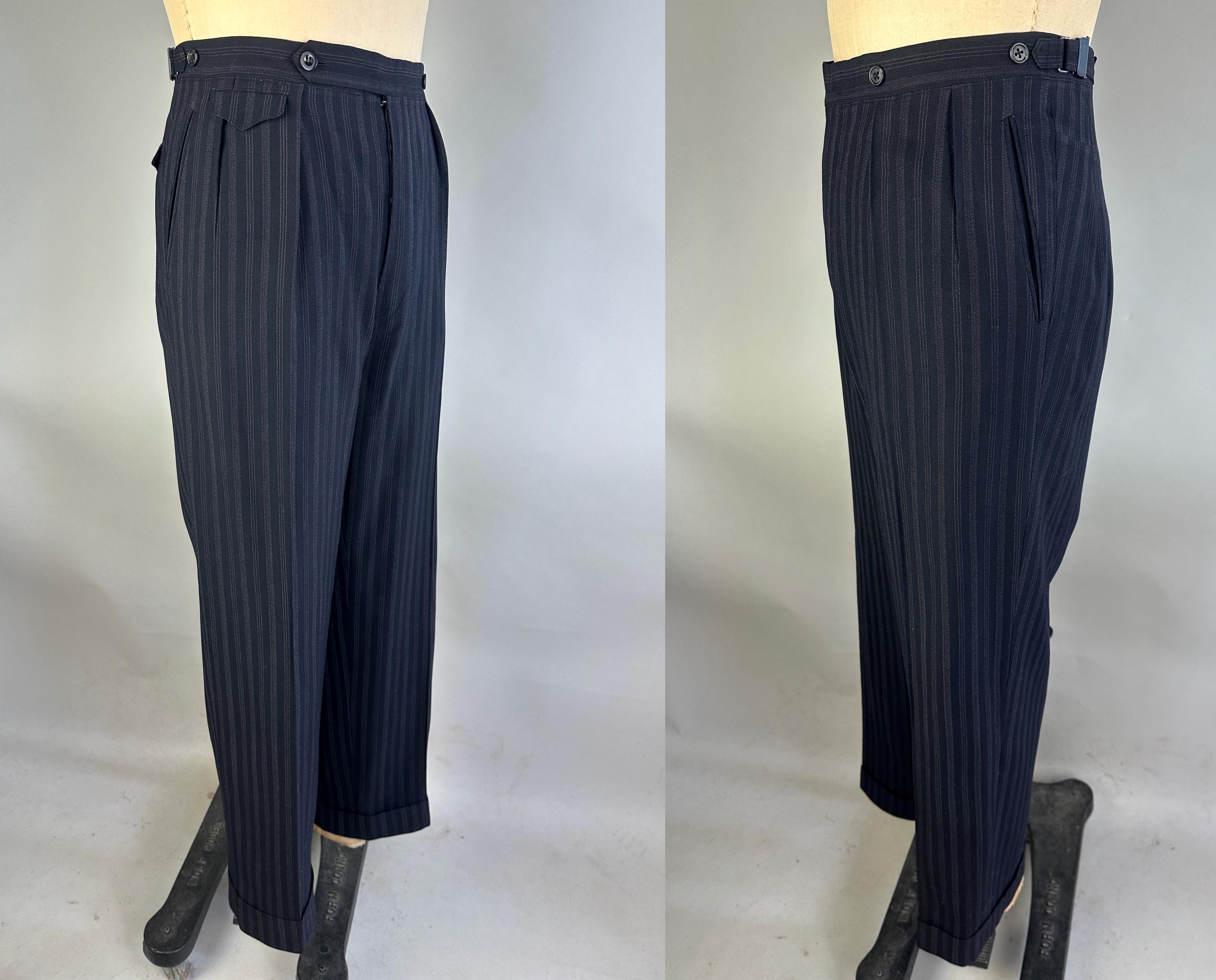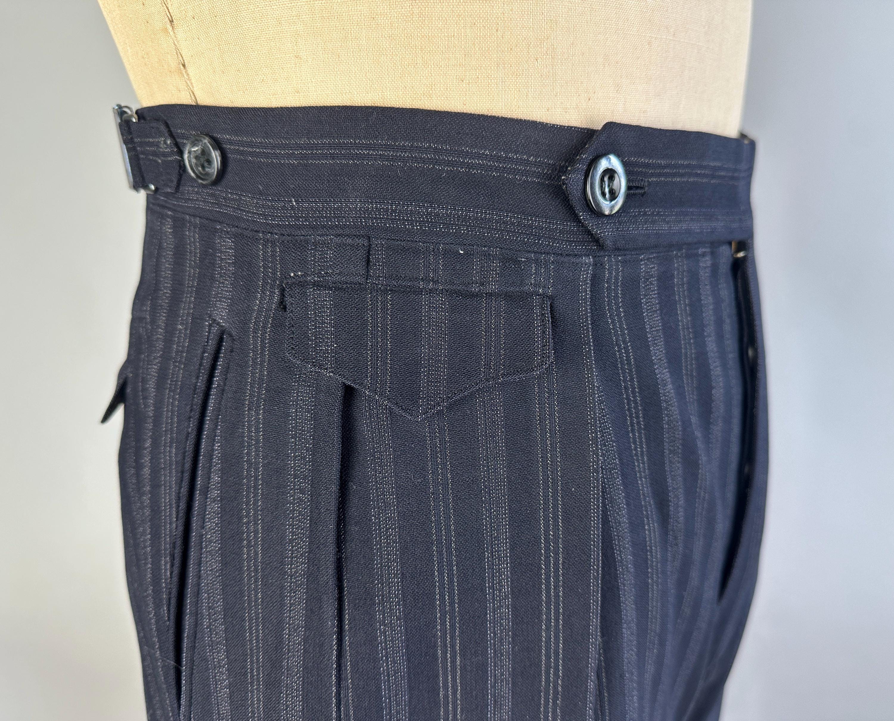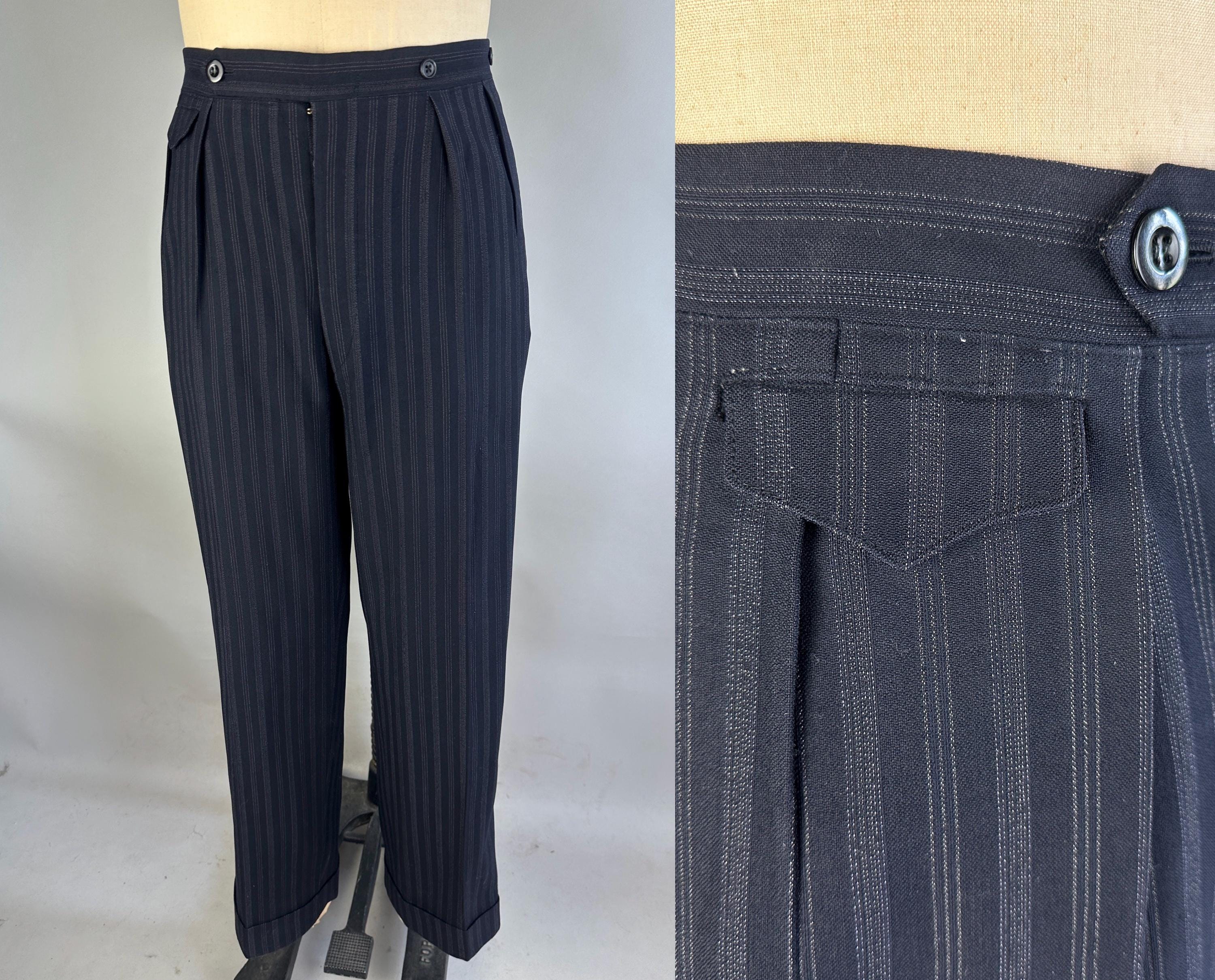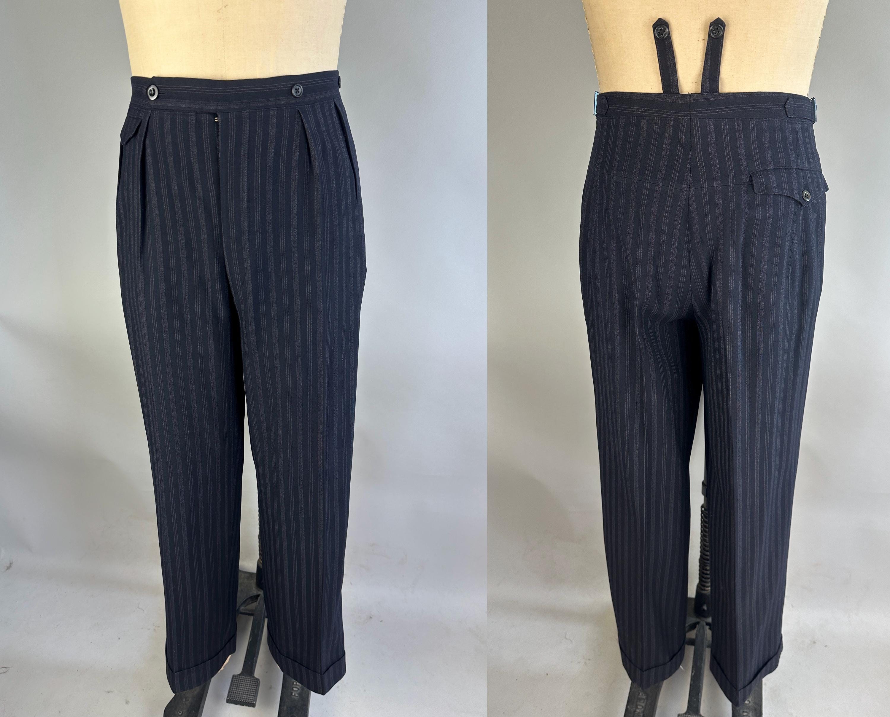 Shiver your timbers in style with these 1930s pinstriped men's wool trousers. Features all the fixings for suspenders, with bunny ears in the back and two sets of buttons on the front. Clasps on either side can be adjusted to cinch in the fit of the waist. Additional details include double pleats on the front, one flap pocket in the back, a flapped coin pocket on the front, welted pockets on the sides, and a button fly with top clasp. These trousers are in great vintage condition, with no holes, stains, odors to note.