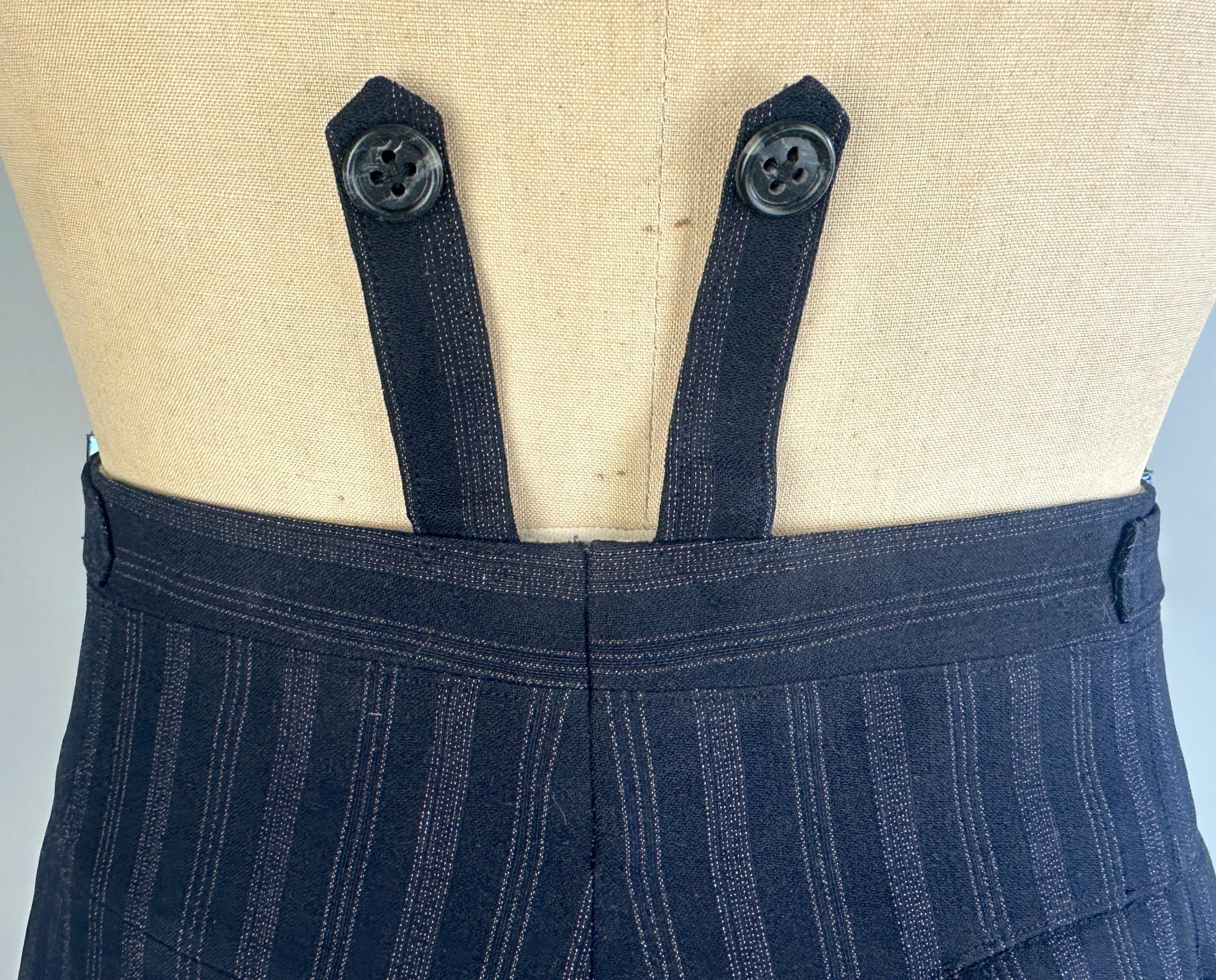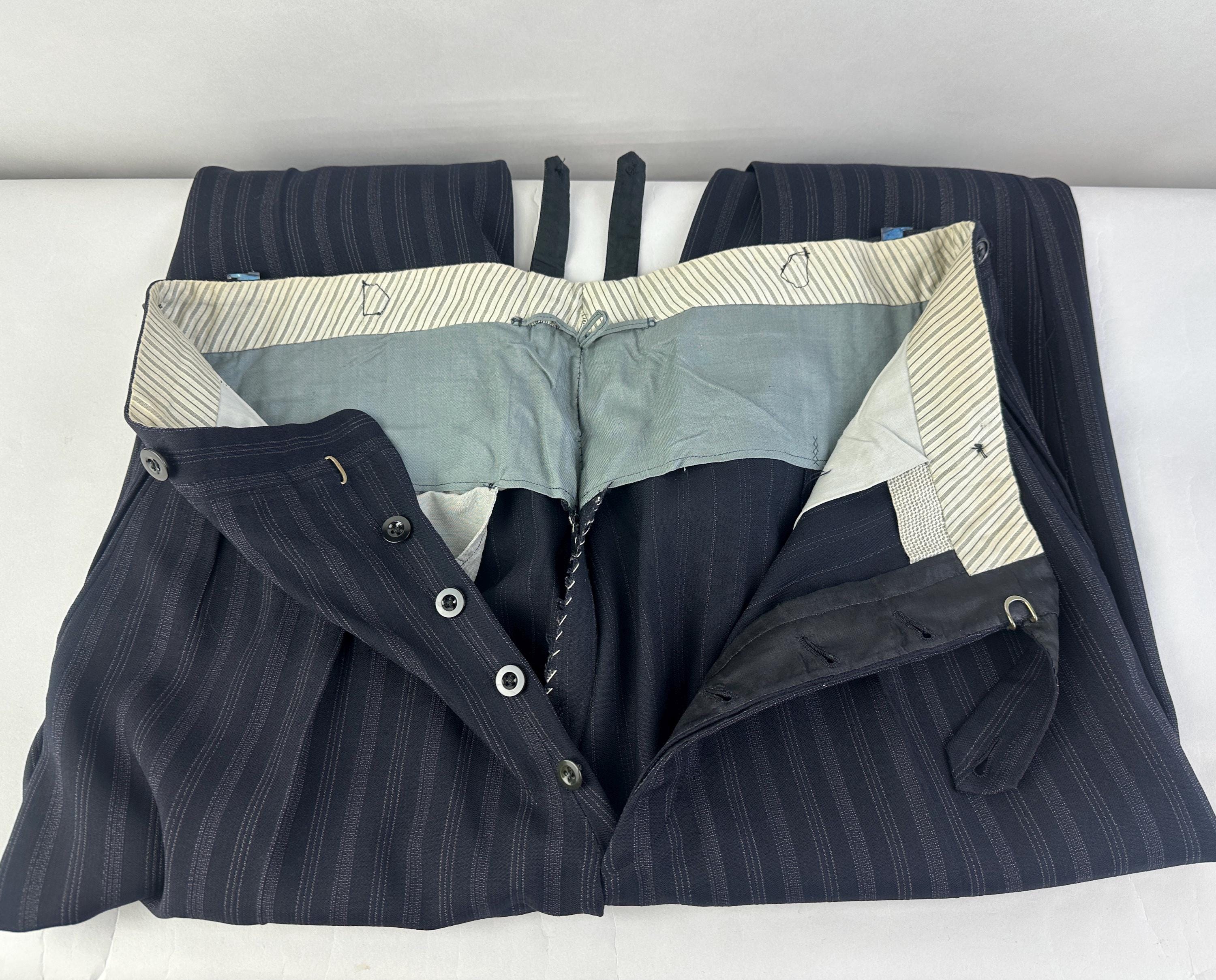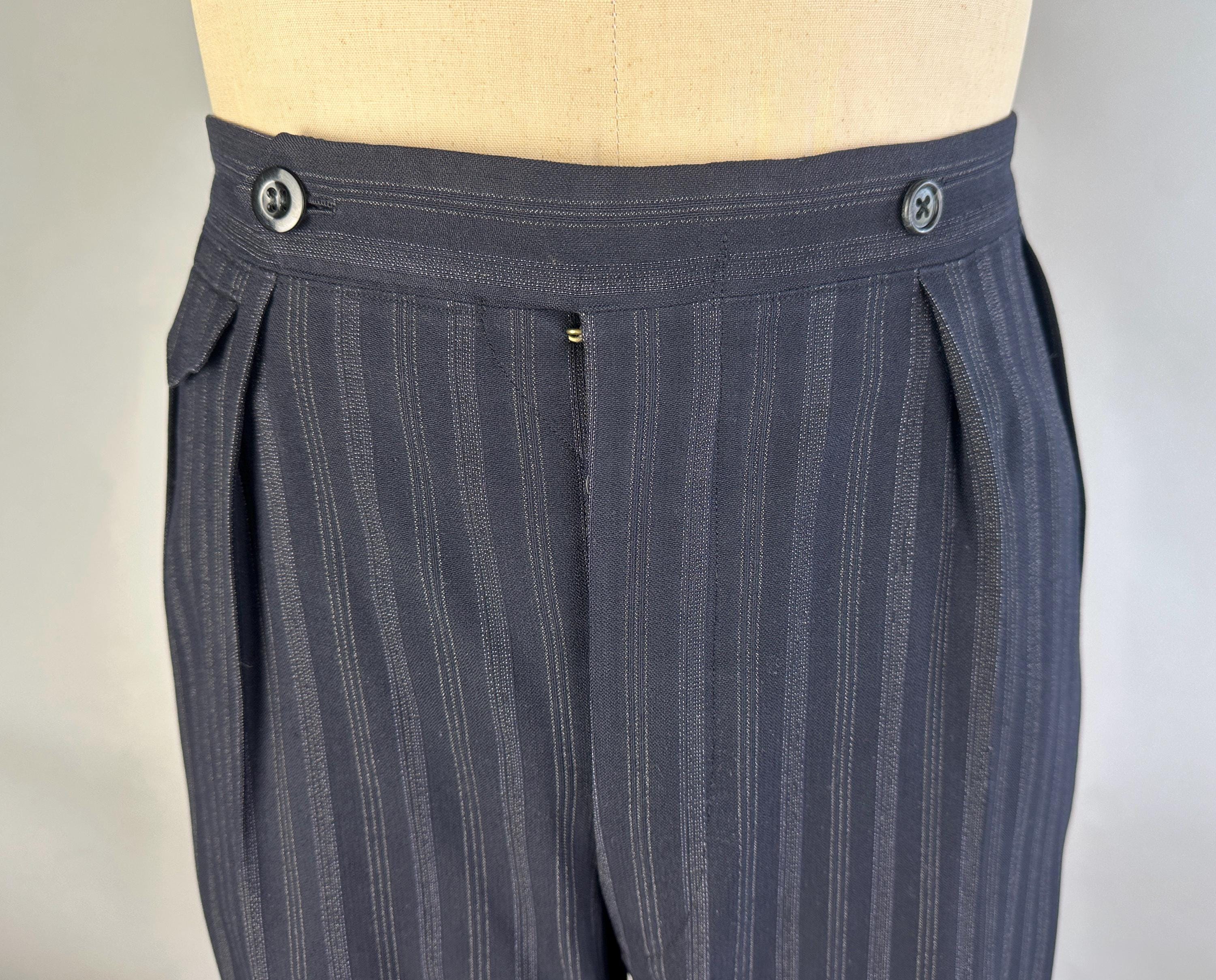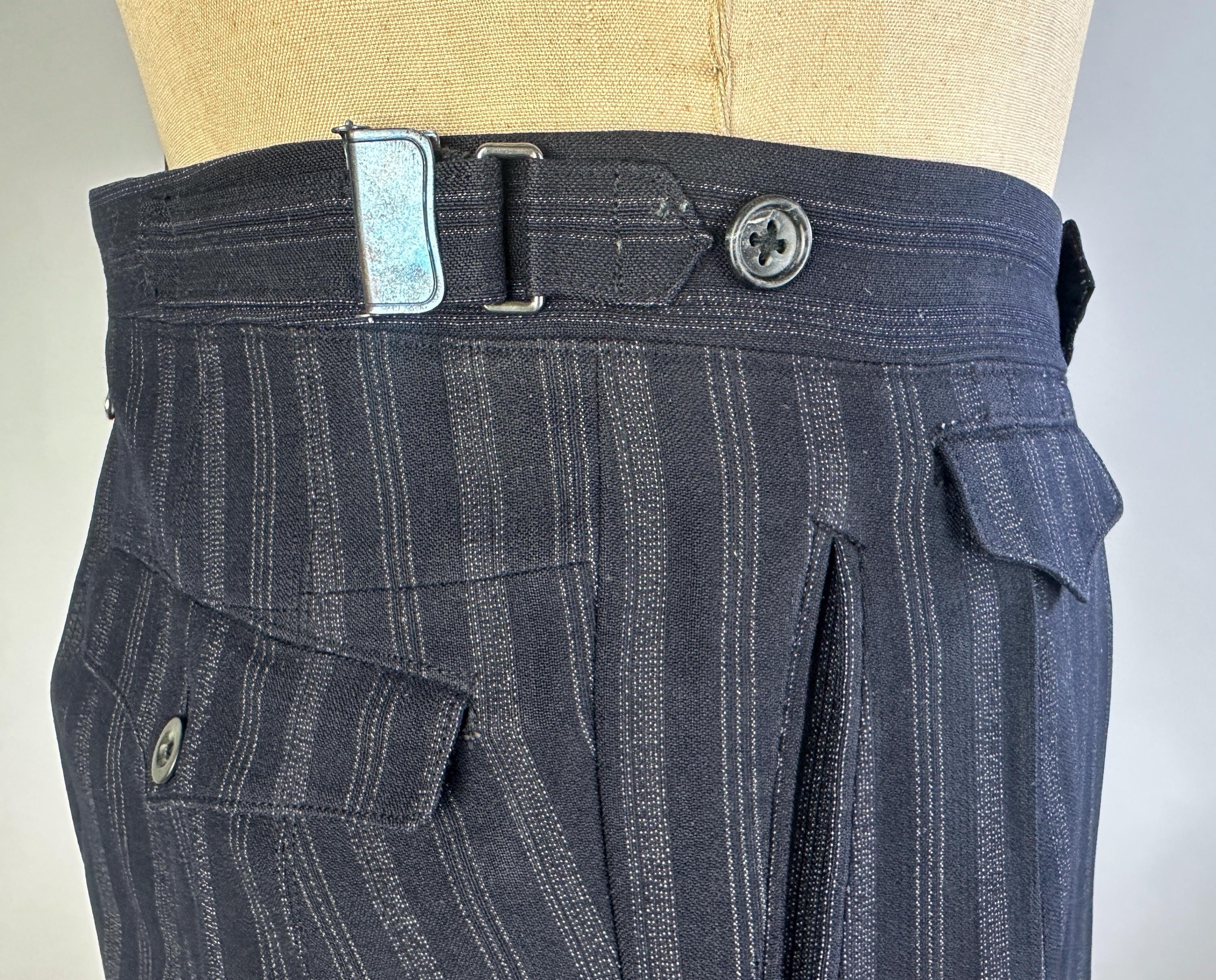Shiver your timbers in style with these 1930s pinstriped men's wool trousers. Features all the fixings for suspenders, with bunny ears in the back and two sets of buttons on the front. Clasps on either side can be adjusted to cinch in the fit of the waist. Additional details include double pleats on the front, one flap pocket in the back, a flapped coin pocket on the front, welted pockets on the sides, and a button fly with top clasp. These trousers are in great vintage condition, with no holes, stains, odors to note.