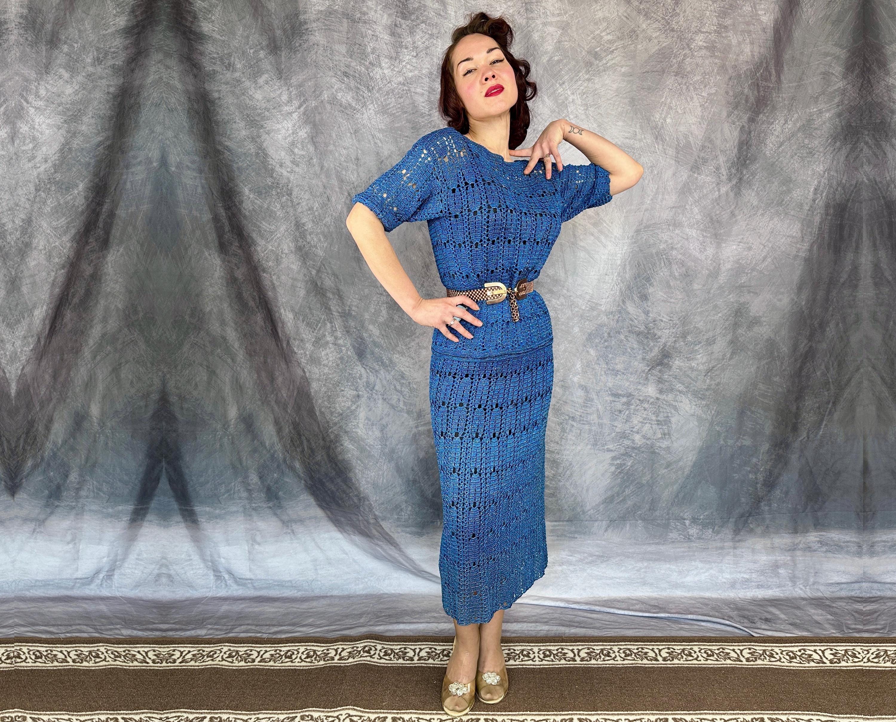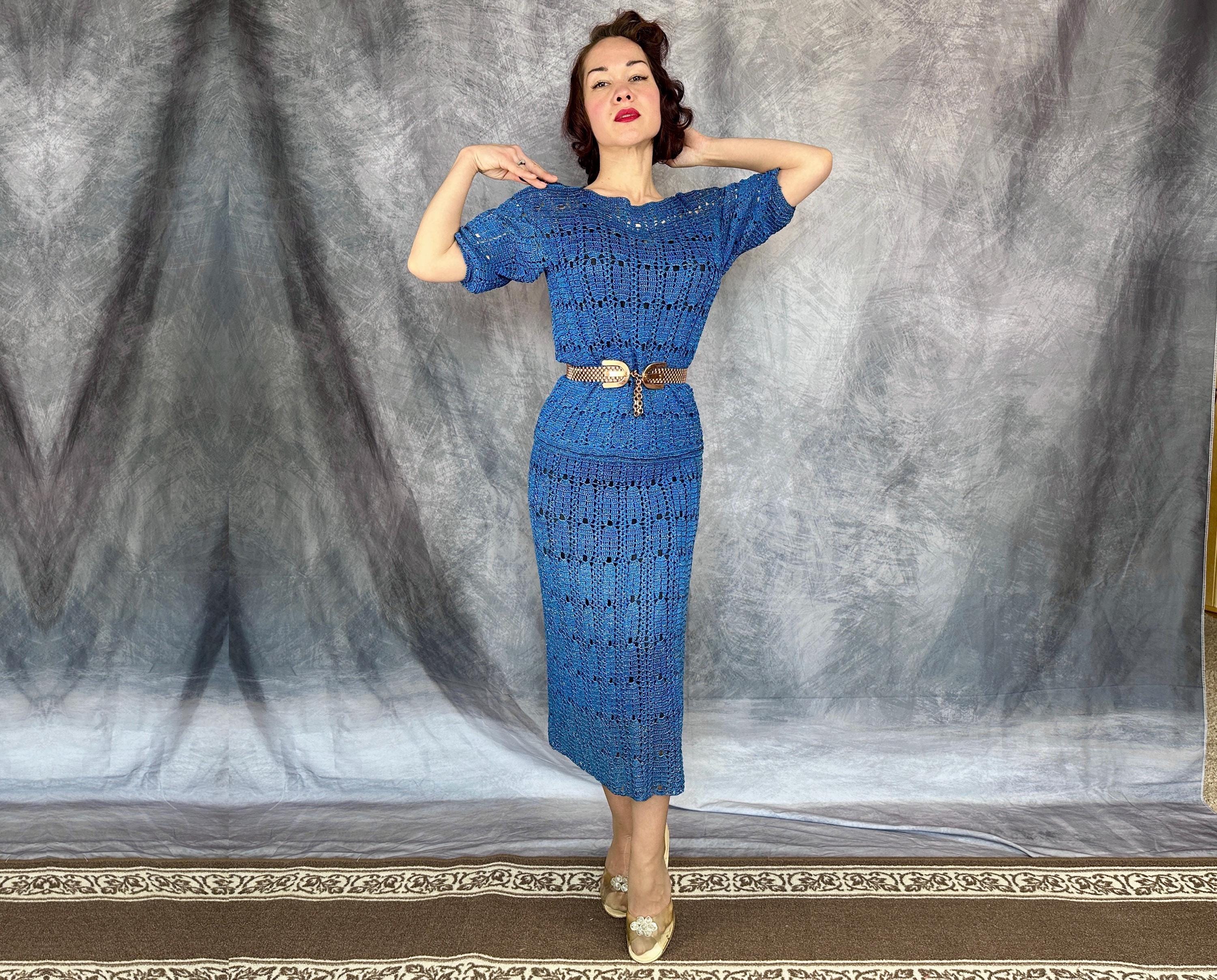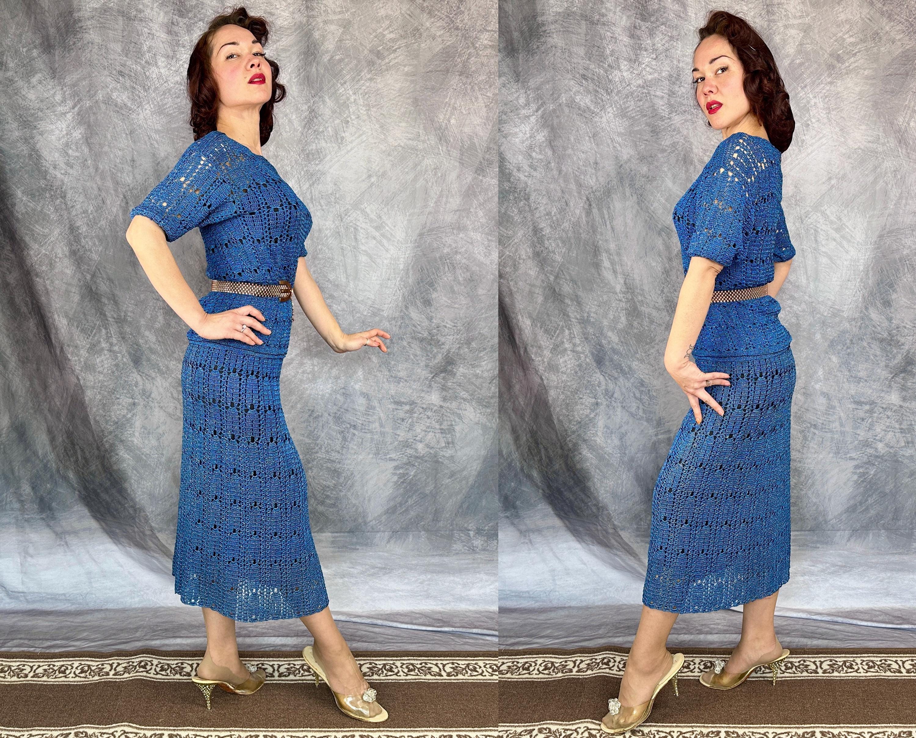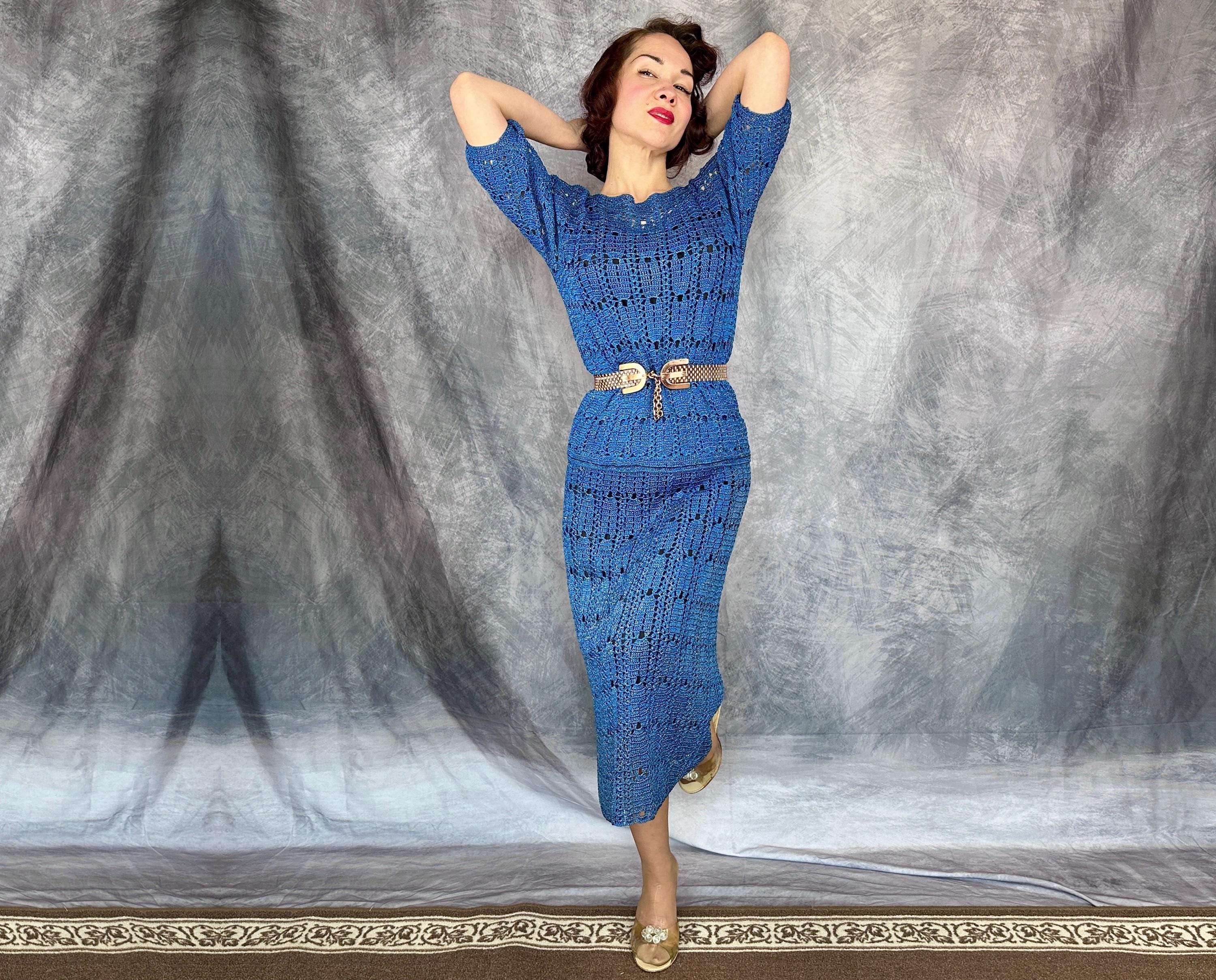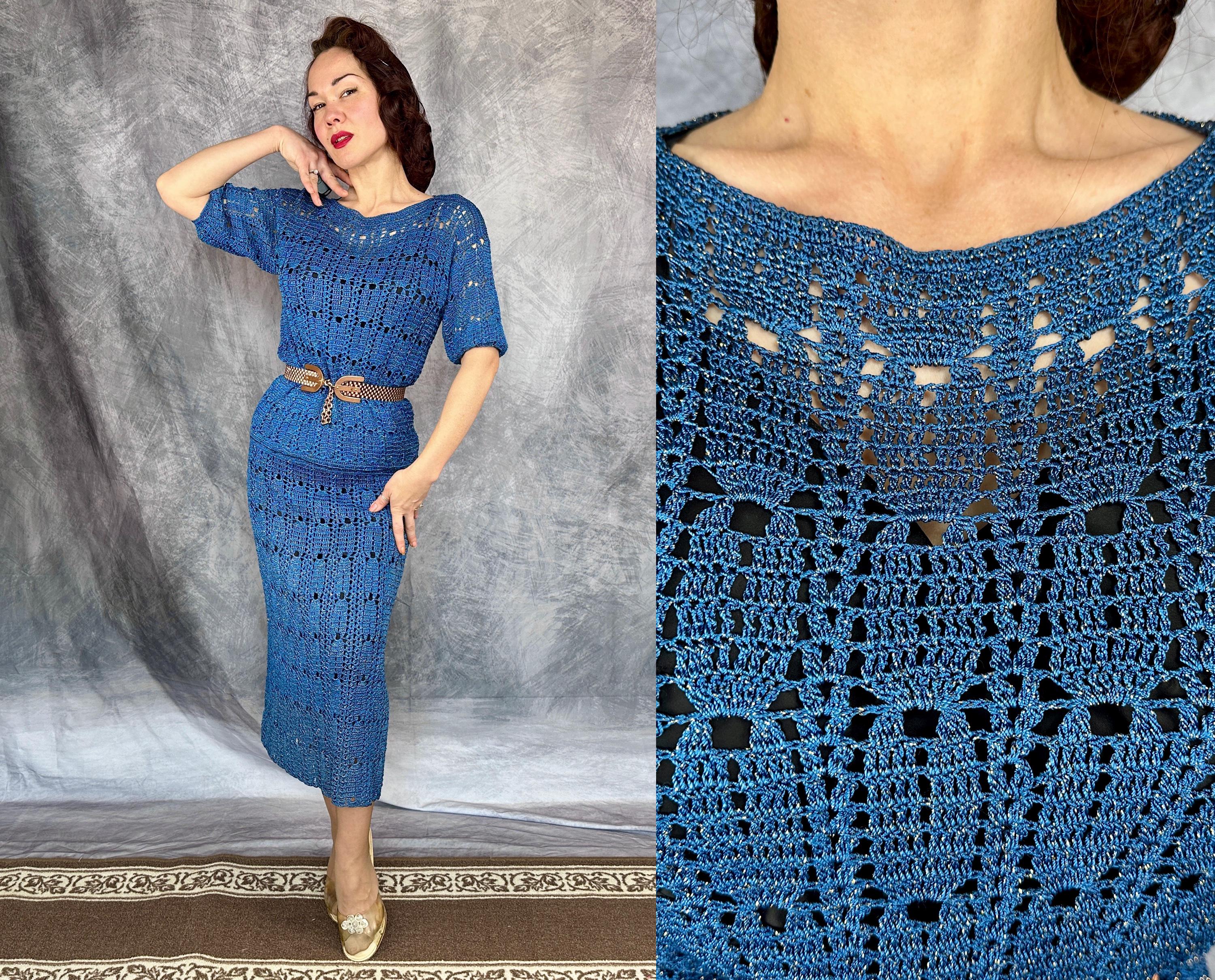 Become one with the stars with this sparkling midnight blue 1950s lacy knit top and skirt two-piece set. Crochet in a rayon lurex with gold accents and crocheted with a delicate lacy openwork pattern. Skirt has an elastic waistband. Belt is model's own. This set is in great vintage condition, with no holes, stains, or odors to note.