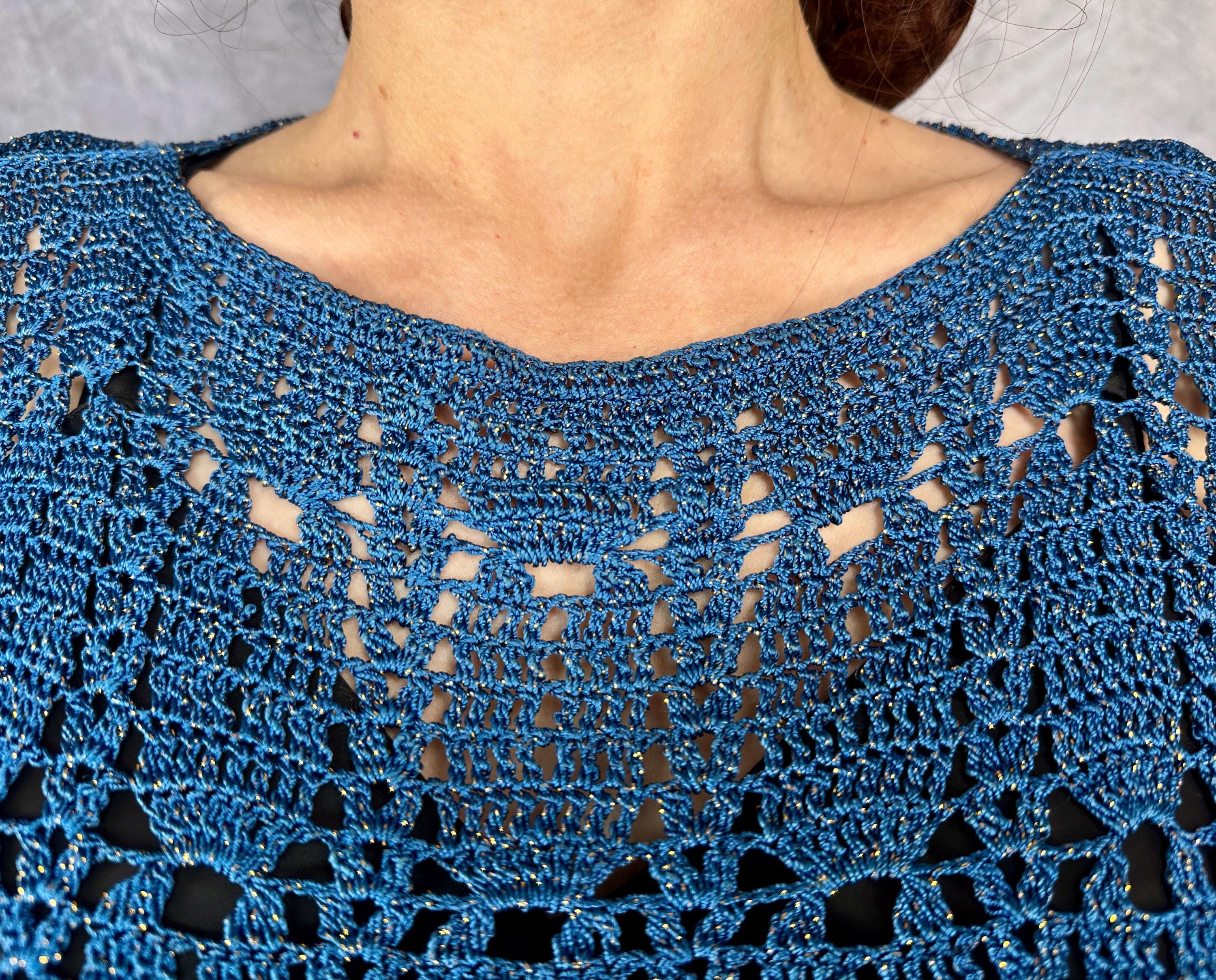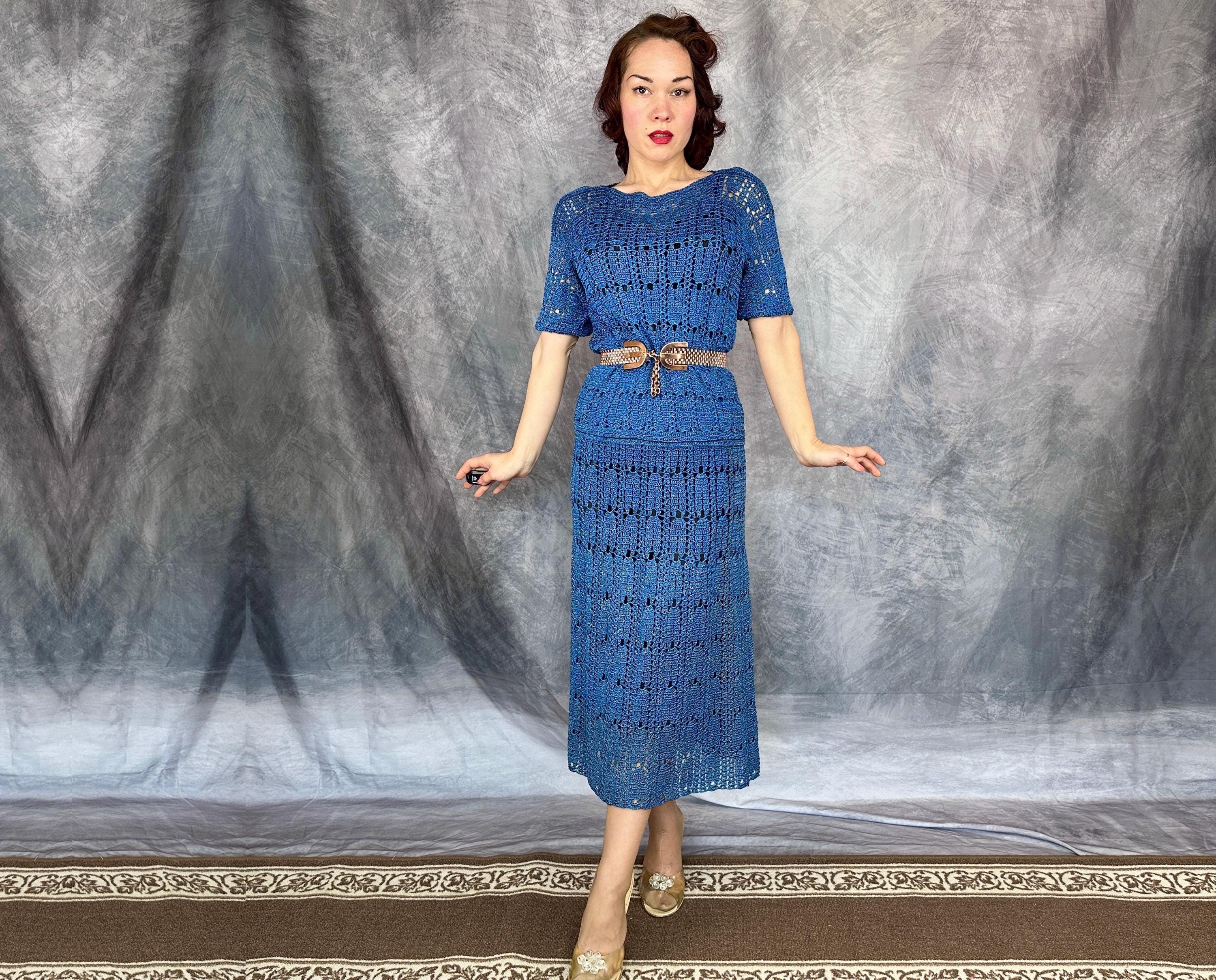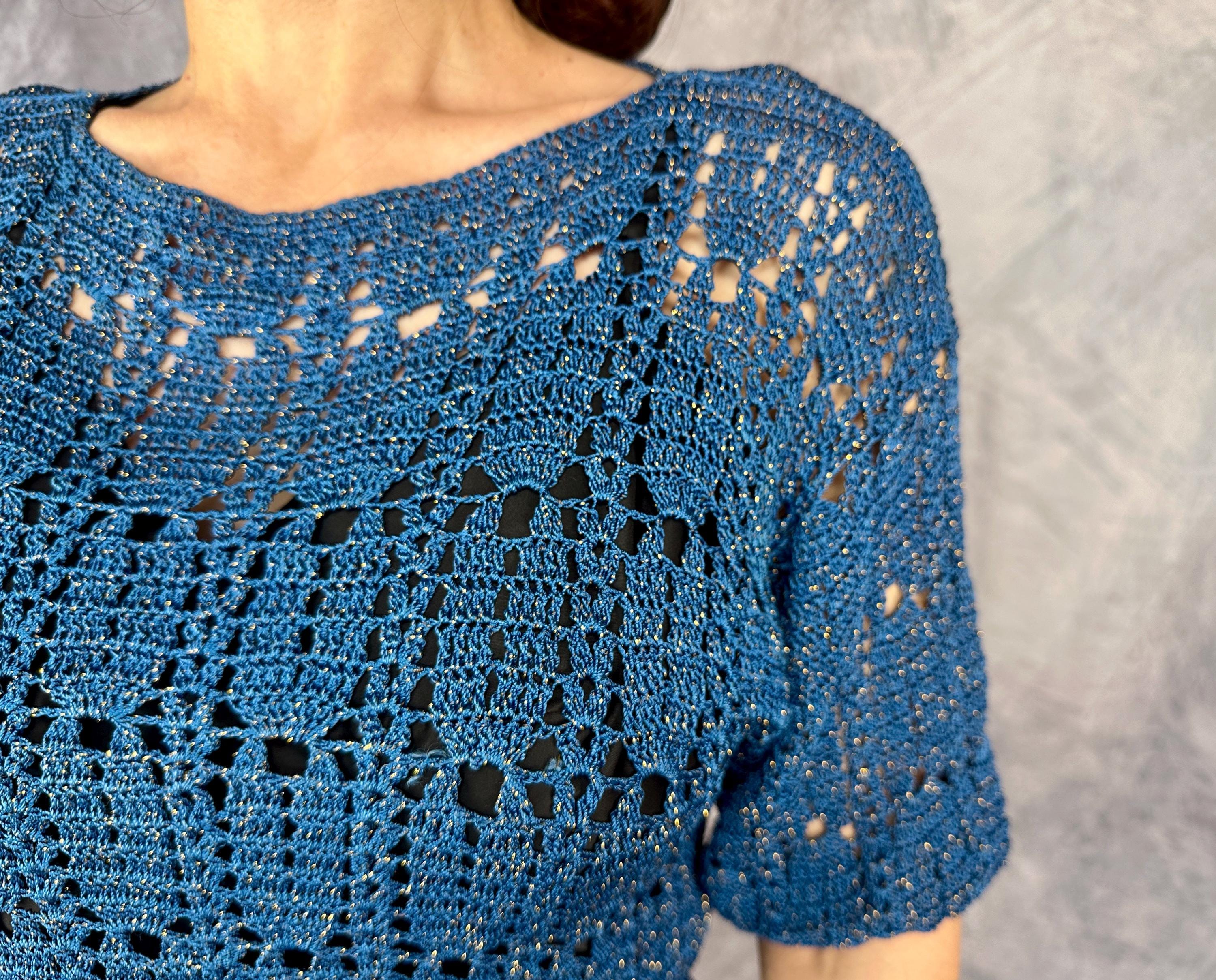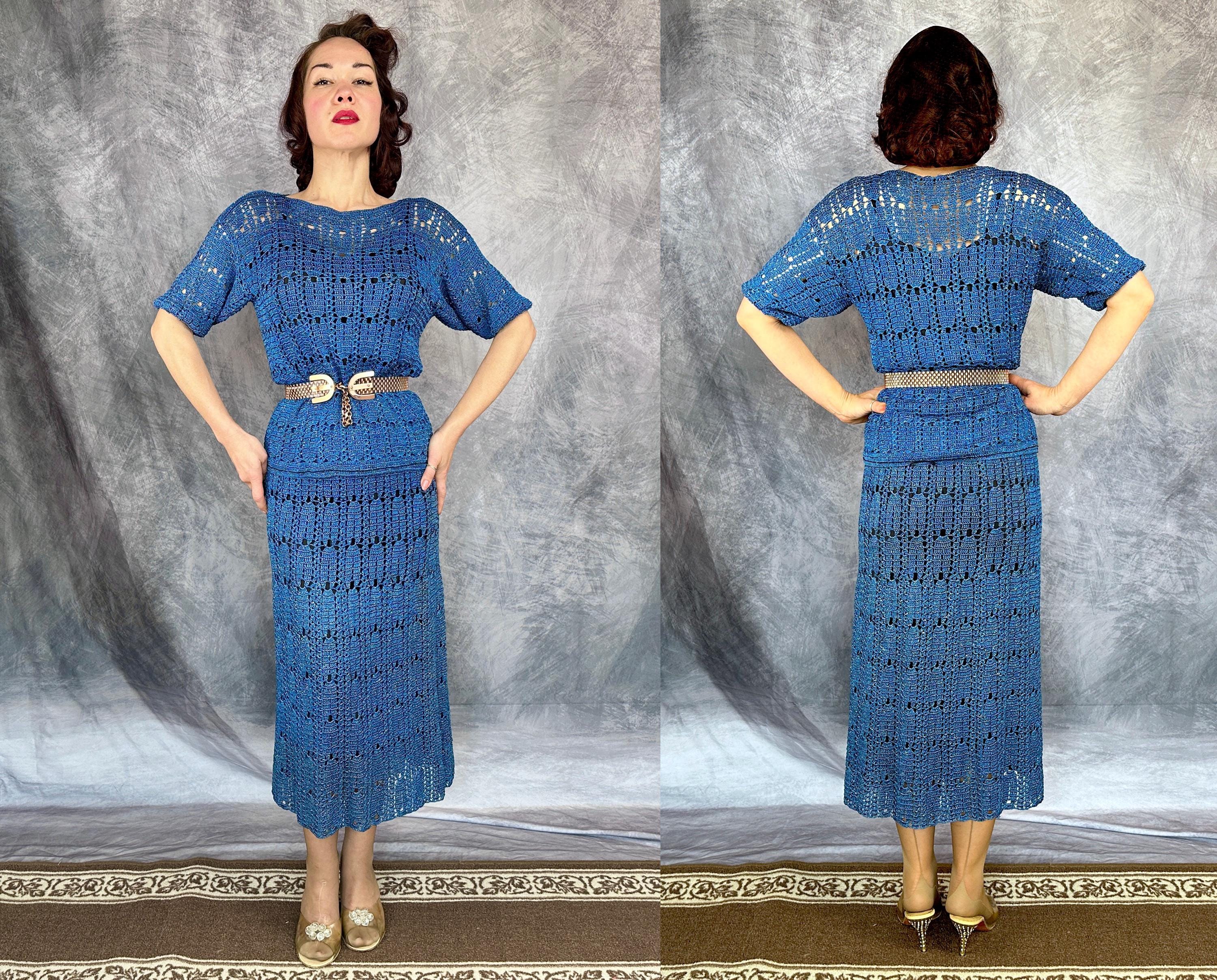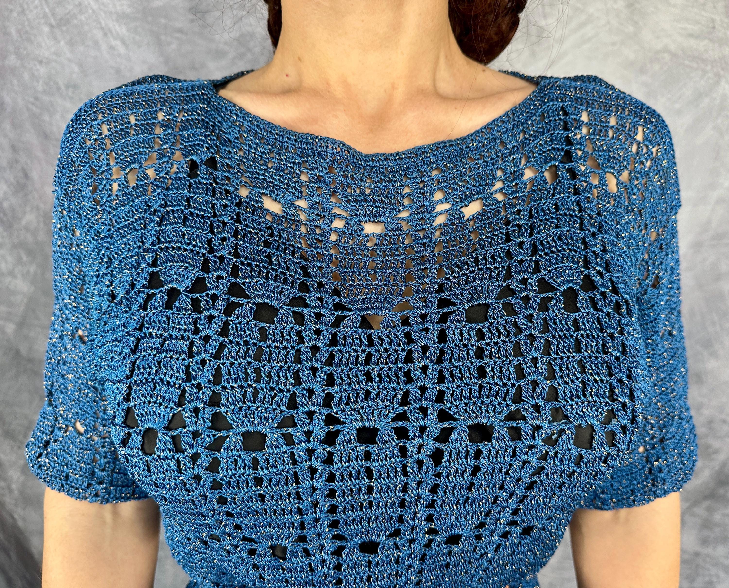 Become one with the stars with this sparkling midnight blue 1950s lacy knit top and skirt two-piece set. Crochet in a rayon lurex with gold accents and crocheted with a delicate lacy openwork pattern. Skirt has an elastic waistband. Belt is model's own. This set is in great vintage condition, with no holes, stains, or odors to note.