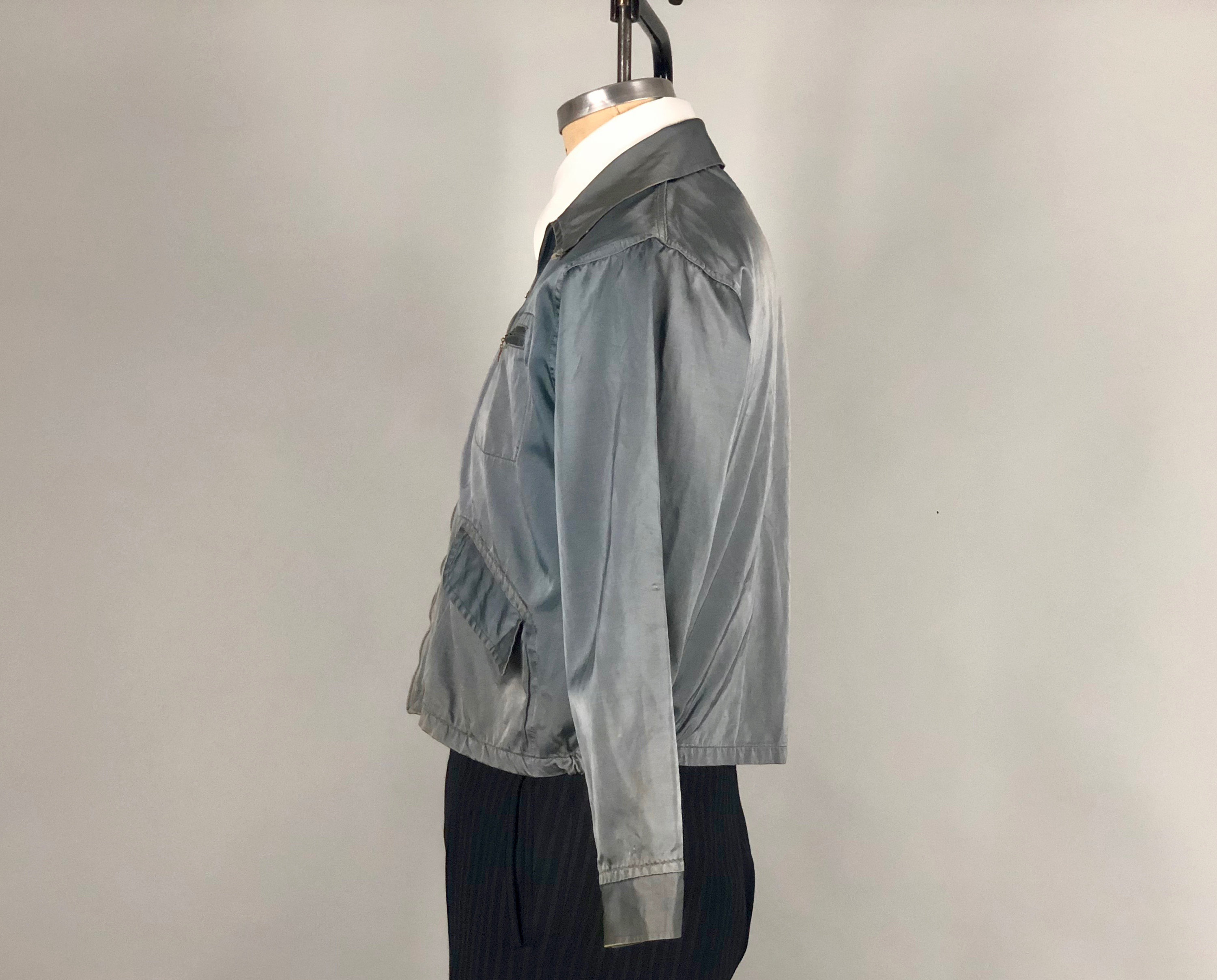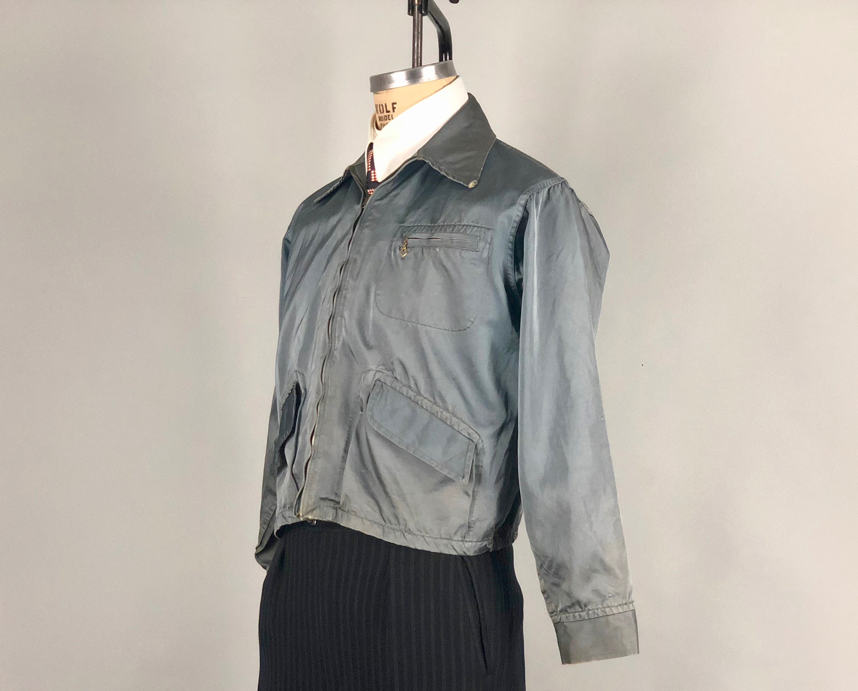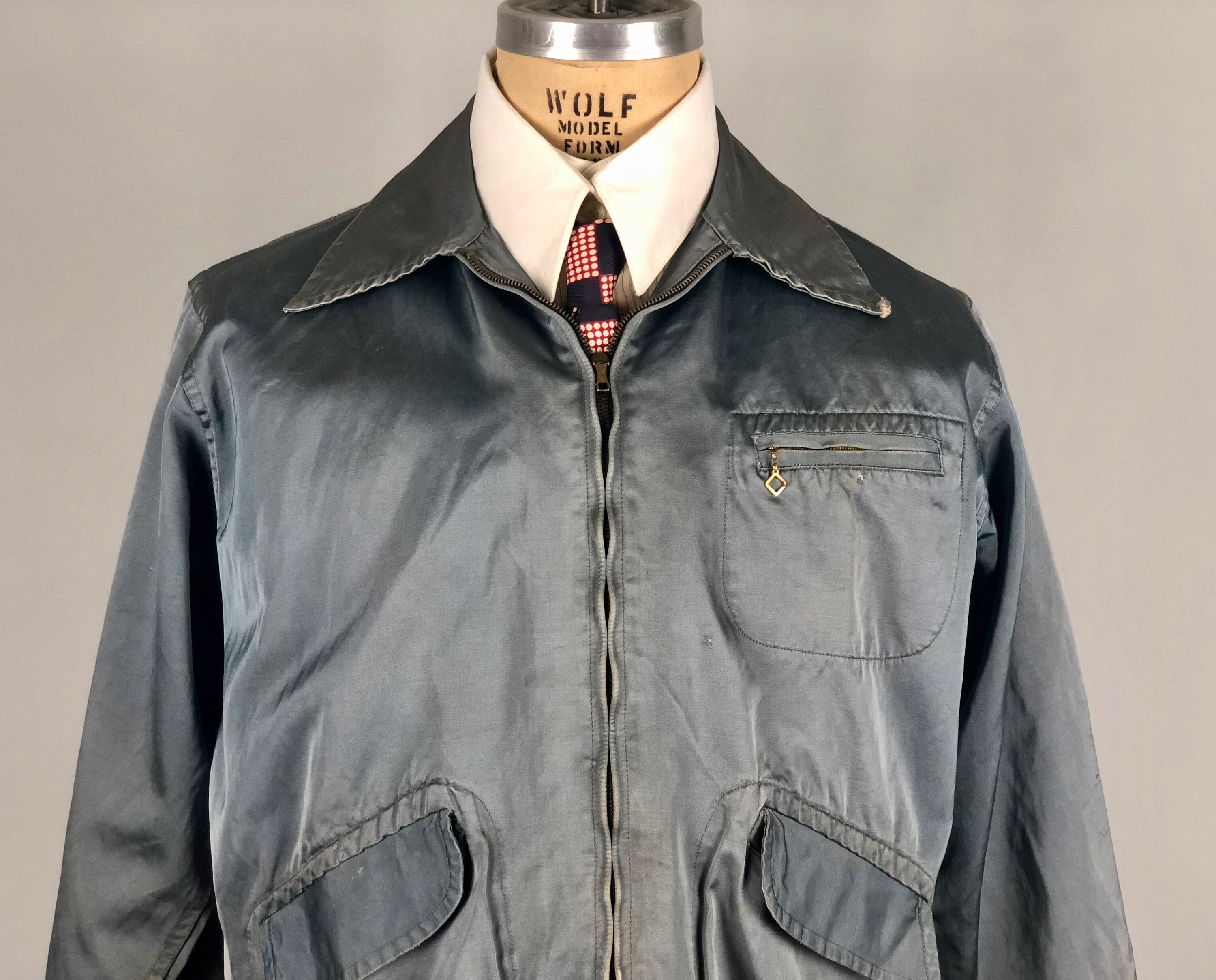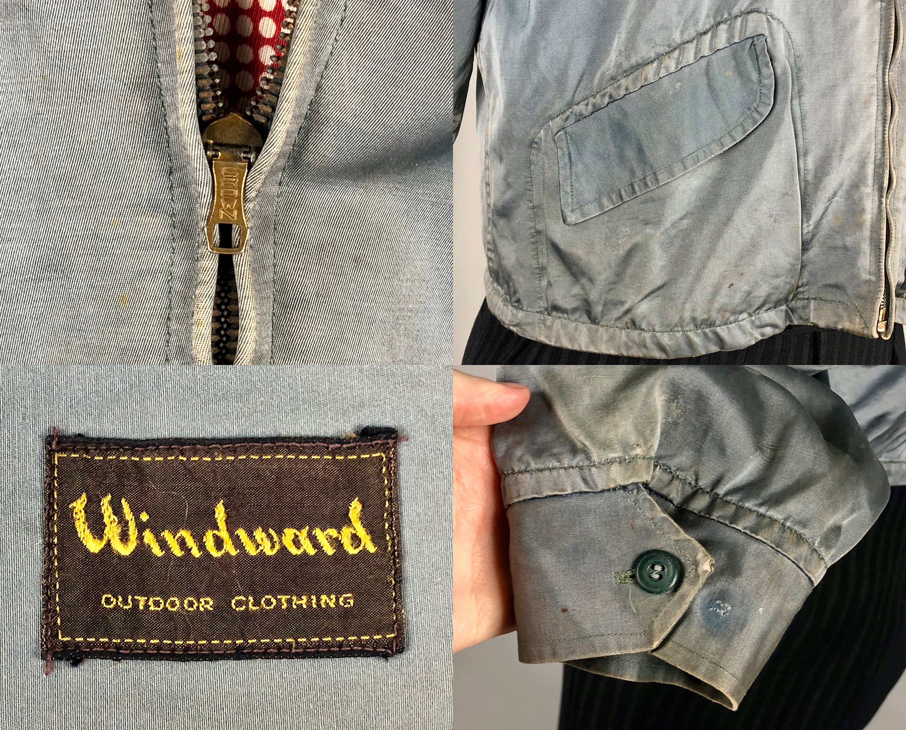 This sporty Art Deco-era windbreaker in deep slate blue-gray cotton sateen is perfect for a walk in the fog during a San Francisco summer or a day hiking in Muir Woods. Antique gold-toned 'Crown' metal zipper with spring-loaded snap-back zipper pull, zip-top breast pocket with functional gold-toned zipper and chain-link and open diamond zipper pull, slanted welt pockets with tuckable topstitched flaps, corded front placket detail, and pointed-tab button cuffs. Jacket is unlined and includes original marigold on chocolate brown jacquard 'Windward Outdoor Clothing' script and block letter designer tag on inside left front pocket. Jacket has some slight fading along collar and cuffs, along with minor signs of general wear consistent with age but is structurally sound and presents beautifully. This jacket is in good vintage condition, with no holes or odors to note.