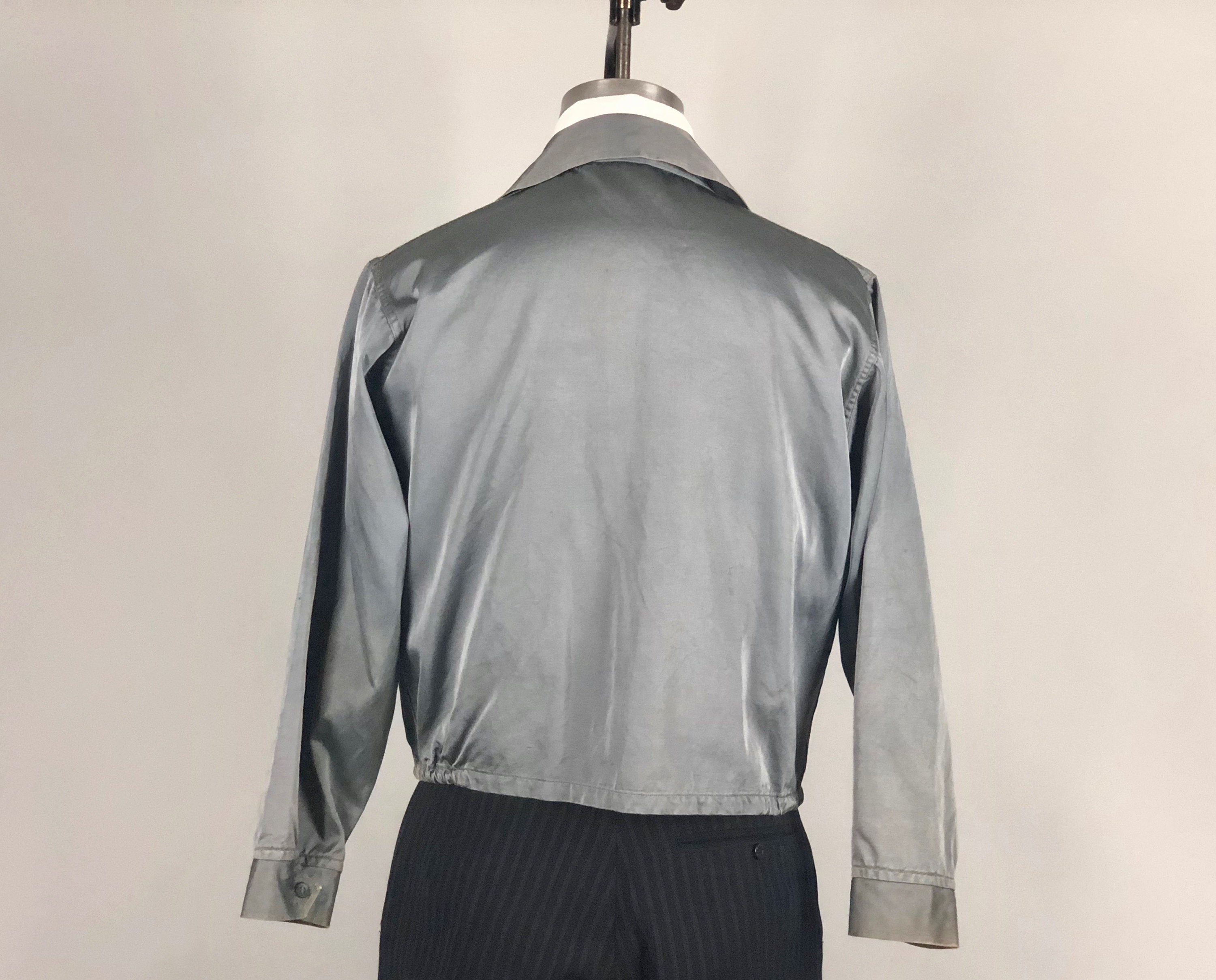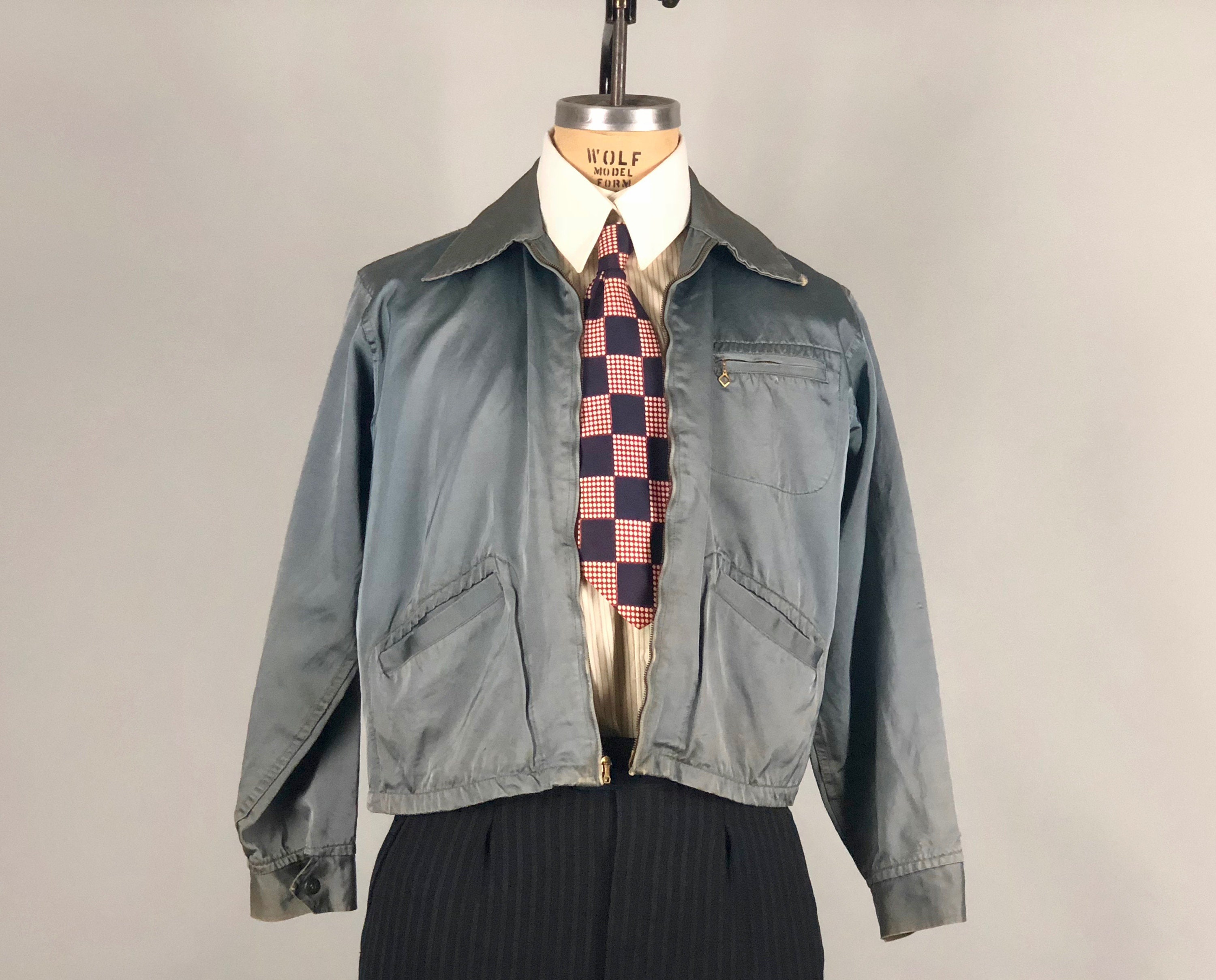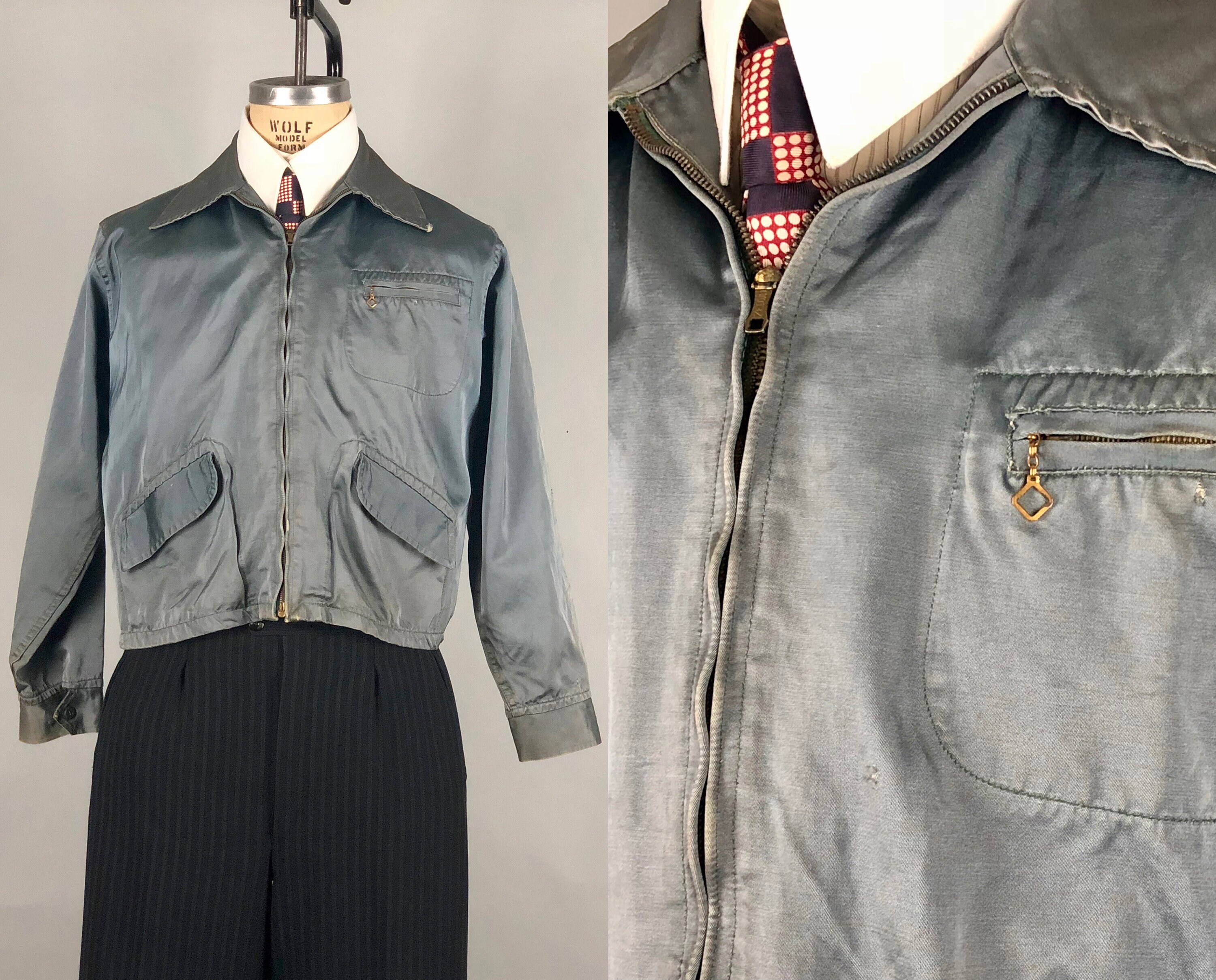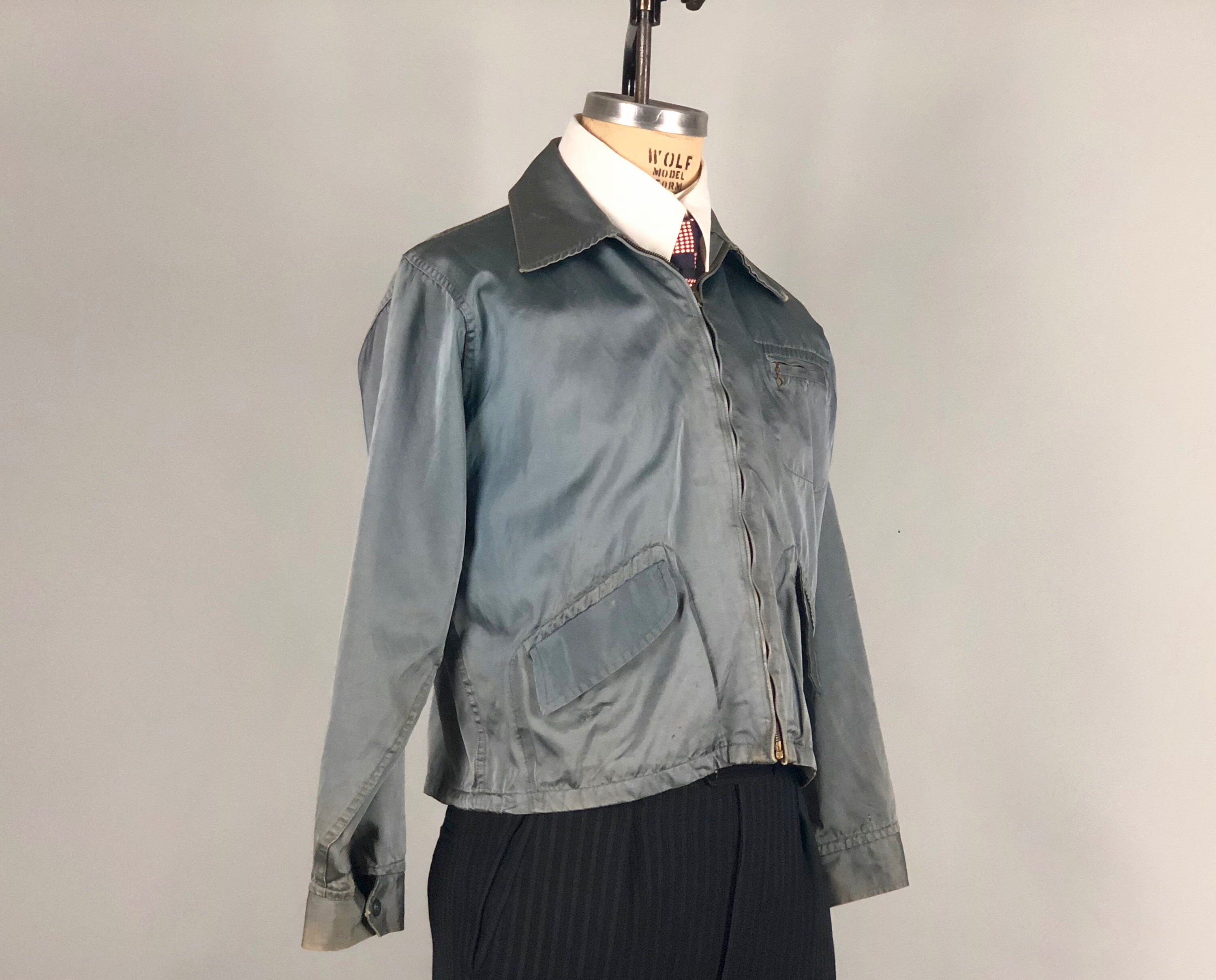 This sporty Art Deco-era windbreaker in deep slate blue-gray cotton sateen is perfect for a walk in the fog during a San Francisco summer or a day hiking in Muir Woods. Antique gold-toned 'Crown' metal zipper with spring-loaded snap-back zipper pull, zip-top breast pocket with functional gold-toned zipper and chain-link and open diamond zipper pull, slanted welt pockets with tuckable topstitched flaps, corded front placket detail, and pointed-tab button cuffs. Jacket is unlined and includes original marigold on chocolate brown jacquard 'Windward Outdoor Clothing' script and block letter designer tag on inside left front pocket. Jacket has some slight fading along collar and cuffs, along with minor signs of general wear consistent with age but is structurally sound and presents beautifully. This jacket is in good vintage condition, with no holes or odors to note.