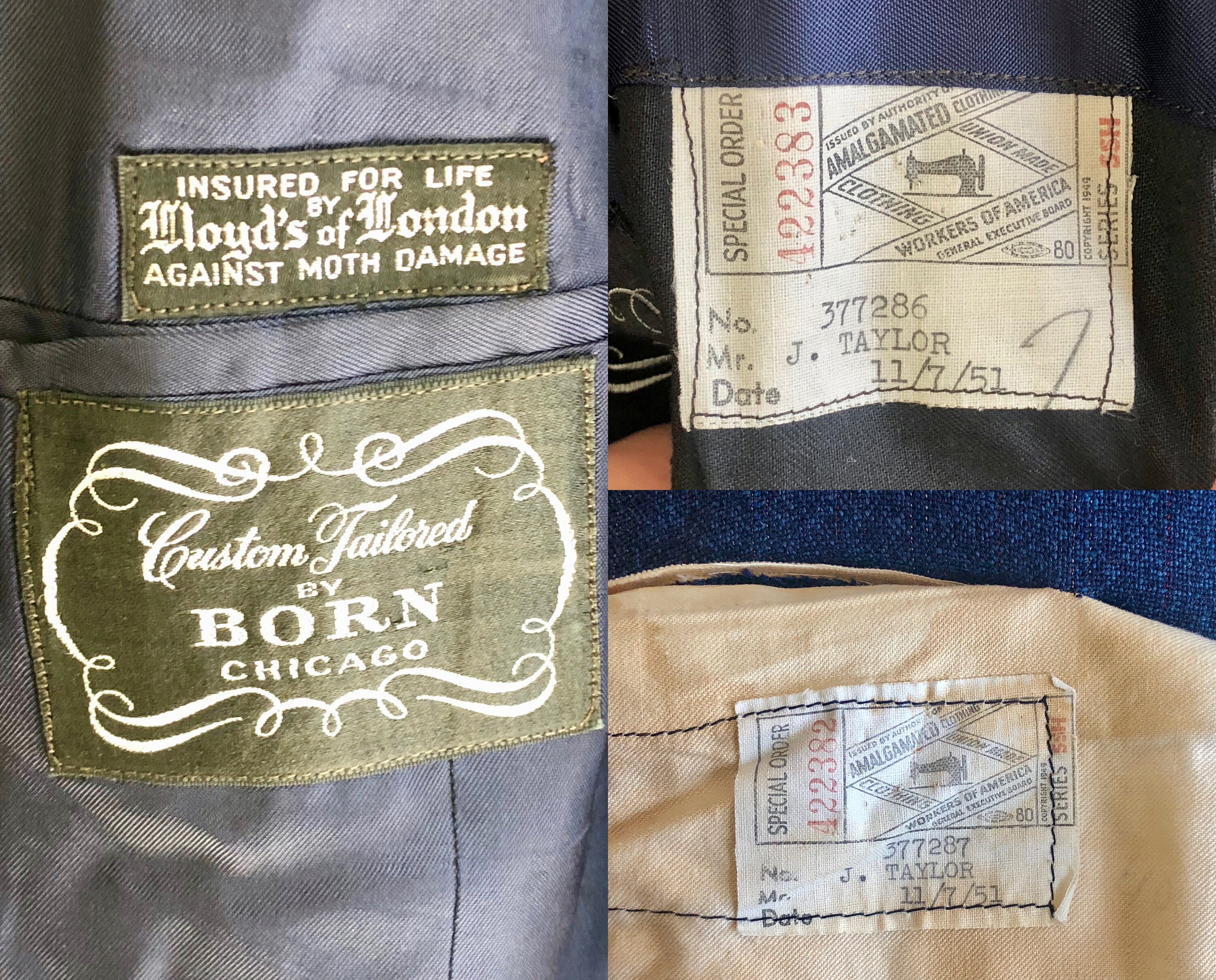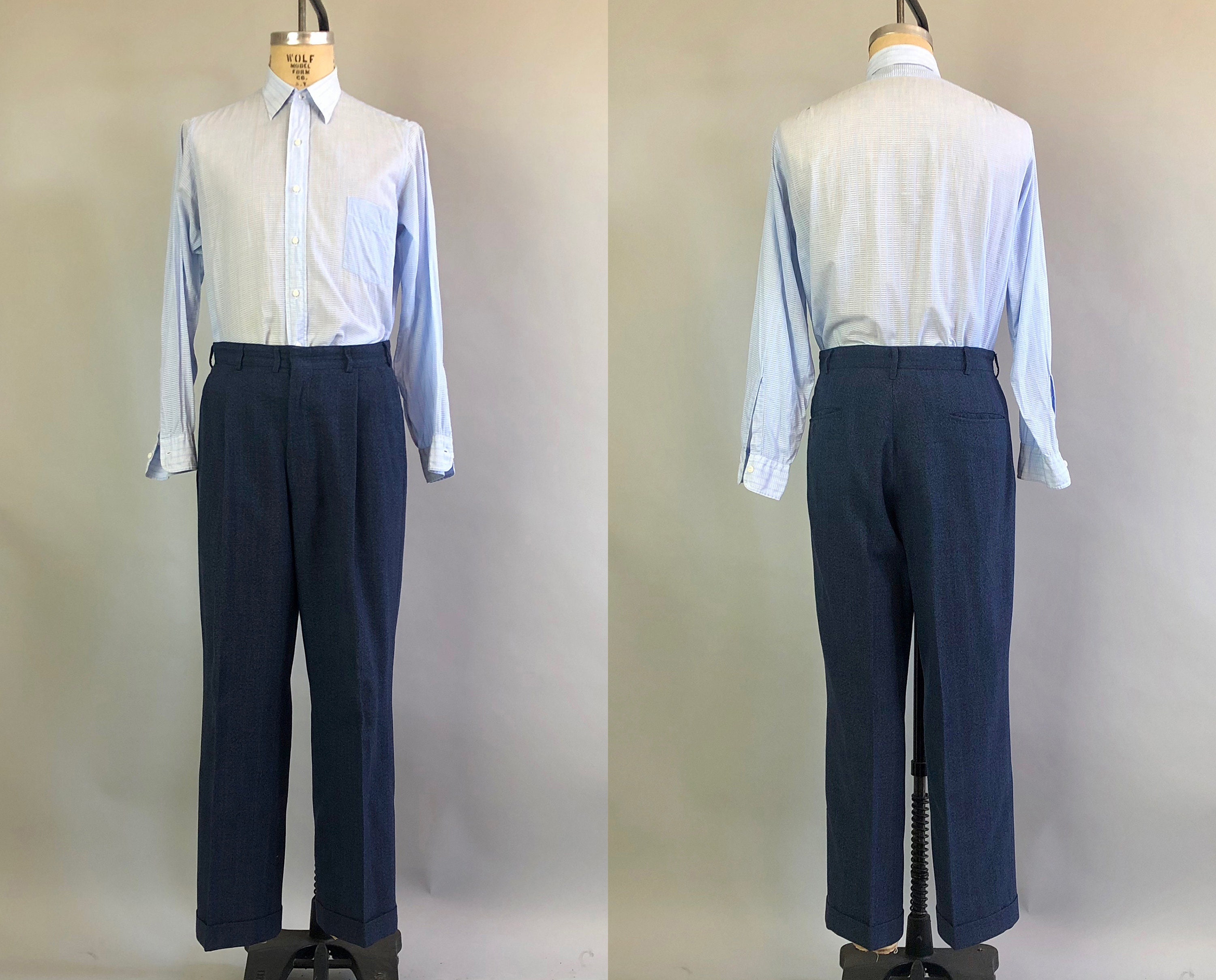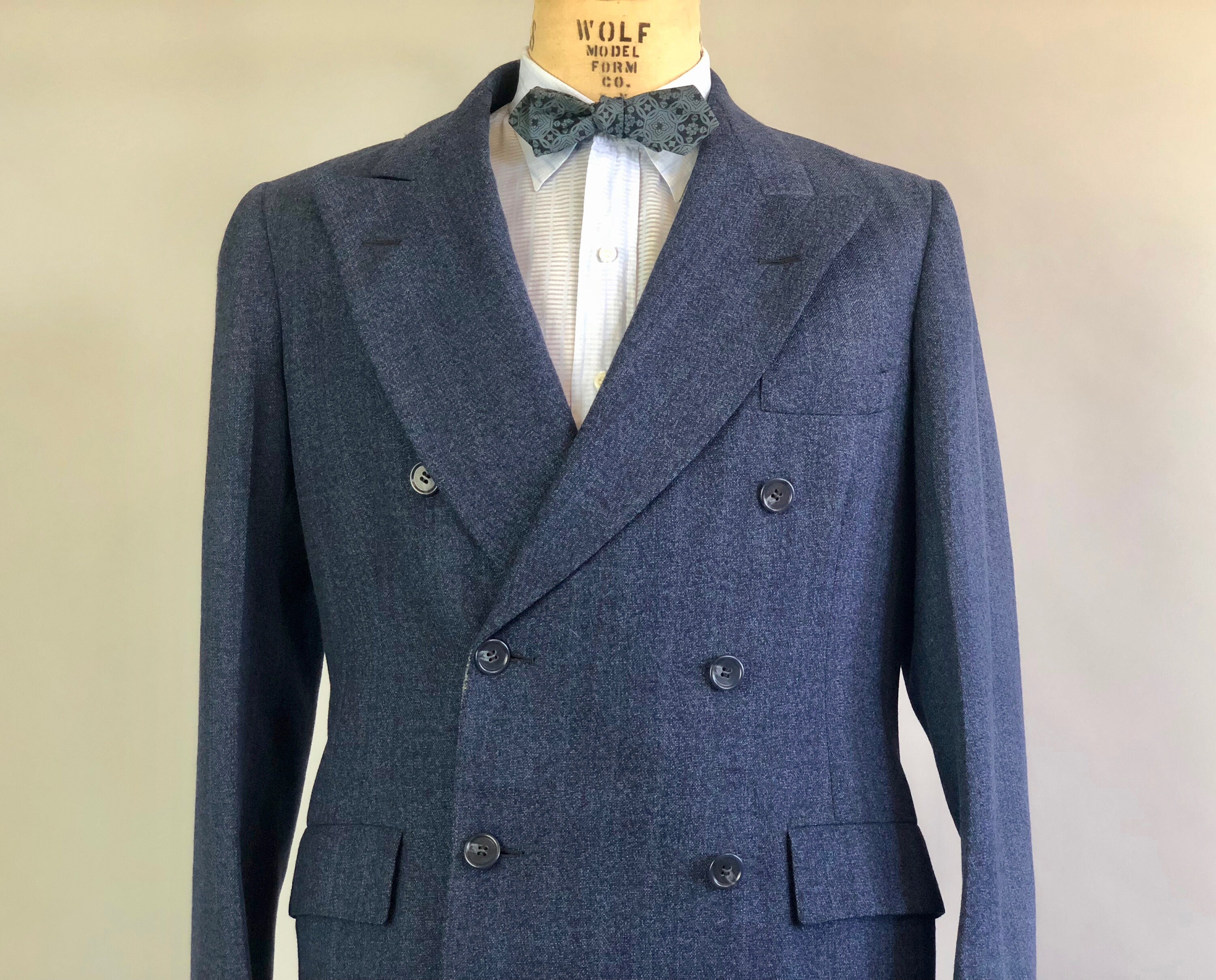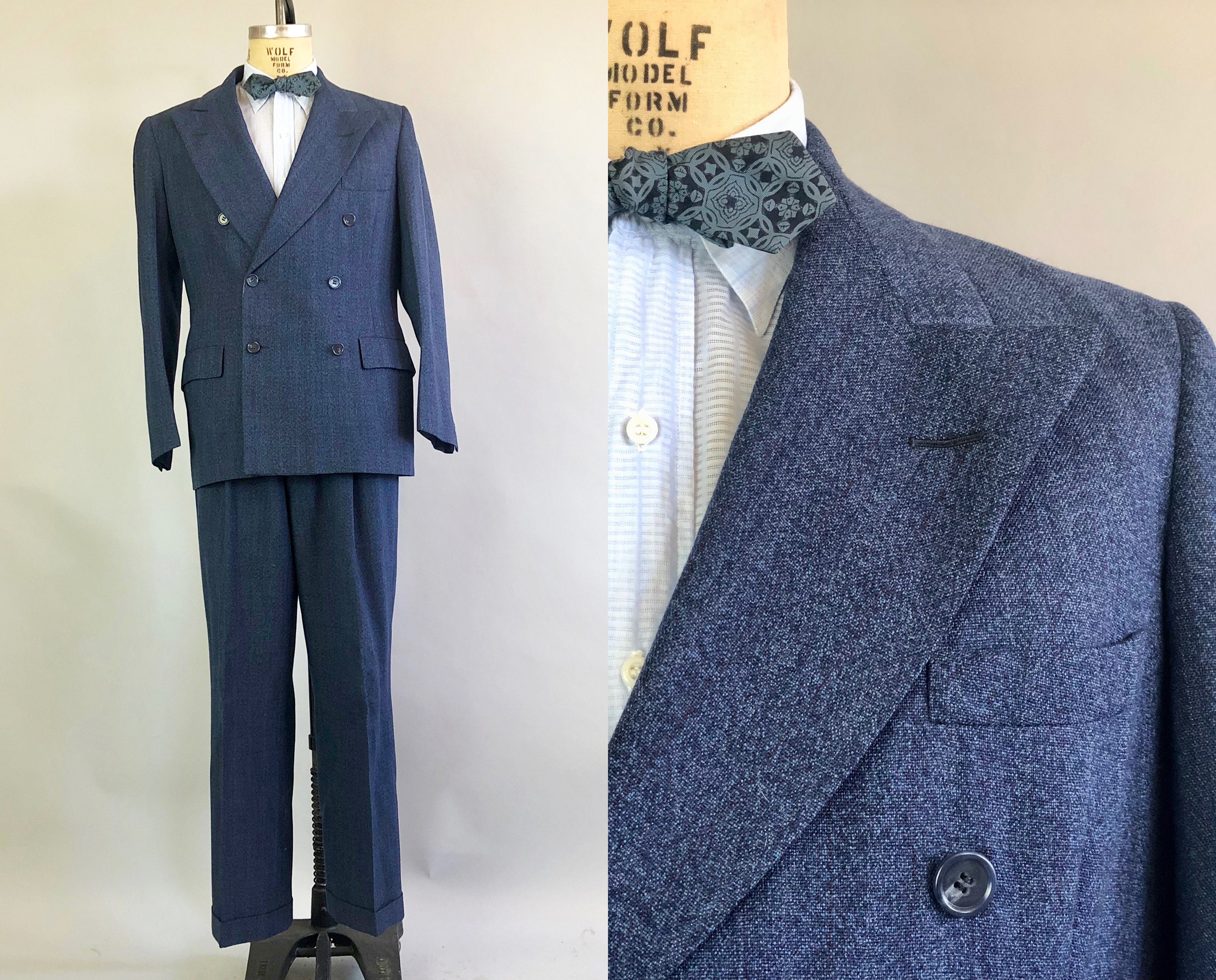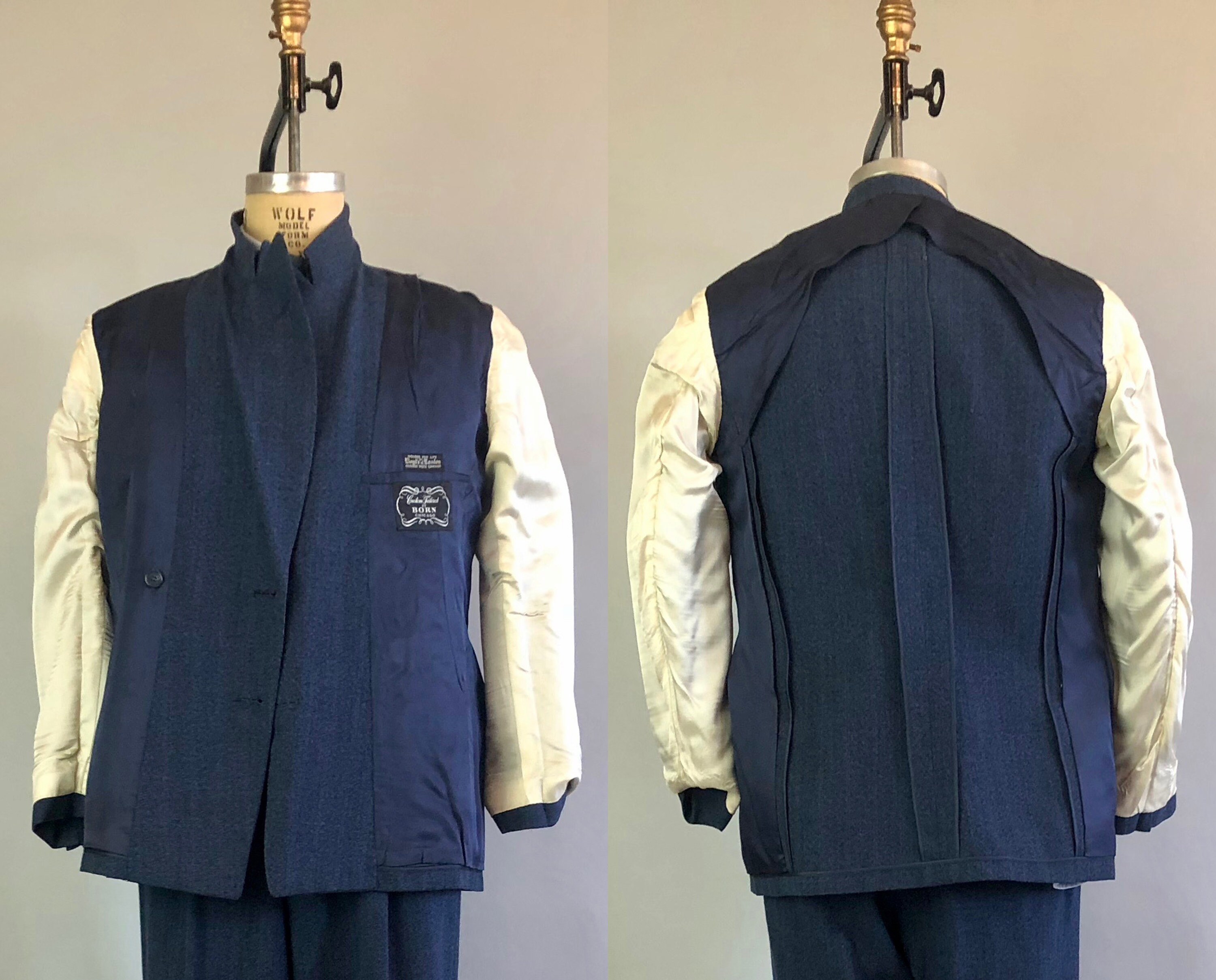 Get your next promotion wearing this impeccable early 1950s suit and then go out for drinks to celebrate! This double breasted granite blue wool suit has maroon red and double cream stripes as well as peak lapels to finish the unique and sophisticated look, which was custom tailored in 1951. The suit jacket has a breast pocket and two flat pockets that can be tucked in to create a welted pocket style if desired. The front right pocket has an interior coin pocket to keep you organized, and there is also an interior chest pocket on the right side for ample storage! The matching trousers have 4 pleats along the front waistband, as well as a watch pocket hidden in the front right waistband seam. There are also 2 pockets in the front and 2 welted pockets on the back, one with a matching button. The interior waistband is rubberized with suspender buttons. The trousers are cuffed and the fly has a metal zipper with buttons on the waistband. This suit is custom tailored by "BORN Chicago" and has a tailor's tag dated as "11/7/51". This suit is in great vintage condition, with no holes, stains, odors to note.