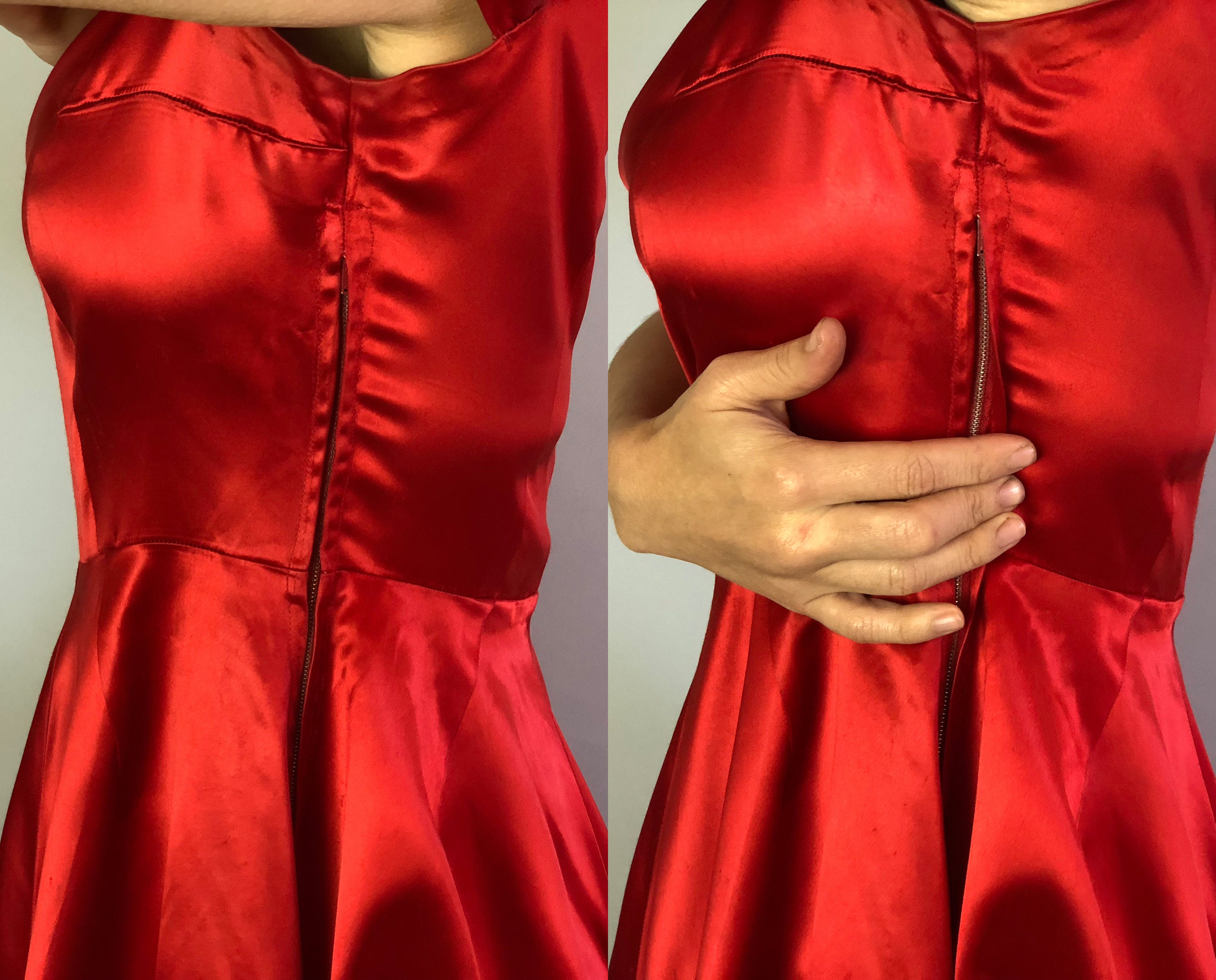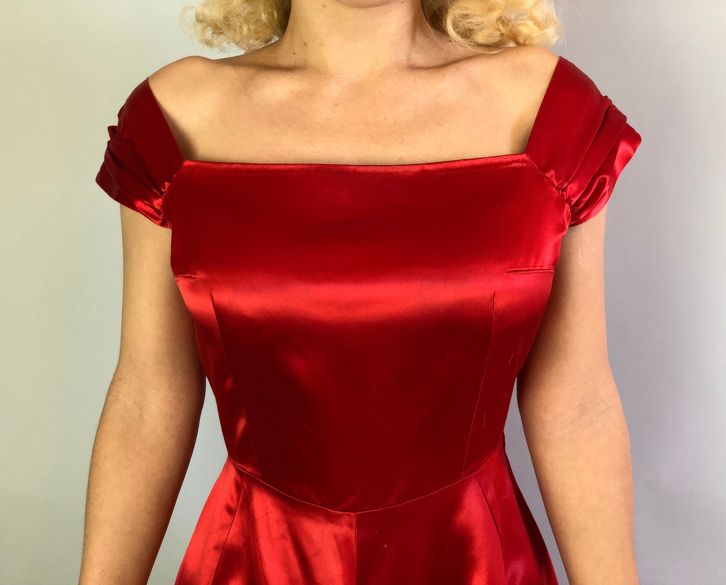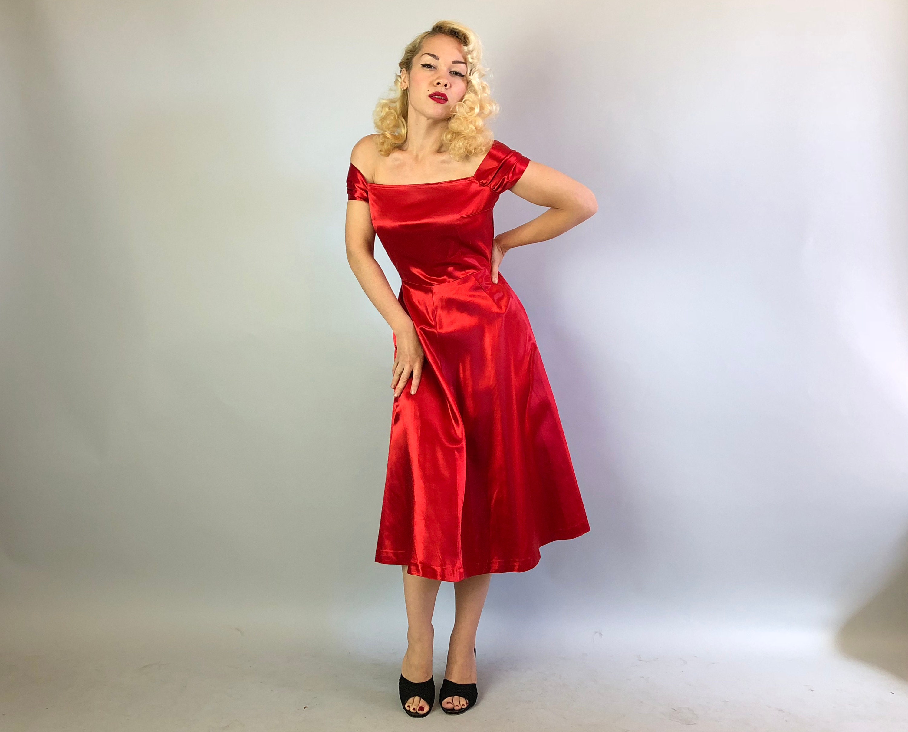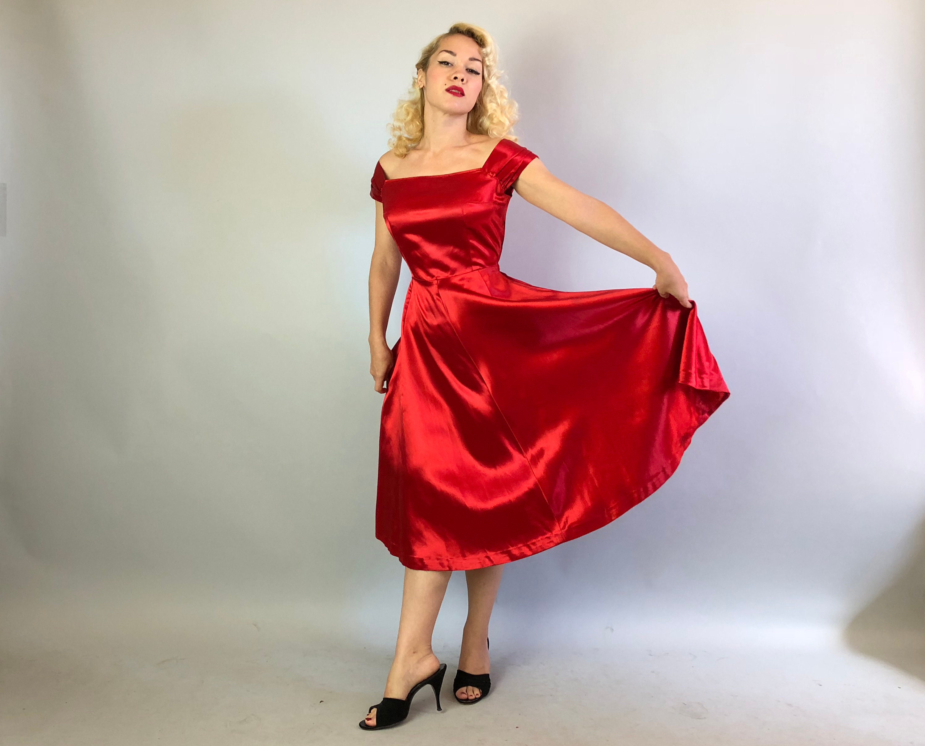 This 1950's dress has femme fatale written all over it! The show stopping scarlet red colour combined with the liquid sheen of the rayon satin is just to die for! The cut of the dress is kept clean and simple with a fitted bodice with a wide square neckline, ruched cap sleeves, and a full circle skirt. Metal zipper on the side. This dress is in great vintage condition, there is little darkening around the neckline from wear but no holes, stains, or odors to note. It has been pinned on model to show fit.
