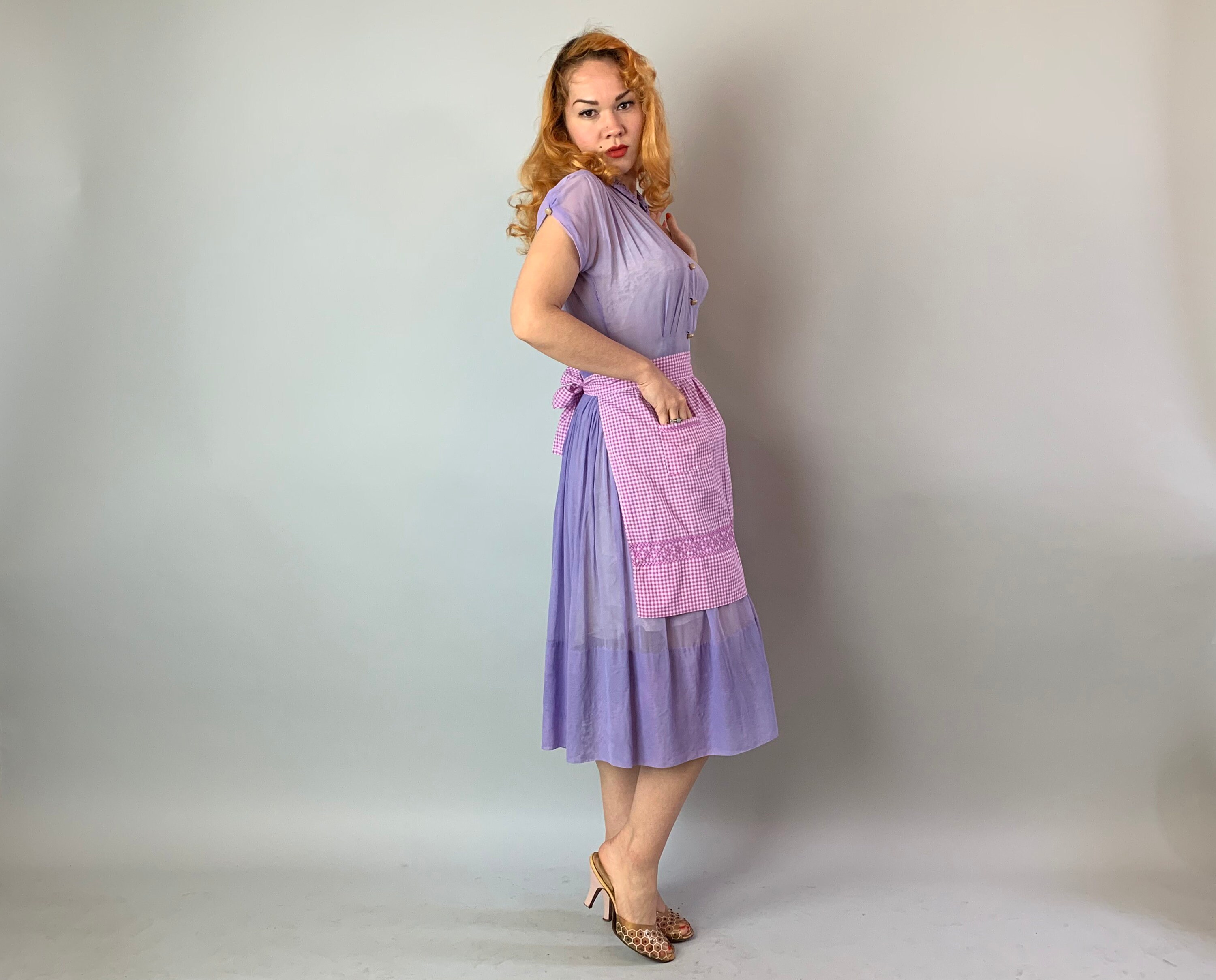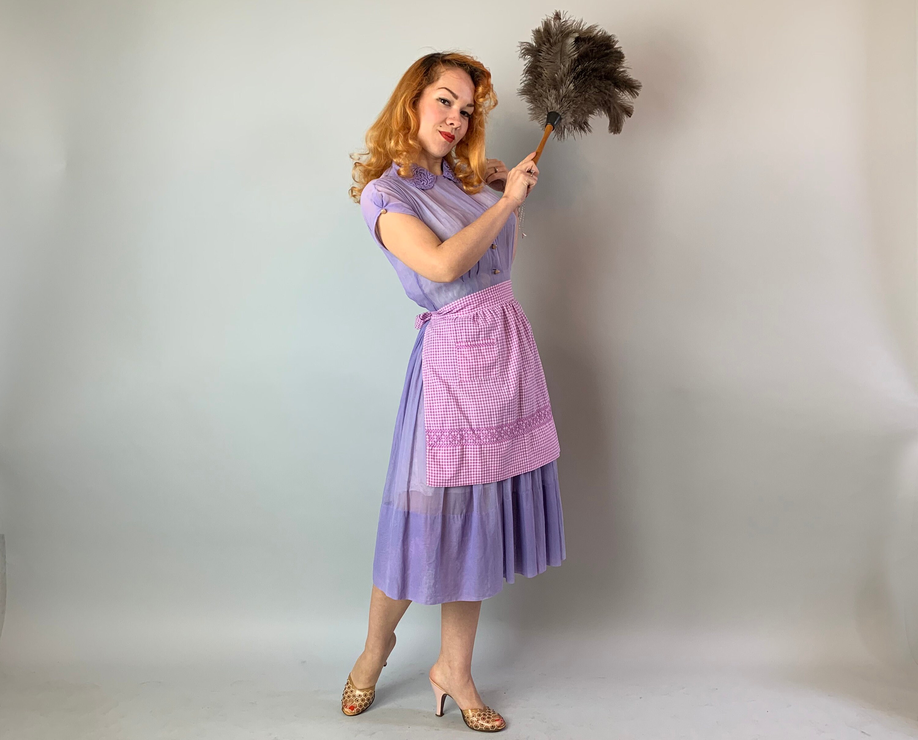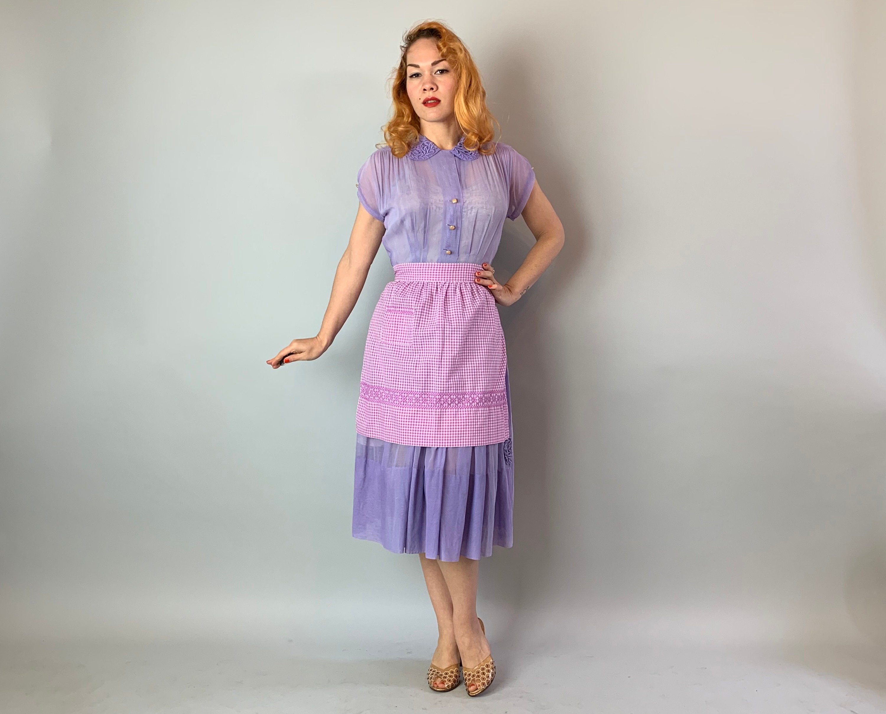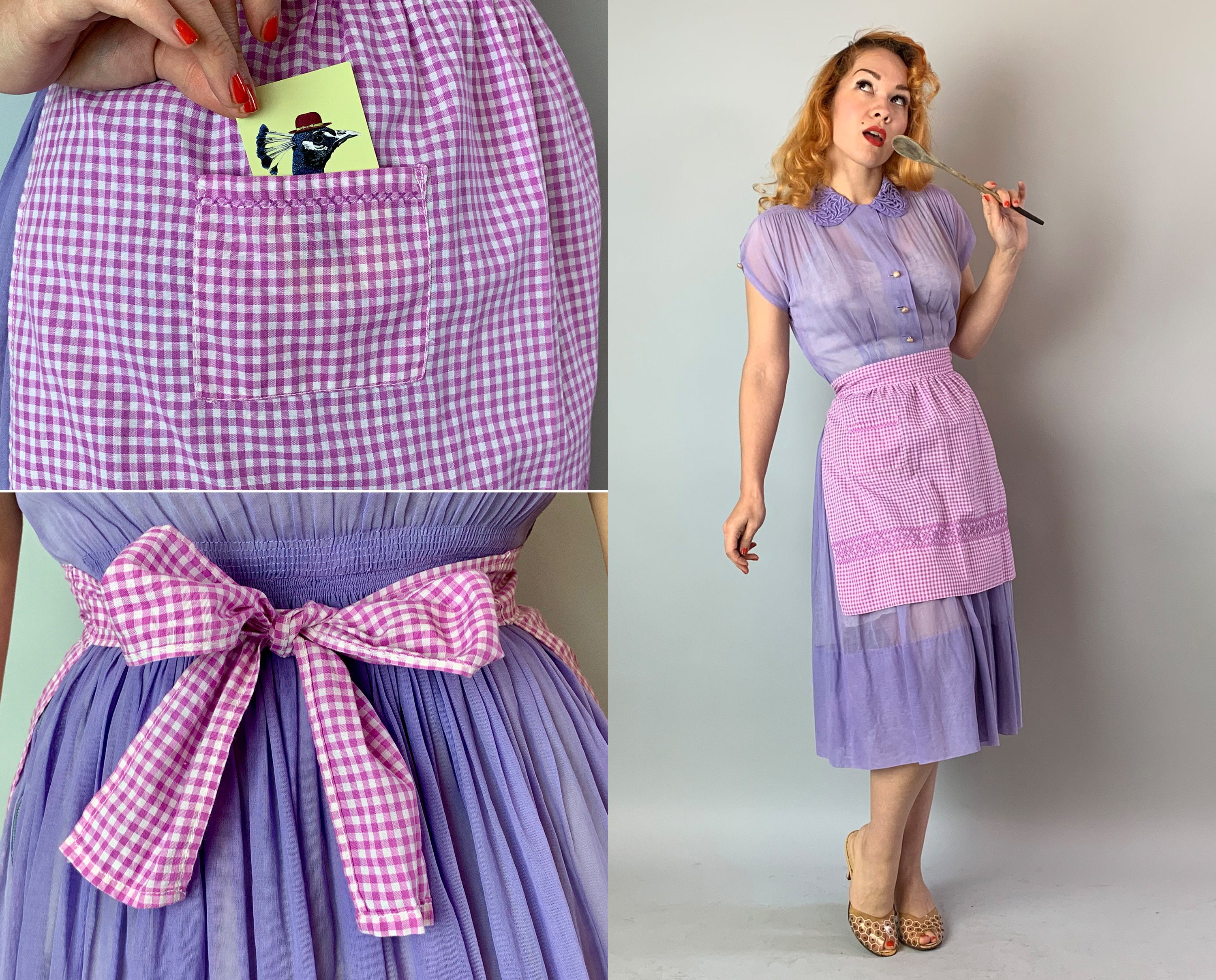 Look cute while doing things around the house in this 1950's apron! Lilac and white gingham printed cotton with an embroidered bottom border and petite pocket. Wide waist ties make for a fantastic bow! This apron is in excellent vintage condition with no stains, holes or odors to note.