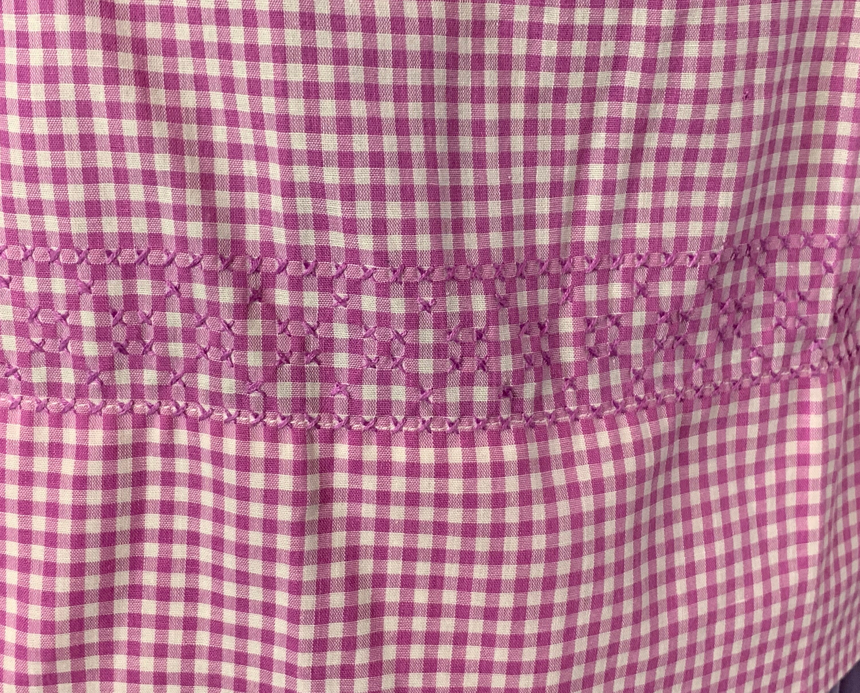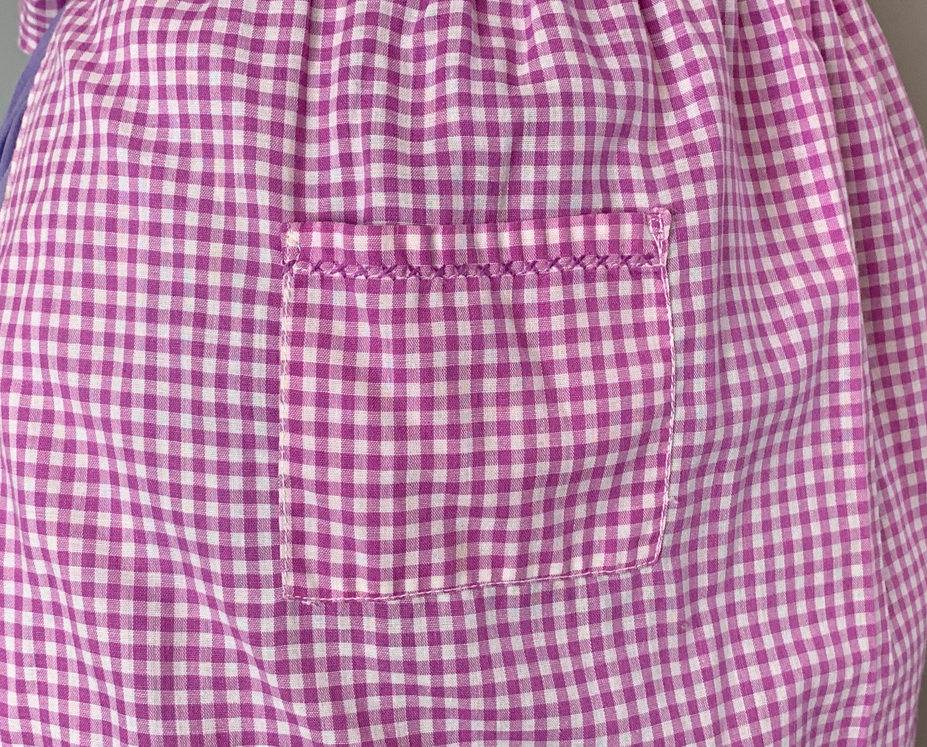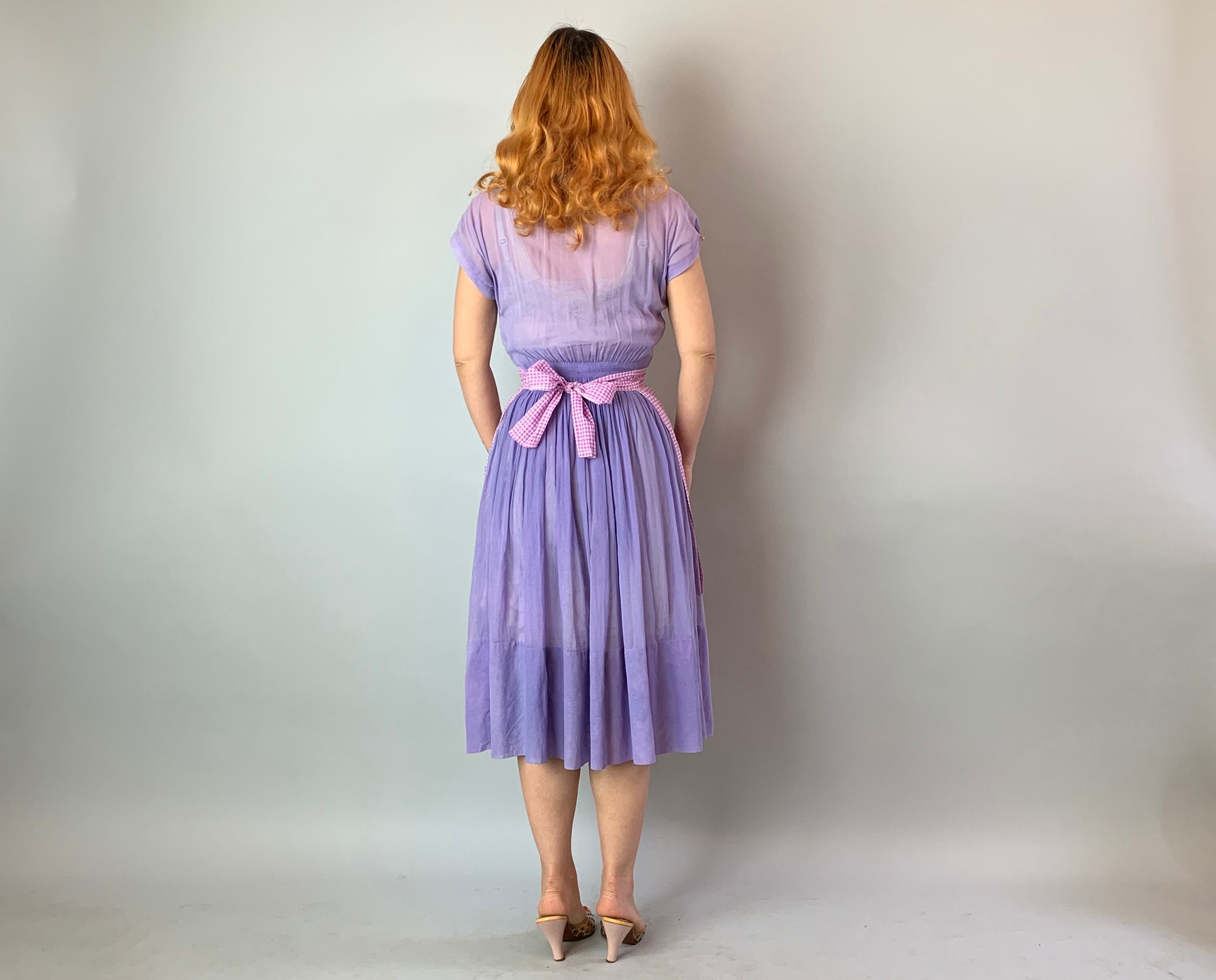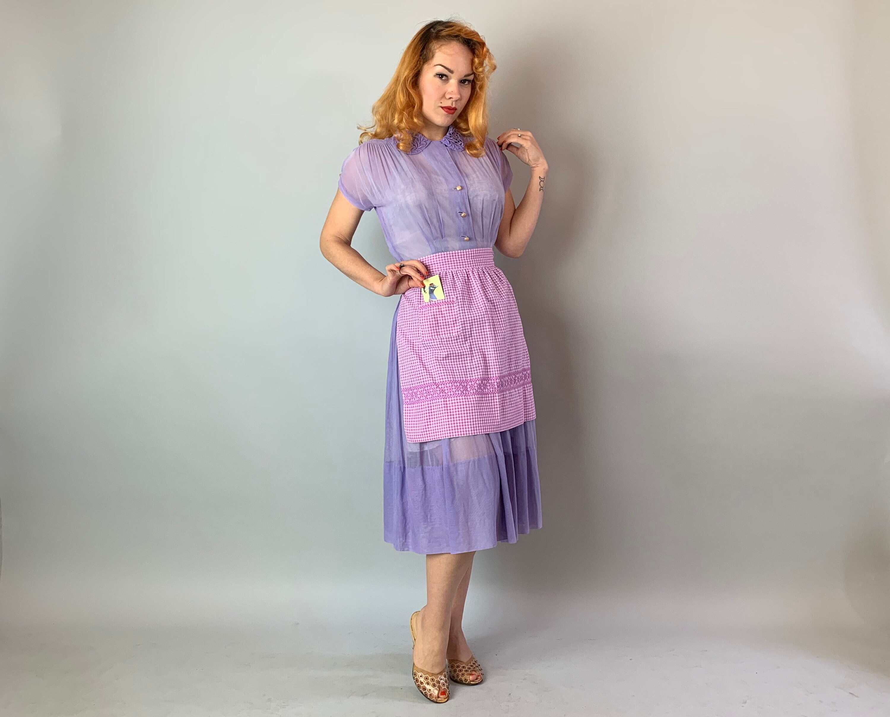 Look cute while doing things around the house in this 1950's apron! Lilac and white gingham printed cotton with an embroidered bottom border and petite pocket. Wide waist ties make for a fantastic bow! This apron is in excellent vintage condition with no stains, holes or odors to note.