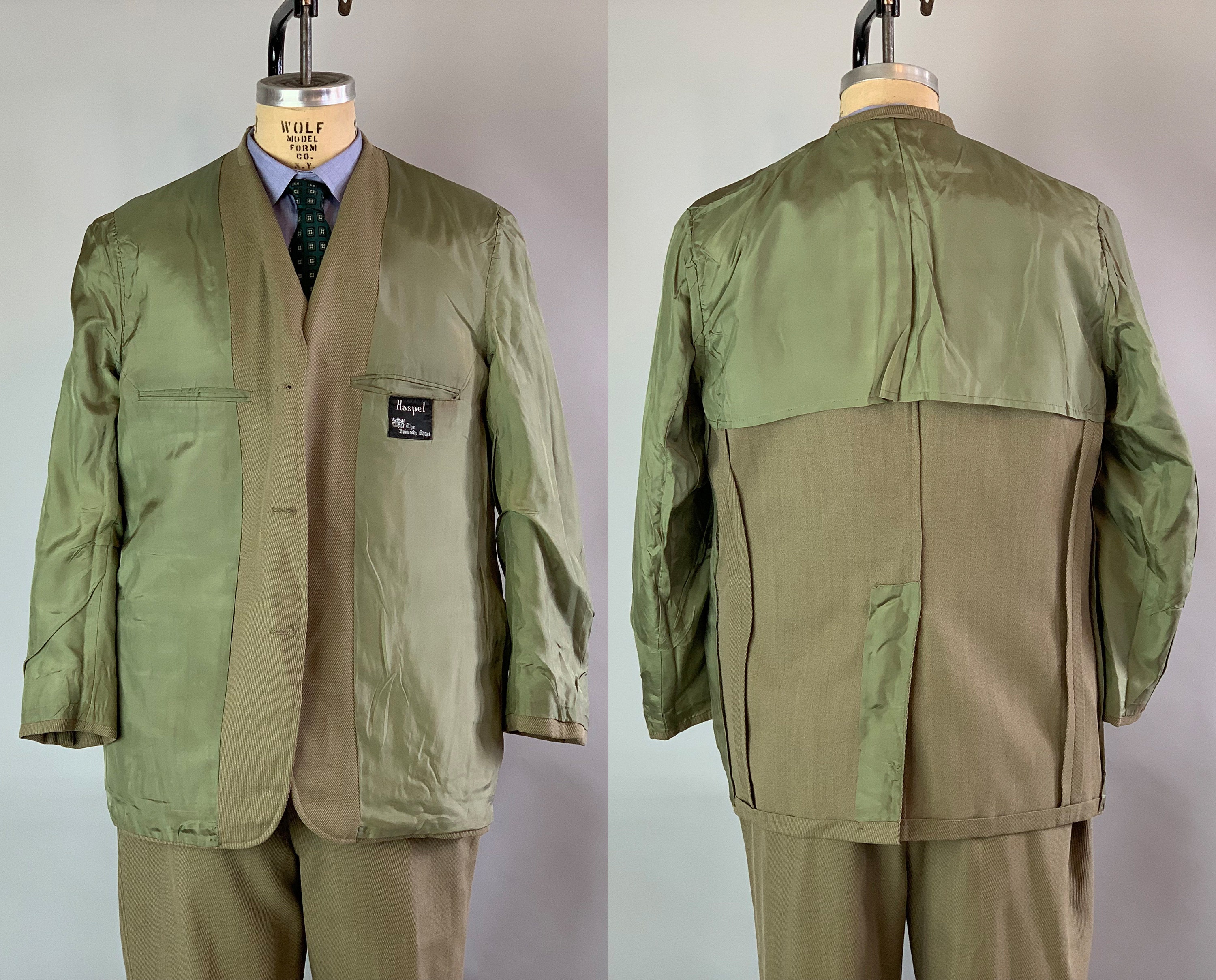 Pour a glass of fine whiskey (neat) and prepare to be as fashionable as Don Draper with this handsome 1960s three piece suit! Made of wool in a sophisticated olive green with khaki green diagonal stripes for pizazz! This vintage suit consists of: a half lined, single vented suit coat with a notched lapel, three exterior and two interior pockets for a total of five, three marbled button closure with two matching buttons at each cuff; a fully lined waistcoat with four exterior welted pockets, adjustable belted back, and six marbled buttons; cuffed trousers with welted back pockets and one with a button to hold your wallet safely, and two front pockets. Designer tag reads "Haspel." Union Label dates this suit to the 1960s. This suit is in great vintage condition, with a couple well-done period mends and no holes, stains, odors to note.