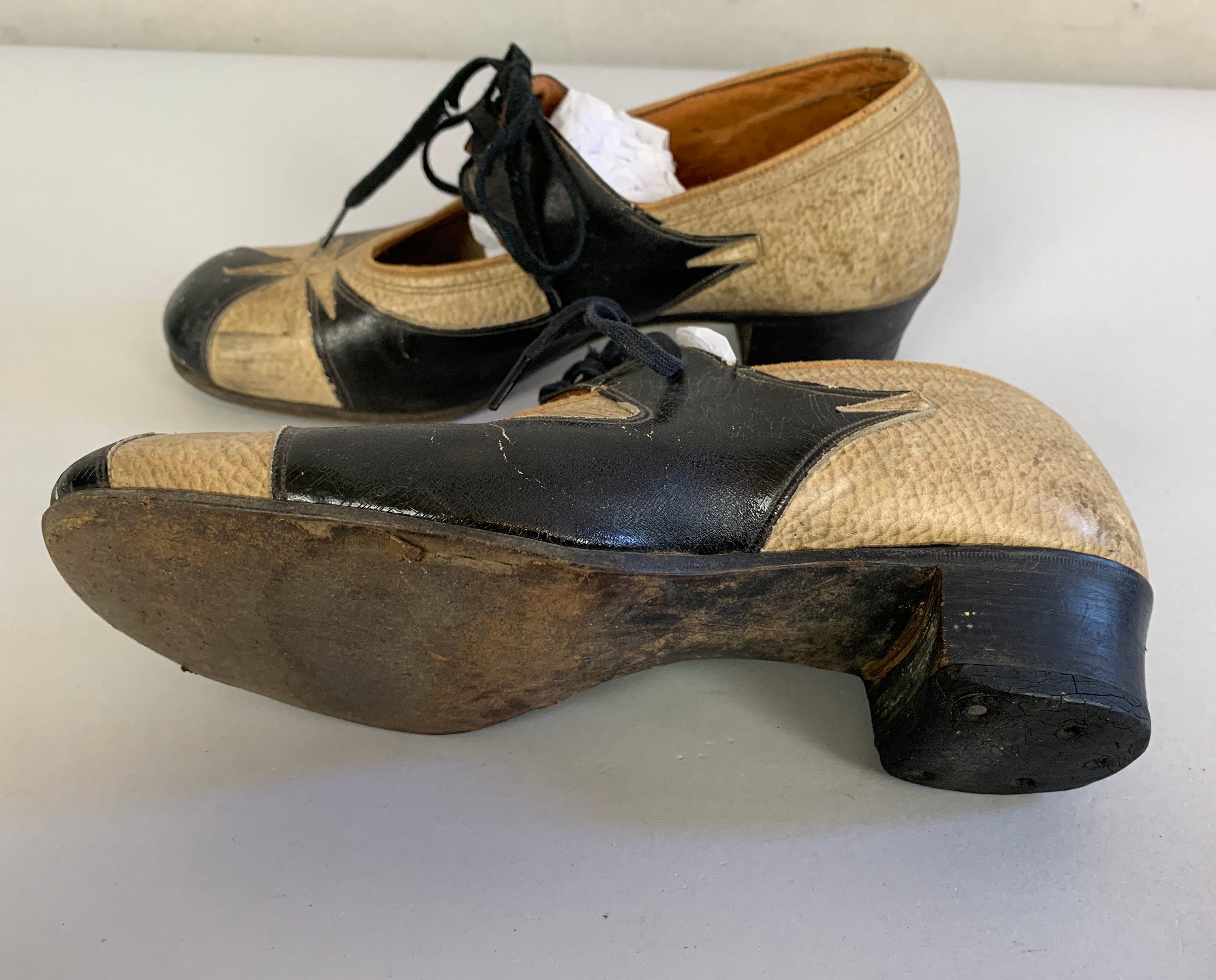 A unique pair of 1920s Art Deco shoes to pair with your deco era dresses! These black and beige leather Mary Janes feature wide leather straps with a 3 hole lace for excellent adjustability as well as squared off toes with elegant deco design details and topstitching. A comfortable low heel make these a smart choice. These shoes are in good vintage condition with some scuffs and signs of wear consistent with age.
