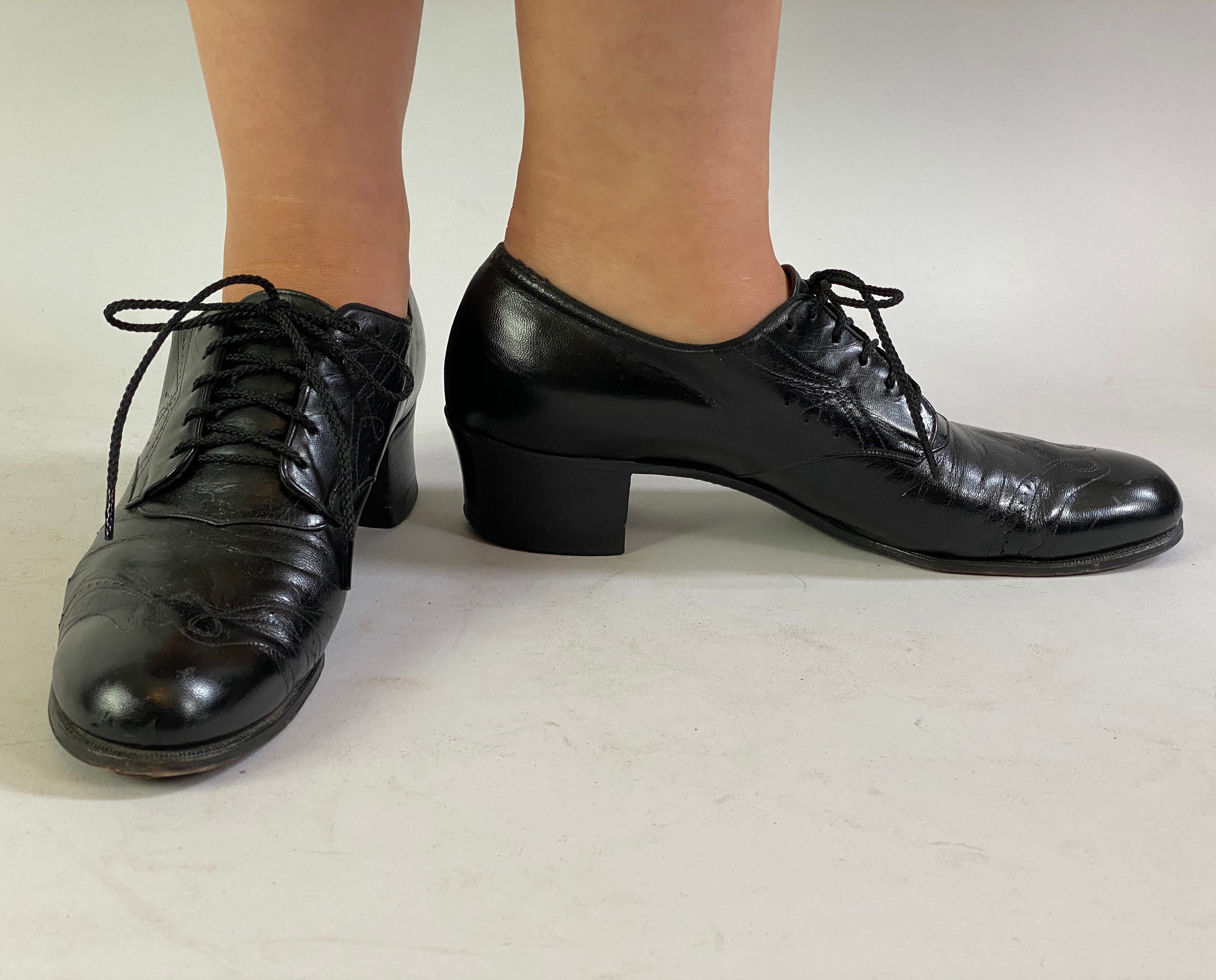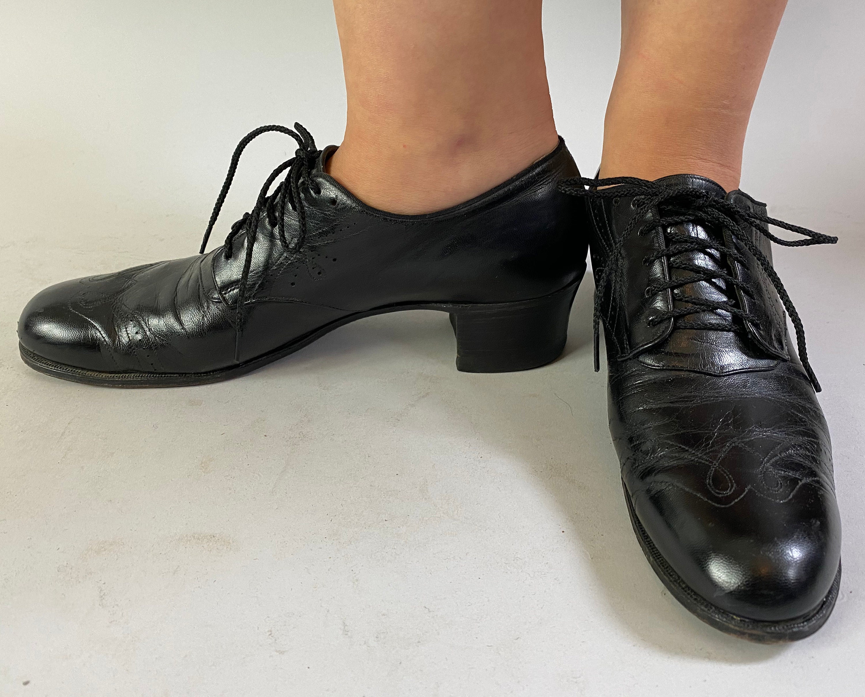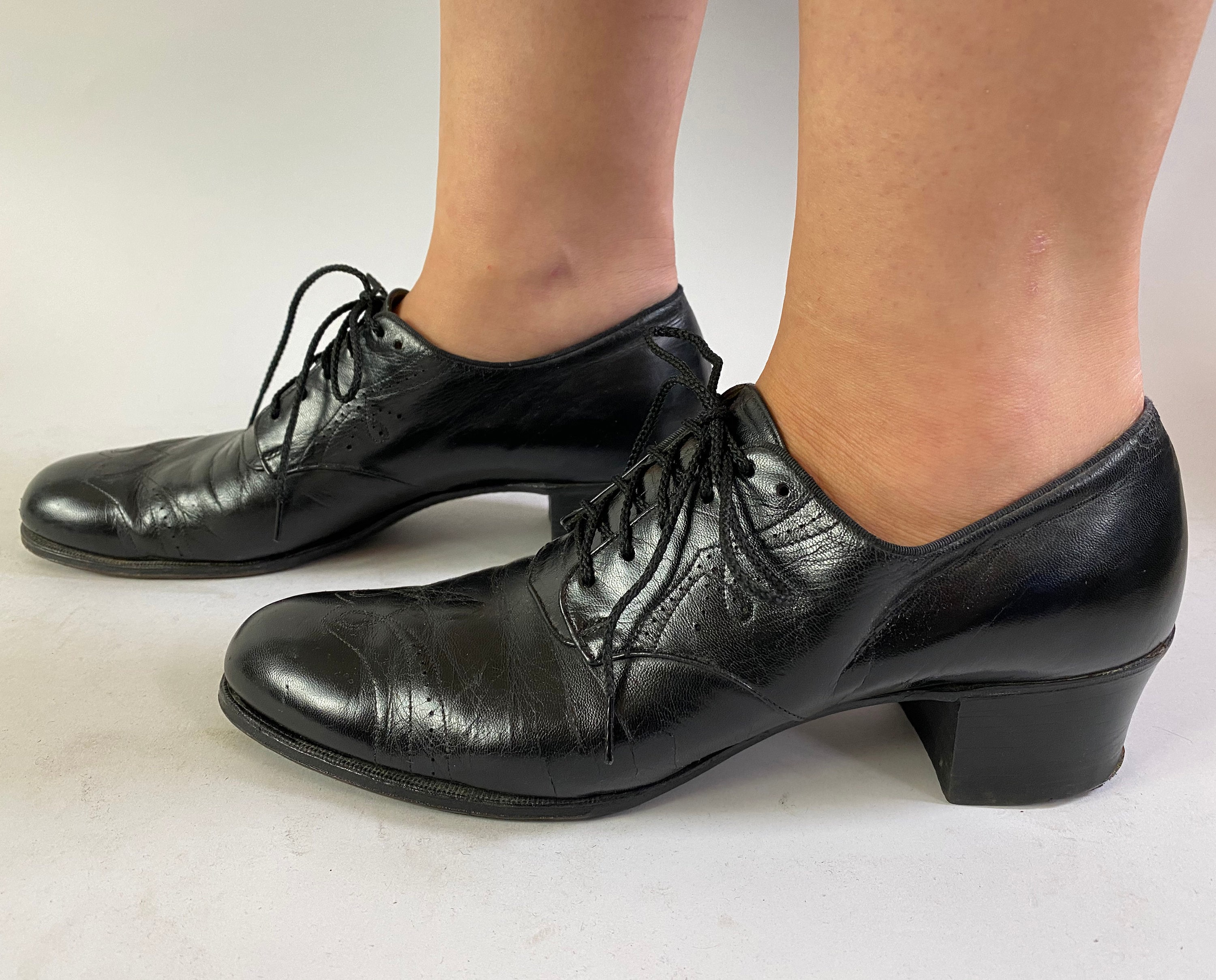 These 1930’s shoes are a practical and fashionable choice to take you from a day of errands to a night of dancing! Made of black leather with swirled wingtip style topstitching, broguing, leather soles, five hole lacing, and stacked heels. “Made Expressly for Ross-Harris”. These shoes are in great vintage condition with only minor signs of wear to the leather, soles and heels.