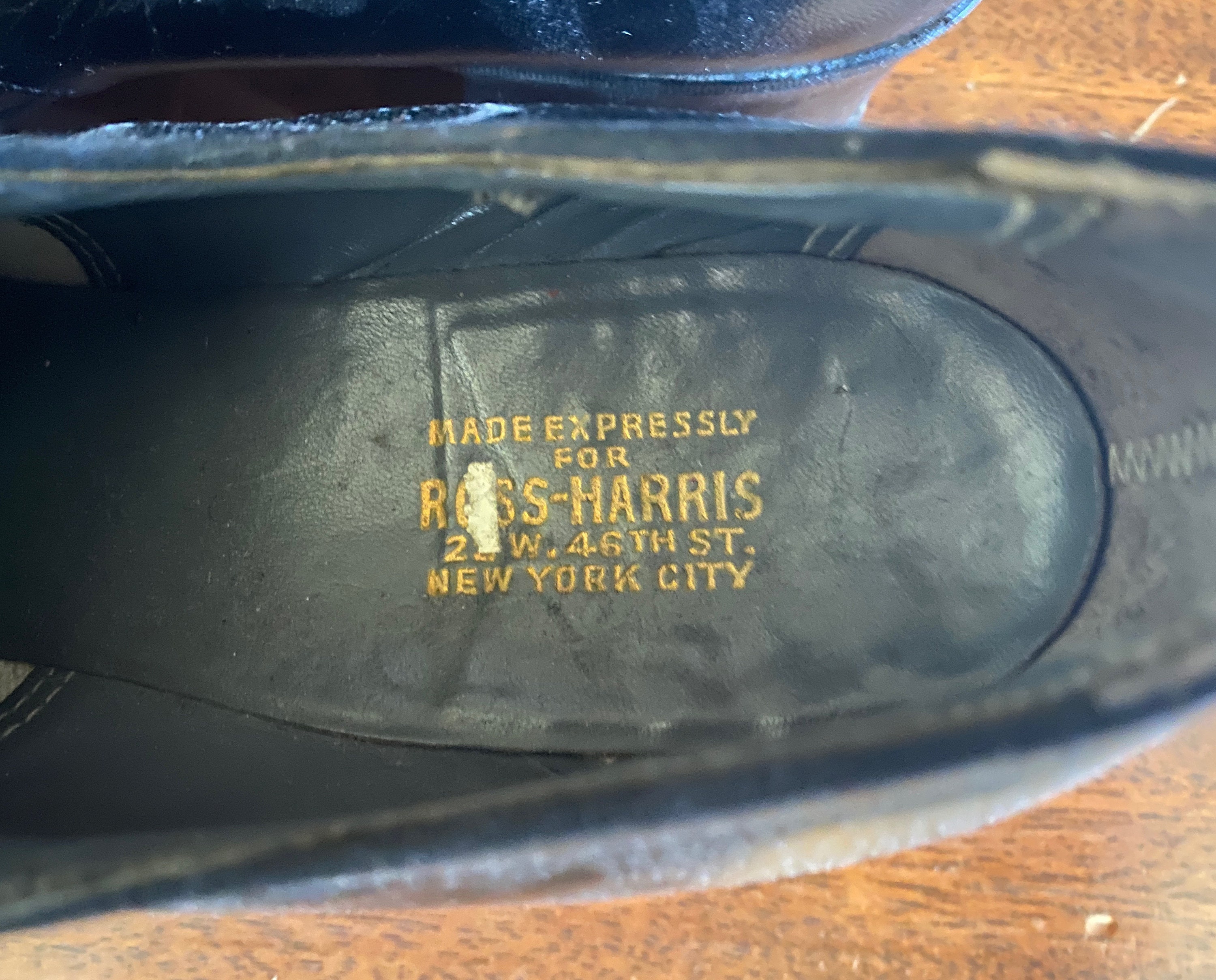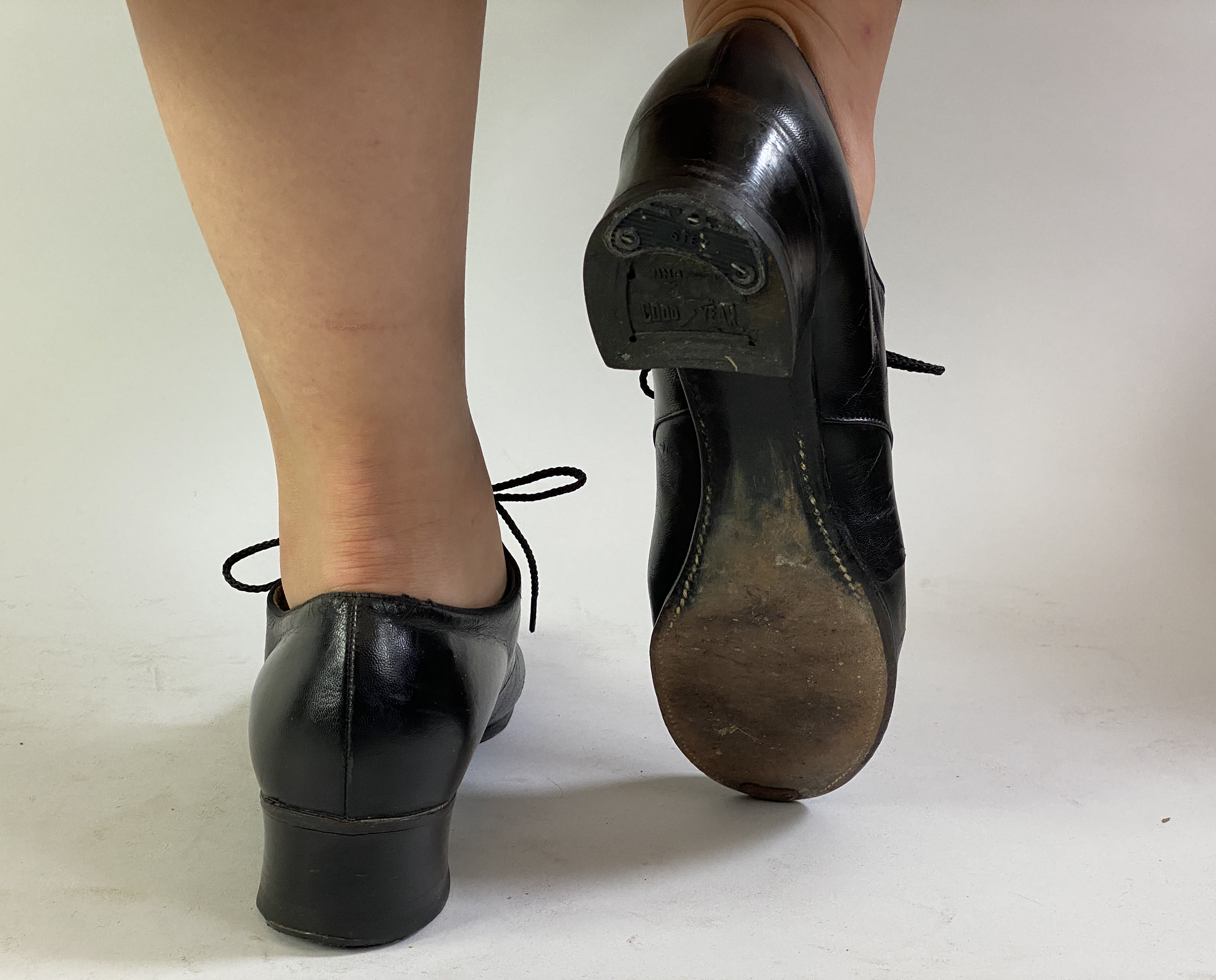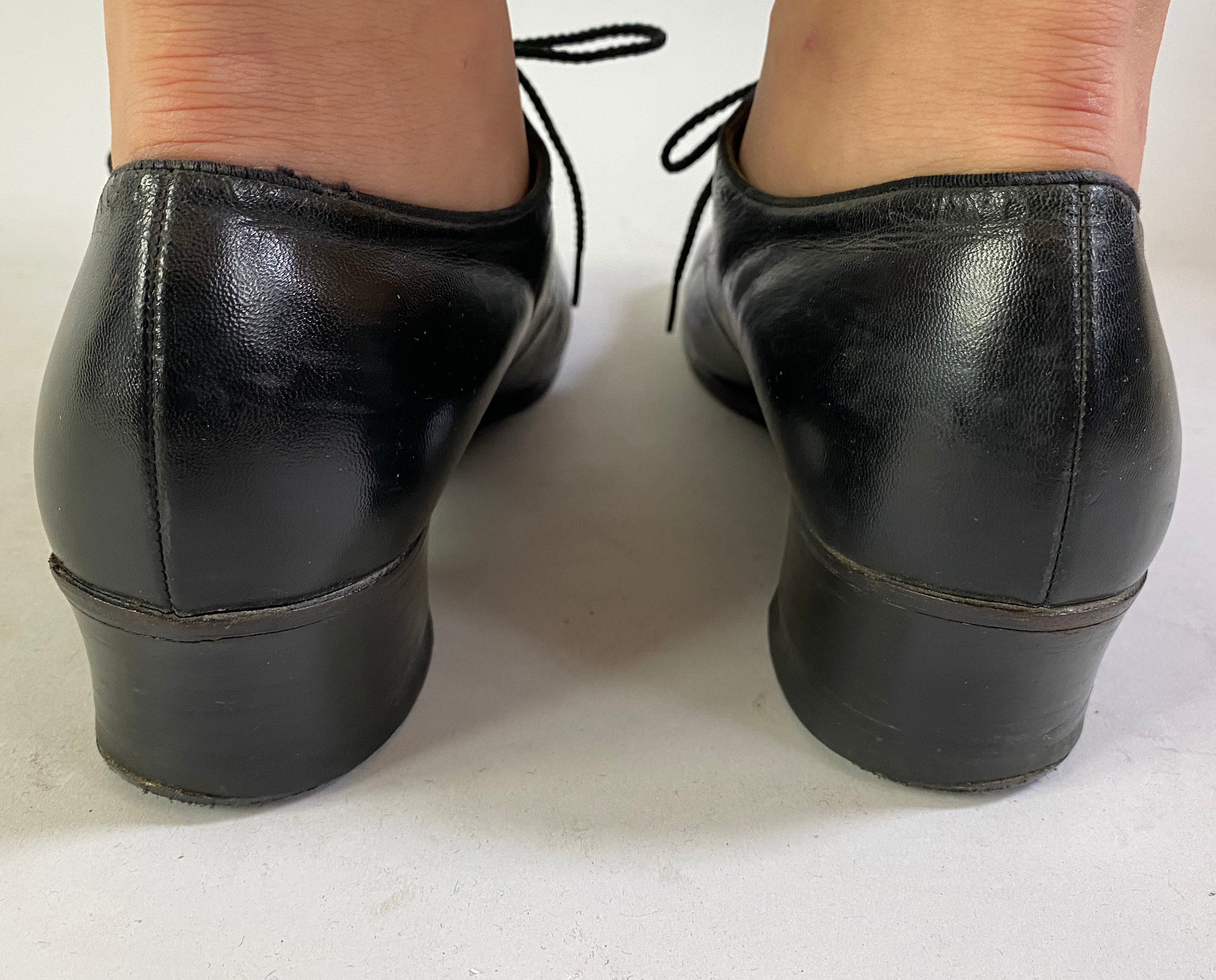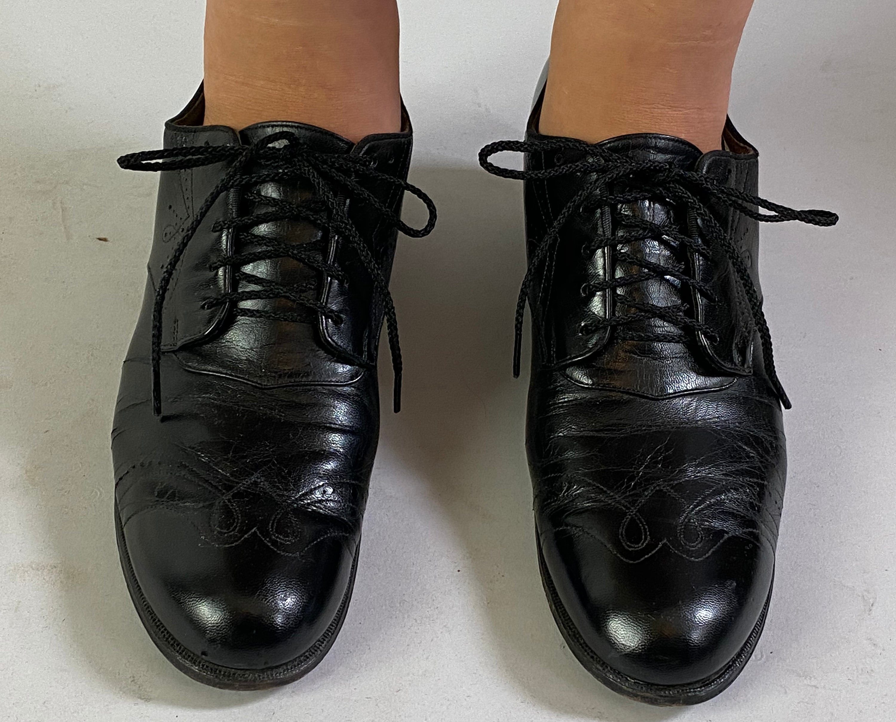 These 1930’s shoes are a practical and fashionable choice to take you from a day of errands to a night of dancing! Made of black leather with swirled wingtip style topstitching, broguing, leather soles, five hole lacing, and stacked heels. “Made Expressly for Ross-Harris”. These shoes are in great vintage condition with only minor signs of wear to the leather, soles and heels.
