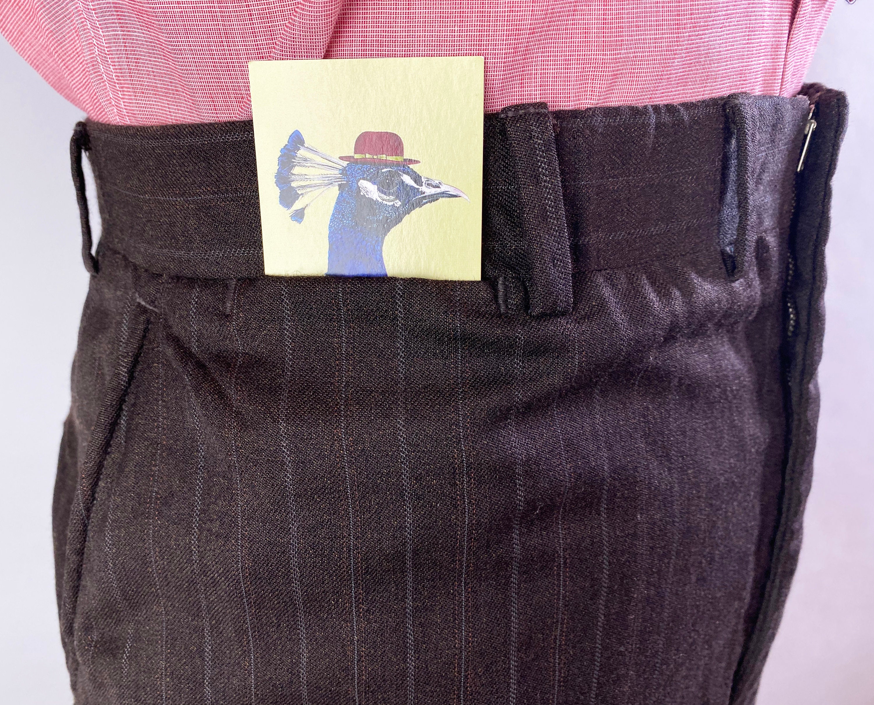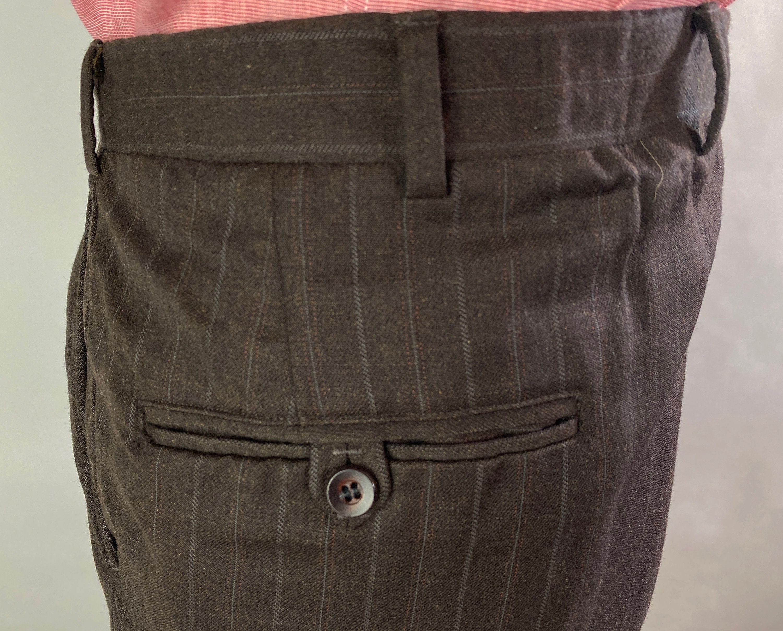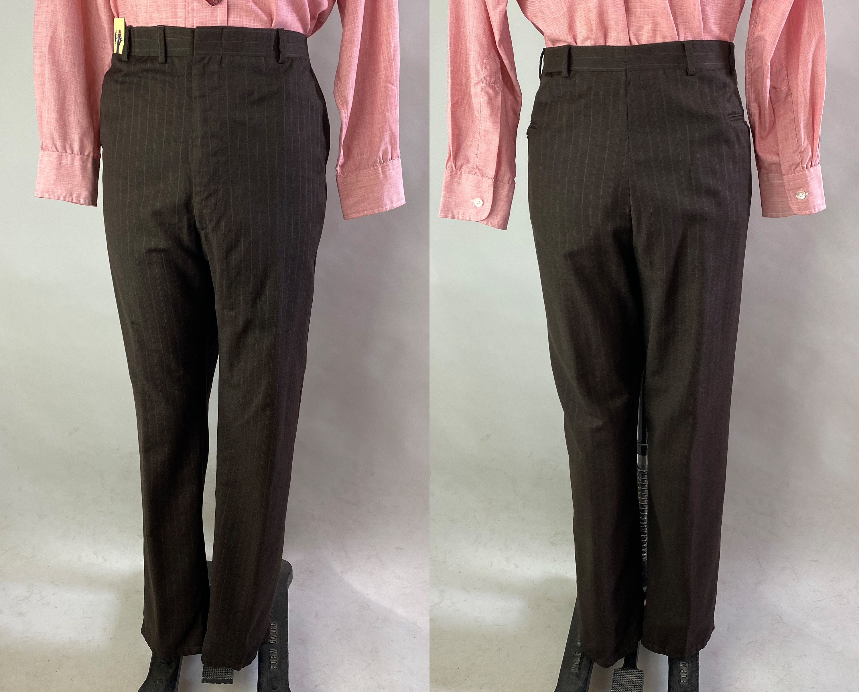 A classic mid-century suit by "J. Capps and Sons" this 1950's set is sure to please. The dark chocolate brown summer weight wool features orange pinstripes and white shadow stripes. The jacket features notched lapels, two button single breasted jacket with a single vent, welted chest pocket and two flap pockets, partial lining, and two inner pockets. The trousers feature a flat front, two welted back pockets (one with button tab), slanted inset pockets, and a metal zipper fly with a hook and eye. 1949 Union Label dates this suit to the 1950s. This suit is in great vintage condition, with no holes, stains, odors to note.